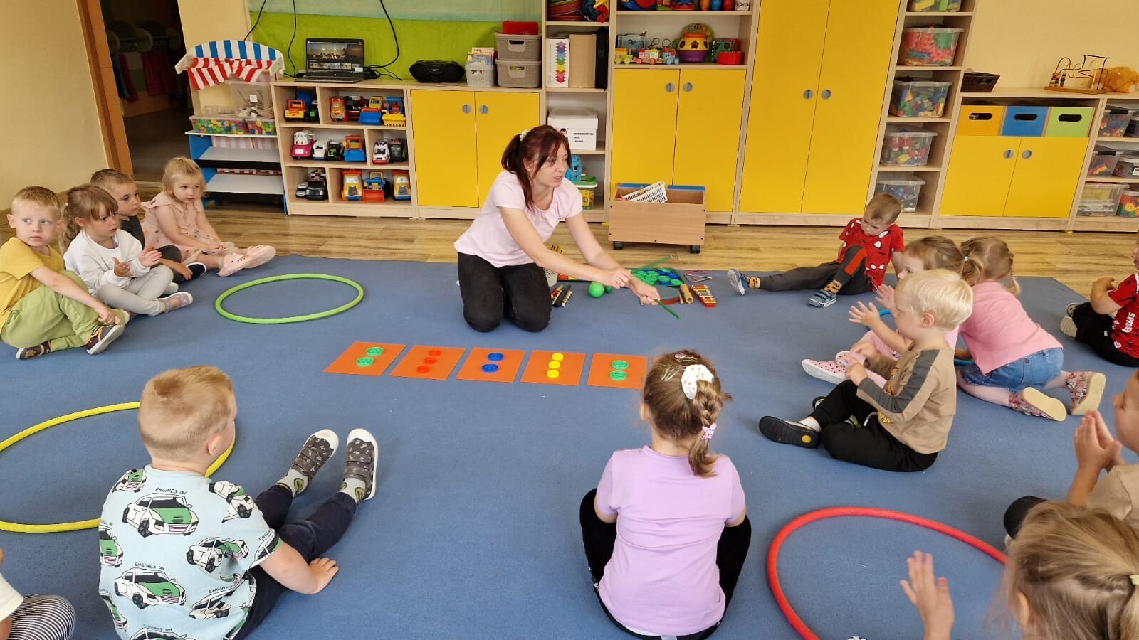 Dziś nasze dzieci miały wspaniałą okazję uczestniczyć w zabawach muzycznych. Poznaliśmy różnorodne instrumenty, a także stworzyliśmy własną orkiestrę! Dzieci miały możliwość grać na interaktywnym dywanie, skacząc po pianinie, a także korzystając z wirtualnej gitary i skrzypiec. Rozwiązywaliśmy również wirtualne memory instrumentalne, co dostarczyło nam wielu radości i pozytywnych emocji.