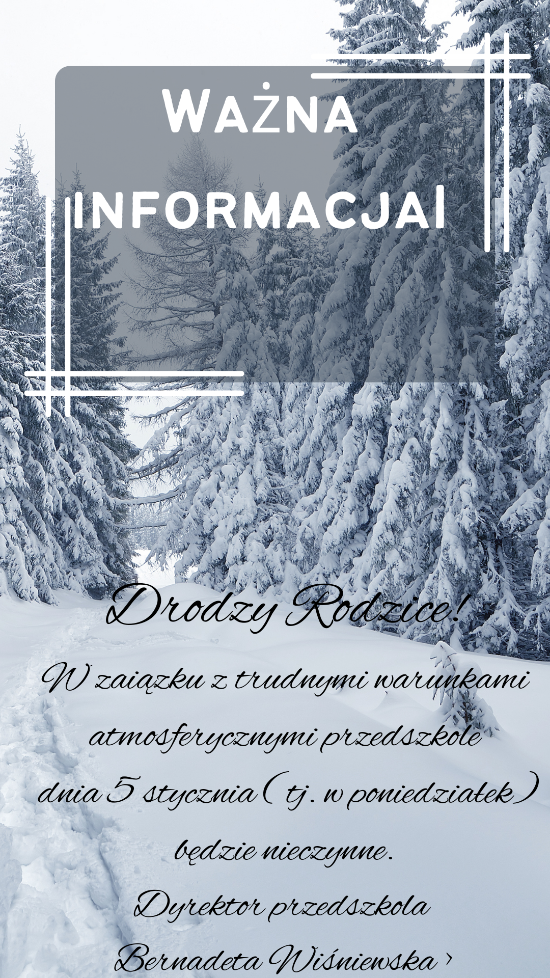 W związku z trudnymi warunkami atmosferycznymi przedszkole dnia 5 stycznia ( tj. w poniedziałek ) będzie nieczynne.