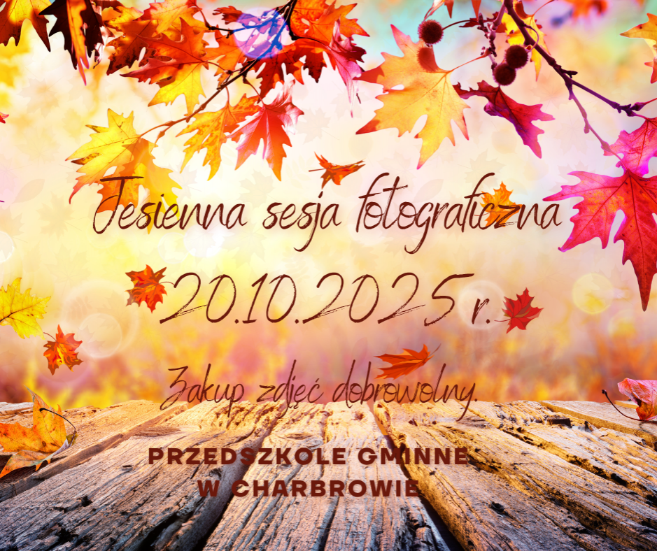 Dnia 20.10.2025r. ( poniedziałek) o godz. 9.00 , odbędzie się w naszym przedszkolu jesienna sesja fotograficzna. Fotograf wykona zdjęcia indywidualne i grupowe. Rodzice dzieci, którzy zainteresowani są wykonaniem zdjęć specjalnych do dokumentów proszeni są o zgłoszenie do wychowawców grup.