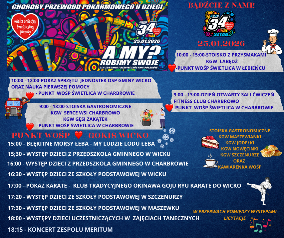 Serdecznie zapraszam rodziców wraz z dziećmi do udziału w WOŚP w GOK w Wicku , która odbędzie się w najbliższą niedzielę tj. dnia 25.01.2026r.