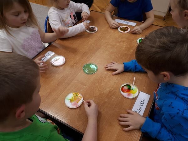 Do pojemników wlaliśmy mleko, a następnie dodajemy stopniowo rozpuszczone barwniki spożywcze.
