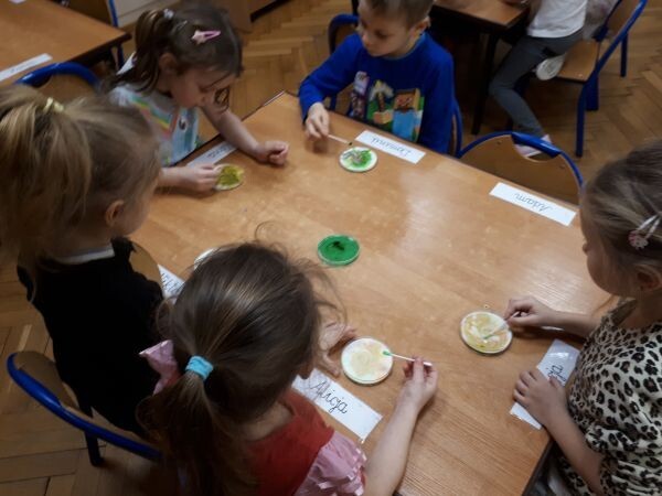 Gdy na mleku zebrała się już tęczowa tafla kolorów, namaczaliśmy patyczki w płynie do mycia naczyń i delikatnie dotykaliśmy powierzchni mleka. Barwniki pod wpływem płynu i zmiany napięcia powierzchniowego zaczęły samoistnie wirować i mieszać się tworzą wspaniałe, barwne widowisko.