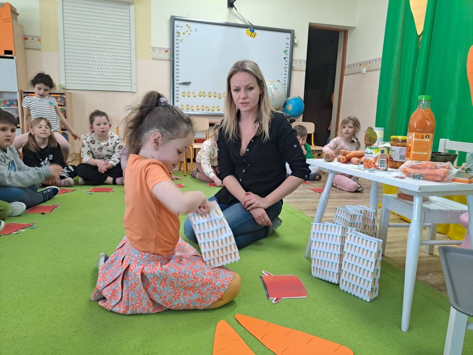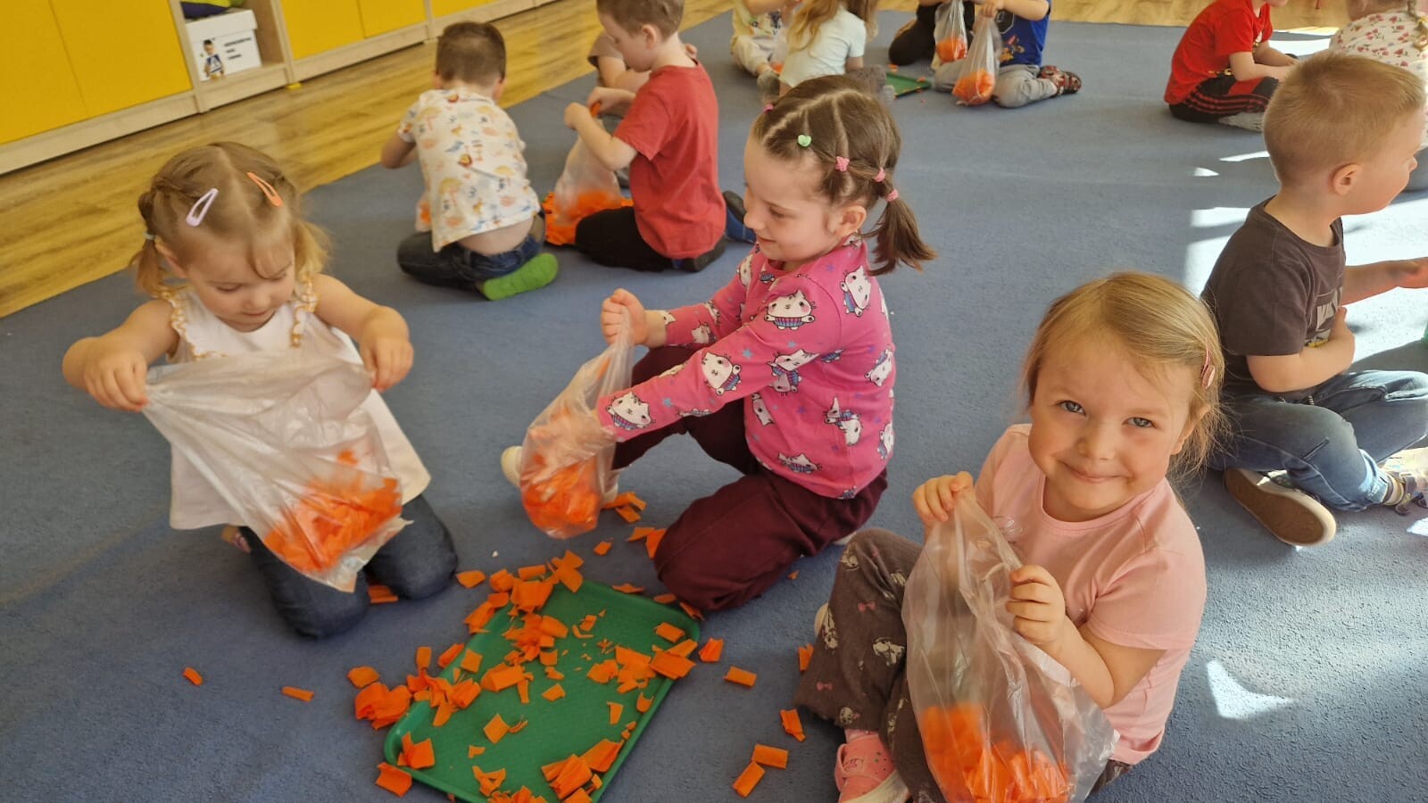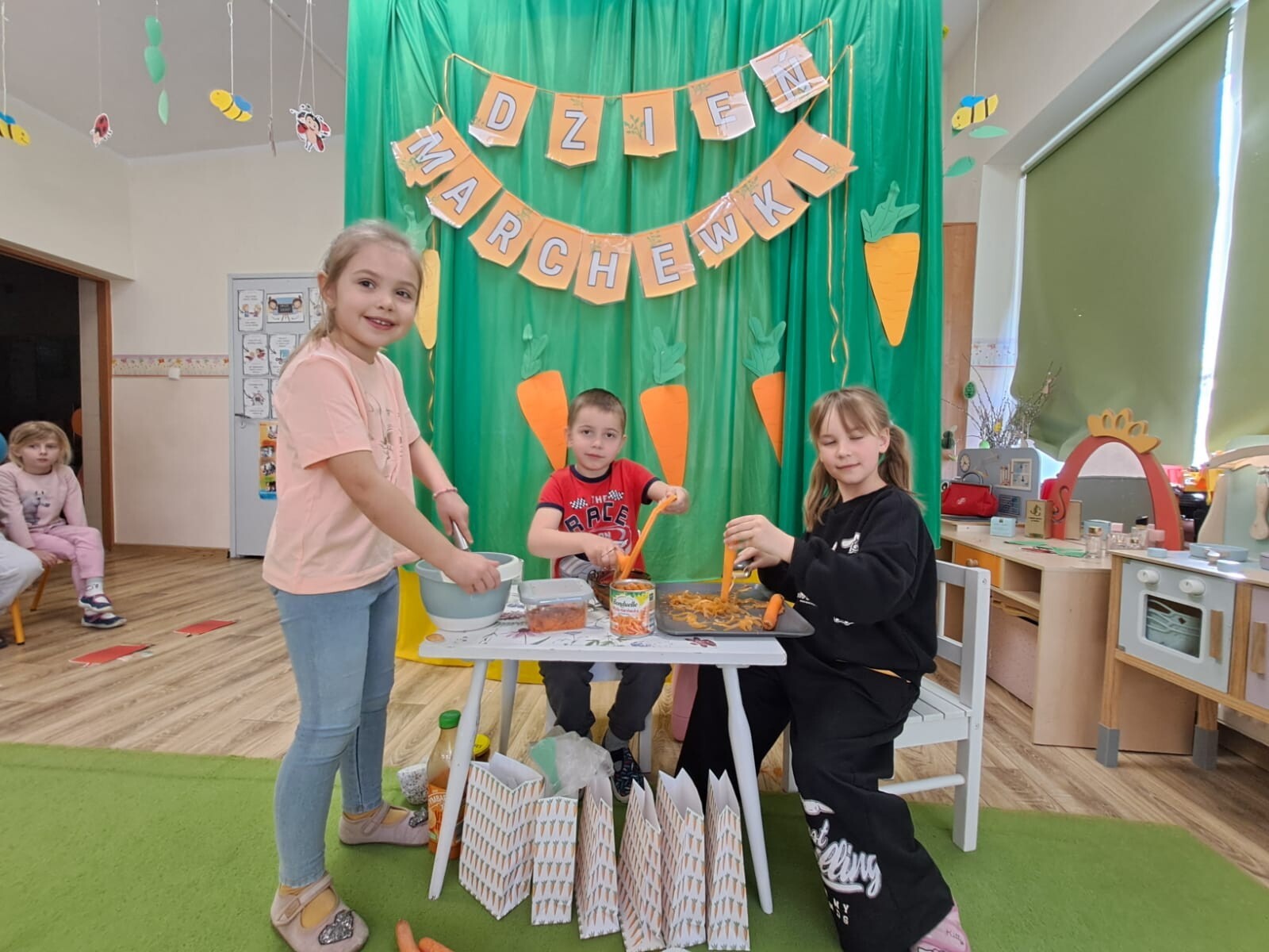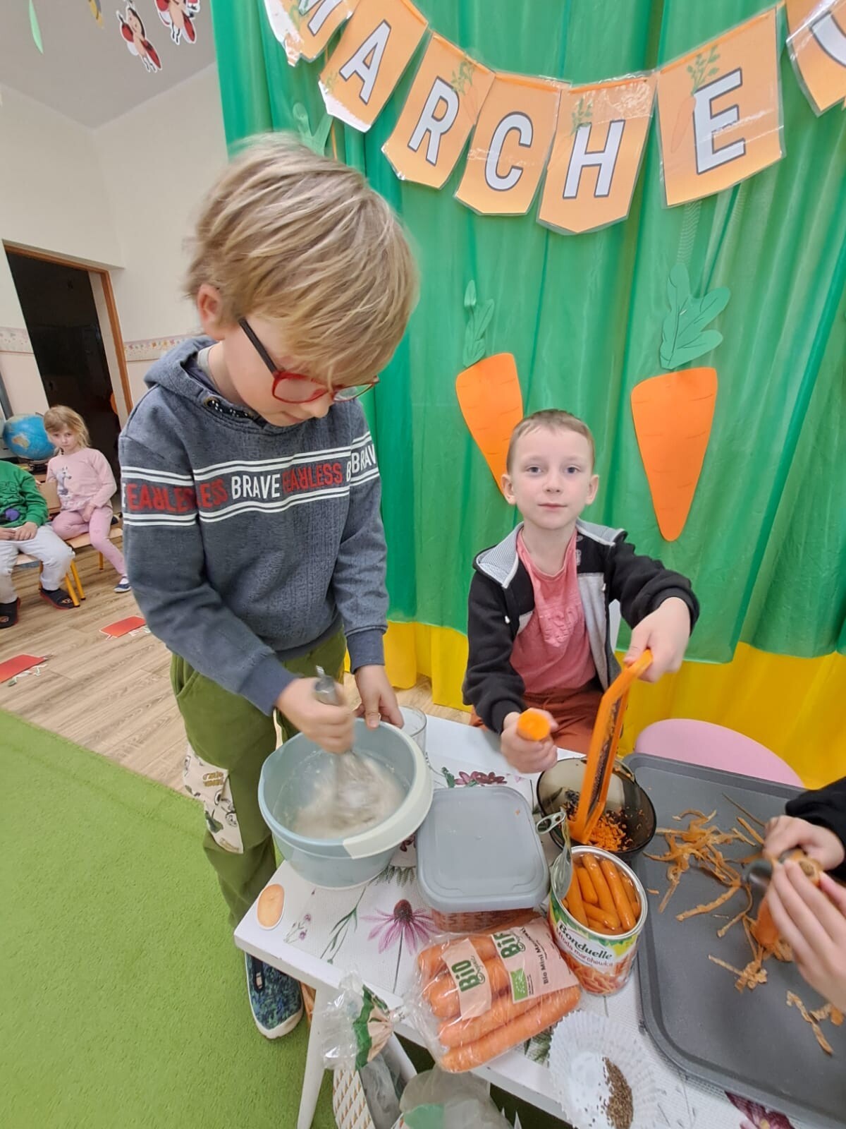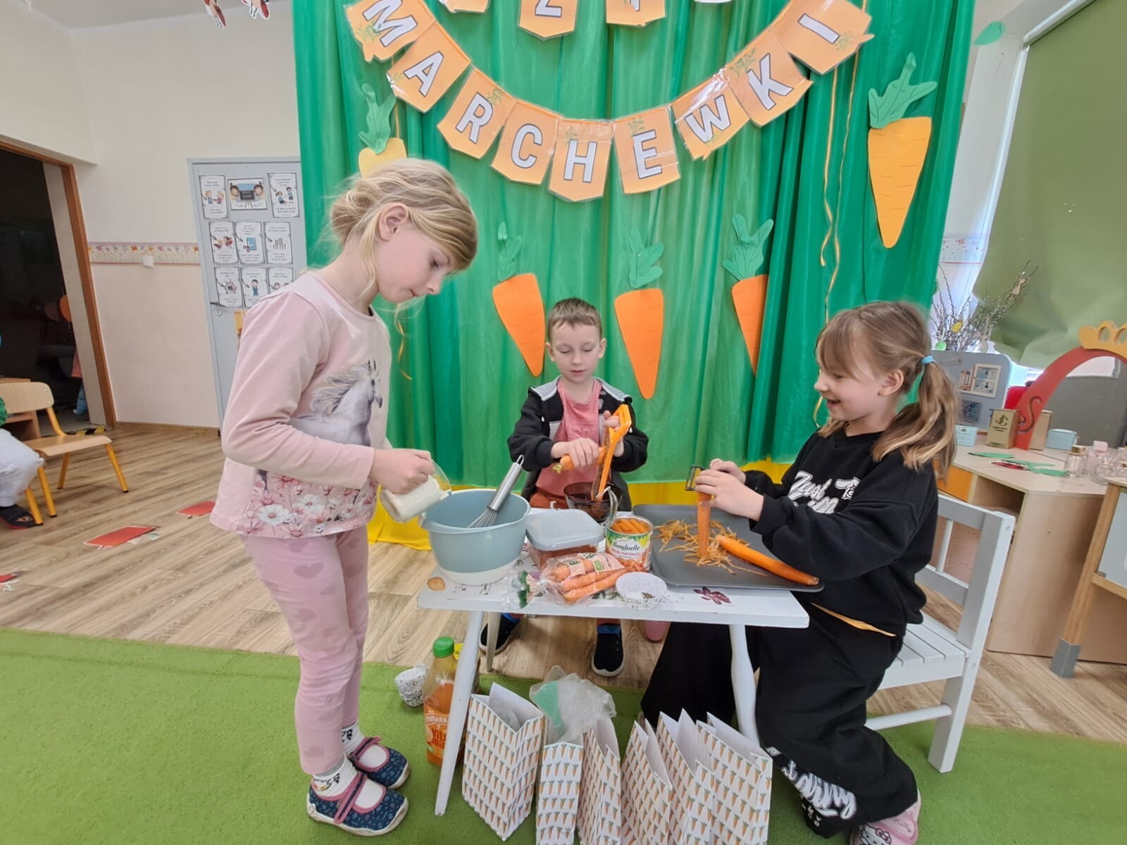 W ramach aktywności kulinarnych dzieci spróbowały pysznego soku z marchwi, piekły babeczki oraz ciasto marchewkowe. Wzięły również udział w konkursie „Jedz marchewkę jak króliczek", co dostarczyło im wiele radości i śmiechu. Najstarsza grupa miała dodatkowo okazję uczestniczyć w matematycznej zabawie „Garnek pełen warzyw", która rozwijała ich umiejętności liczenia i logicznego myślenia.