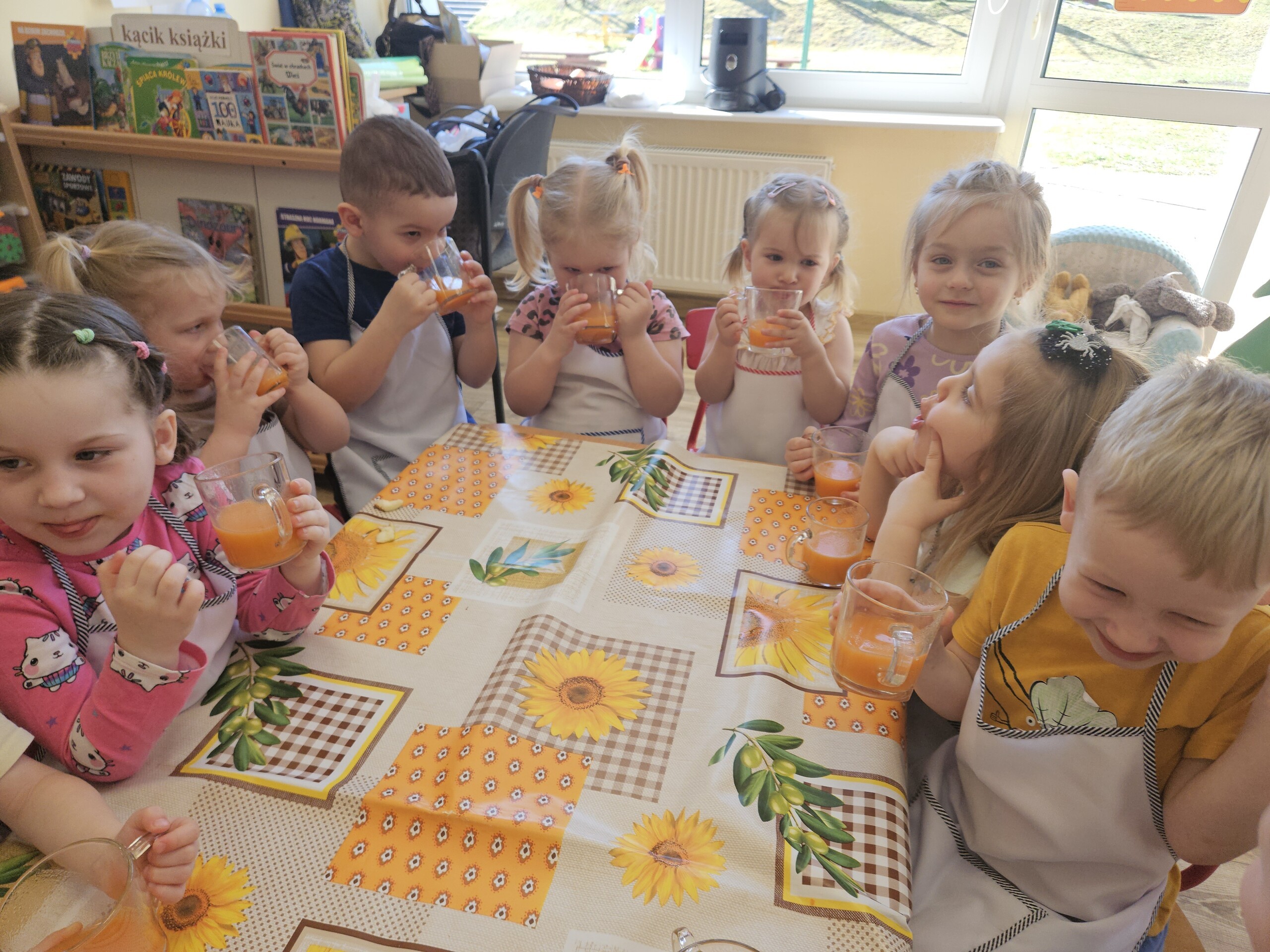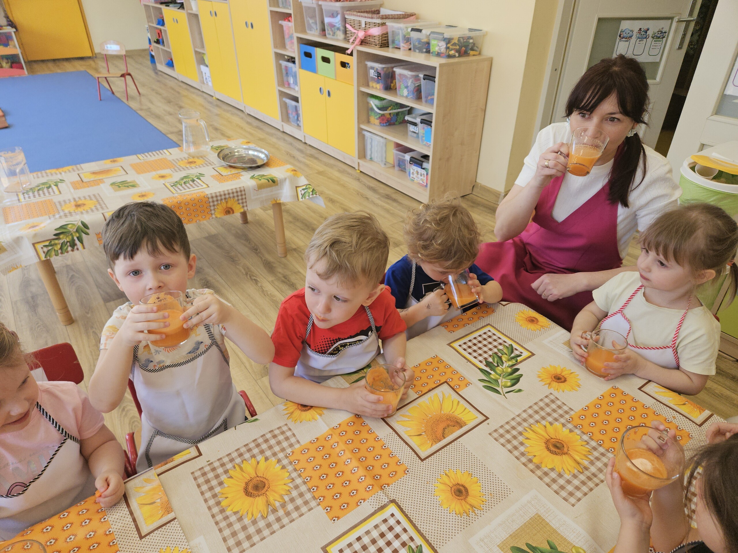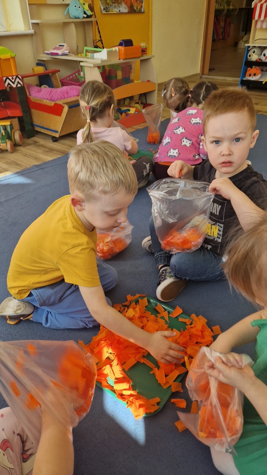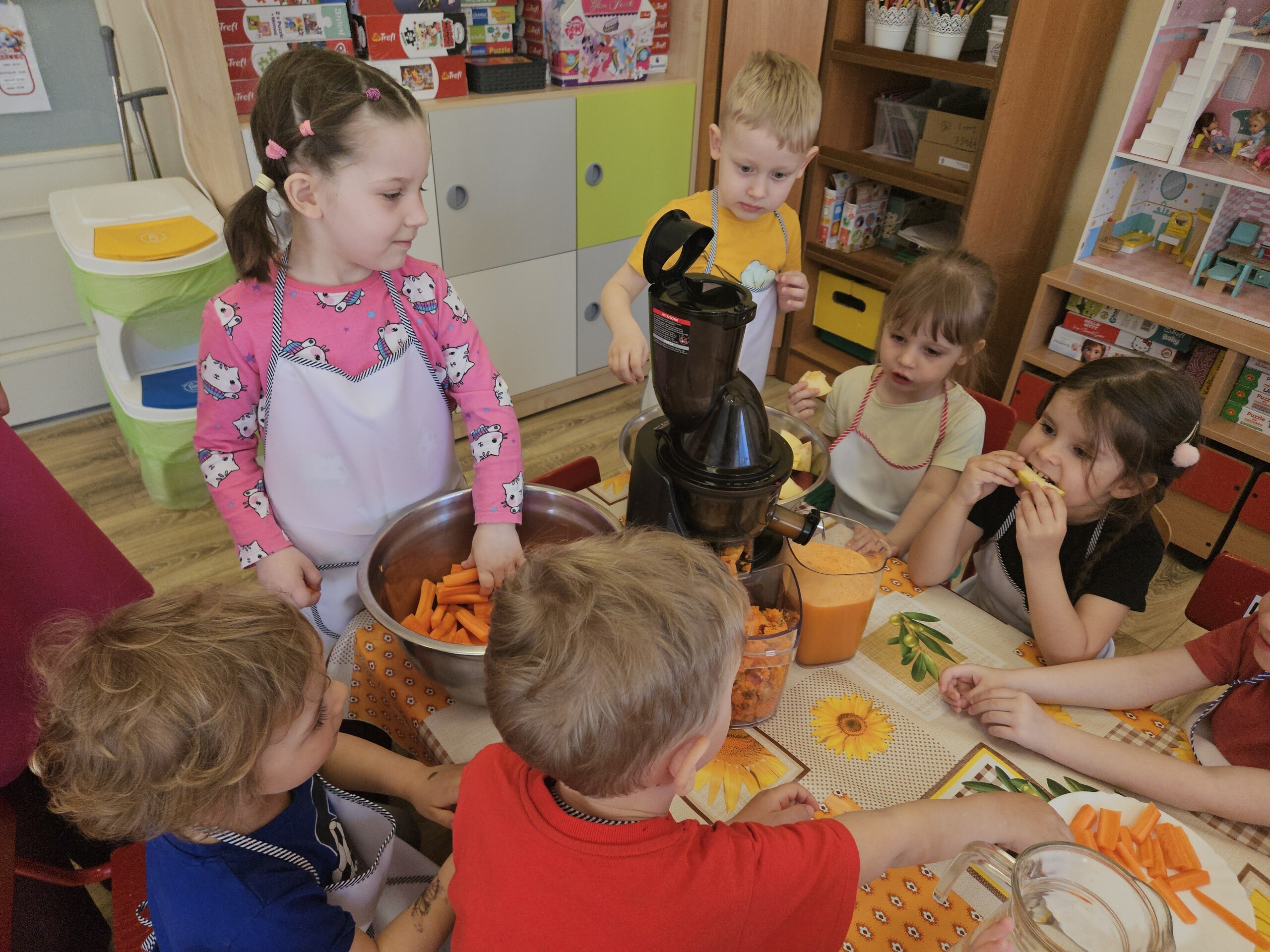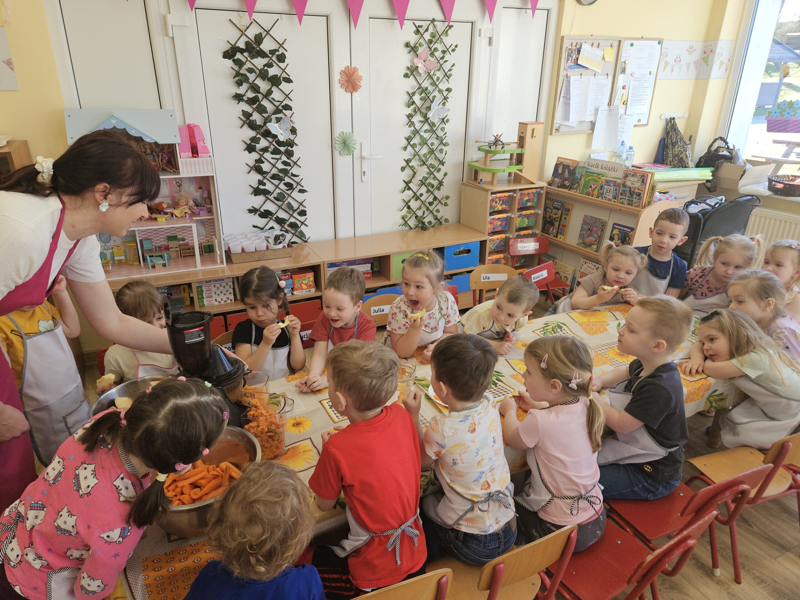 W ramach aktywności kulinarnych dzieci spróbowały pysznego soku z marchwi, piekły babeczki oraz ciasto marchewkowe. Wzięły również udział w konkursie „Jedz marchewkę jak króliczek", co dostarczyło im wiele radości i śmiechu. Najstarsza grupa miała dodatkowo okazję uczestniczyć w matematycznej zabawie „Garnek pełen warzyw", która rozwijała ich umiejętności liczenia i logicznego myślenia.