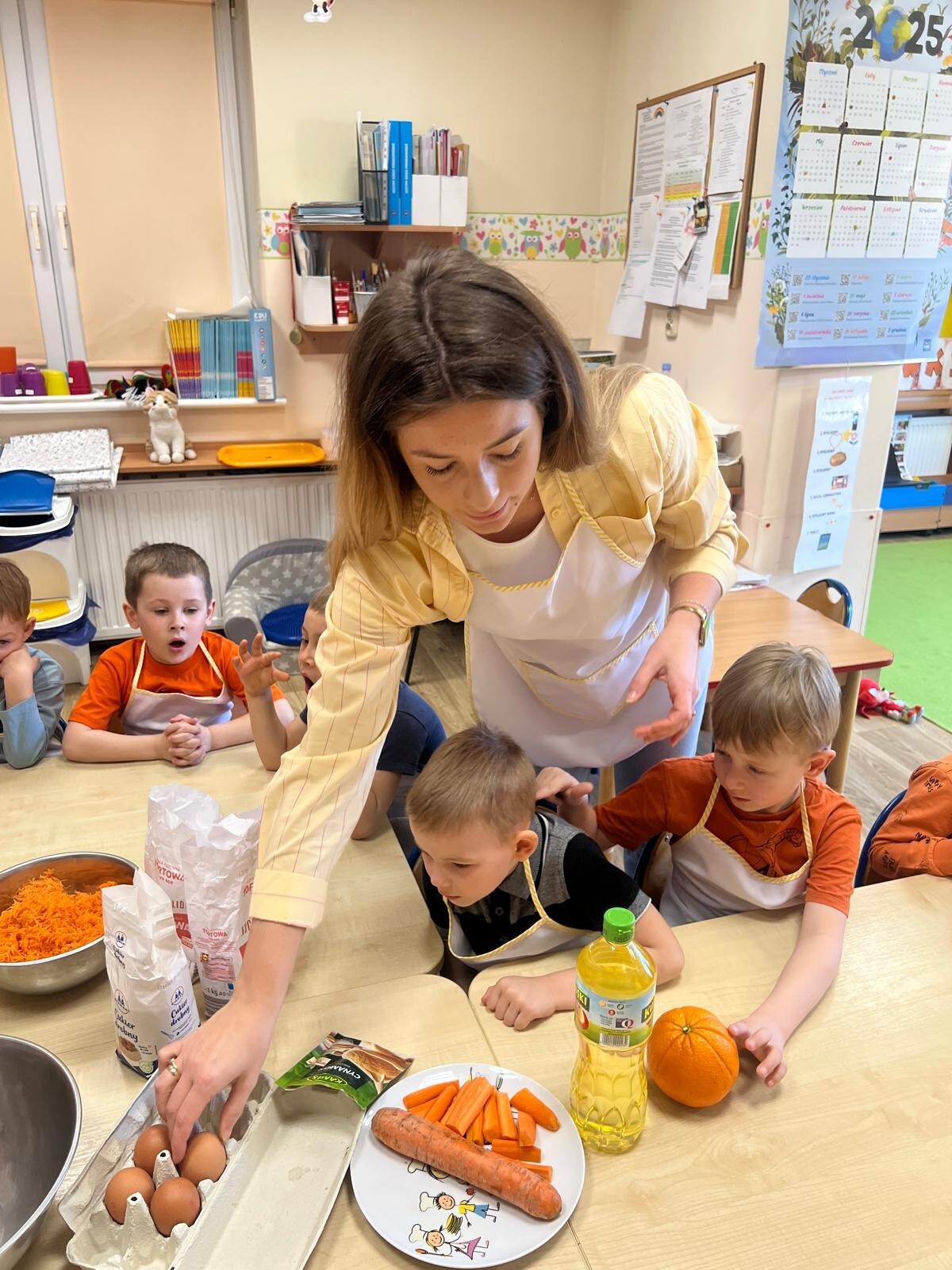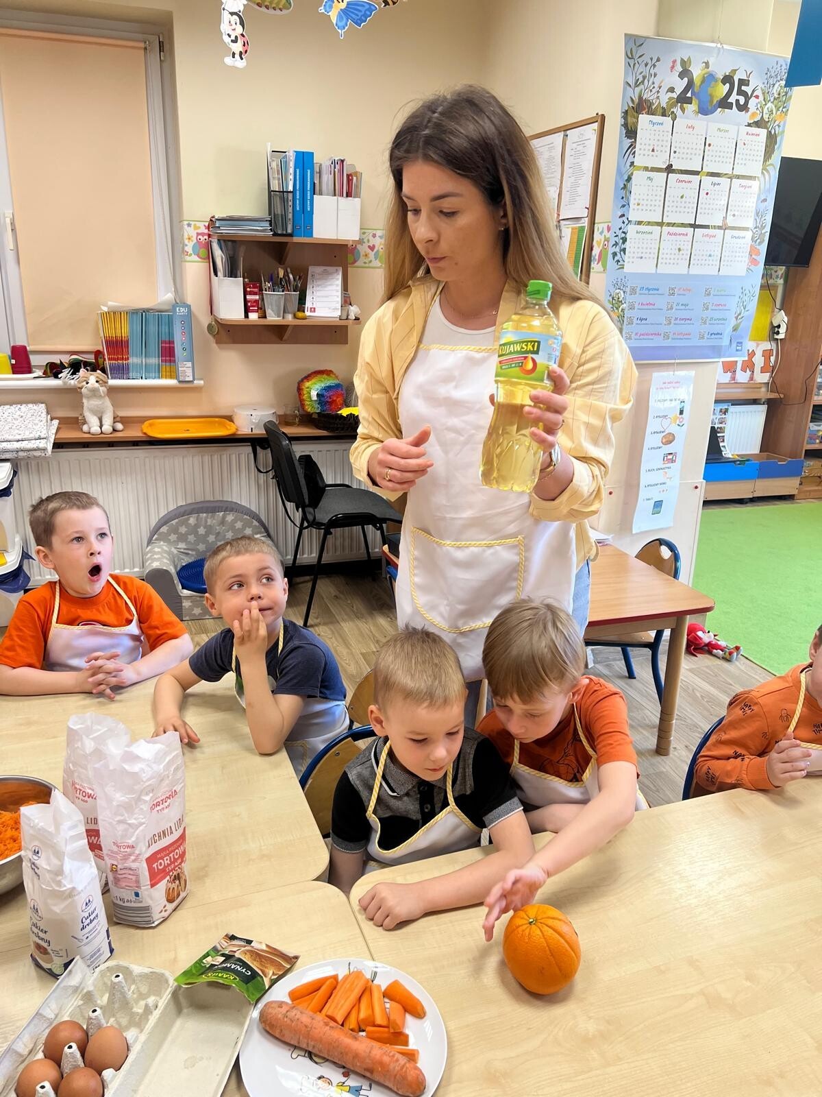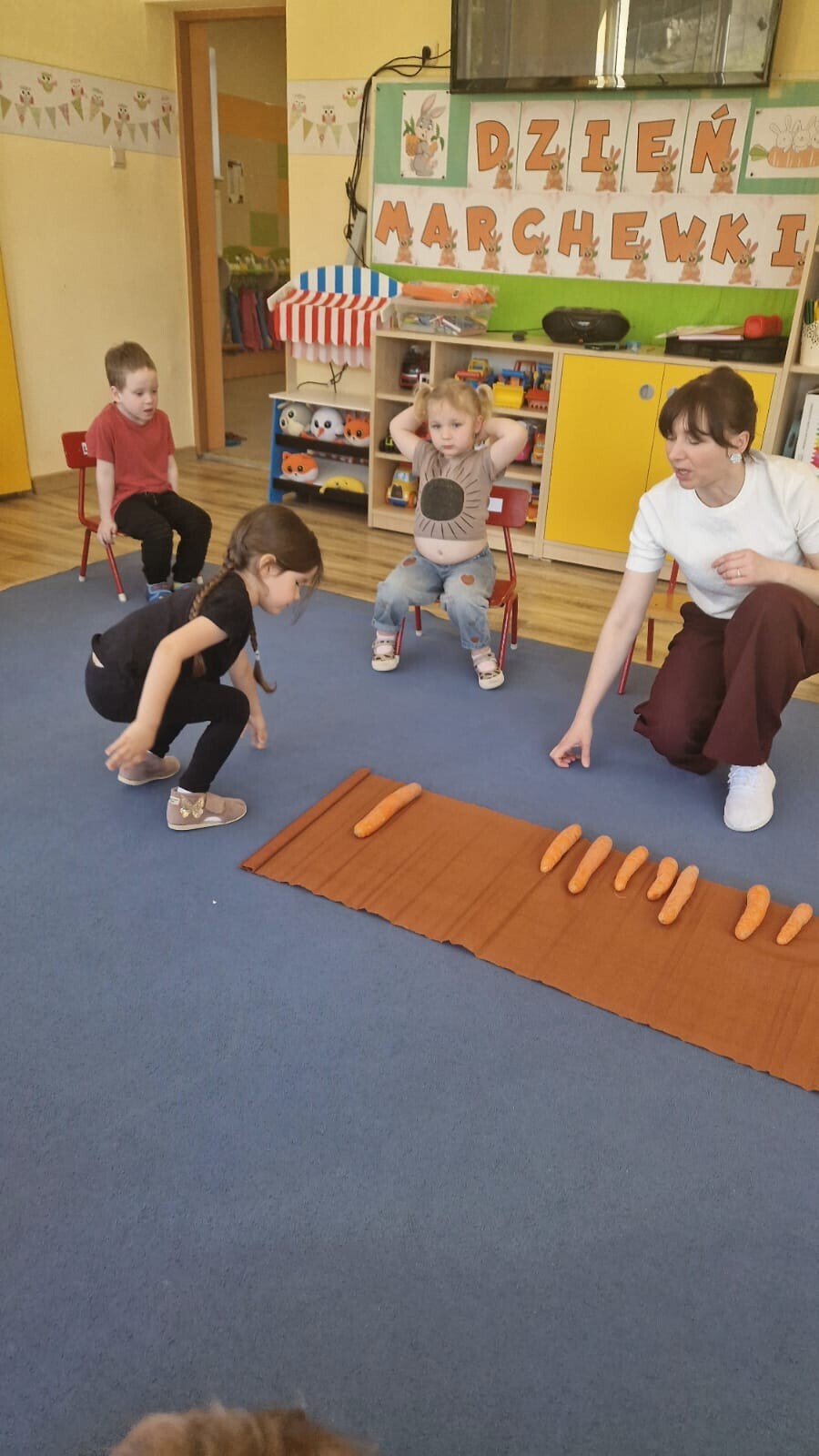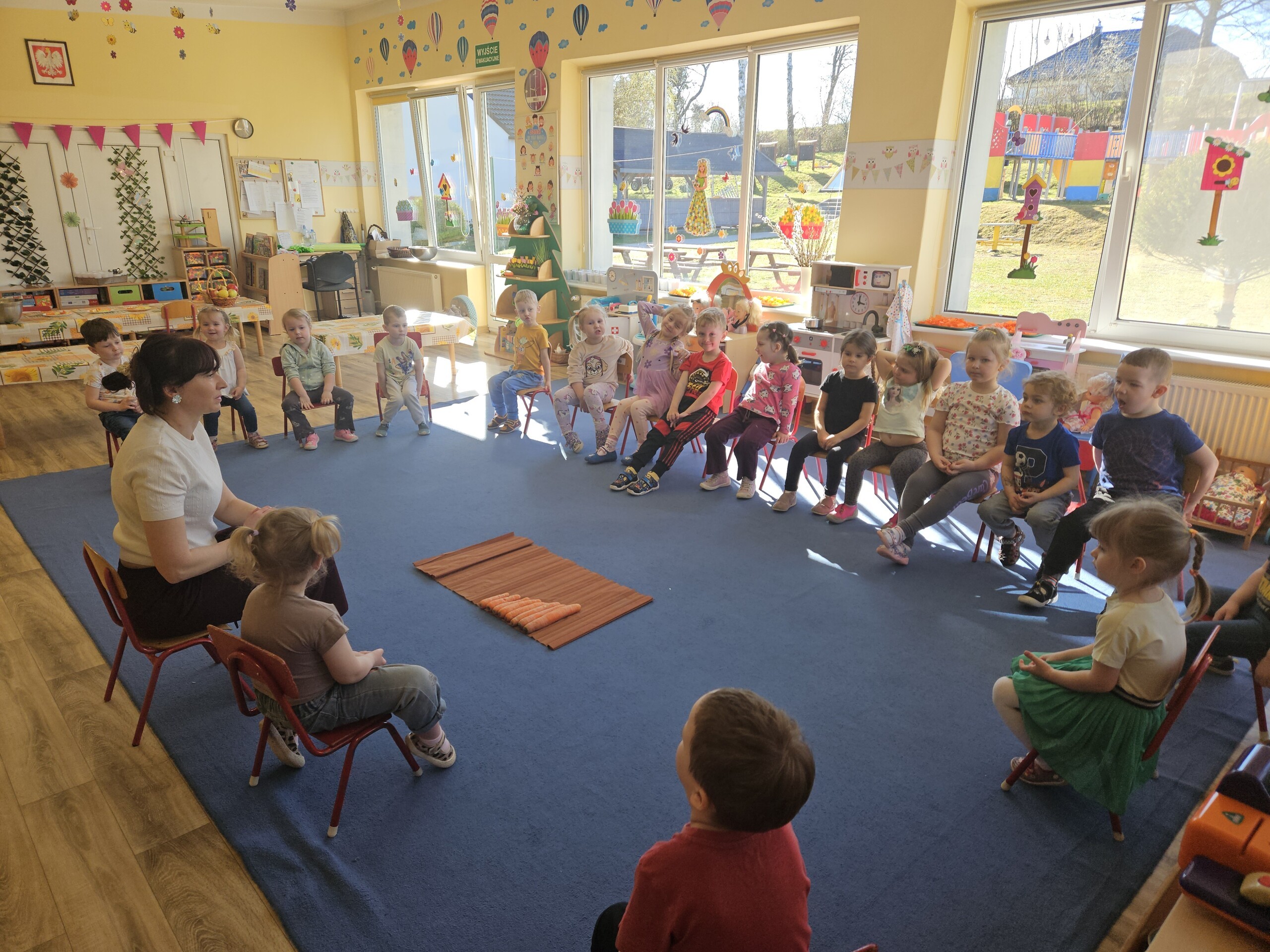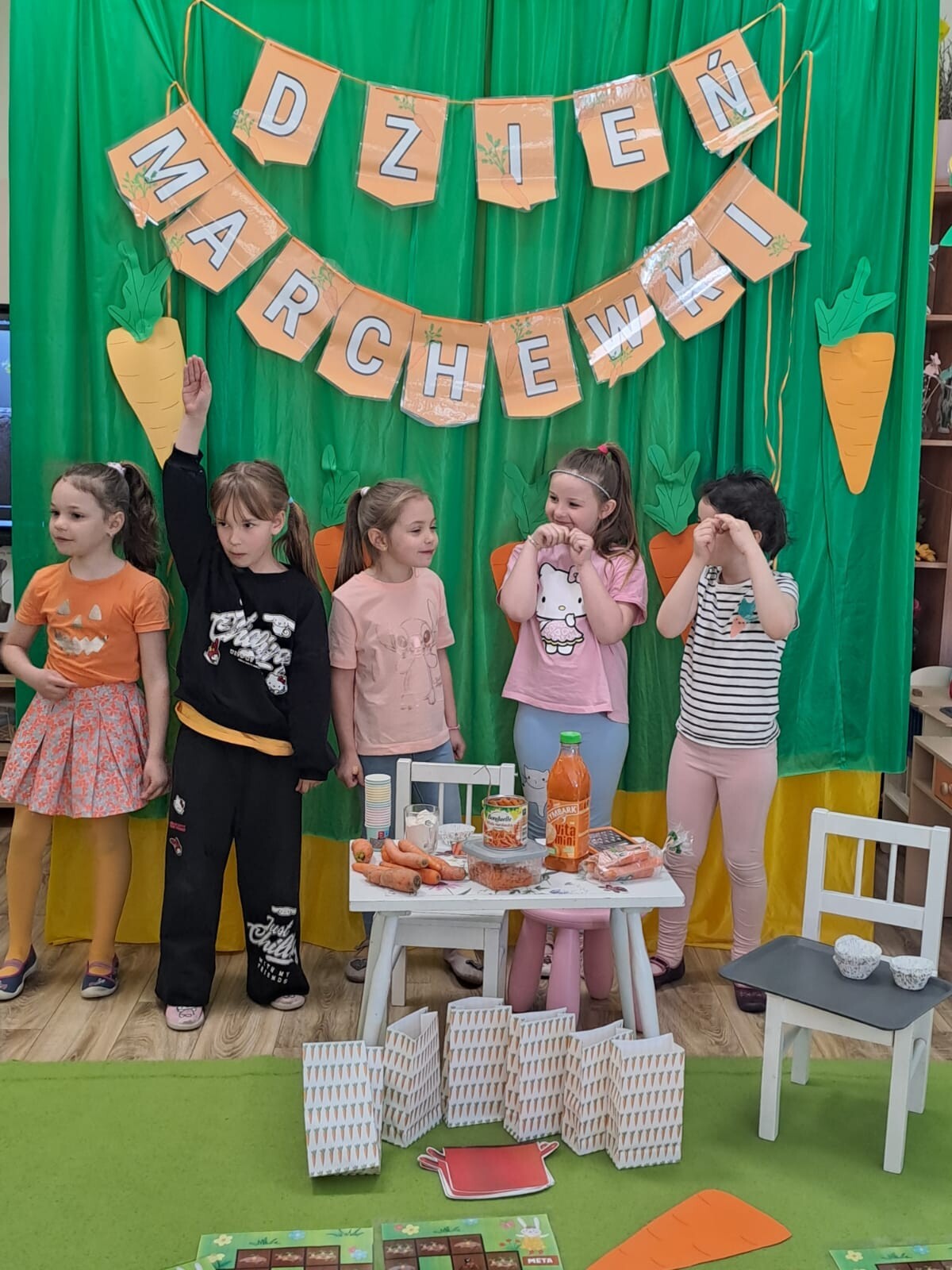 W ramach aktywności kulinarnych dzieci spróbowały pysznego soku z marchwi, piekły babeczki oraz ciasto marchewkowe. Wzięły również udział w konkursie „Jedz marchewkę jak króliczek", co dostarczyło im wiele radości i śmiechu. Najstarsza grupa miała dodatkowo okazję uczestniczyć w matematycznej zabawie „Garnek pełen warzyw", która rozwijała ich umiejętności liczenia i logicznego myślenia.