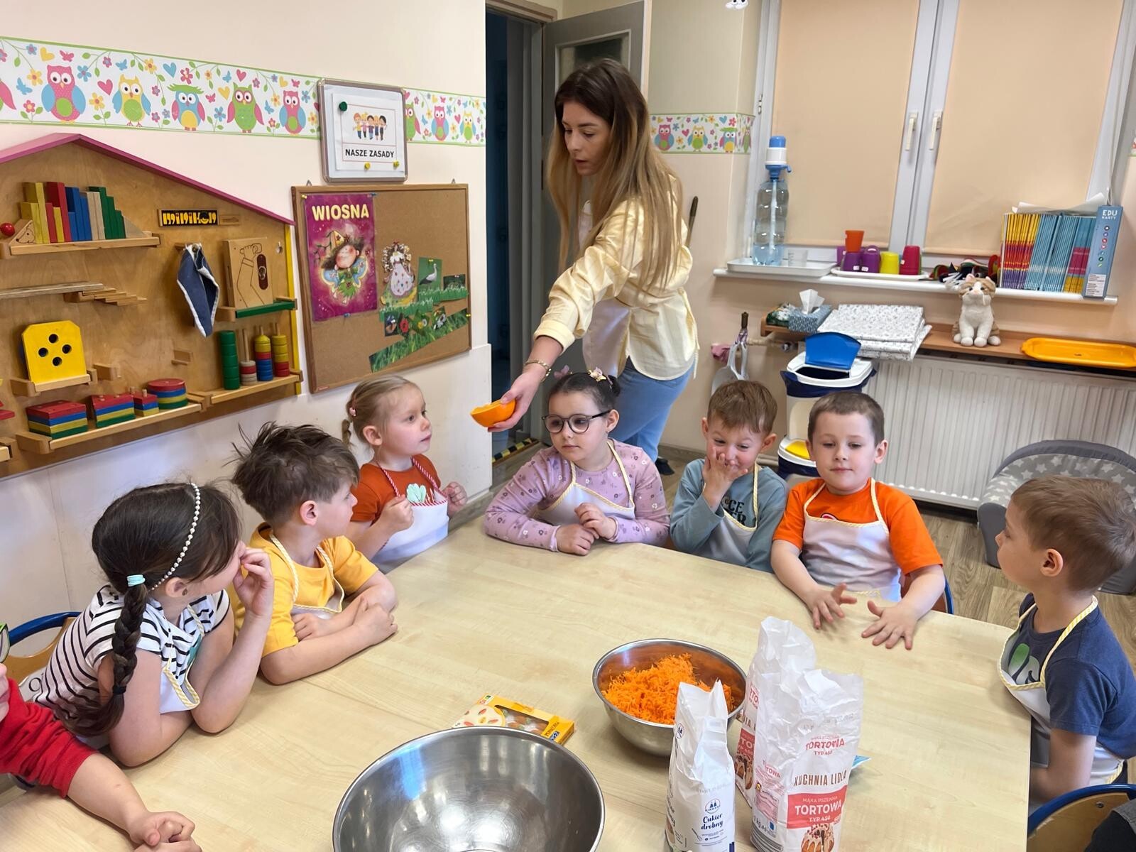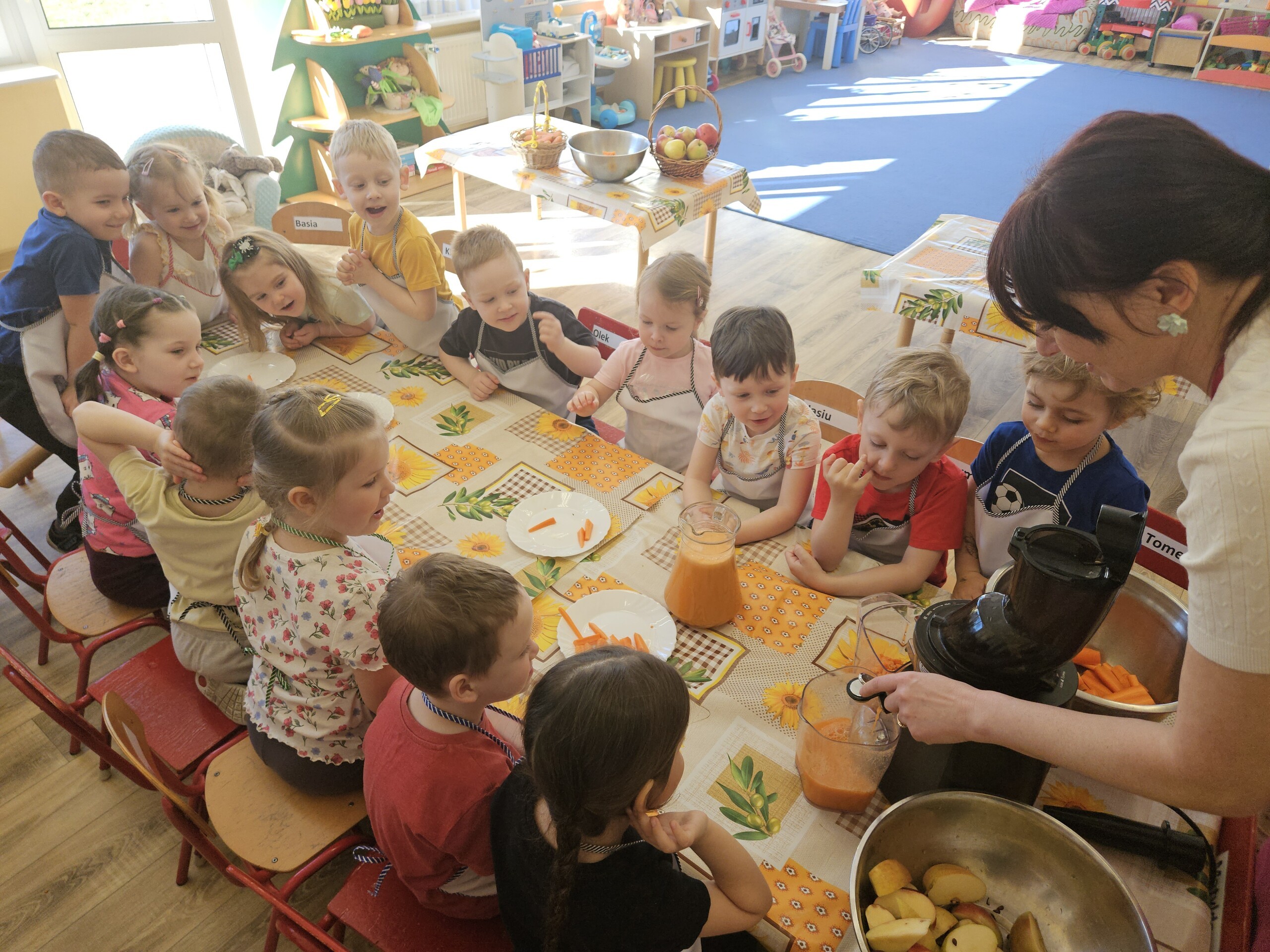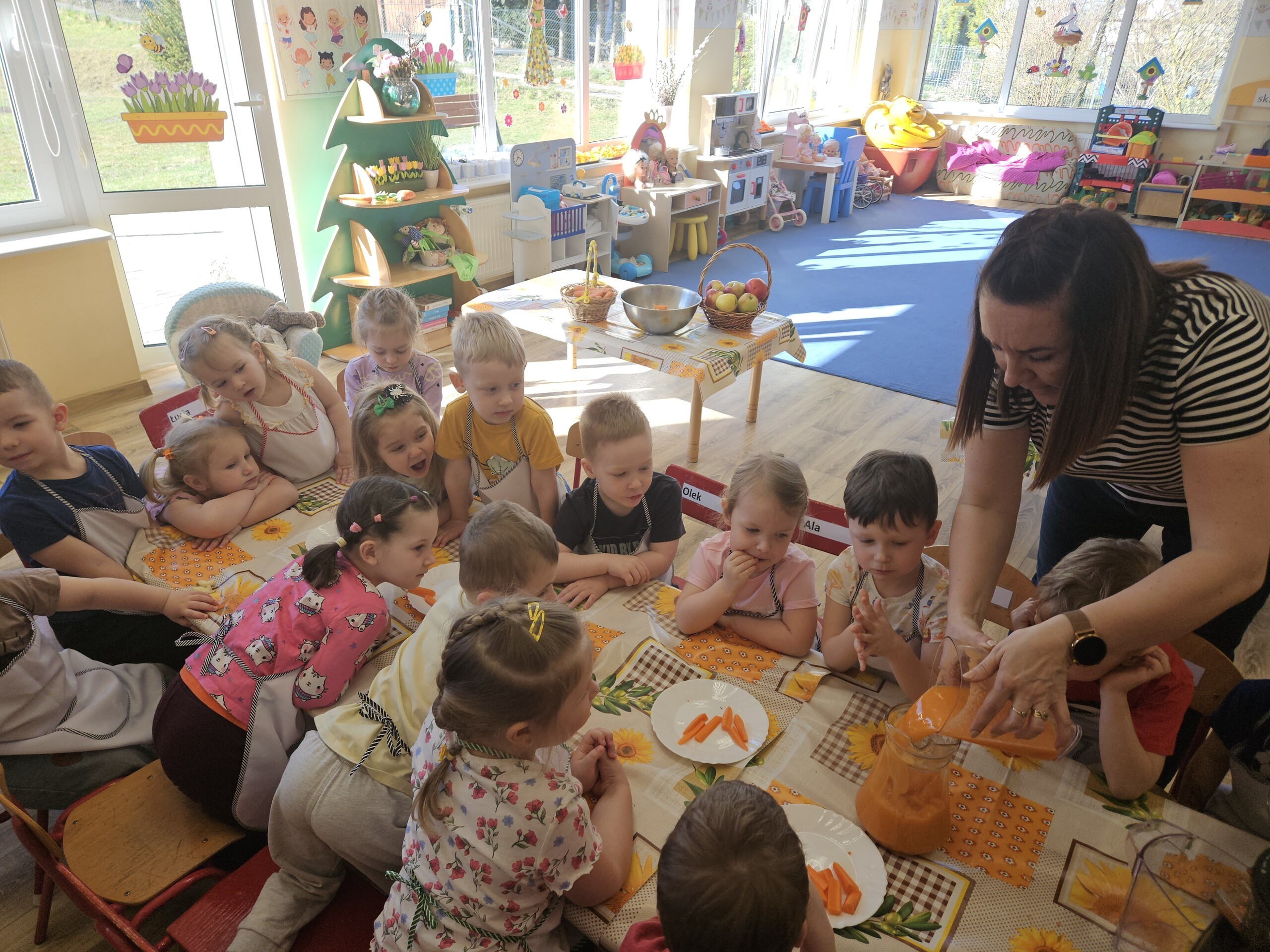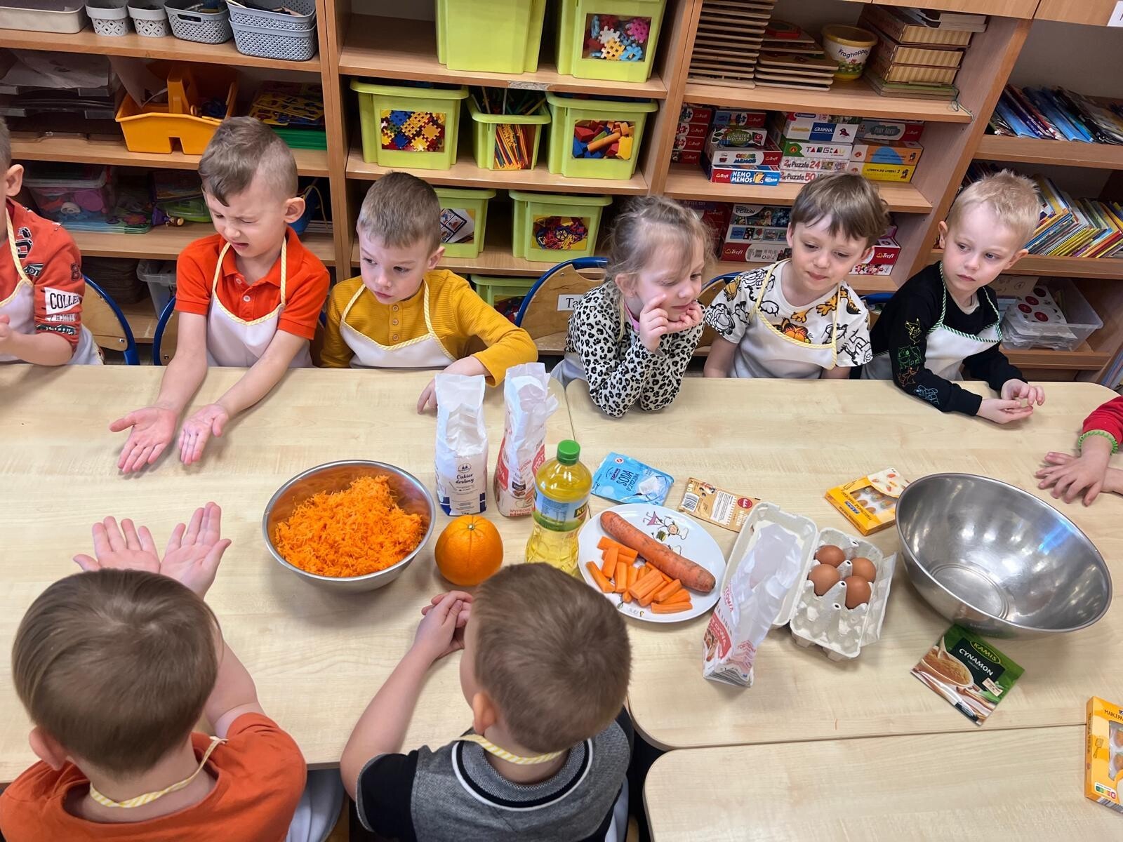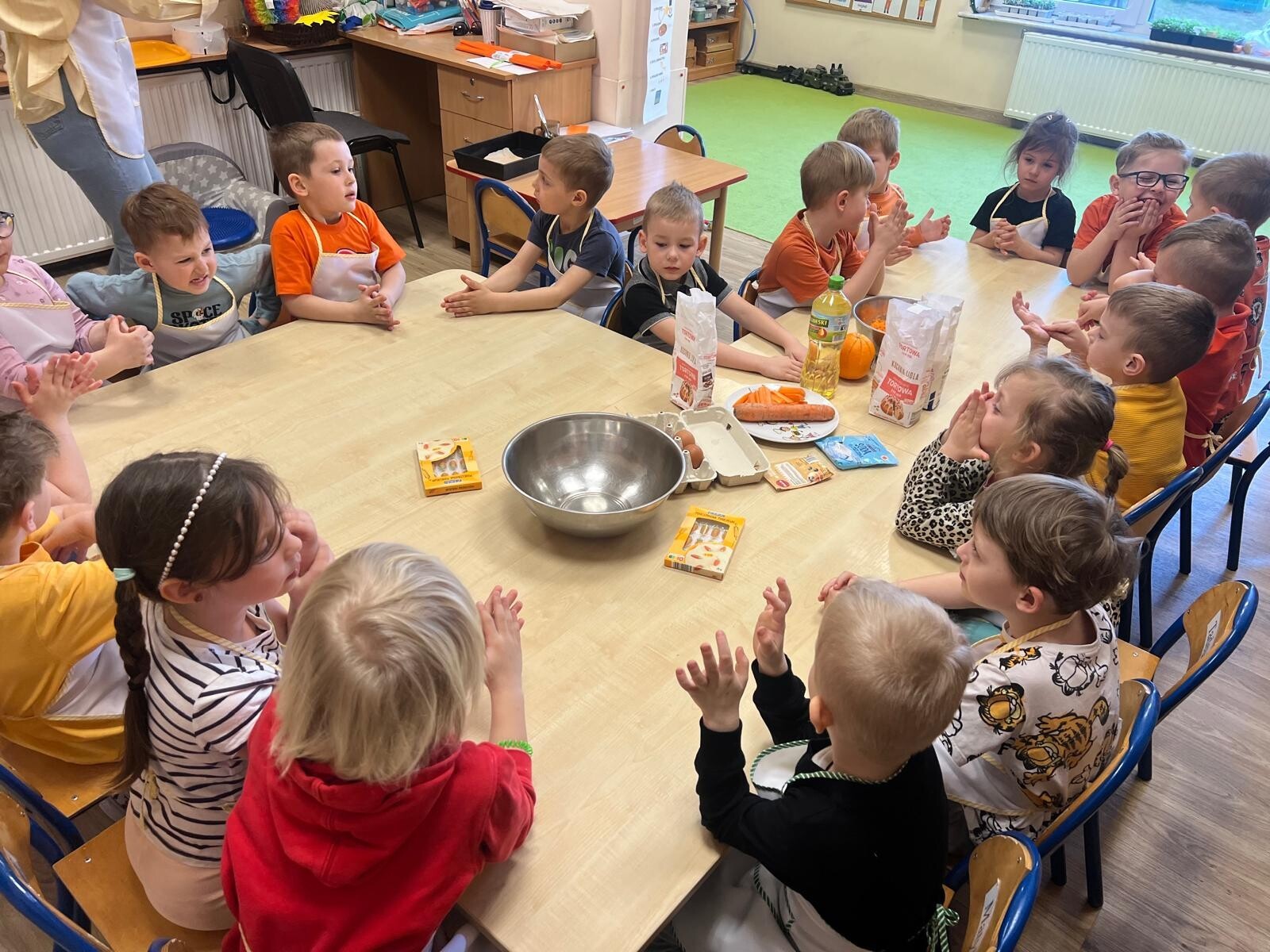 W ramach aktywności kulinarnych dzieci spróbowały pysznego soku z marchwi, piekły babeczki oraz ciasto marchewkowe. Wzięły również udział w konkursie „Jedz marchewkę jak króliczek", co dostarczyło im wiele radości i śmiechu. Najstarsza grupa miała dodatkowo okazję uczestniczyć w matematycznej zabawie „Garnek pełen warzyw", która rozwijała ich umiejętności liczenia i logicznego myślenia.