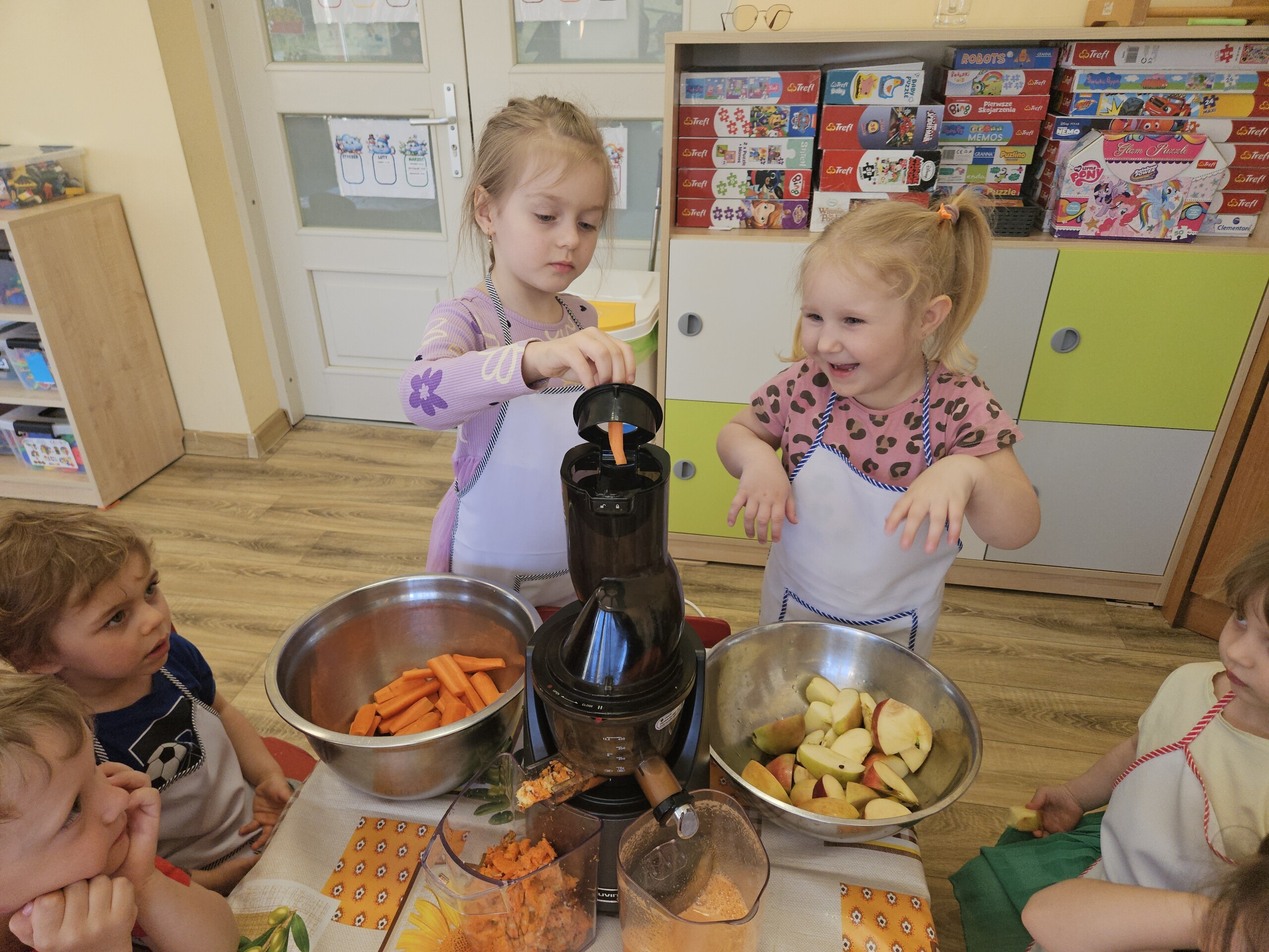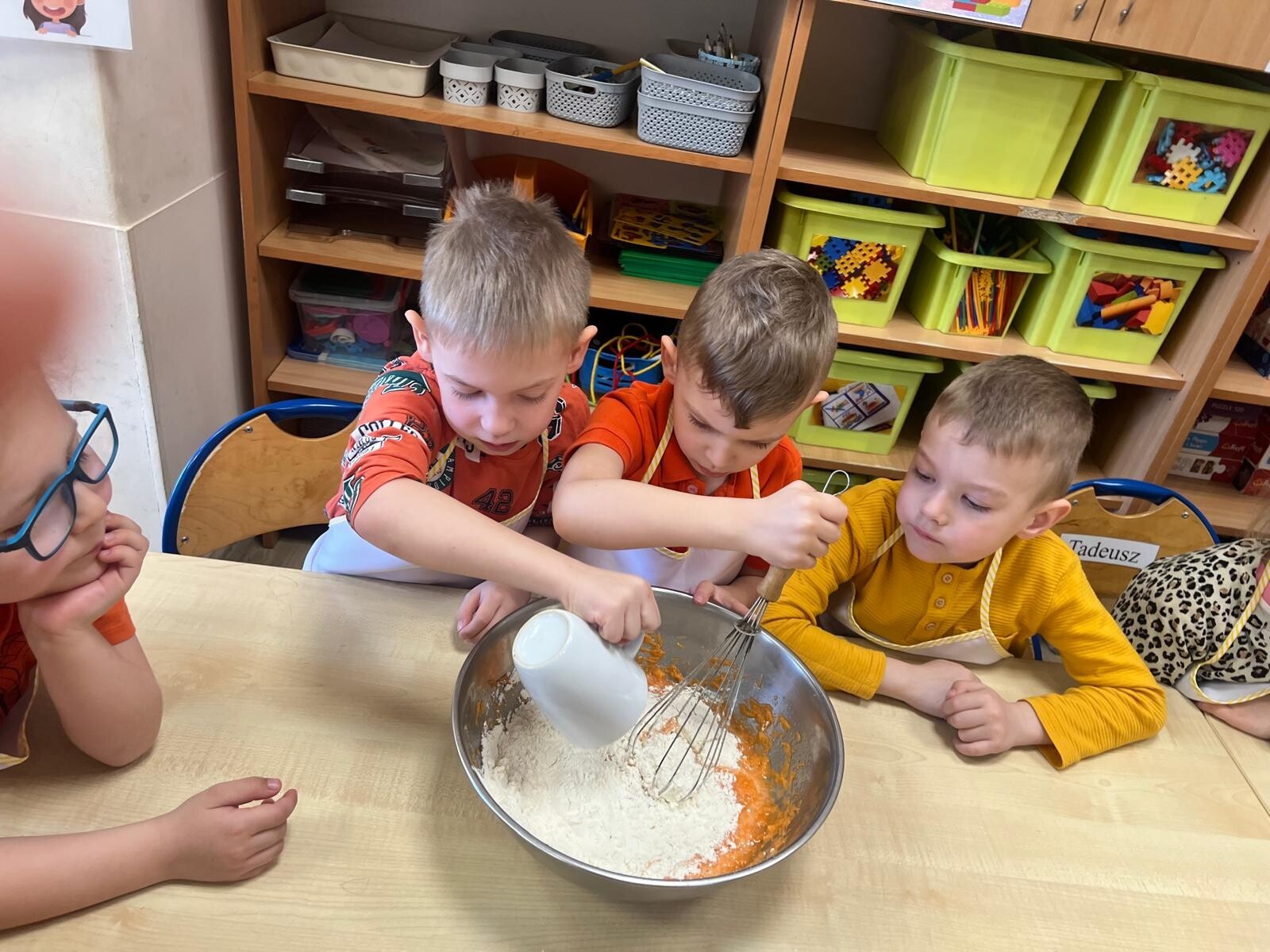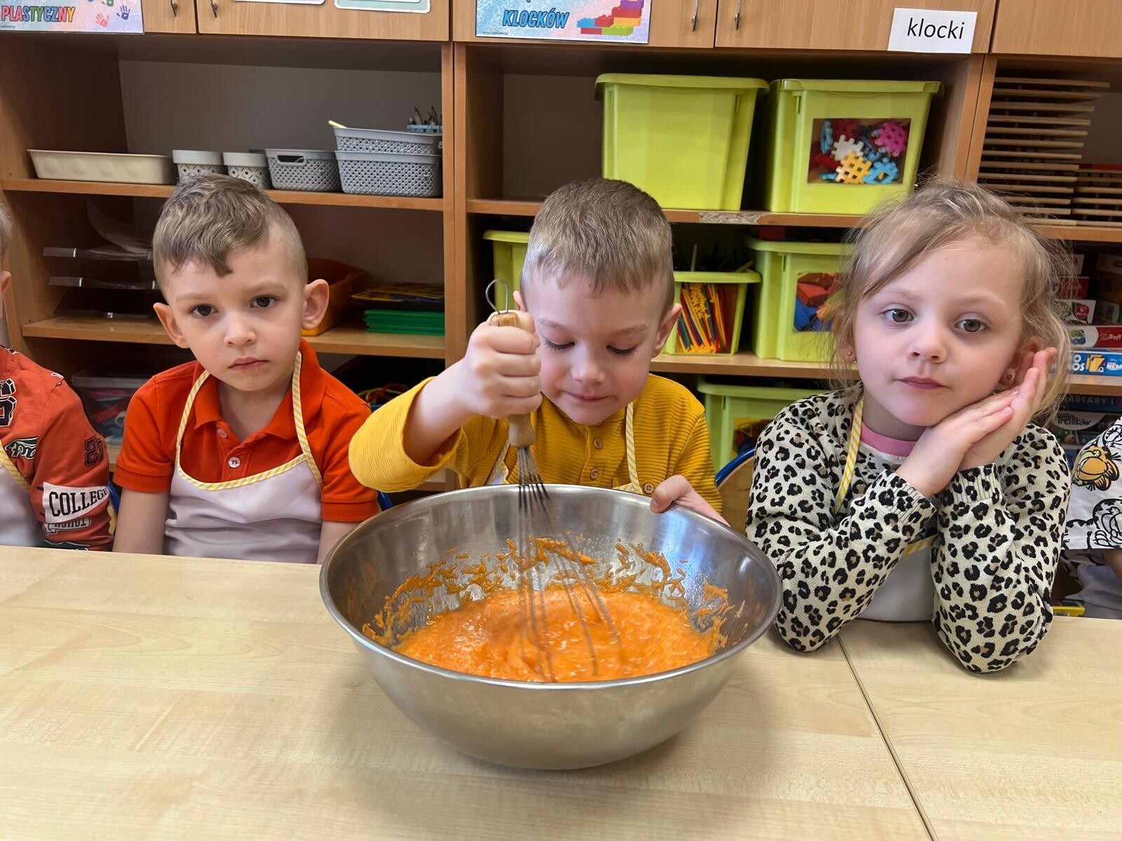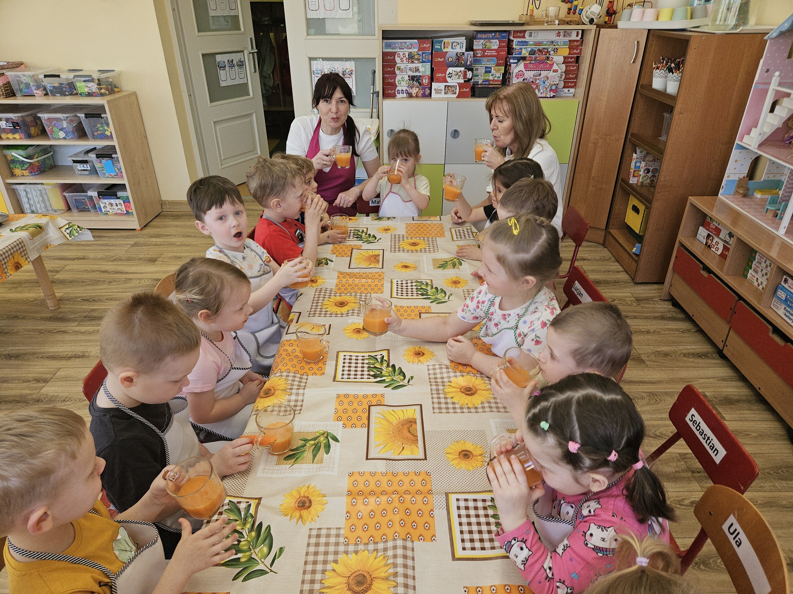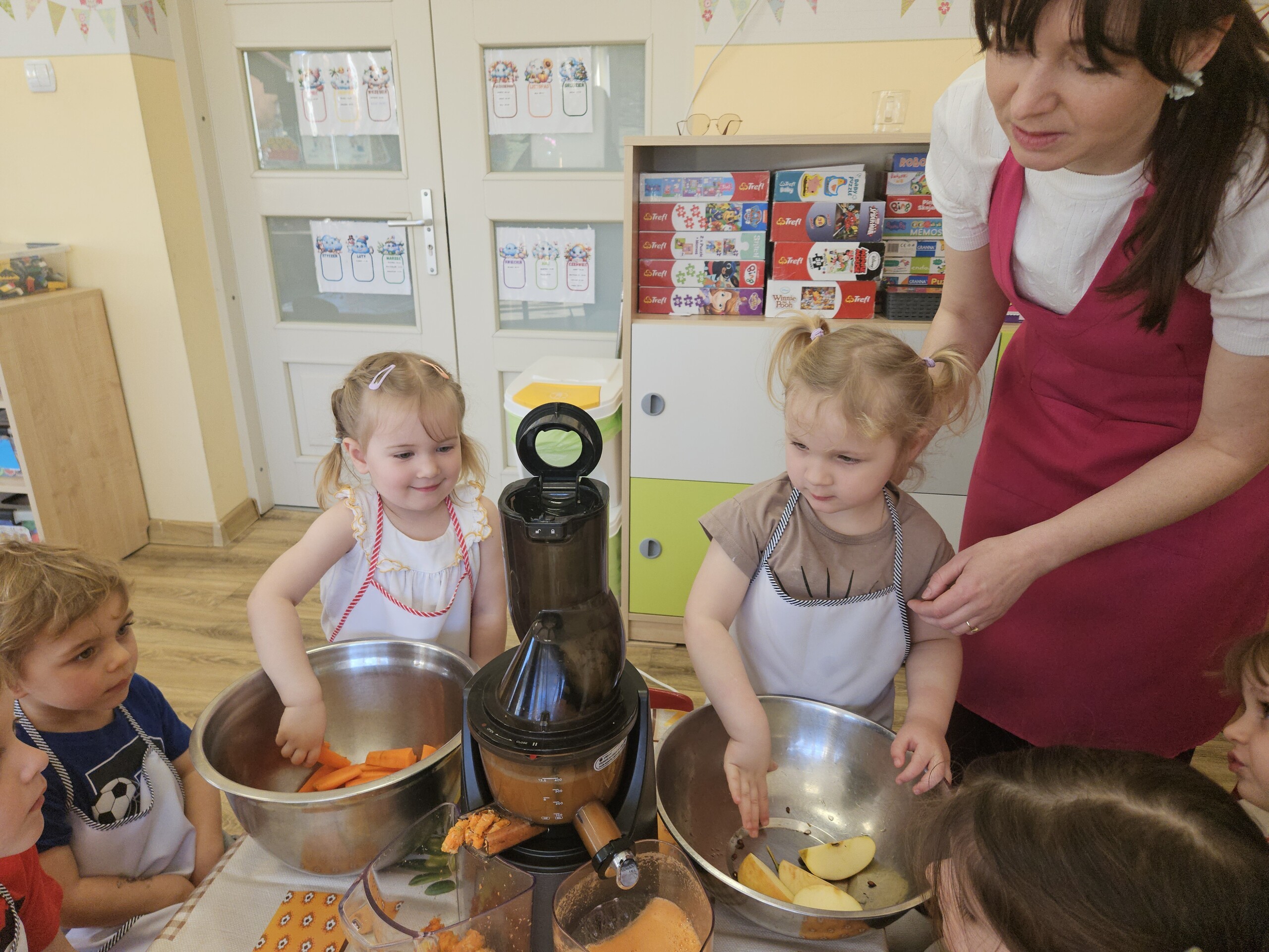 W ramach aktywności kulinarnych dzieci spróbowały pysznego soku z marchwi, piekły babeczki oraz ciasto marchewkowe. Wzięły również udział w konkursie „Jedz marchewkę jak króliczek", co dostarczyło im wiele radości i śmiechu. Najstarsza grupa miała dodatkowo okazję uczestniczyć w matematycznej zabawie „Garnek pełen warzyw", która rozwijała ich umiejętności liczenia i logicznego myślenia.