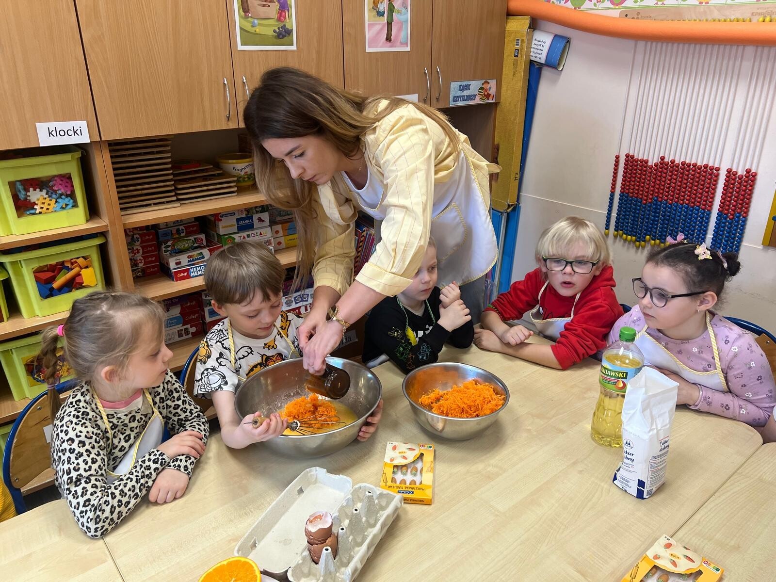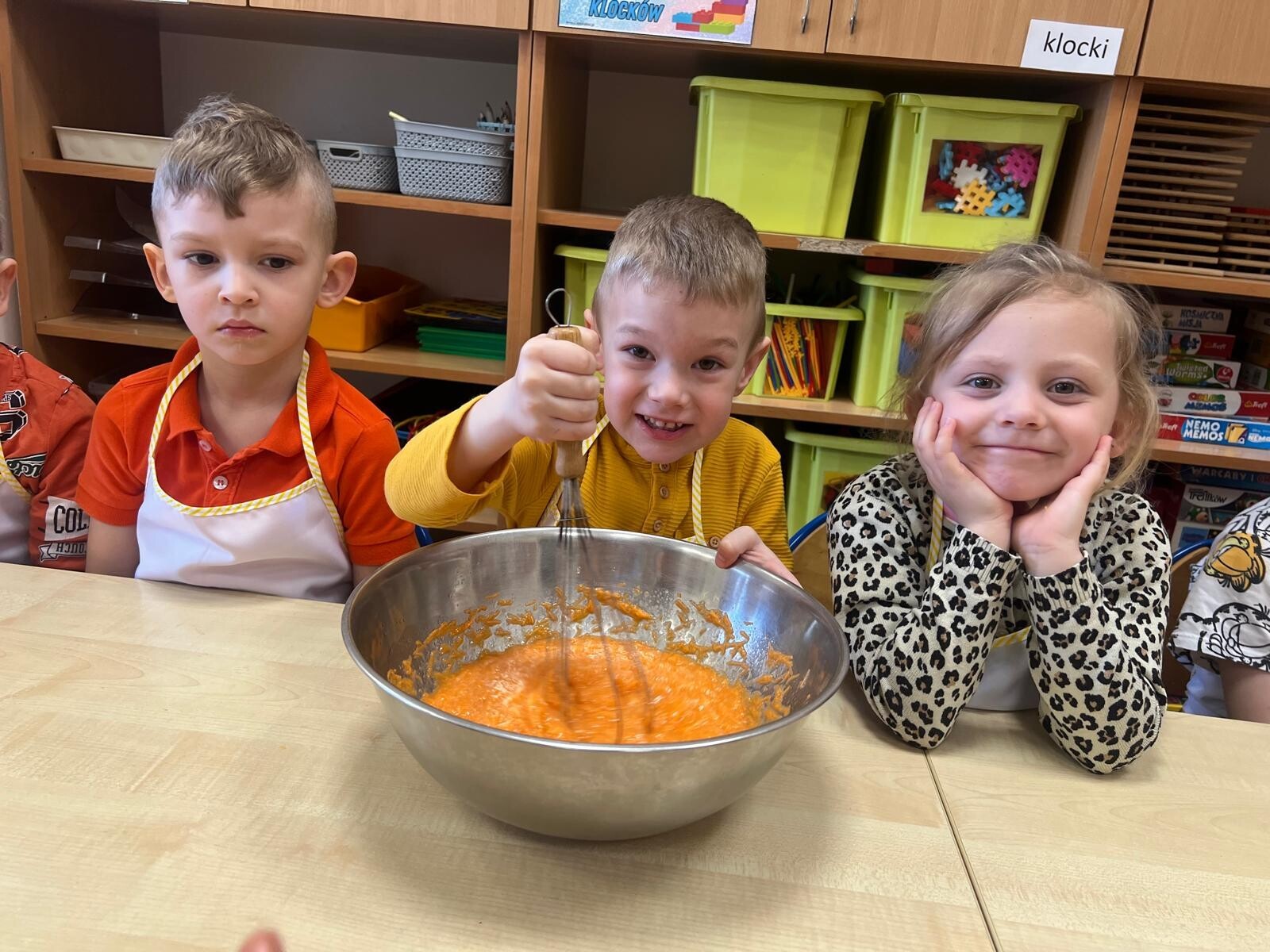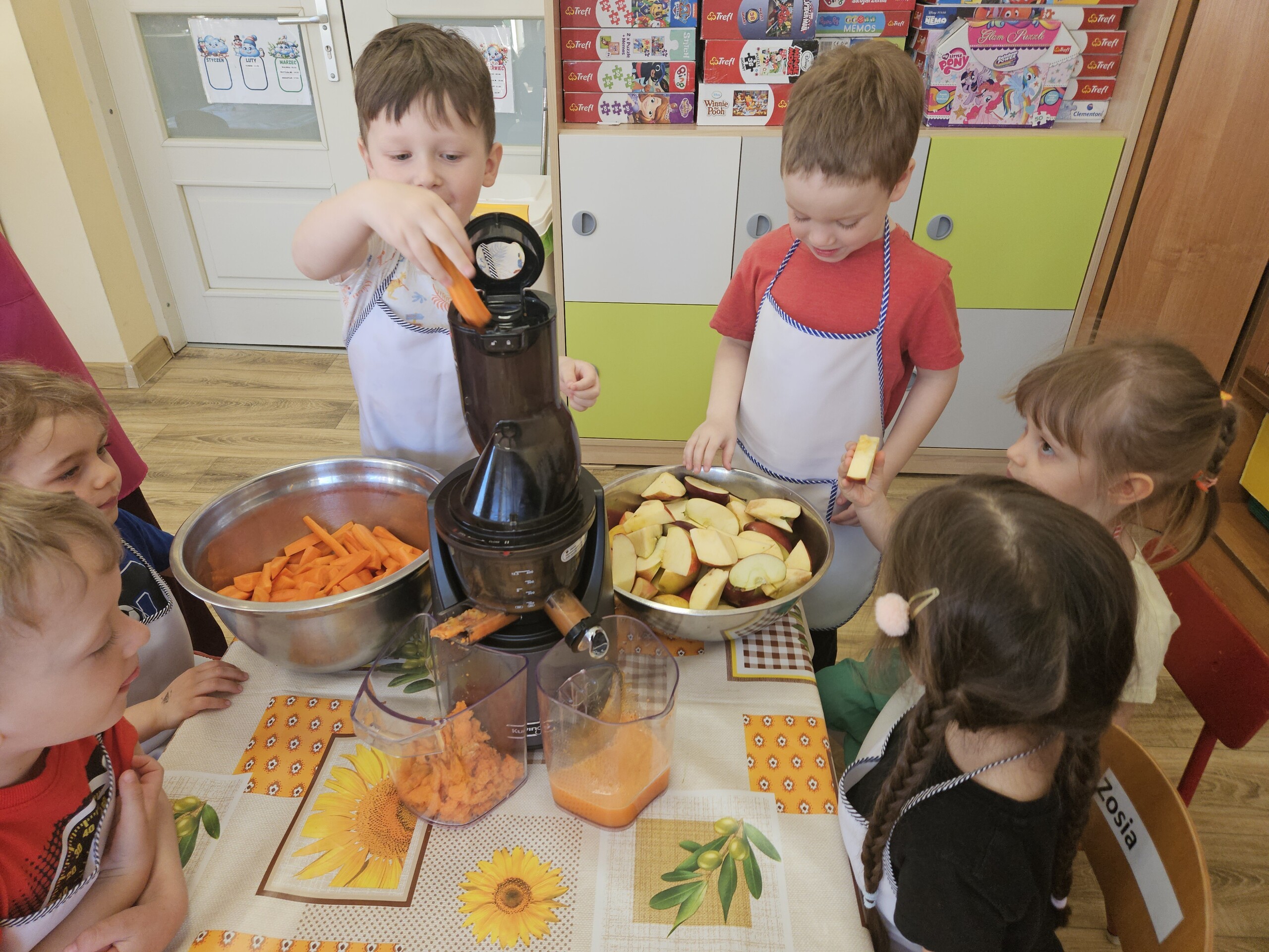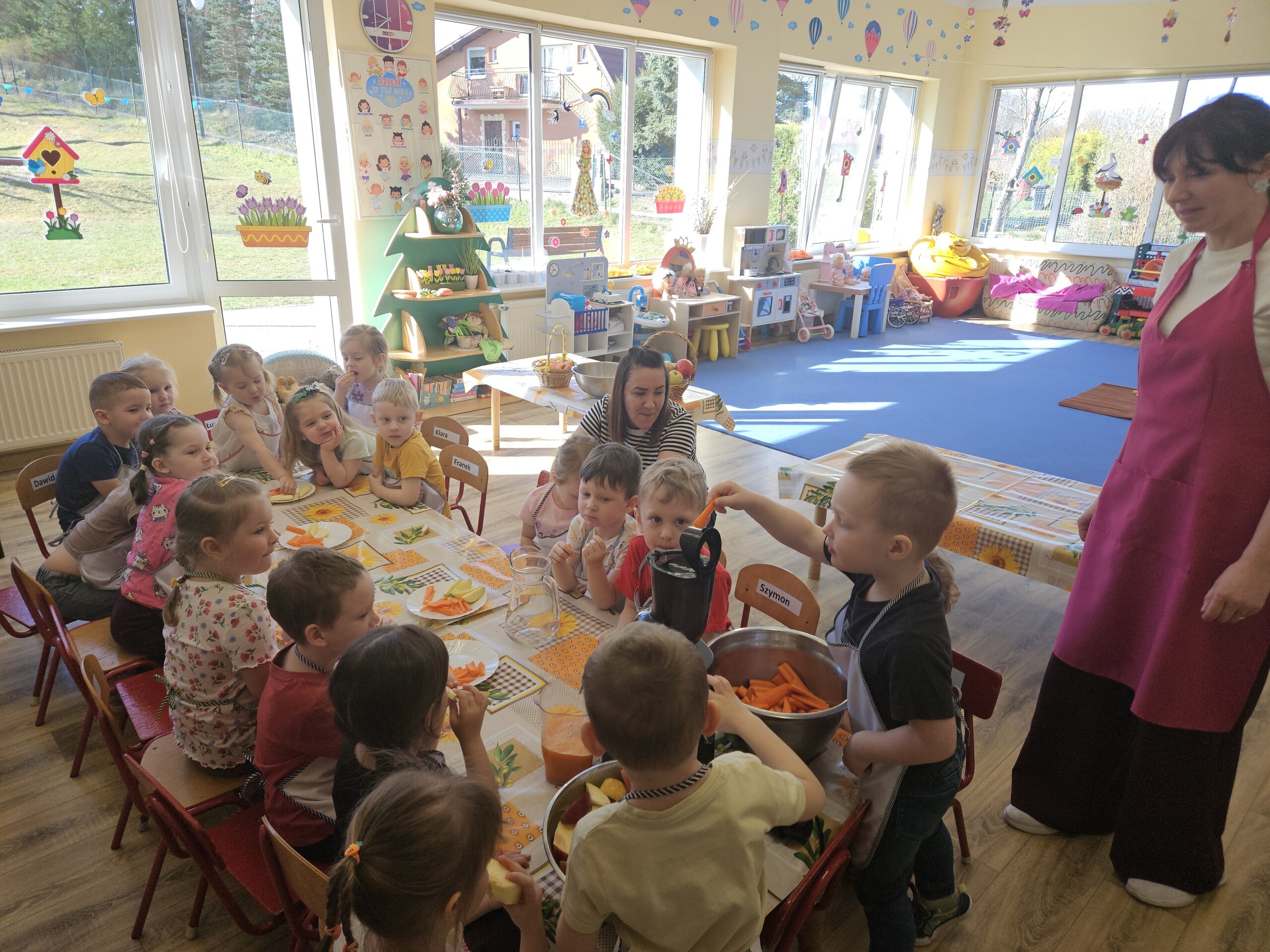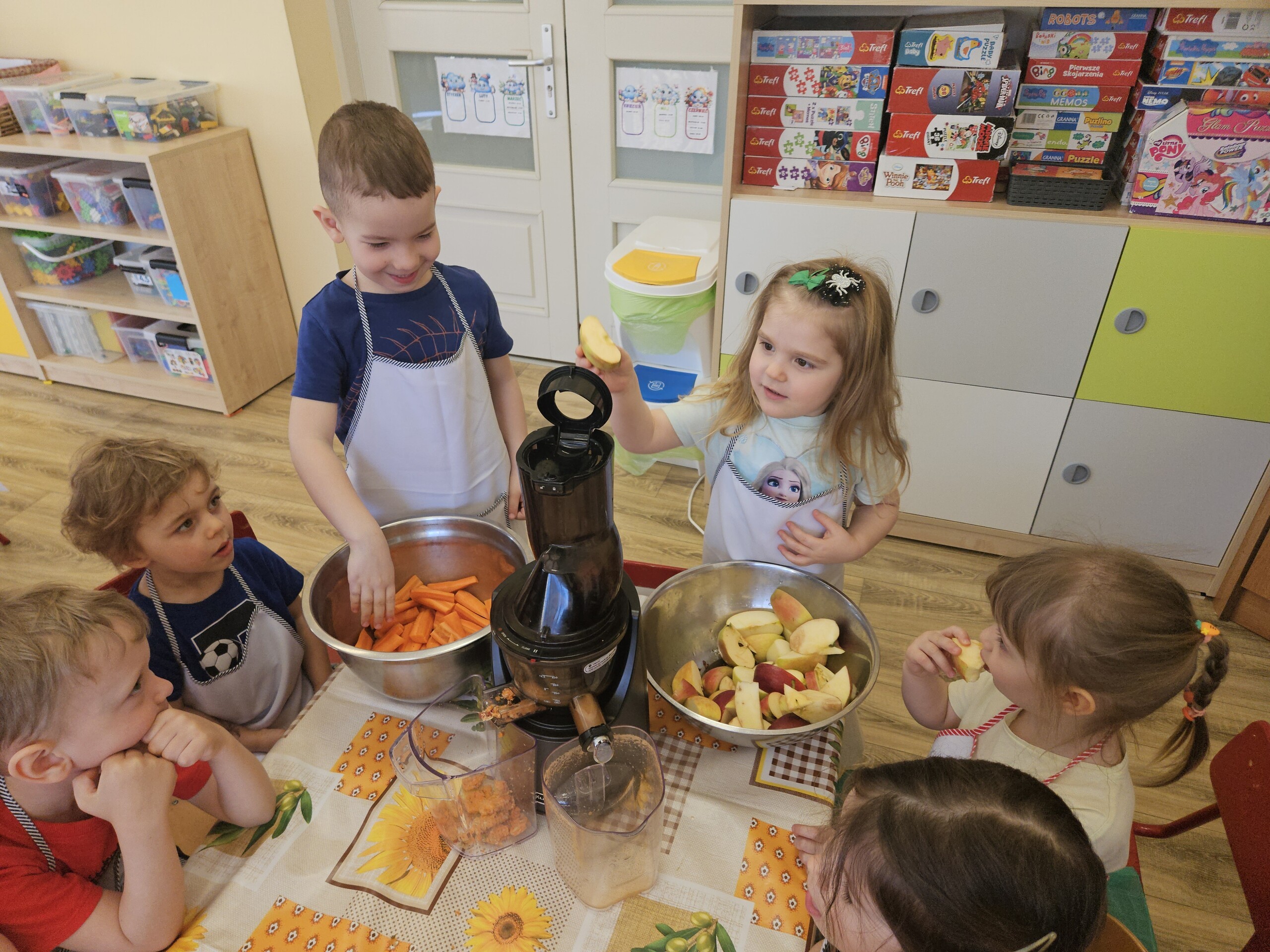 W ramach aktywności kulinarnych dzieci spróbowały pysznego soku z marchwi, piekły babeczki oraz ciasto marchewkowe. Wzięły również udział w konkursie „Jedz marchewkę jak króliczek", co dostarczyło im wiele radości i śmiechu. Najstarsza grupa miała dodatkowo okazję uczestniczyć w matematycznej zabawie „Garnek pełen warzyw", która rozwijała ich umiejętności liczenia i logicznego myślenia.