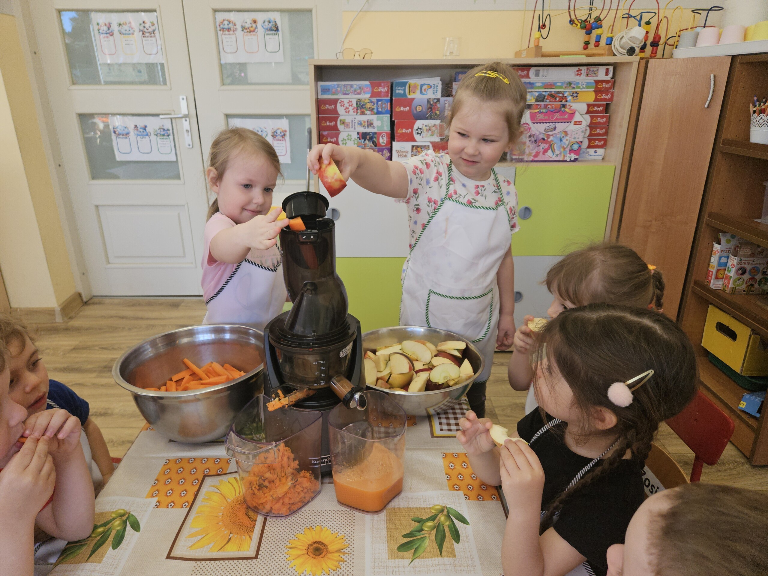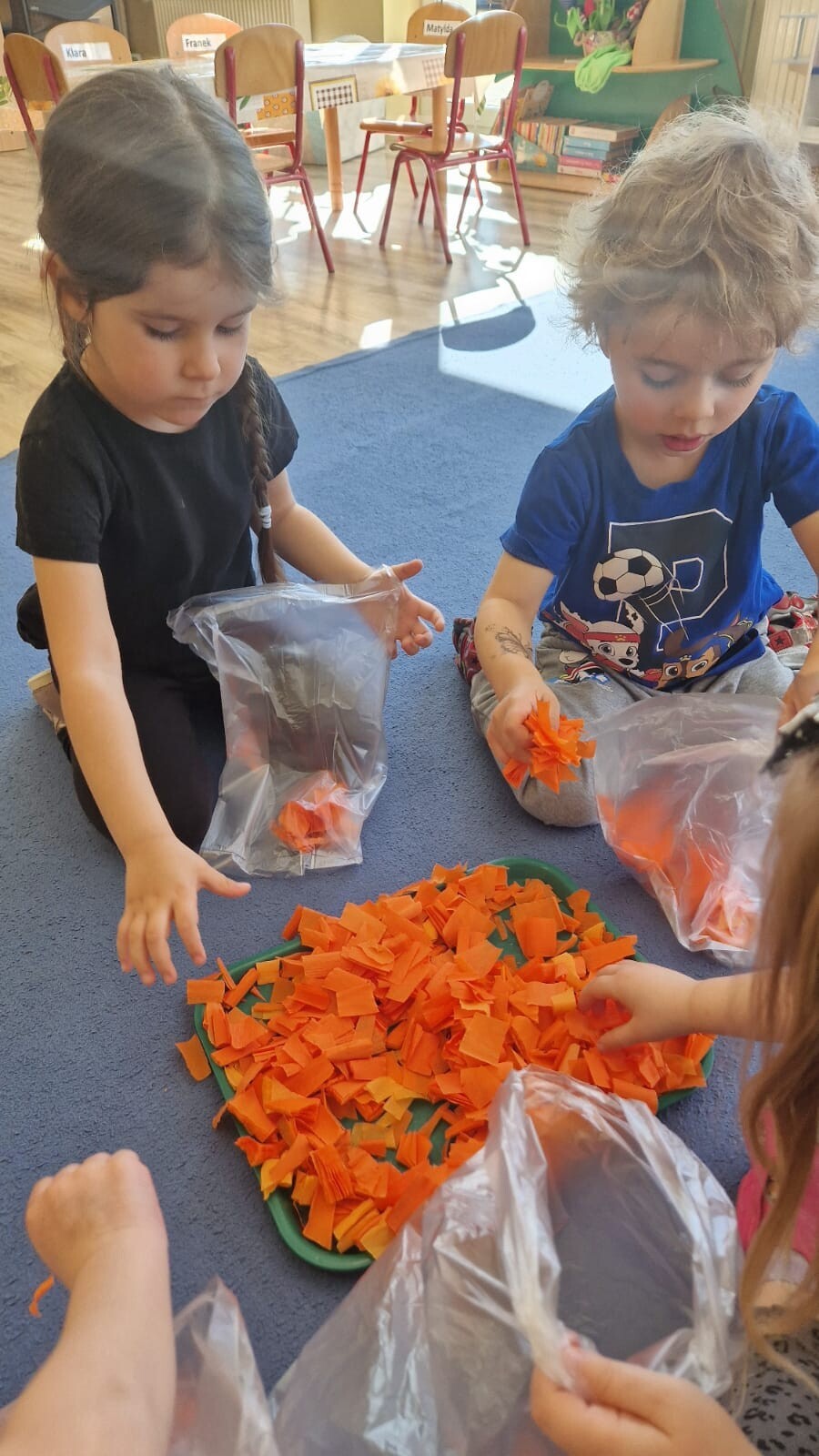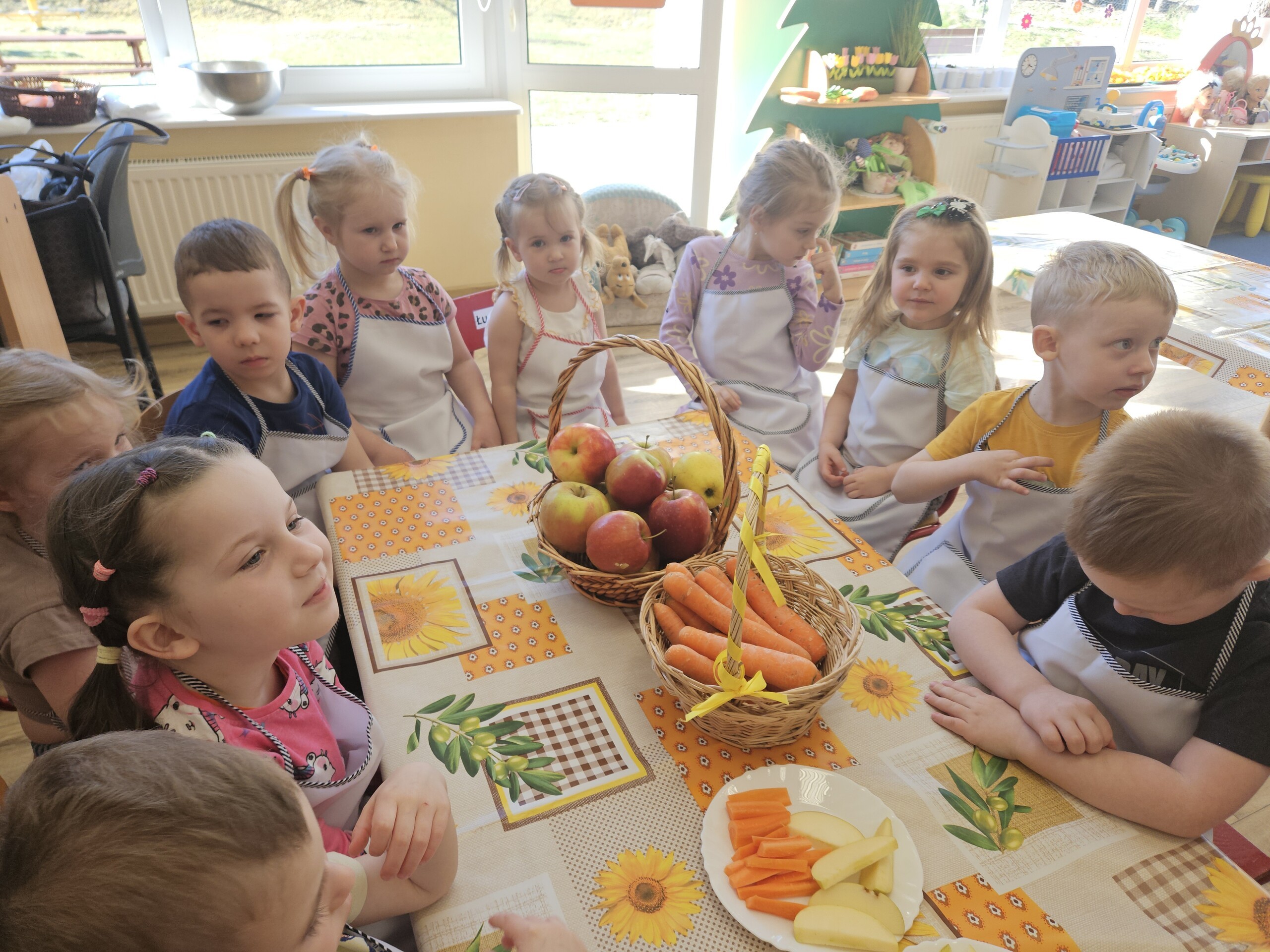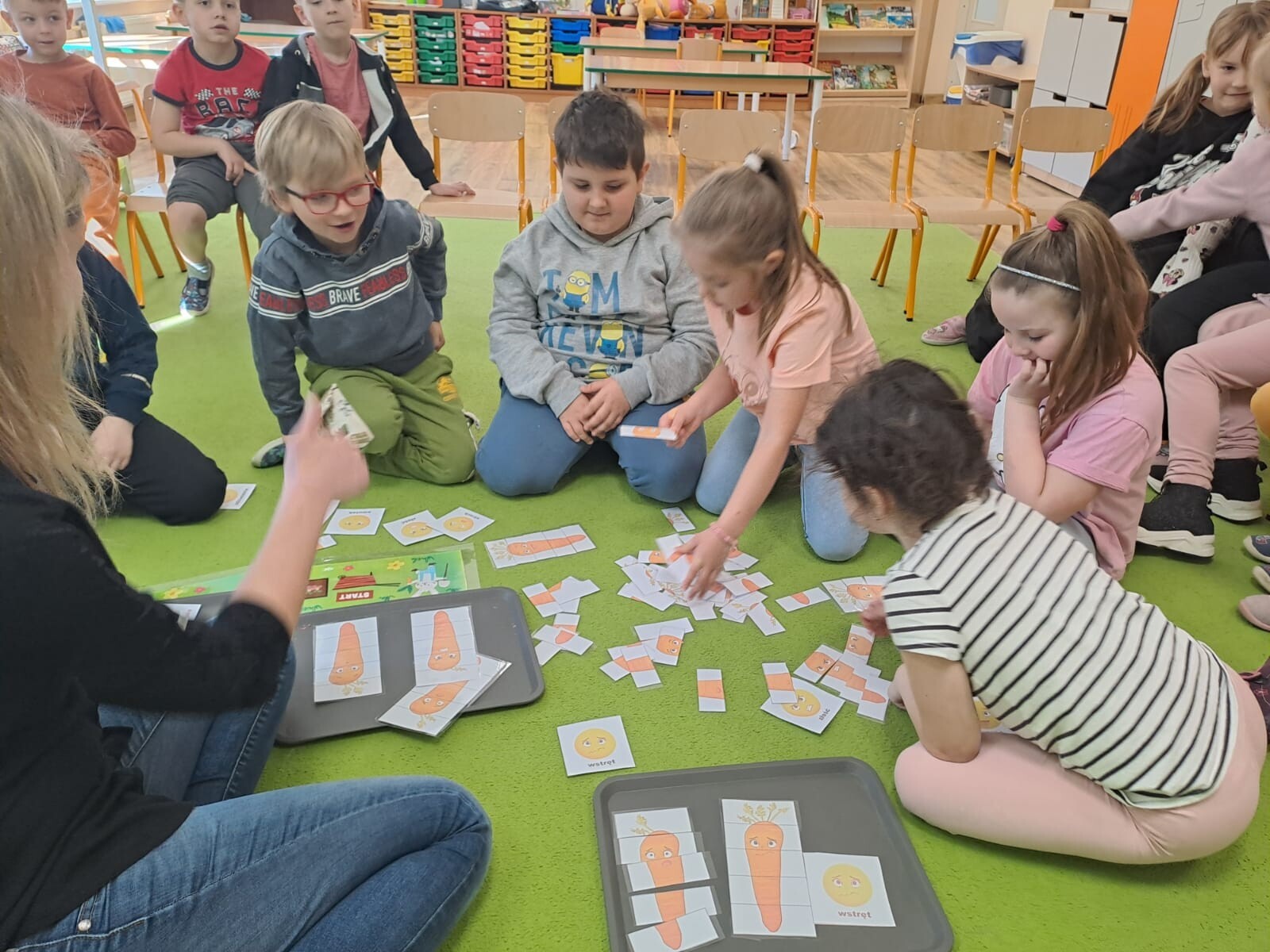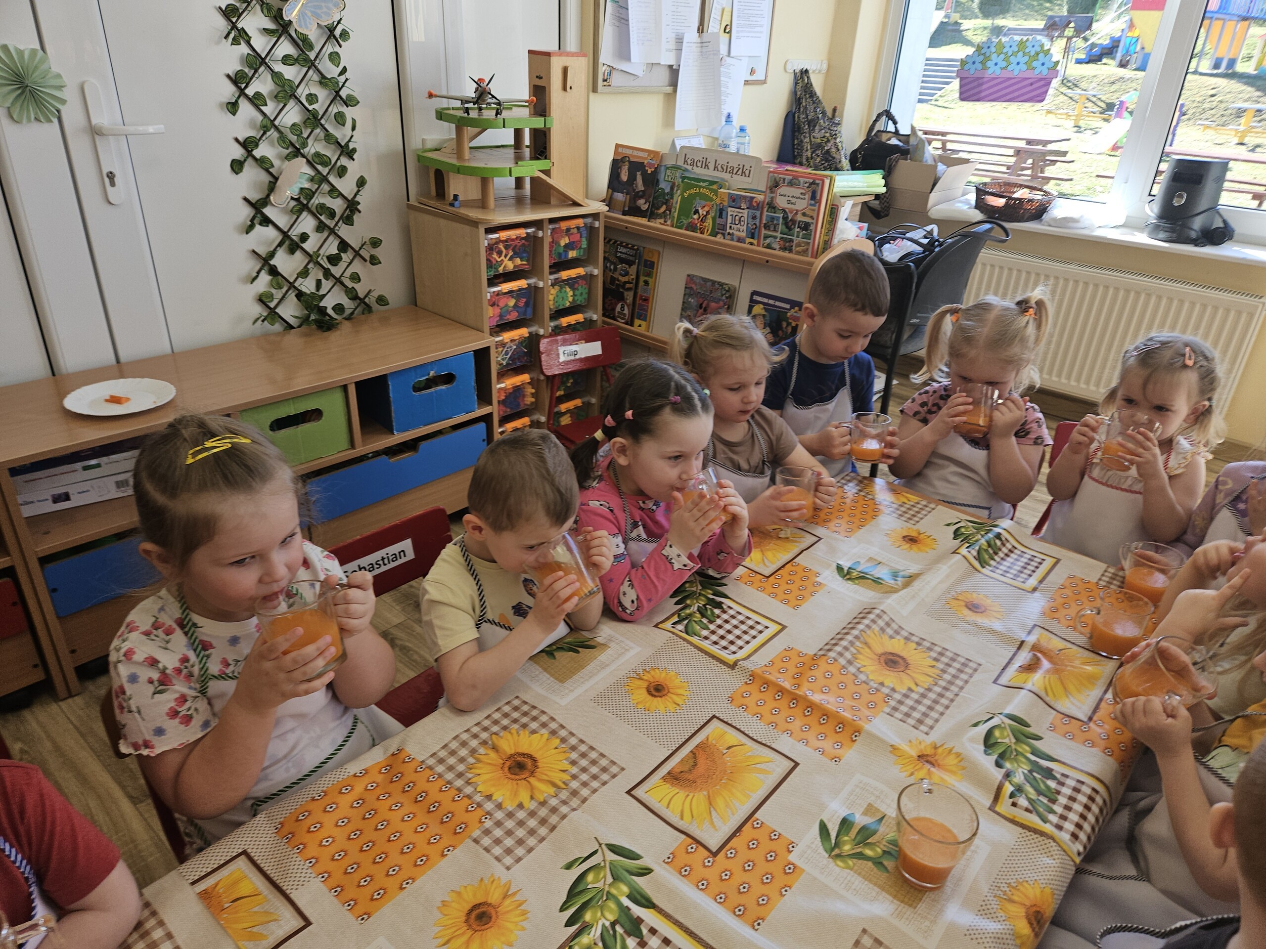W ramach aktywności kulinarnych dzieci spróbowały pysznego soku z marchwi, piekły babeczki oraz ciasto marchewkowe. Wzięły również udział w konkursie „Jedz marchewkę jak króliczek", co dostarczyło im wiele radości i śmiechu. Najstarsza grupa miała dodatkowo okazję uczestniczyć w matematycznej zabawie „Garnek pełen warzyw", która rozwijała ich umiejętności liczenia i logicznego myślenia.