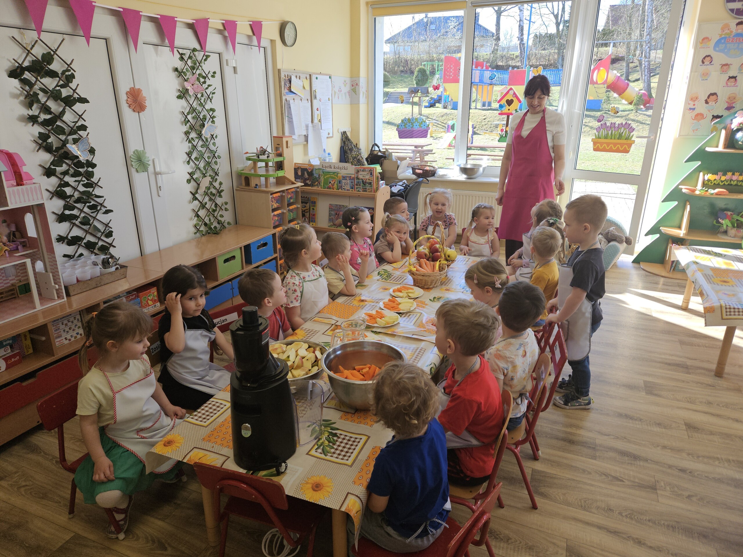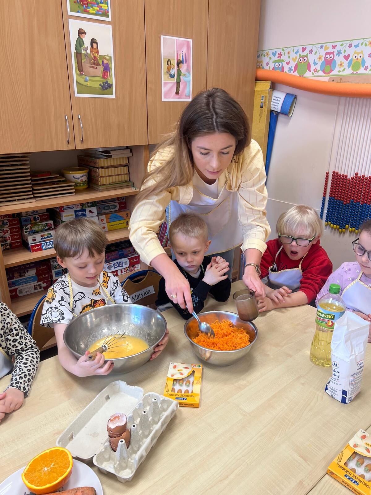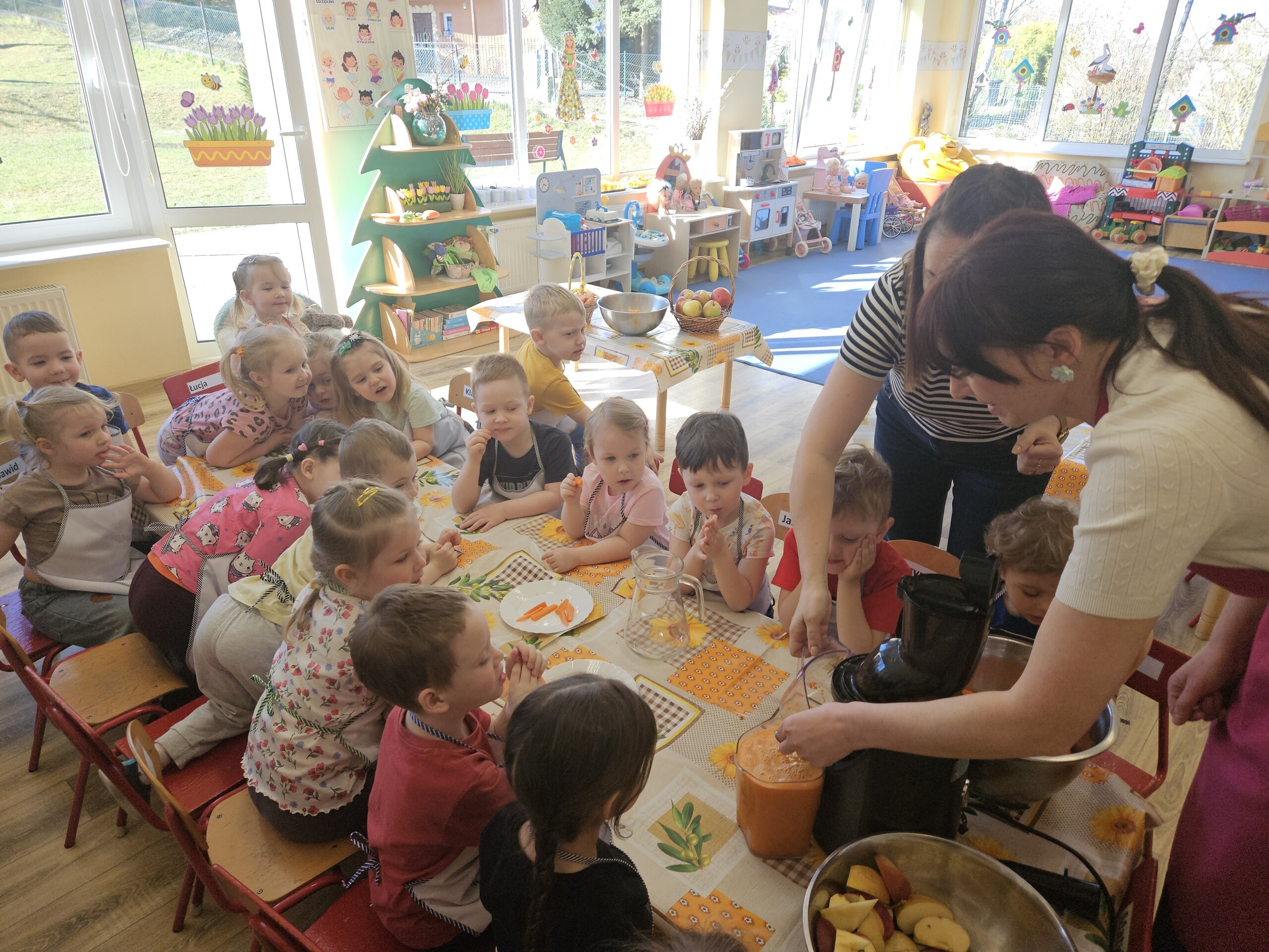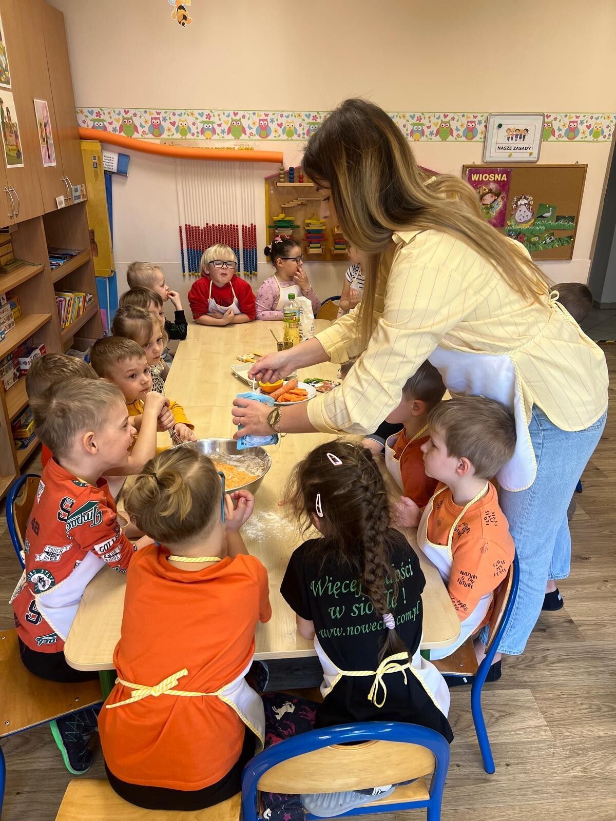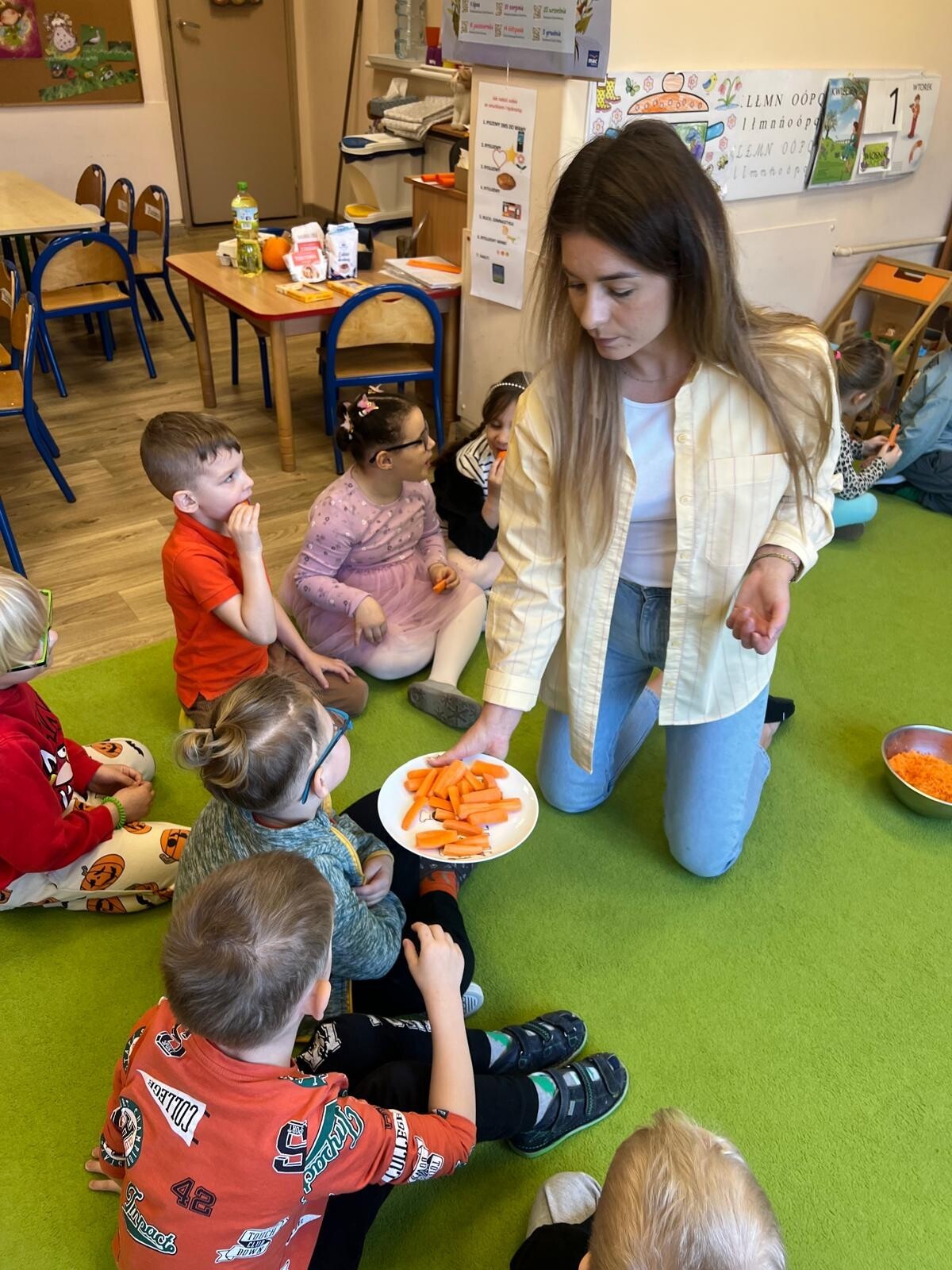 W ramach aktywności kulinarnych dzieci spróbowały pysznego soku z marchwi, piekły babeczki oraz ciasto marchewkowe. Wzięły również udział w konkursie „Jedz marchewkę jak króliczek", co dostarczyło im wiele radości i śmiechu. Najstarsza grupa miała dodatkowo okazję uczestniczyć w matematycznej zabawie „Garnek pełen warzyw", która rozwijała ich umiejętności liczenia i logicznego myślenia.