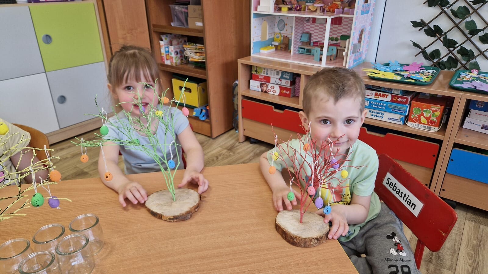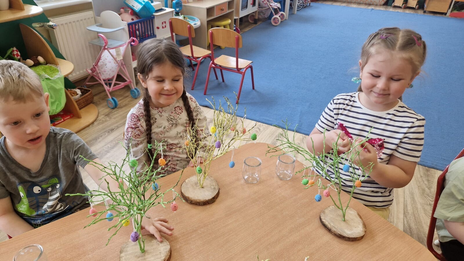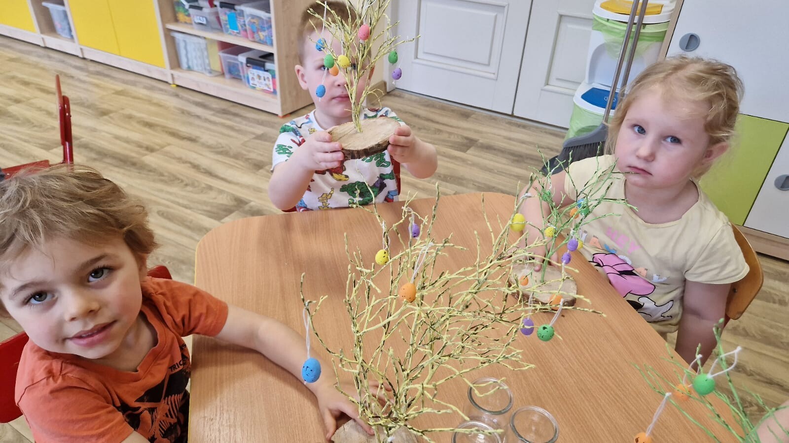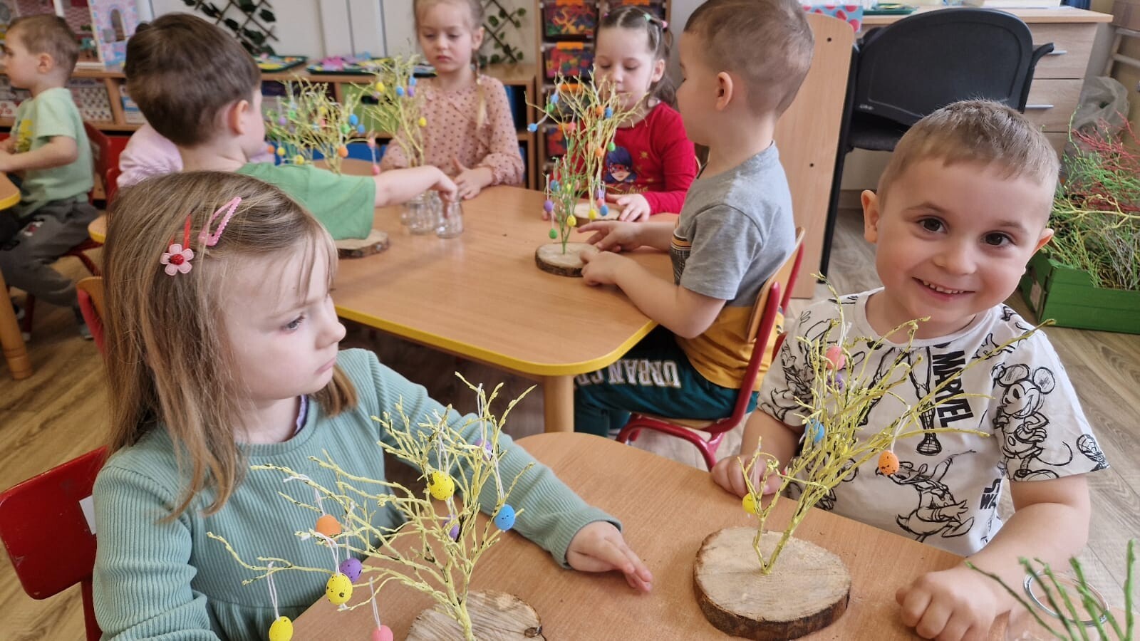 Podczas warsztatów dzieci rozwijały zdolności manualne, uczestnicząc w zajęciach związanych z tradycjami wielkanocnymi. Maluszki ozdabiały drzewko kolorowymi jajeczkami, wybierając ulubione kolory i wzory. Nasze drzewko stało się dziełem sztuki, pełnym wiosennej energii. Tworzyły zajączki z papieru ozdabiając je według własnych pomysłów. Siały również rzeżuszkę do słoiczków, ucząc się pielęgnacji roślinek.