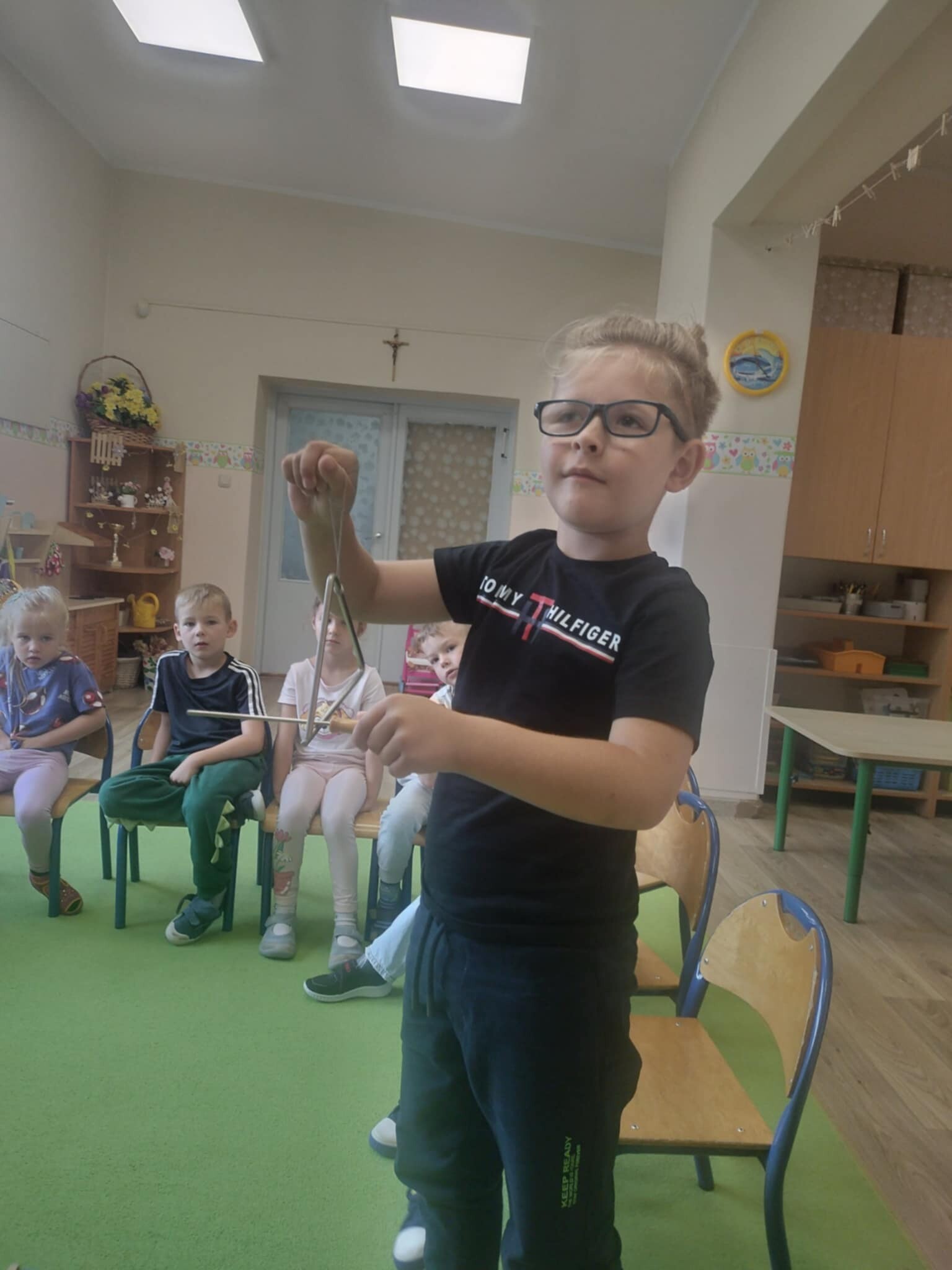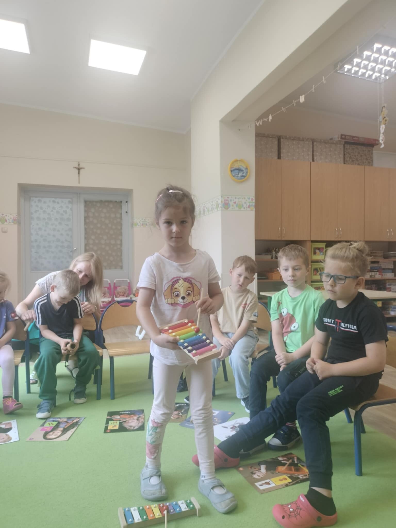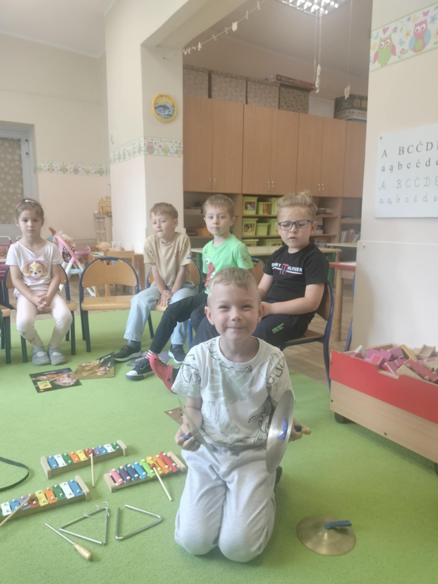 Dziś nasze dzieci miały wspaniałą okazję uczestniczyć w zabawach muzycznych. Poznaliśmy różnorodne instrumenty, a także stworzyliśmy własną orkiestrę! Dzieci miały możliwość grać na interaktywnym dywanie, skacząc po pianinie, a także korzystając z wirtualnej gitary i skrzypiec. Rozwiązywaliśmy również wirtualne memory instrumentalne, co dostarczyło nam wielu radości i pozytywnych emocji.