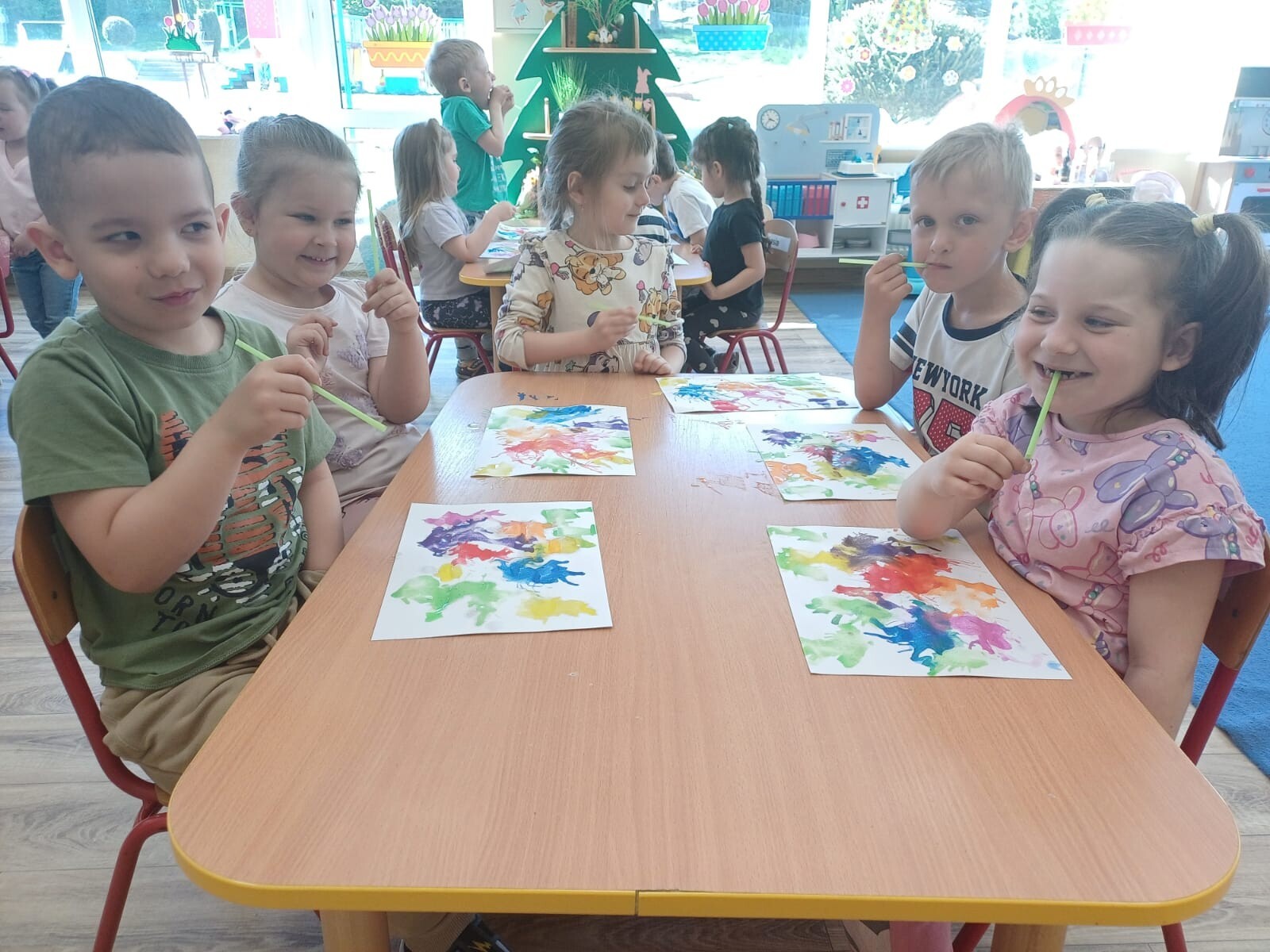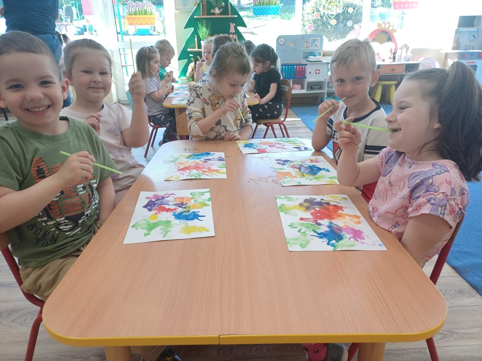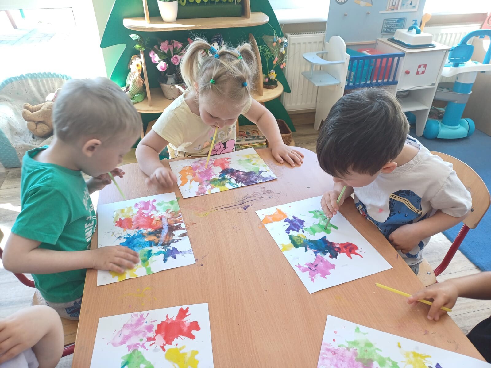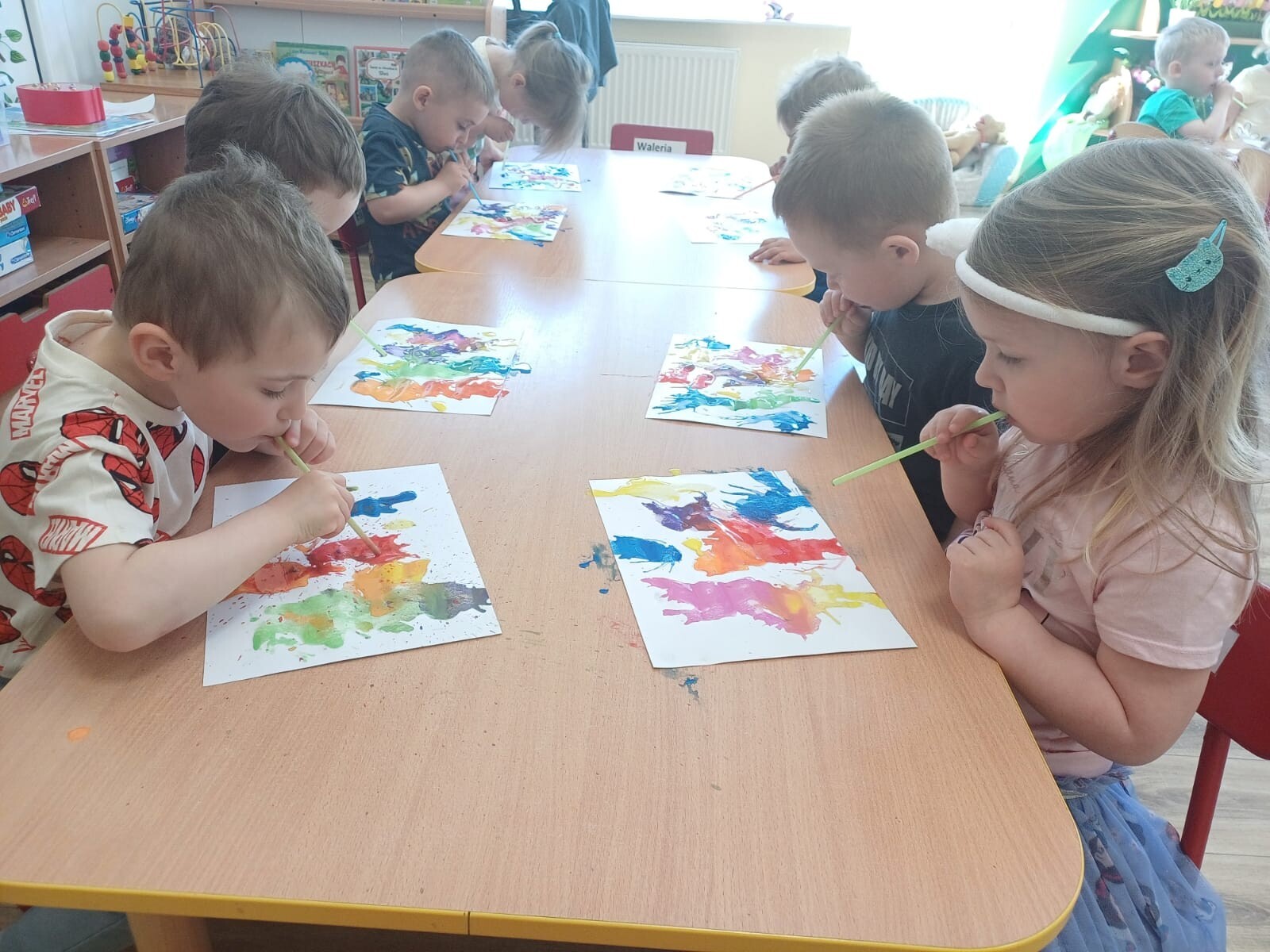 Podczas zajęć każde dziecko mogło wyczarować własne, niepowtarzalne wzory. Wydmuchiwanie farby nie tylko rozwijało kreatywność, ale również stanowiło doskonałe ćwiczenie oddechowe. Maluszki były zachwycone możliwością tworzenia sztuki w tak wyjątkowy sposób.