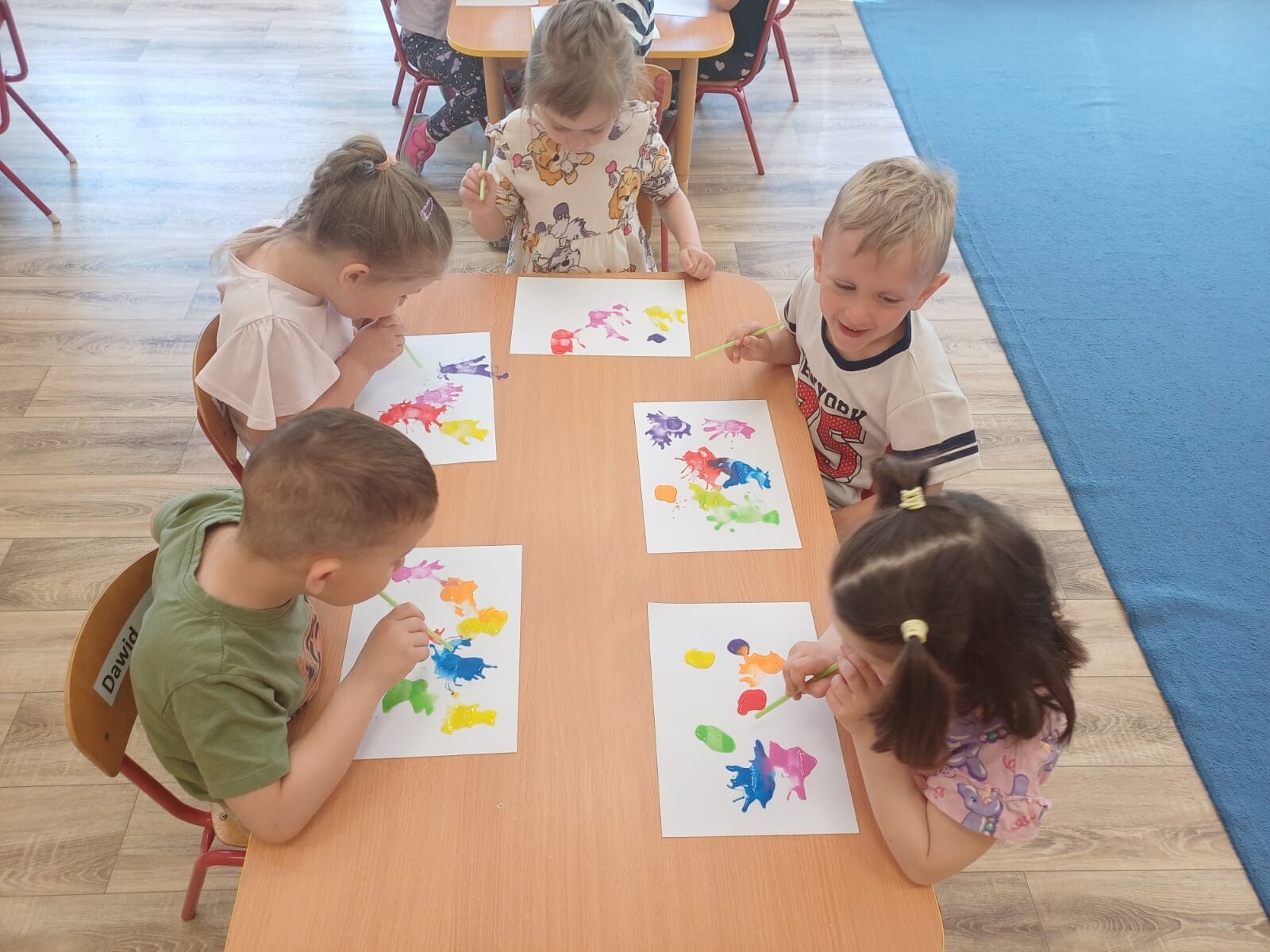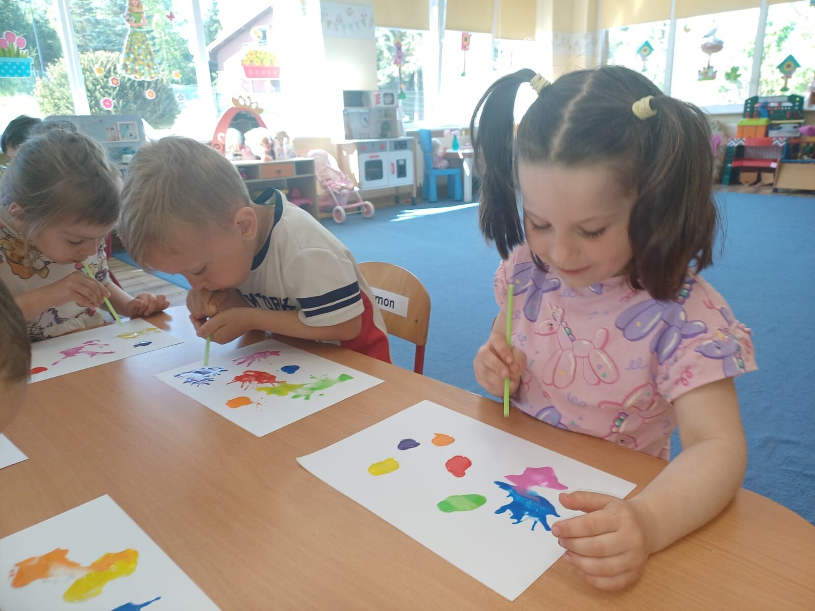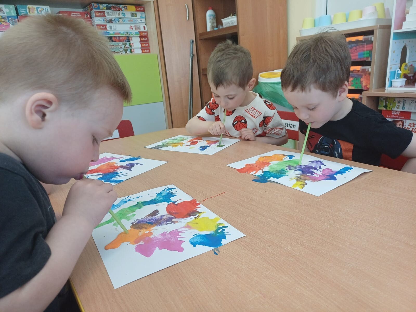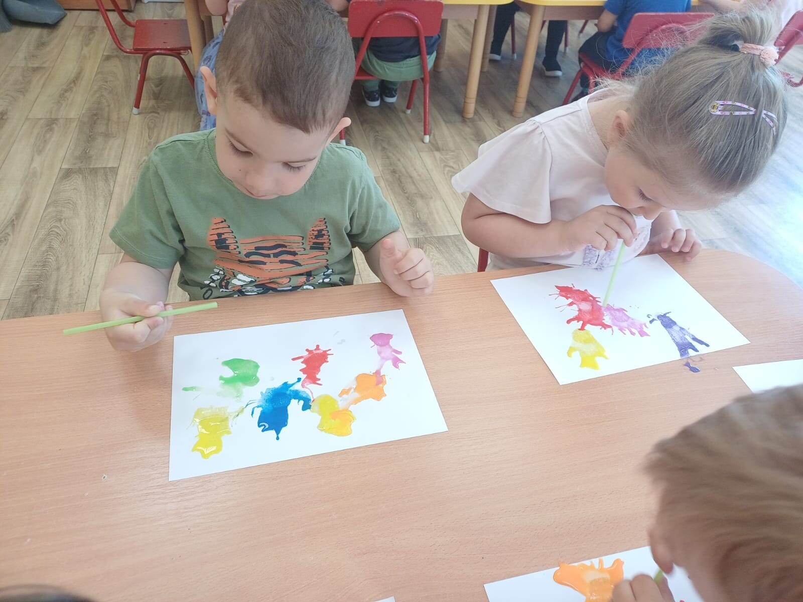 Podczas zajęć każde dziecko mogło wyczarować własne, niepowtarzalne wzory. Wydmuchiwanie farby nie tylko rozwijało kreatywność, ale również stanowiło doskonałe ćwiczenie oddechowe. Maluszki były zachwycone możliwością tworzenia sztuki w tak wyjątkowy sposób.