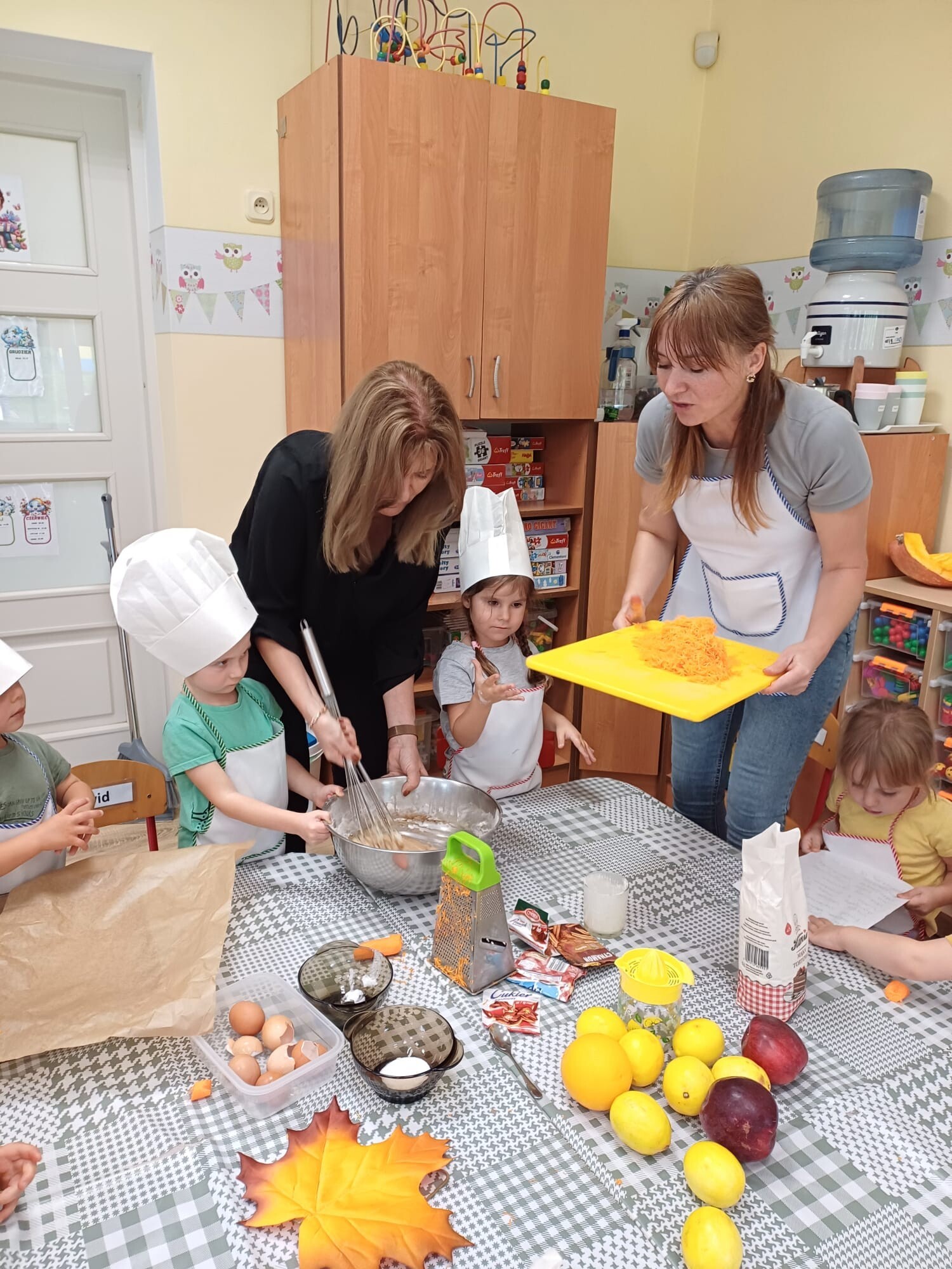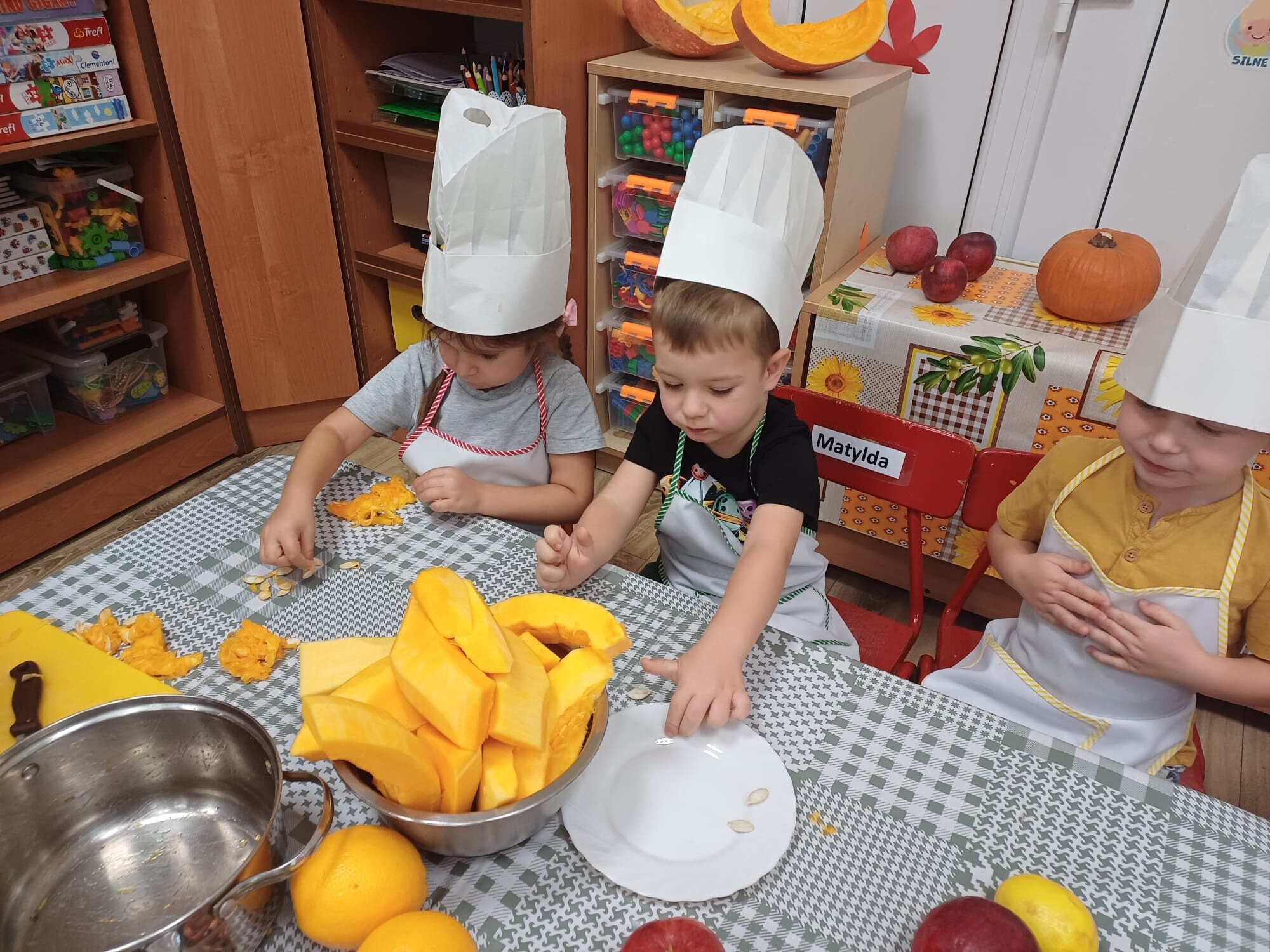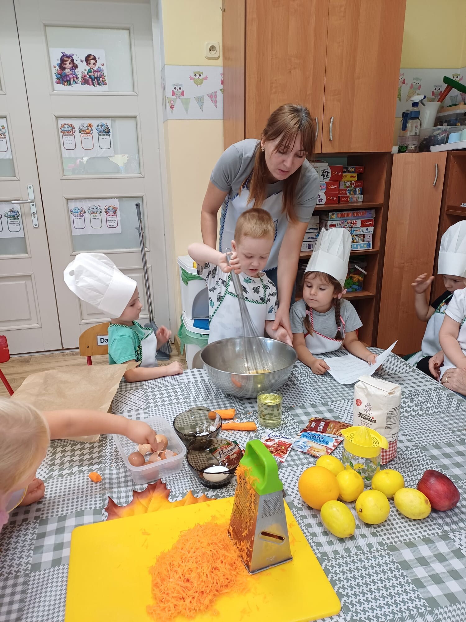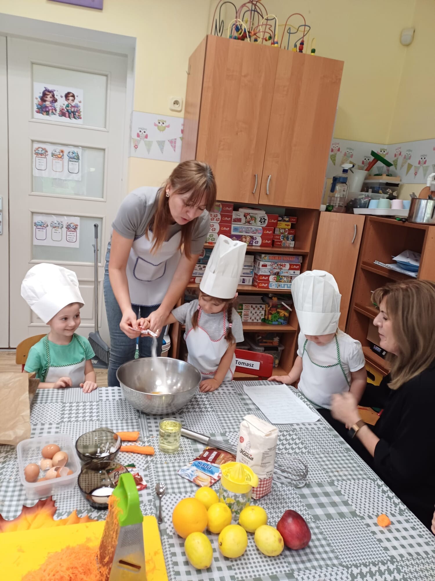 W dniach 08- 09.10.2024r. w grupie I odbyły się warsztaty kulinarne poświęcone tradycjom i zwyczajom jesiennym. Dzieci z entuzjazmem przystąpiły do przygotowywania dżemu z dyni, jabłek i soku z pomarańczy. Podczas zajęć nauczyły się rozpoznawać budowę dyni oraz samodzielnie wydrążały z niej pestki. Warsztaty zakończyły się pieczeniem aromatycznego ciasta marchewkowego, które wszyscy z radością degustowali. Dzieci nie tylko rozwinęły swoje umiejętności kulinarne, ale także dowiedziały się więcej o jesiennych produktach i tradycjach.