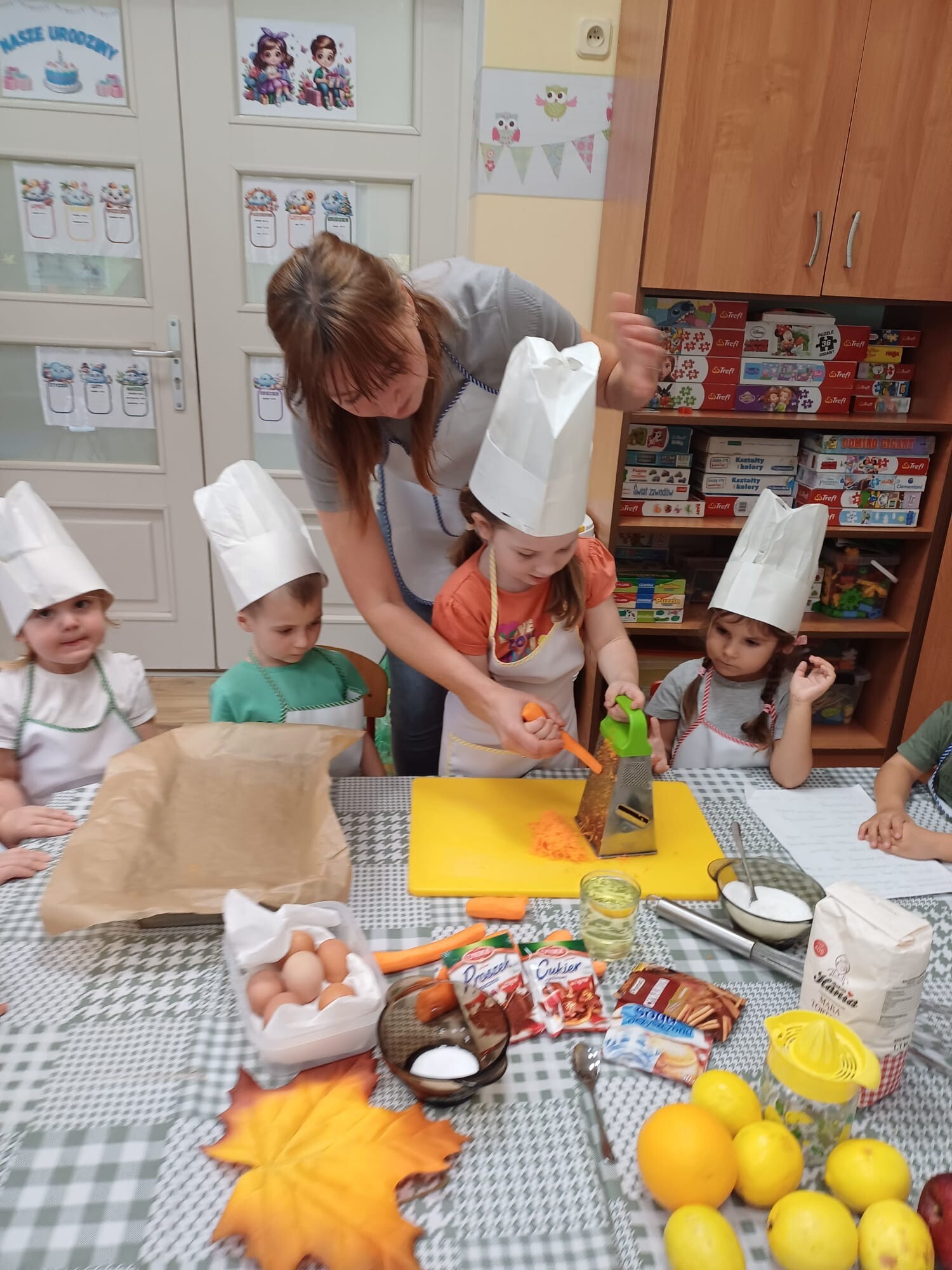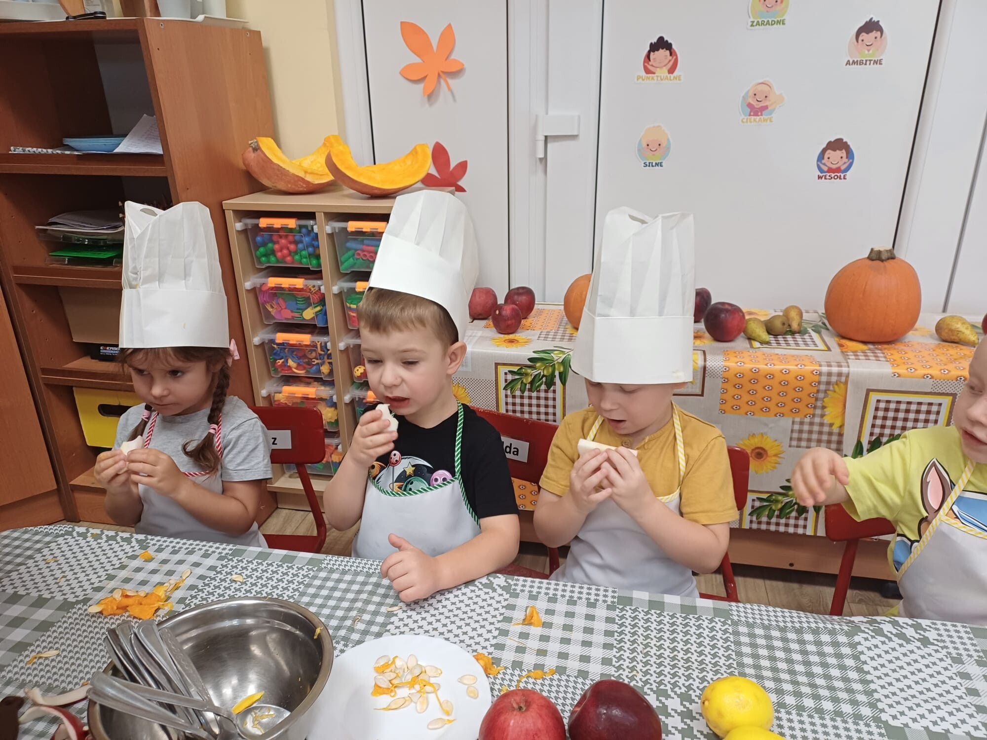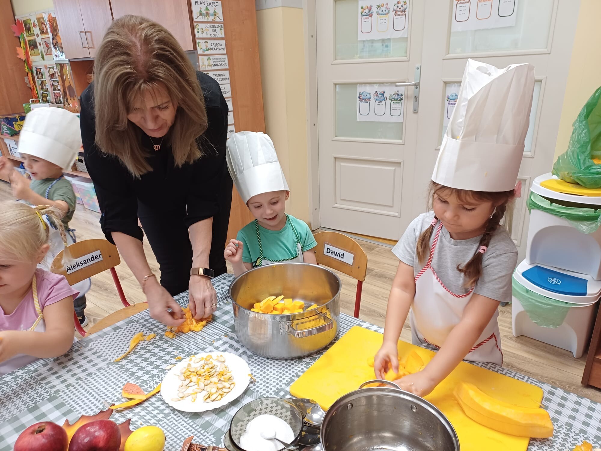 W dniach 08- 09.10.2024r. w grupie I odbyły się warsztaty kulinarne poświęcone tradycjom i zwyczajom jesiennym. Dzieci z entuzjazmem przystąpiły do przygotowywania dżemu z dyni, jabłek i soku z pomarańczy. Podczas zajęć nauczyły się rozpoznawać budowę dyni oraz samodzielnie wydrążały z niej pestki. Warsztaty zakończyły się pieczeniem aromatycznego ciasta marchewkowego, które wszyscy z radością degustowali. Dzieci nie tylko rozwinęły swoje umiejętności kulinarne, ale także dowiedziały się więcej o jesiennych produktach i tradycjach.