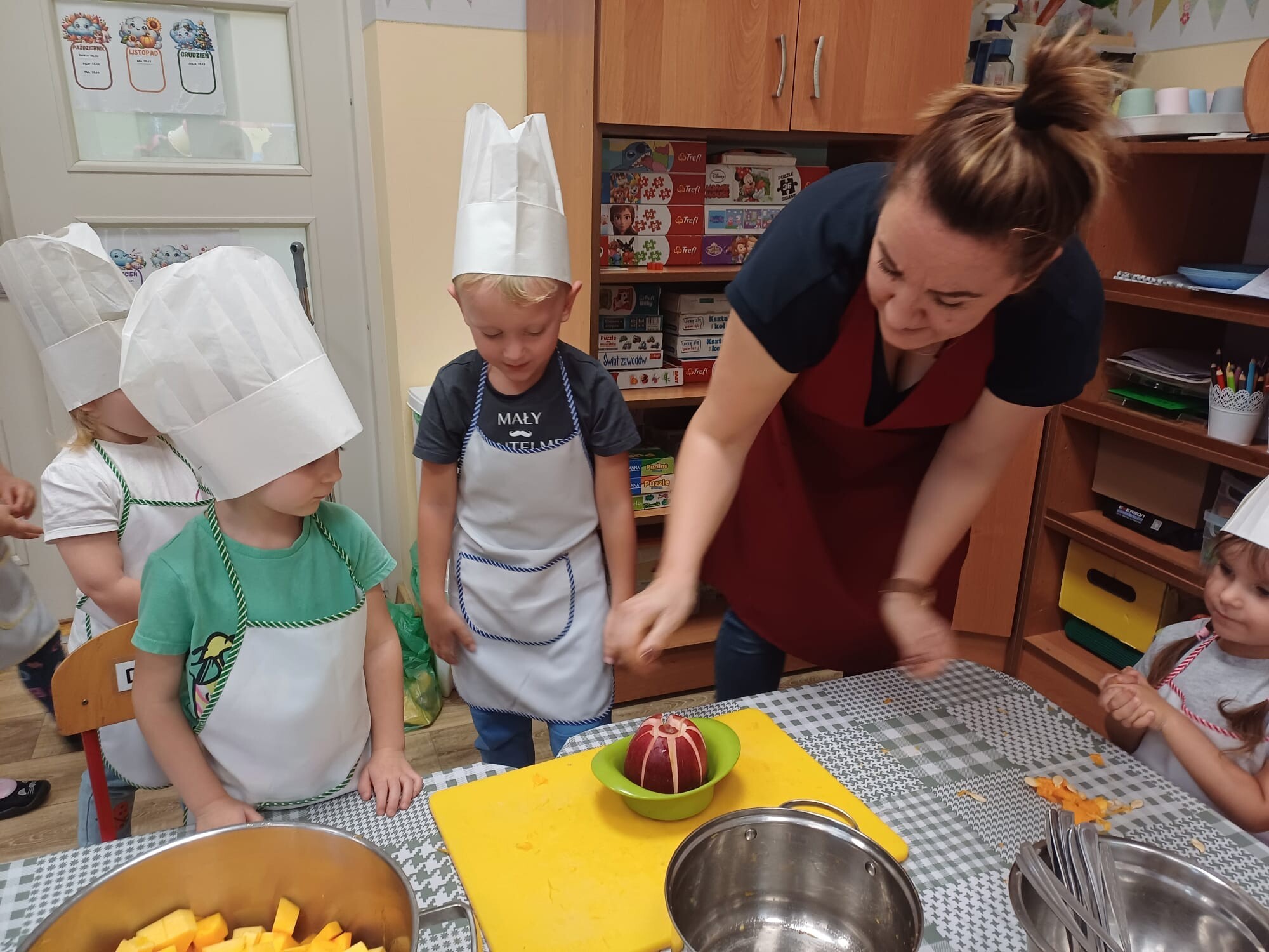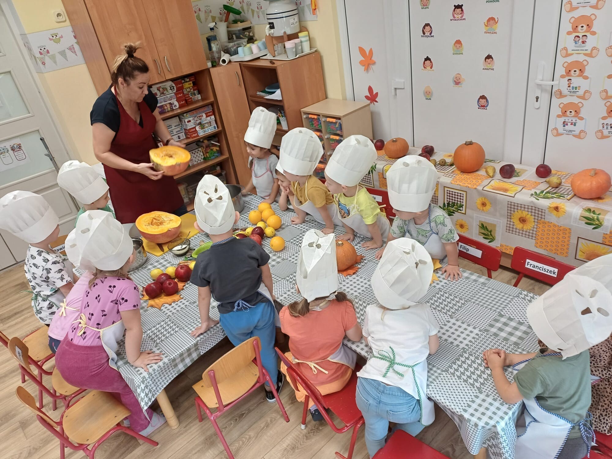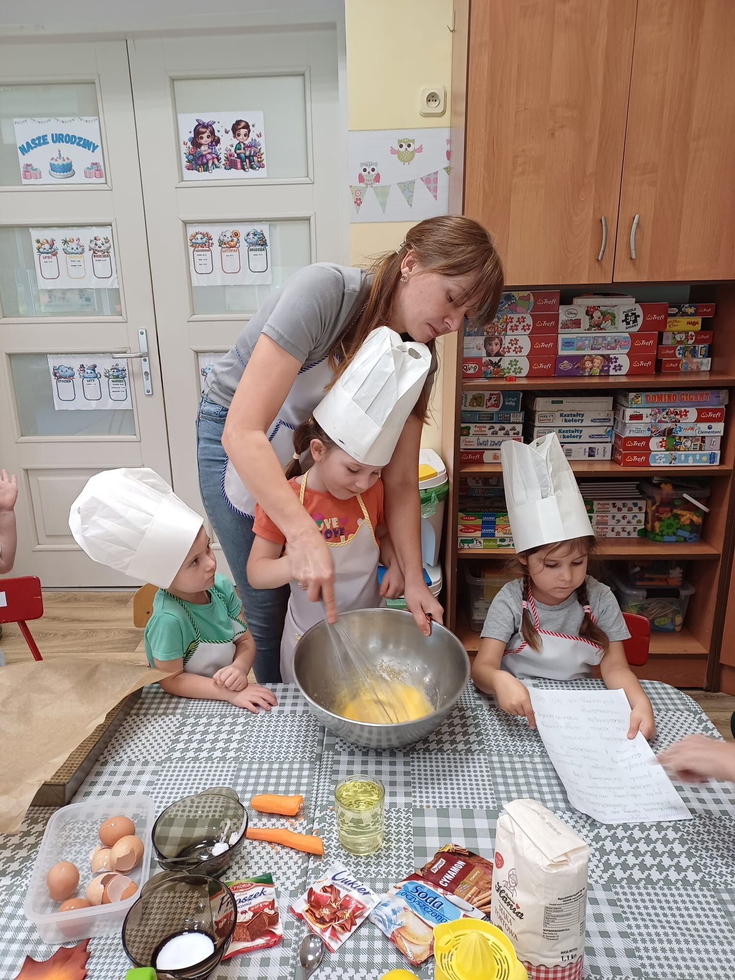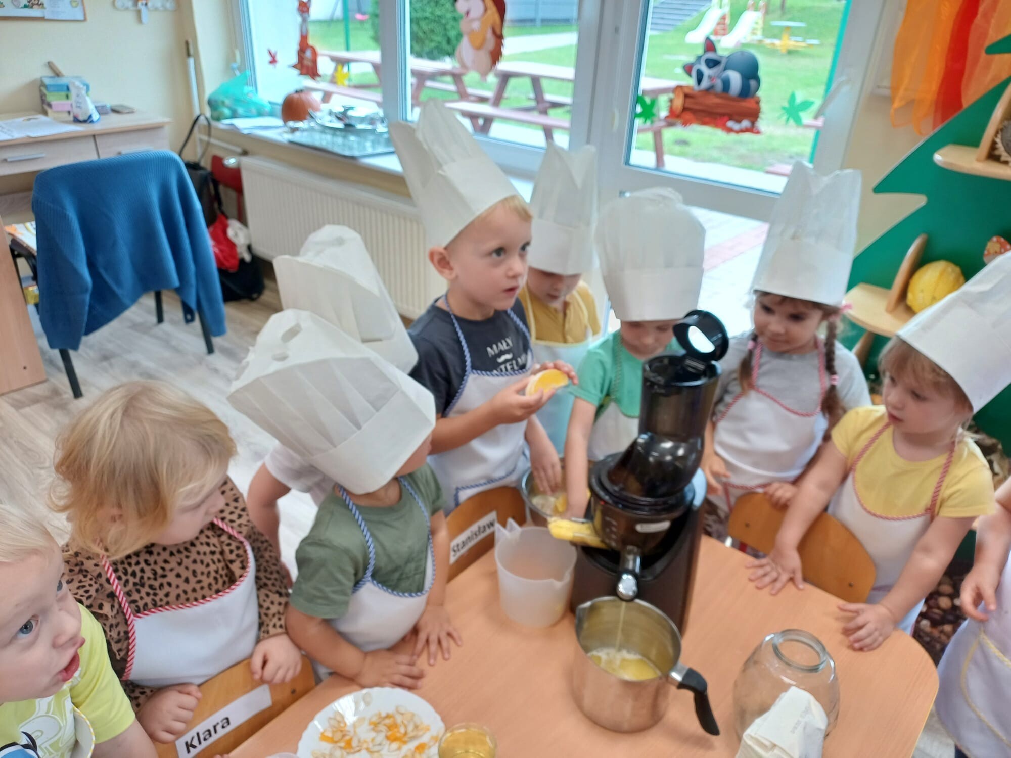 W dniach 08- 09.10.2024r. w grupie I odbyły się warsztaty kulinarne poświęcone tradycjom i zwyczajom jesiennym. Dzieci z entuzjazmem przystąpiły do przygotowywania dżemu z dyni, jabłek i soku z pomarańczy. Podczas zajęć nauczyły się rozpoznawać budowę dyni oraz samodzielnie wydrążały z niej pestki. Warsztaty zakończyły się pieczeniem aromatycznego ciasta marchewkowego, które wszyscy z radością degustowali. Dzieci nie tylko rozwinęły swoje umiejętności kulinarne, ale także dowiedziały się więcej o jesiennych produktach i tradycjach.