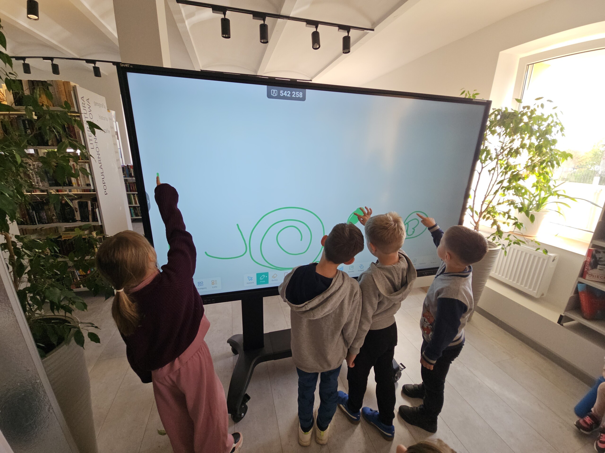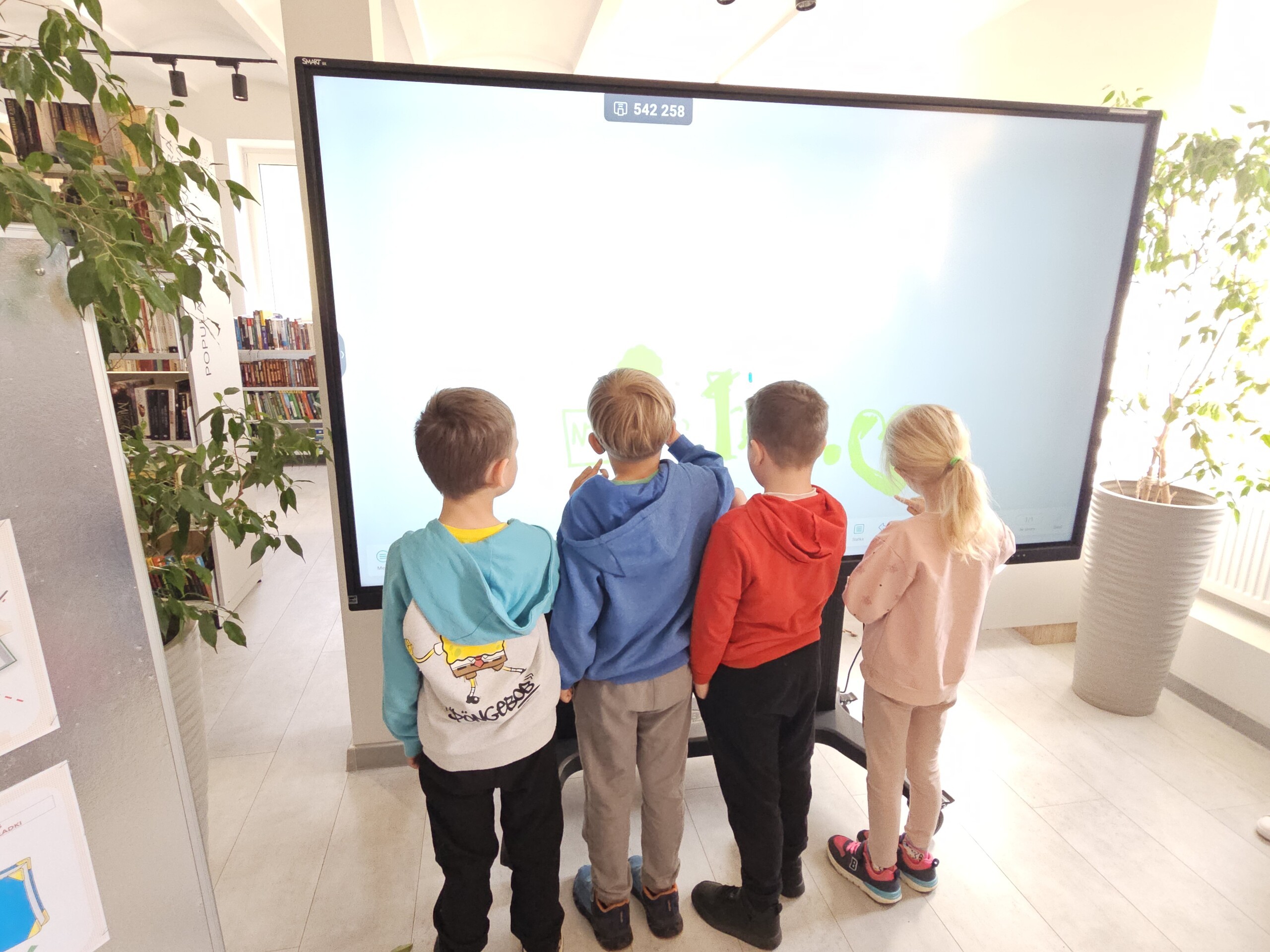 Pani Agata pokazała nam, jak korzystać z tablicy interaktywnej, a dzieci miały okazję wykazać się swoimi zdolnościami plastycznymi, rysując na niej. Wszyscy byli zachwyceni wizytą i z entuzjazmem mówią o kolejnych wyprawach do biblioteki oraz o wypożyczaniu książek.