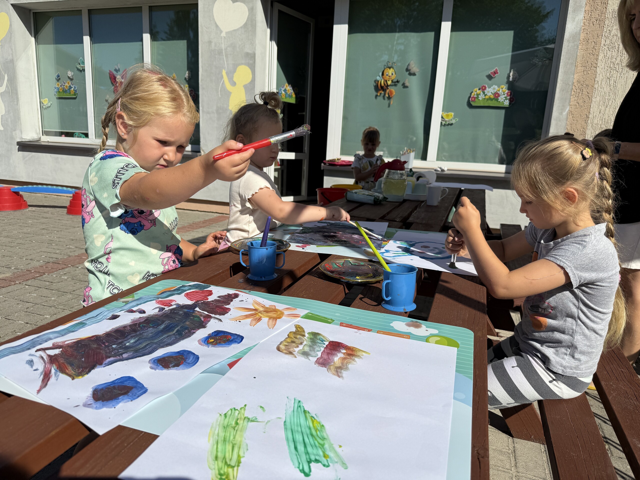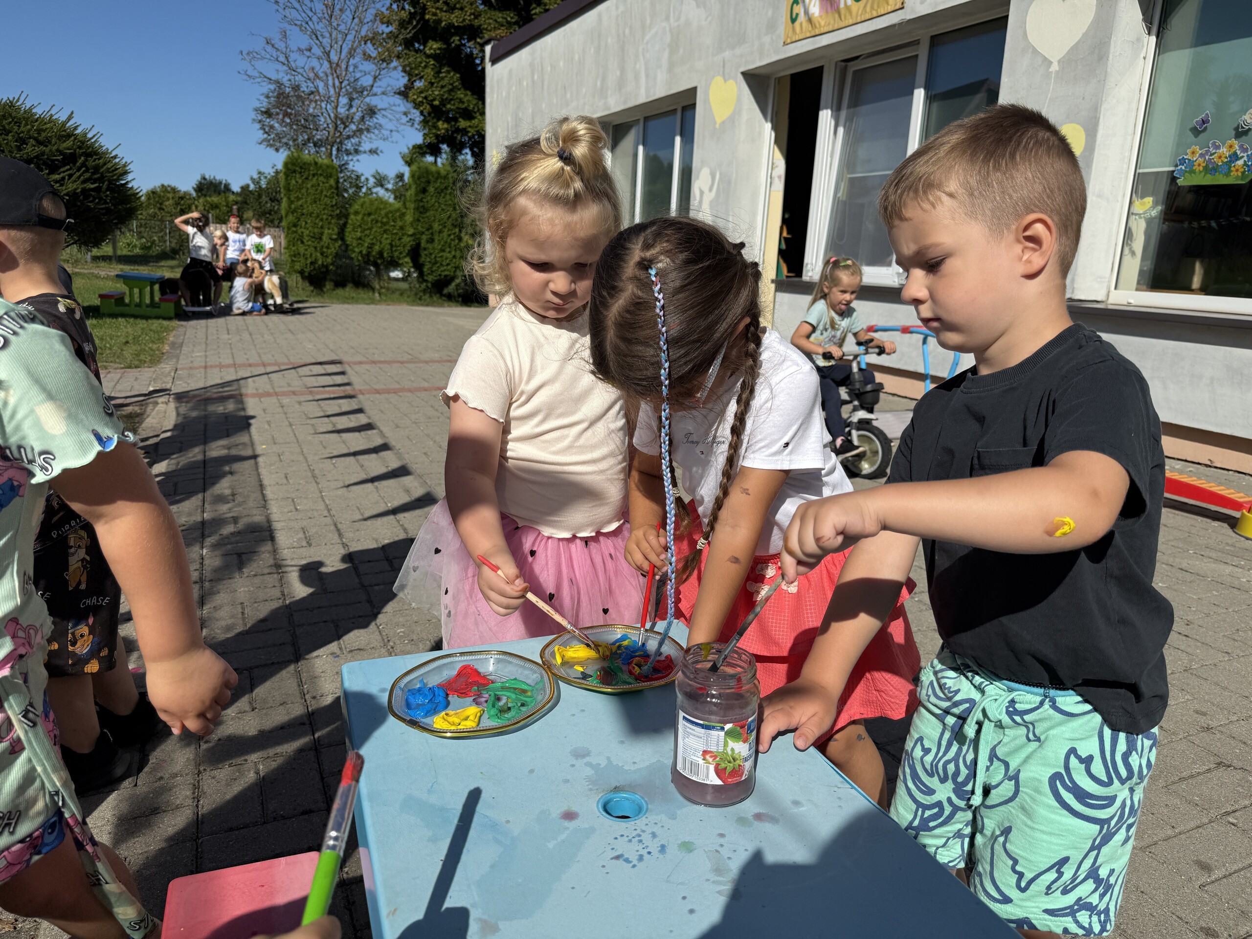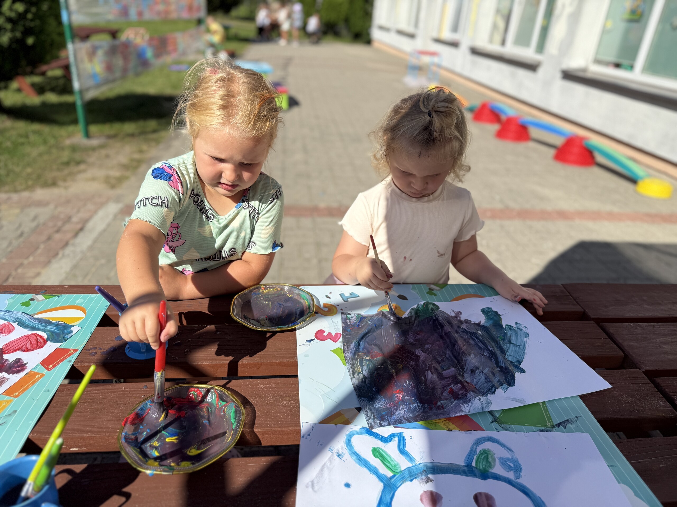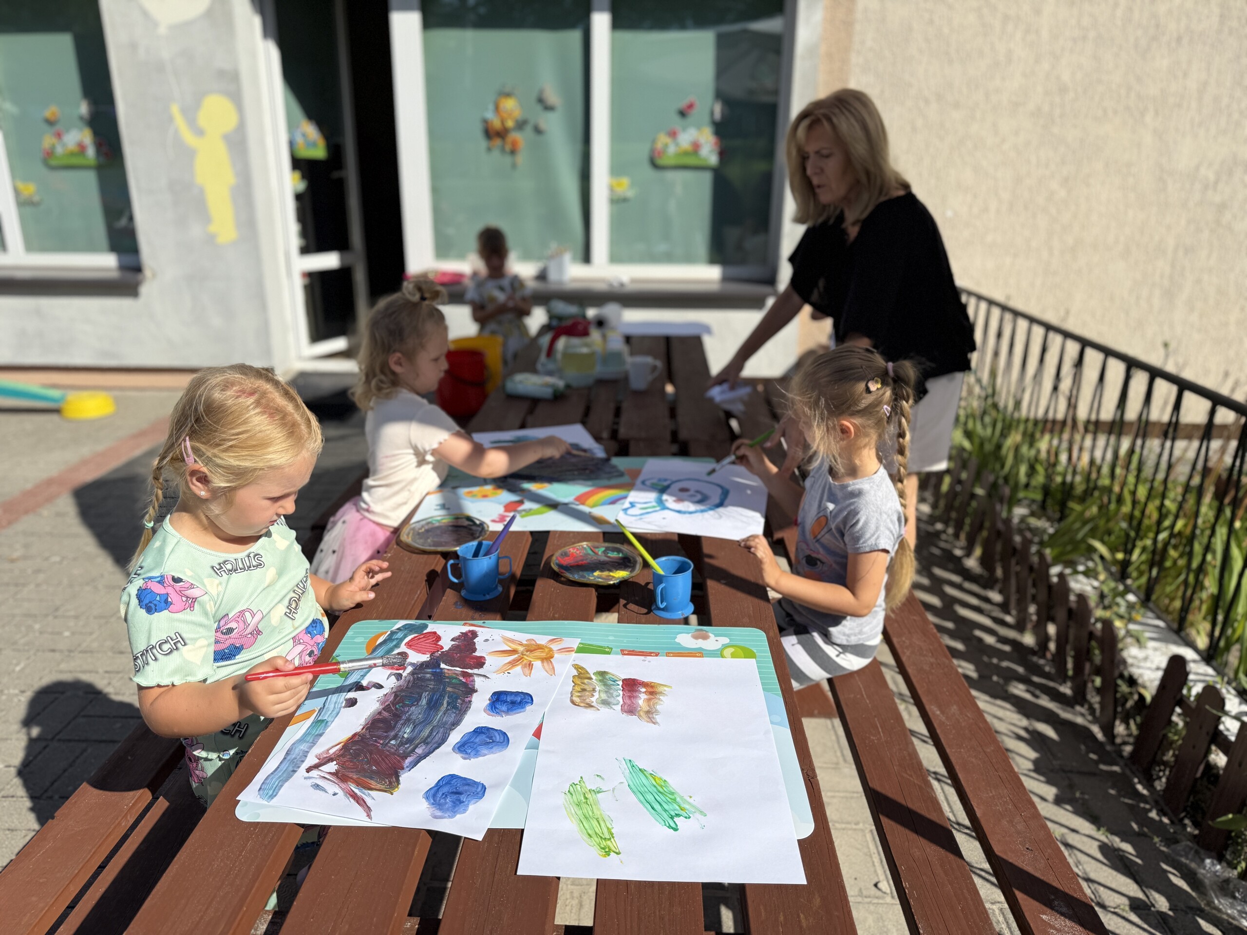 Nie zabrakło słońca, uśmiechów i mnóstwa kreatywnej zabawy! Mali artyści mogli eksperymentować z kolorami i malować pędzlami letnie inspiracje: słońce, kwiaty, motyle i chmurki. To była wspaniała okazja do rozwijania wyobraźni, małej motoryki oraz czerpania radości z tworzenia.