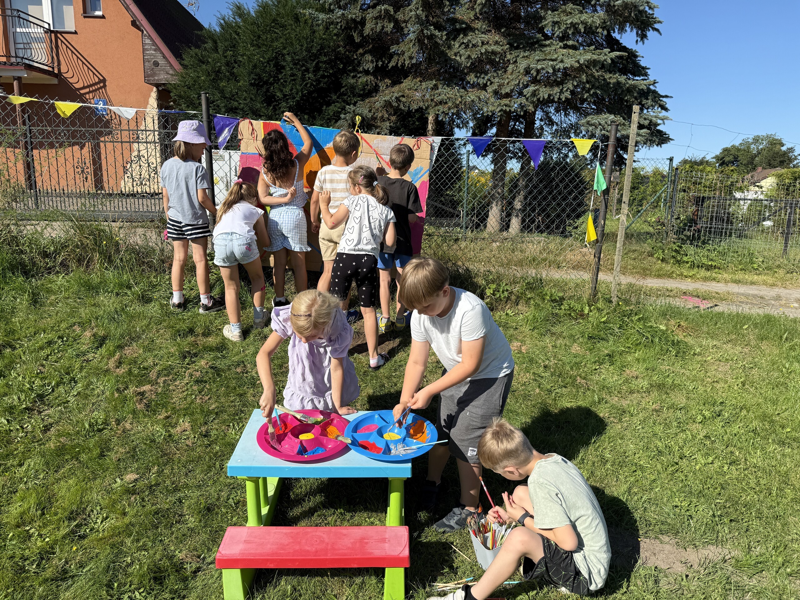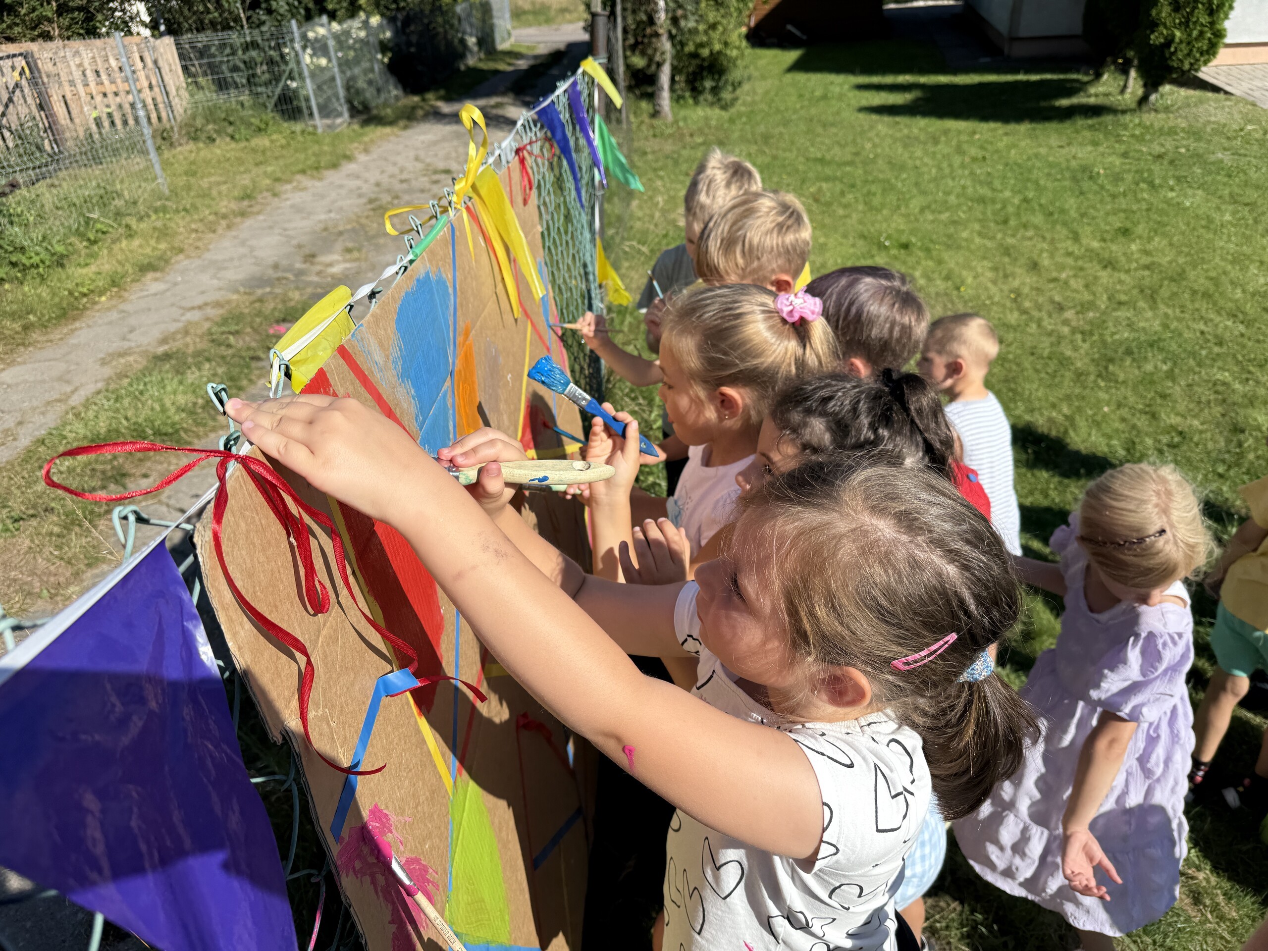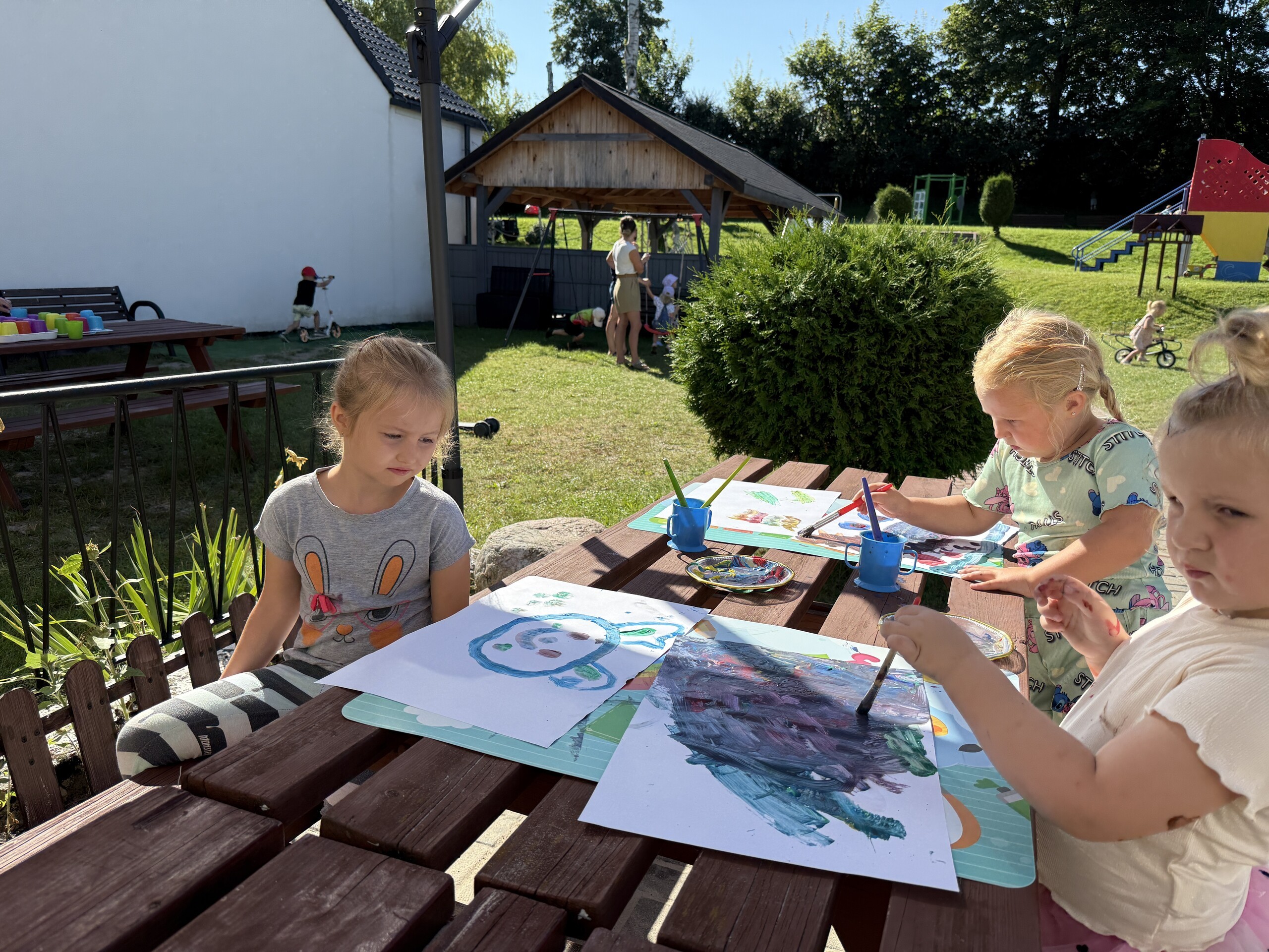Nie zabrakło słońca, uśmiechów i mnóstwa kreatywnej zabawy! Mali artyści mogli eksperymentować z kolorami i malować pędzlami letnie inspiracje: słońce, kwiaty, motyle i chmurki. To była wspaniała okazja do rozwijania wyobraźni, małej motoryki oraz czerpania radości z tworzenia.