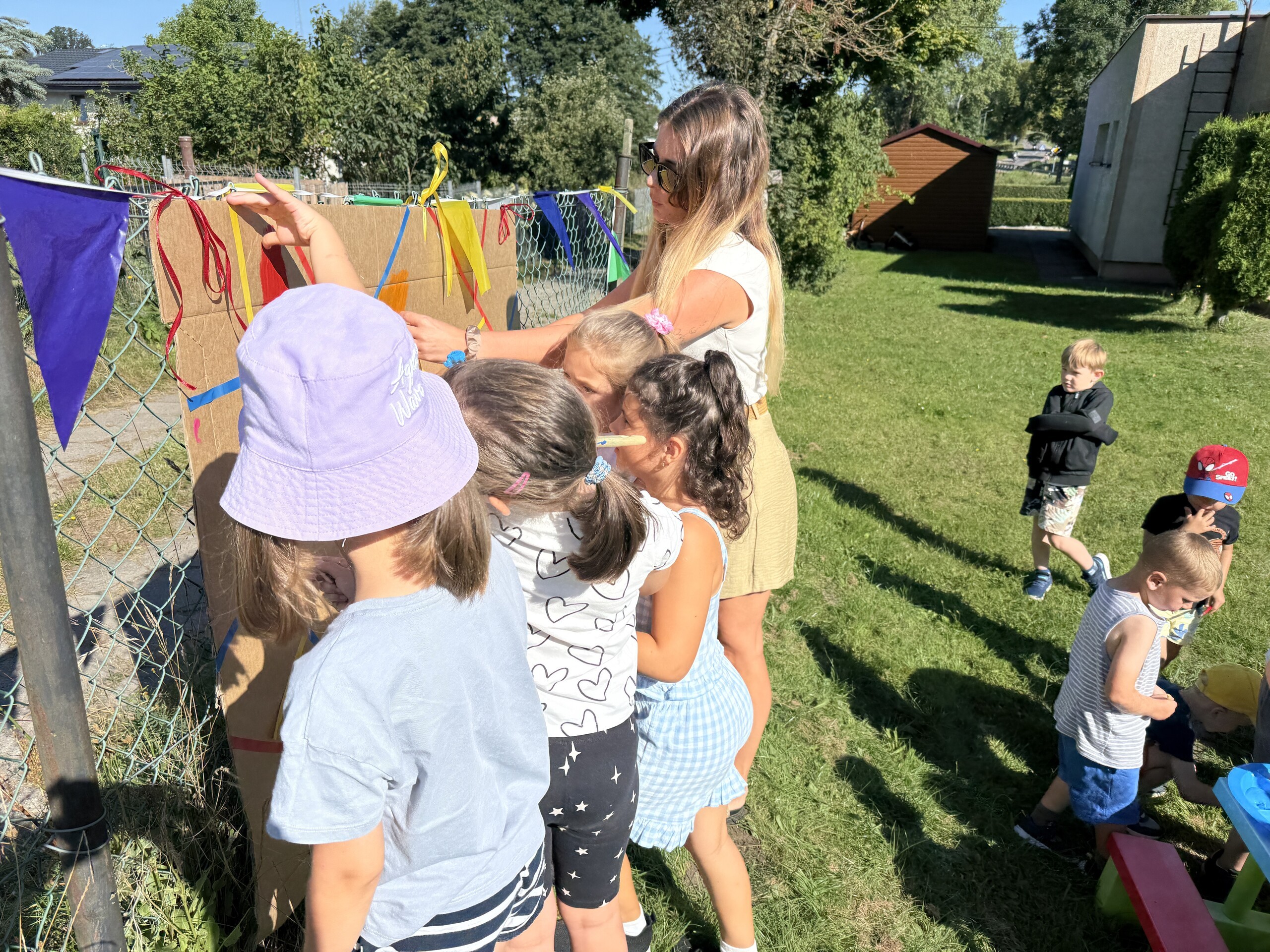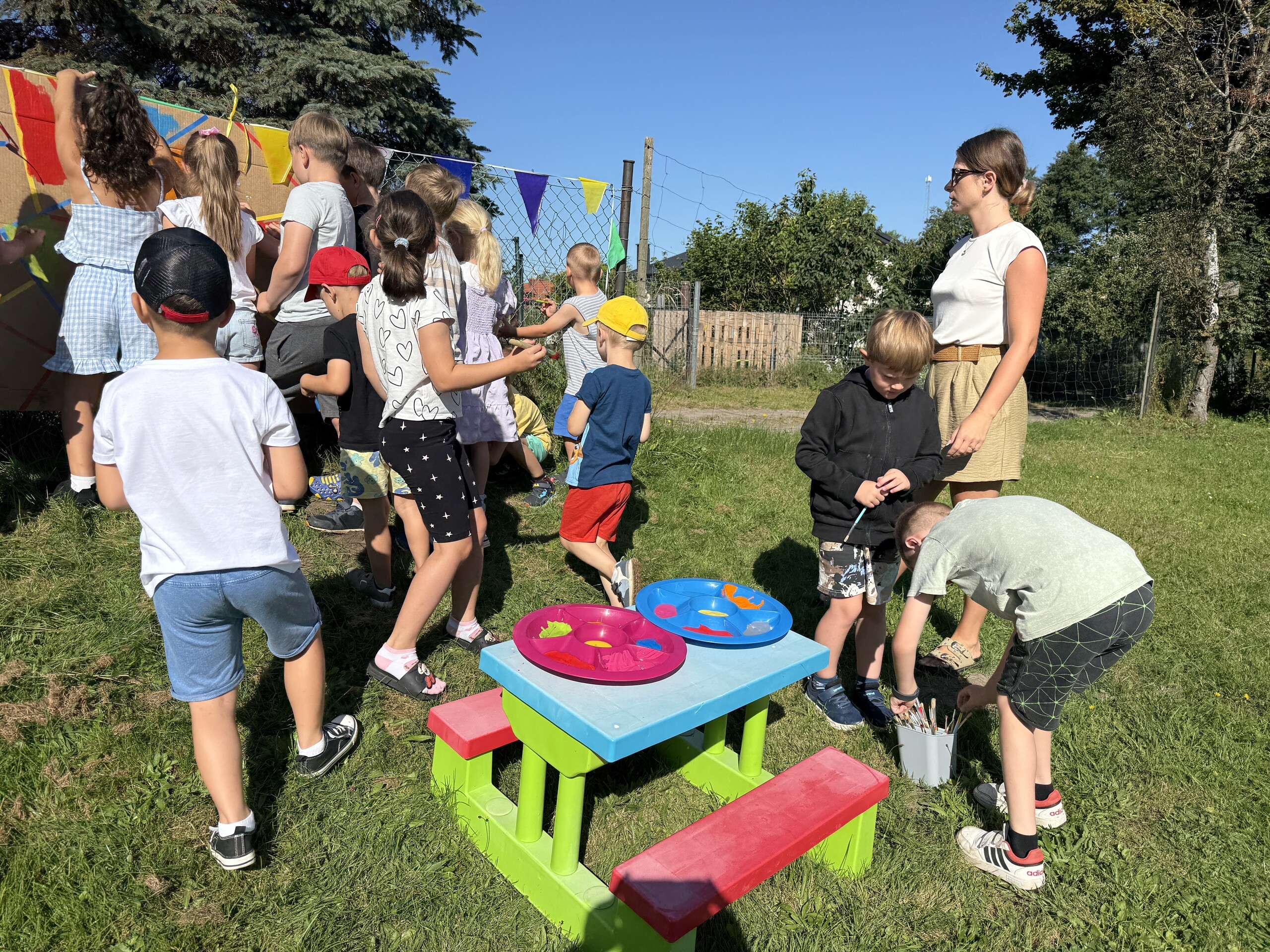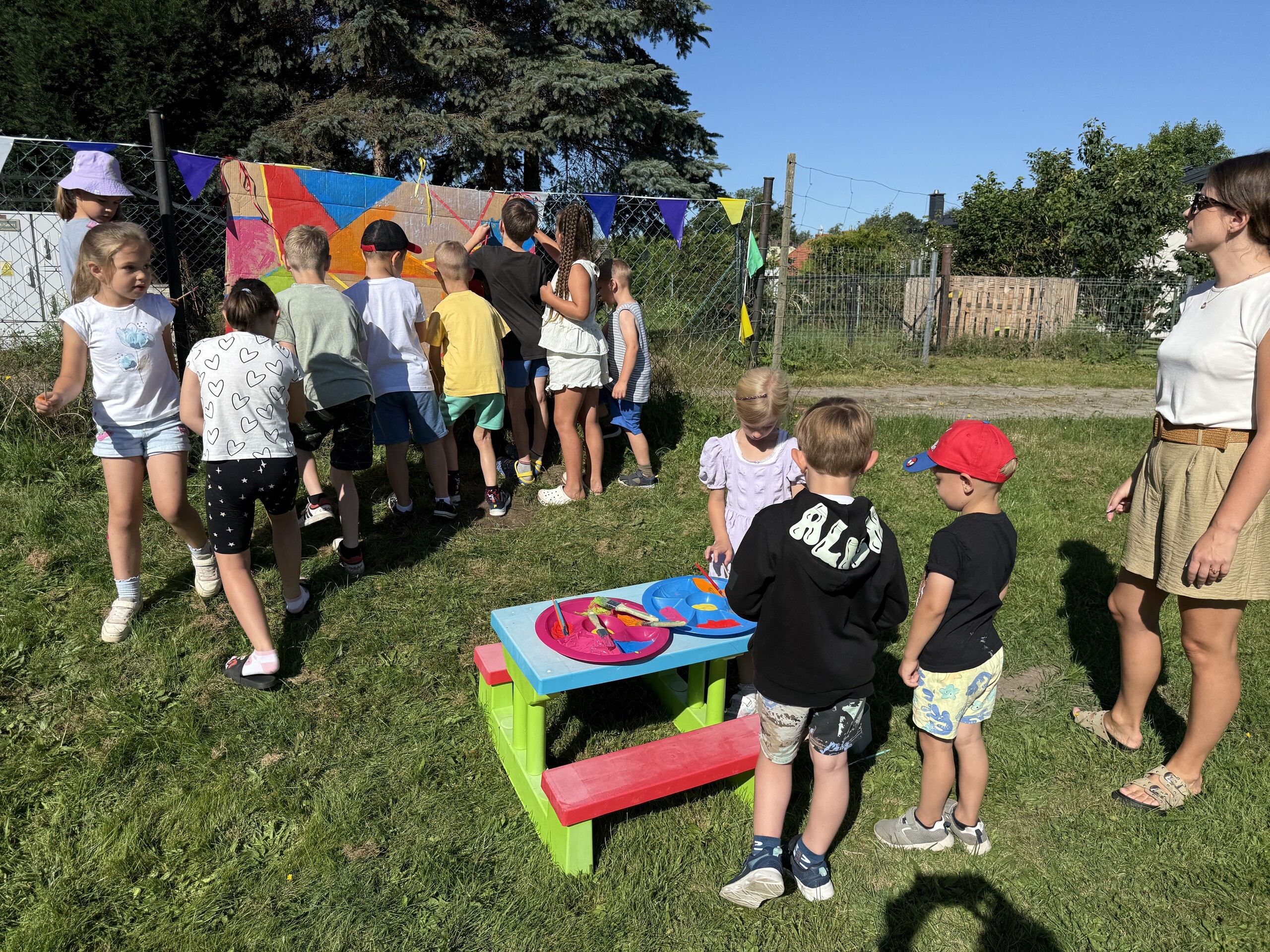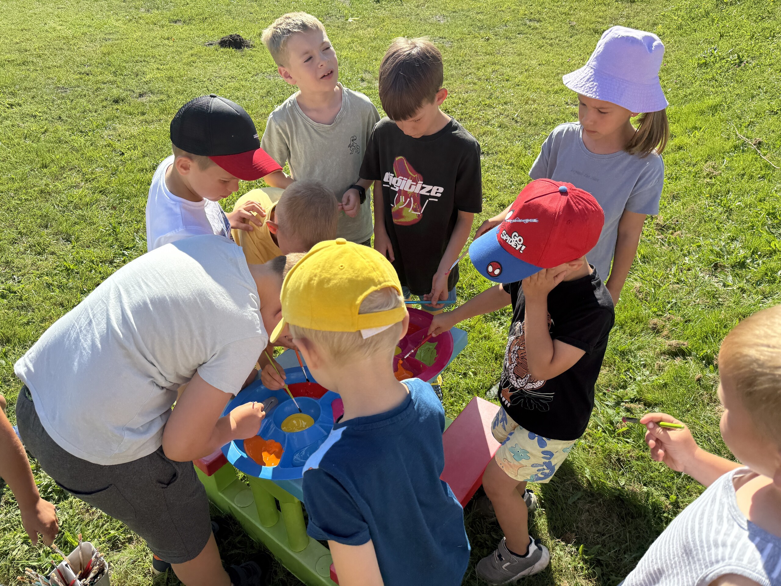 Nie zabrakło słońca, uśmiechów i mnóstwa kreatywnej zabawy! Mali artyści mogli eksperymentować z kolorami i malować pędzlami letnie inspiracje: słońce, kwiaty, motyle i chmurki. To była wspaniała okazja do rozwijania wyobraźni, małej motoryki oraz czerpania radości z tworzenia.