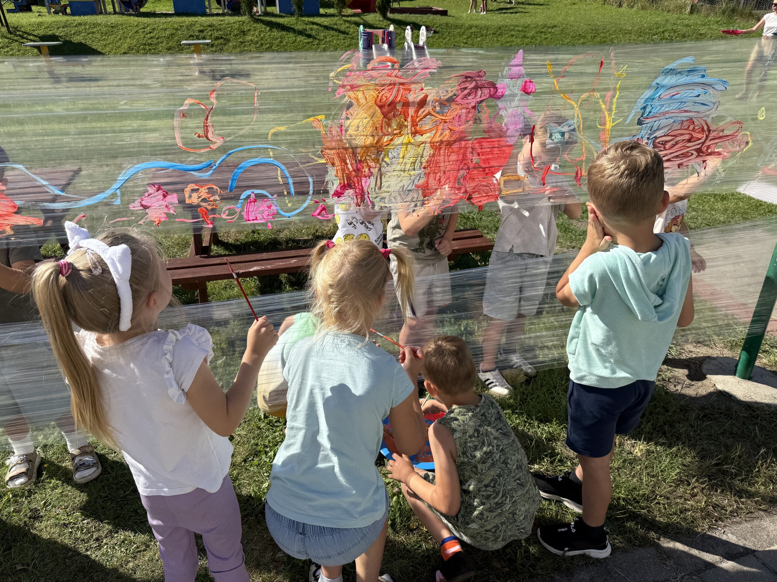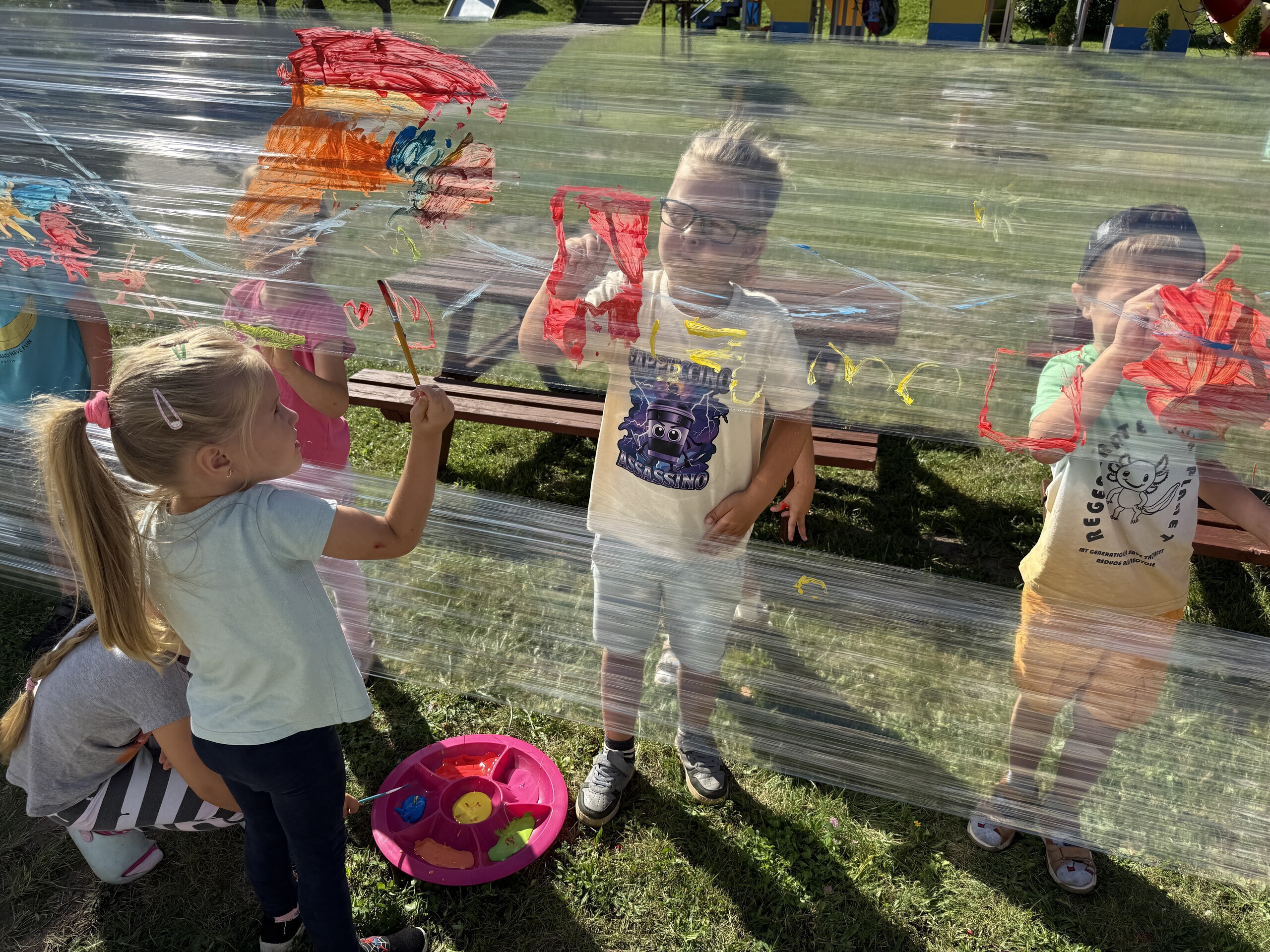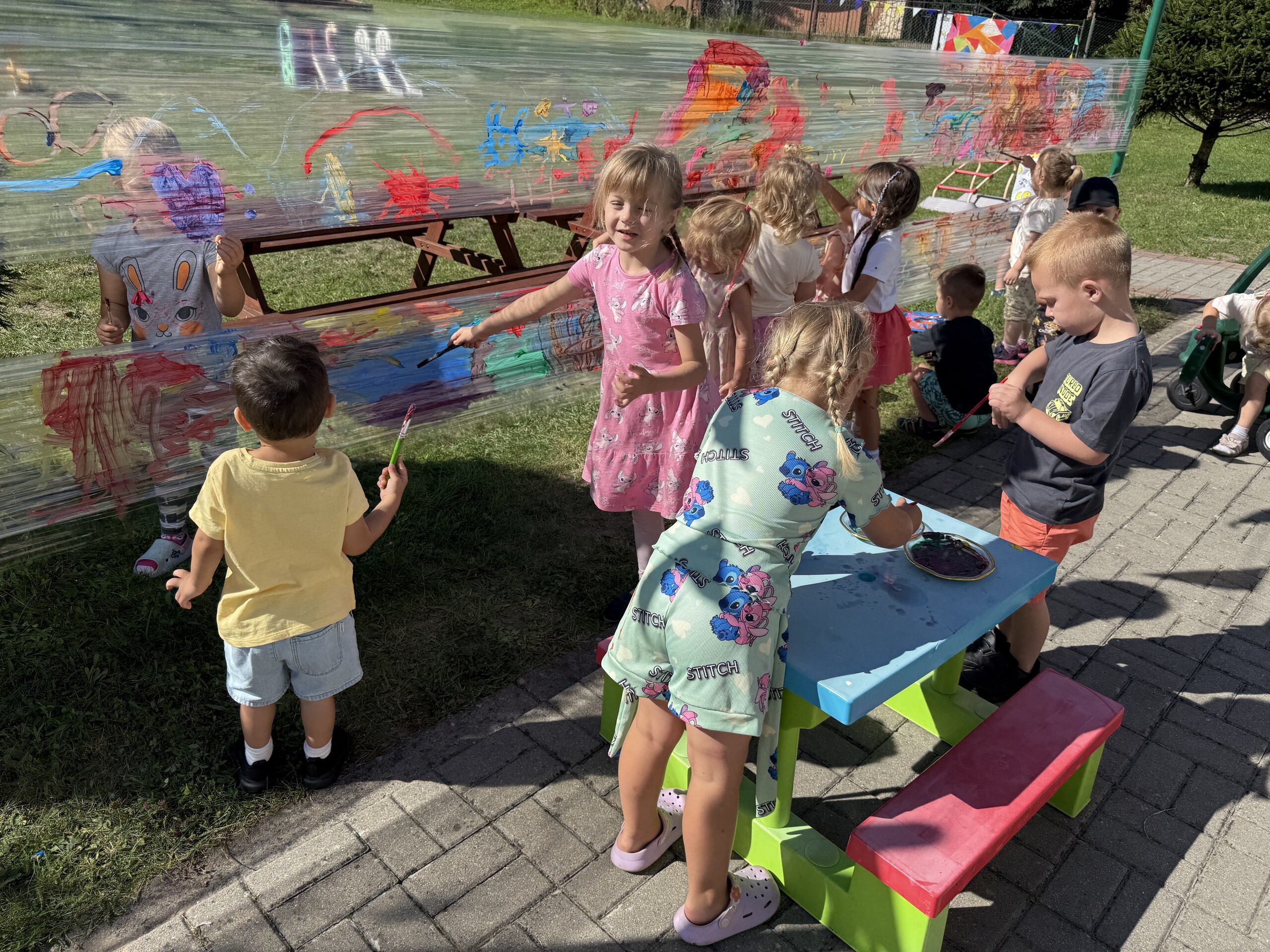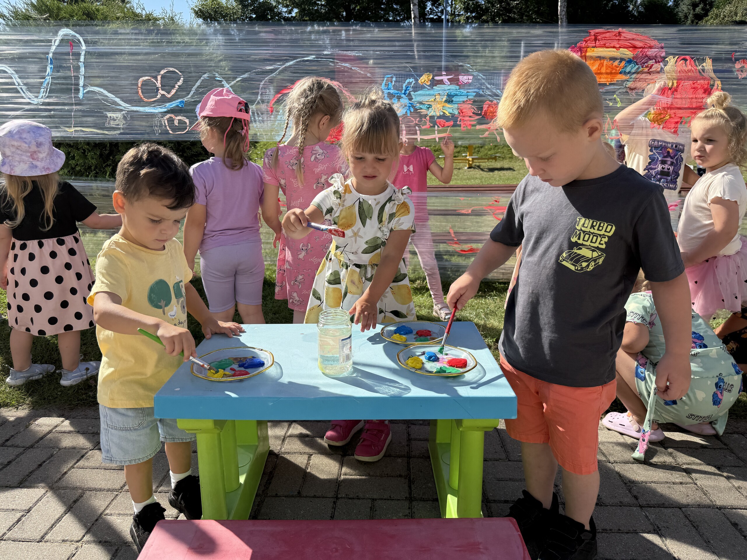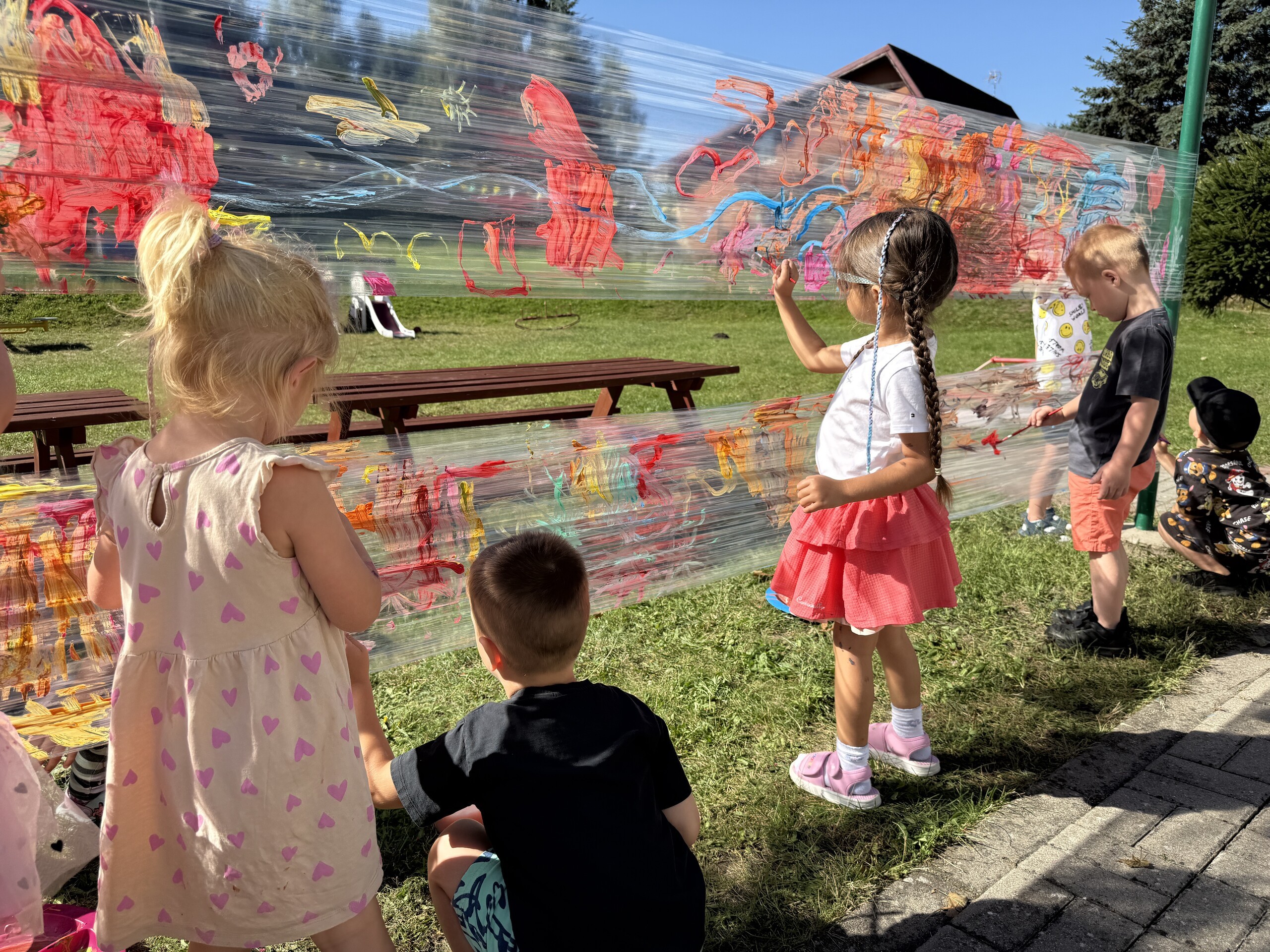 Wykorzystując piękną, słoneczną pogodę, nasze przedszkolaki wzięły udział w wyjątkowych zajęciach plastycznych na świeżym powietrzu. Dzieci malowały farbami na folii stretch, dużym kartonie oraz kartkach tworząc kolorowe letnie krajobrazy i własne artystyczne wizje.