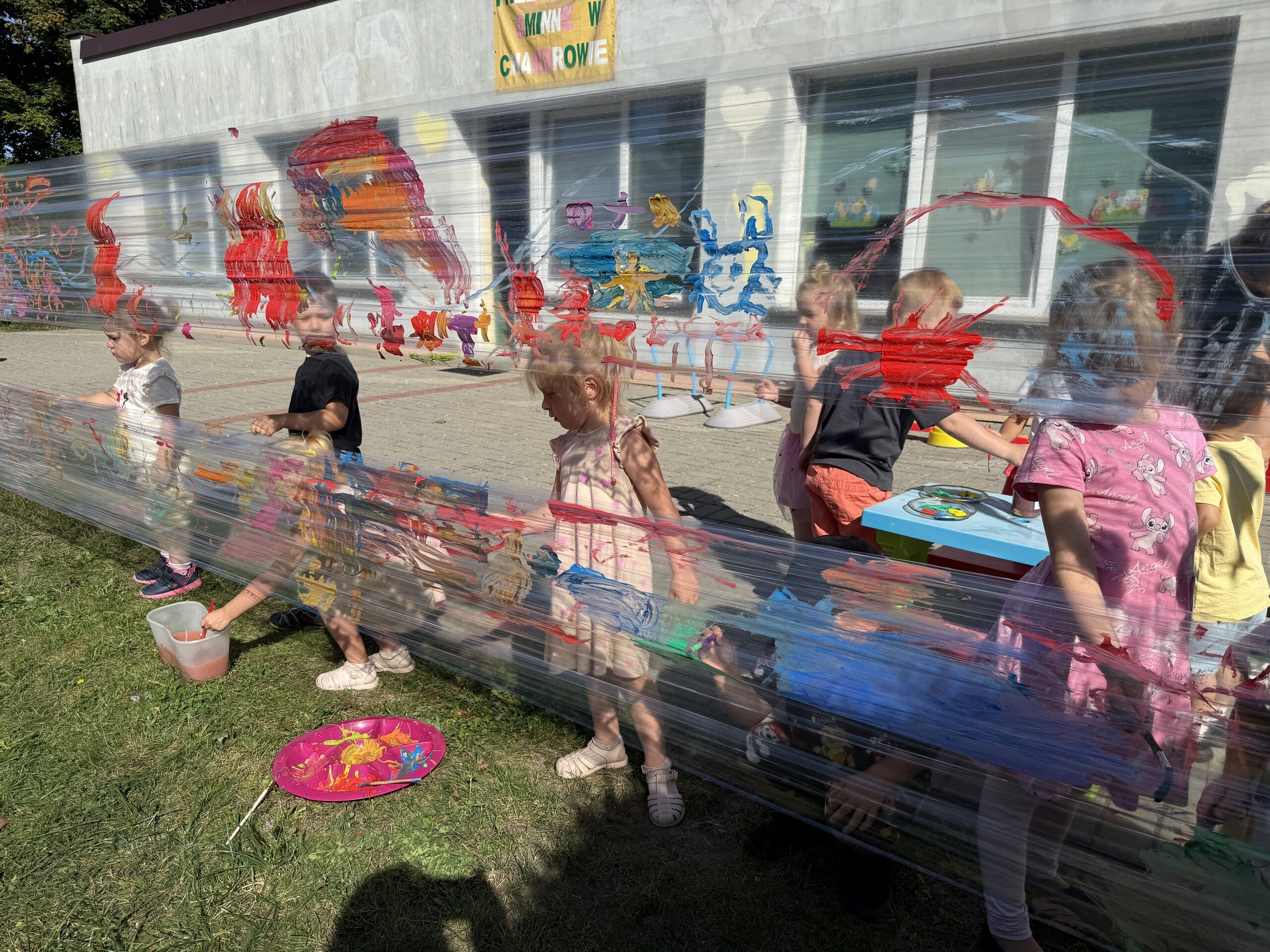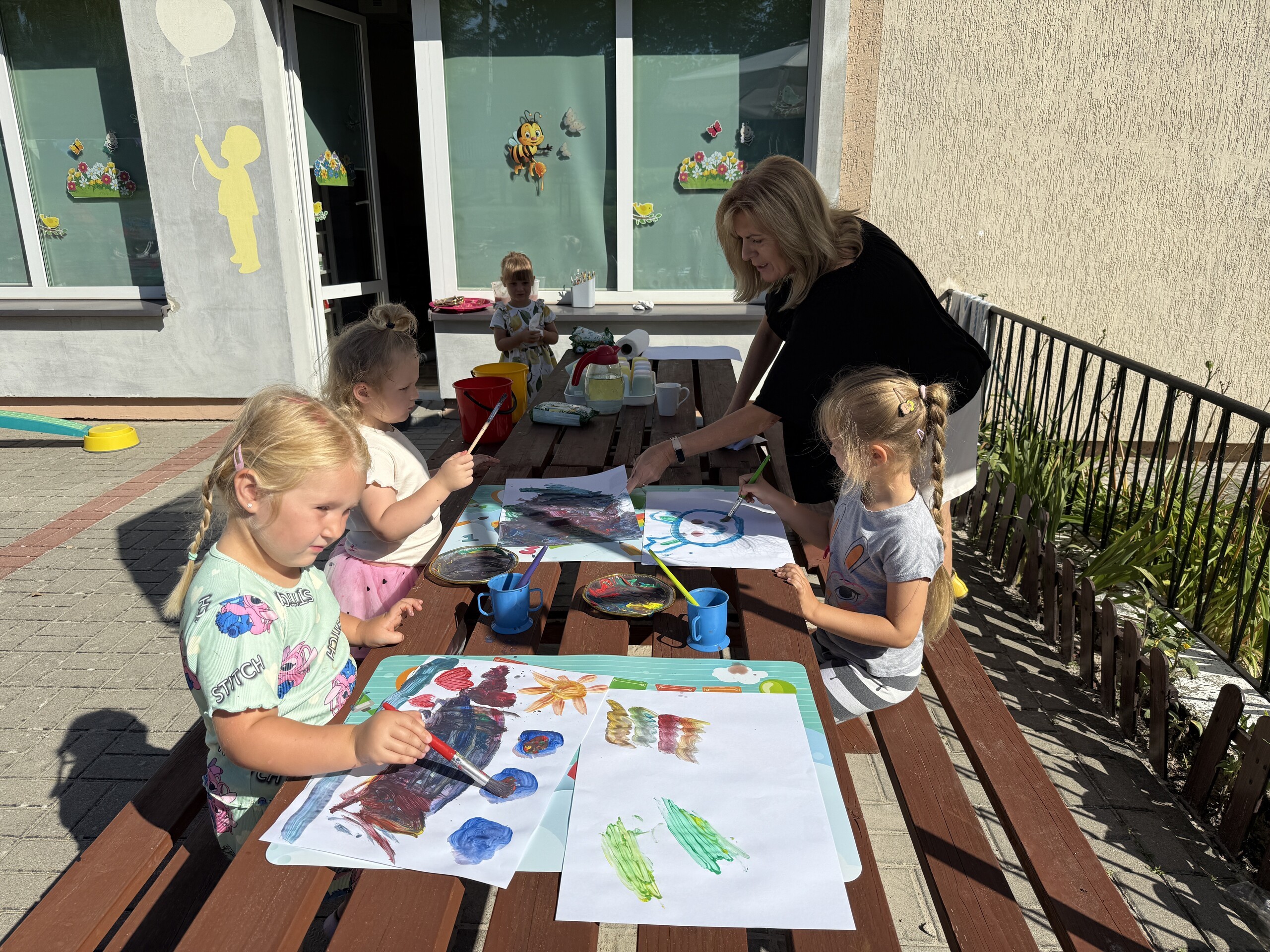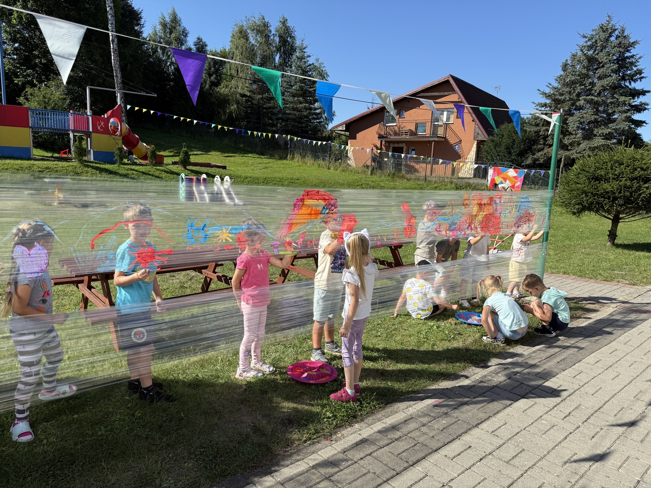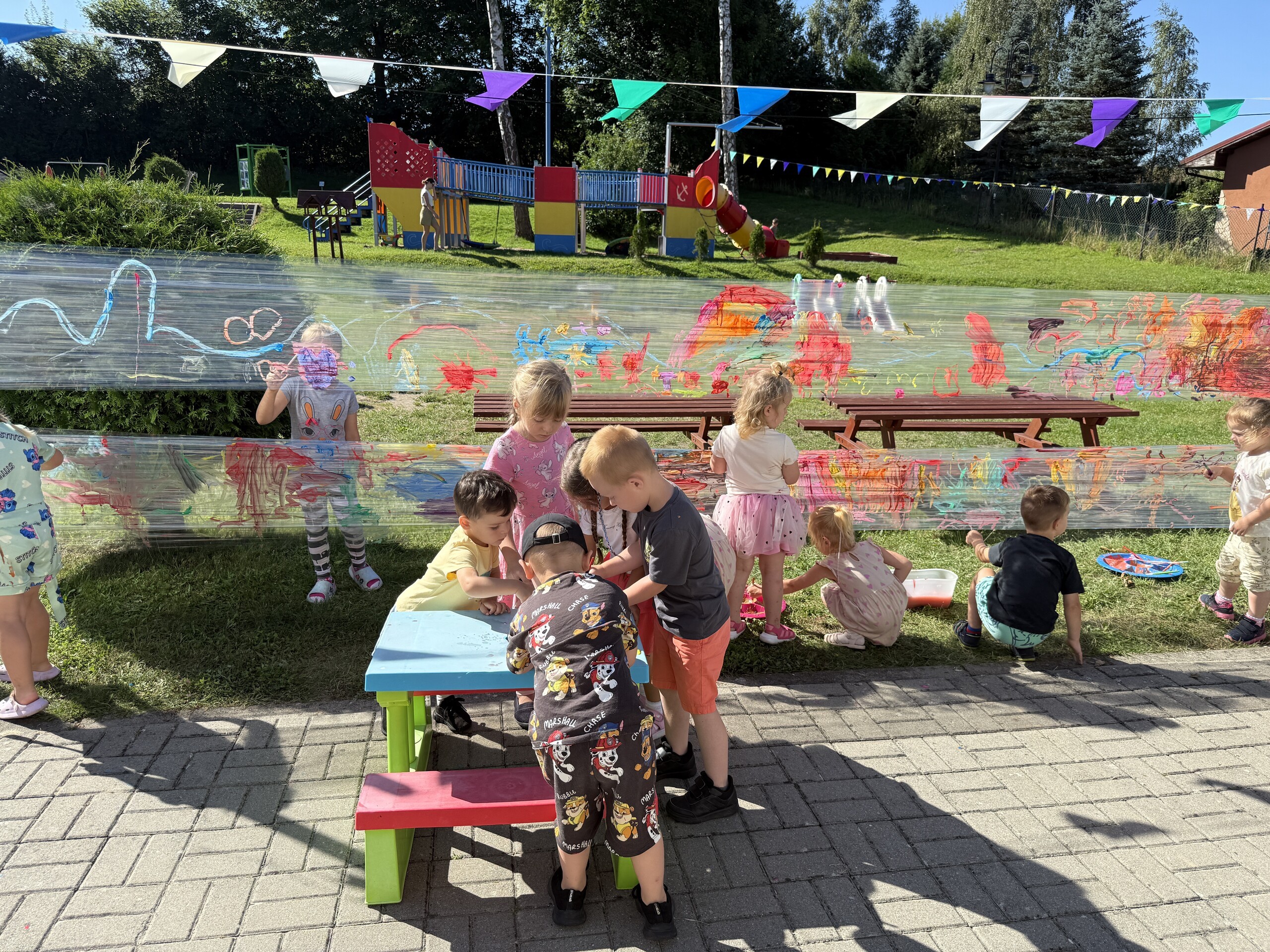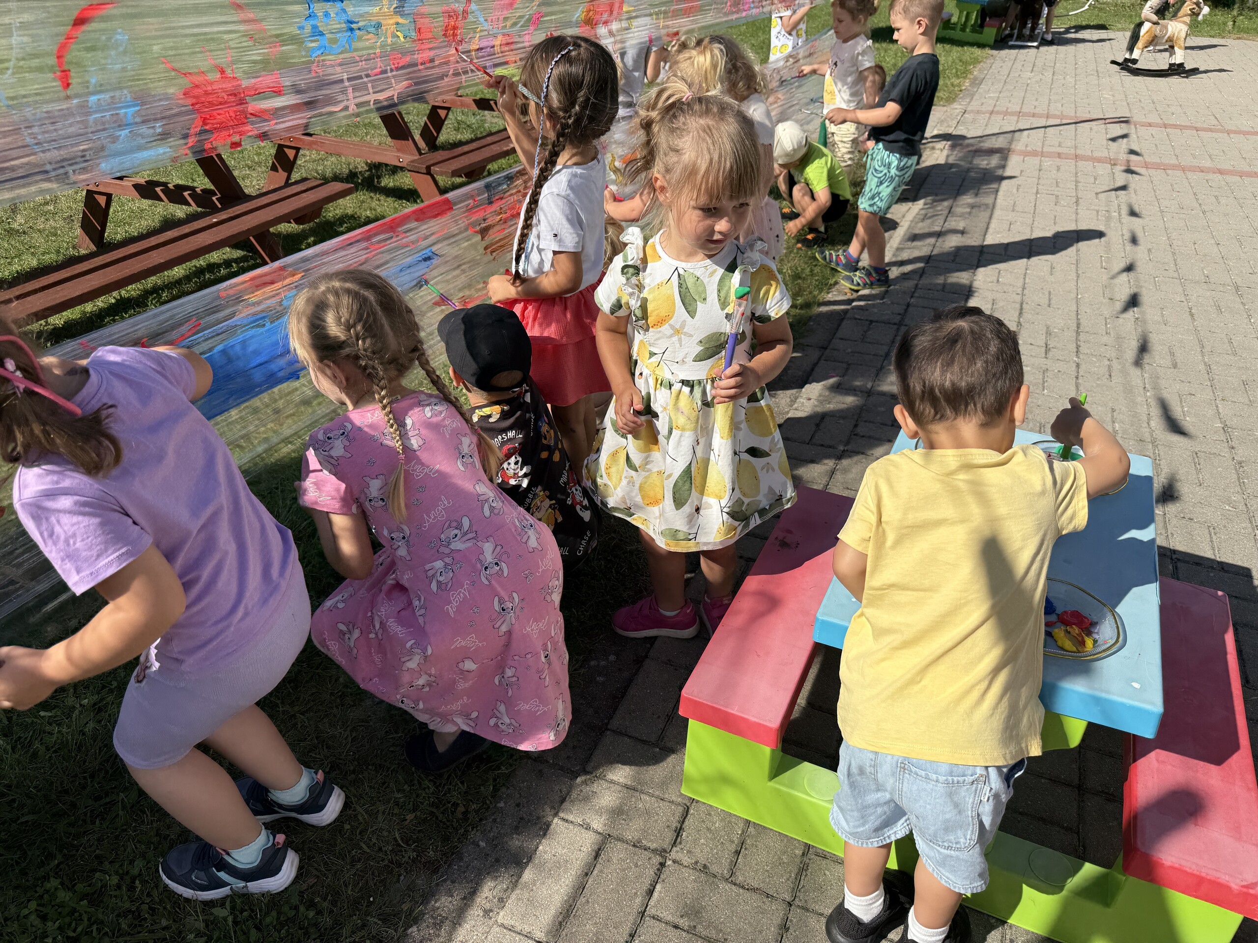 Wykorzystując piękną, słoneczną pogodę, nasze przedszkolaki wzięły udział w wyjątkowych zajęciach plastycznych na świeżym powietrzu. Dzieci malowały farbami na folii stretch, dużym kartonie oraz kartkach tworząc kolorowe letnie krajobrazy i własne artystyczne wizje.