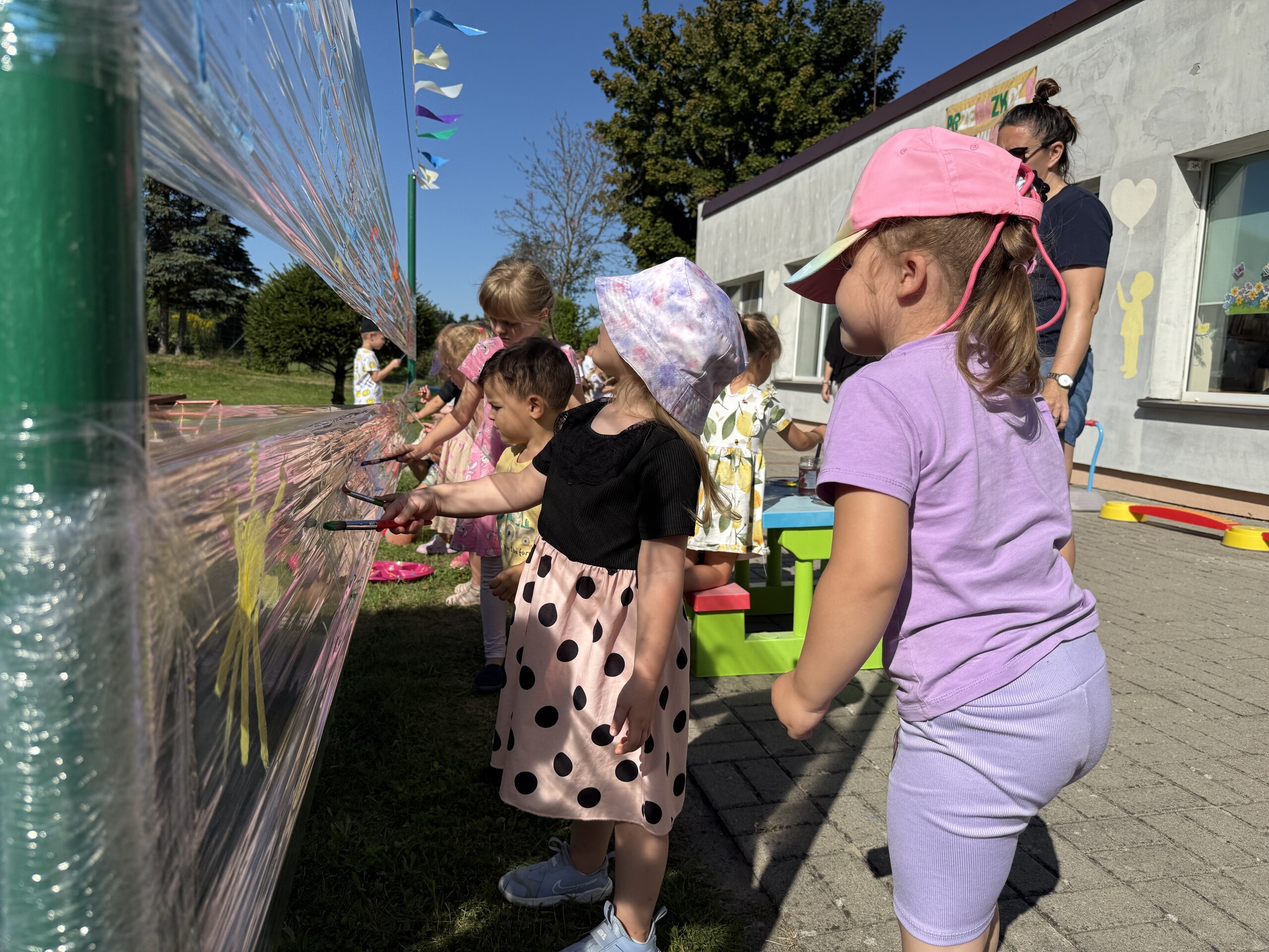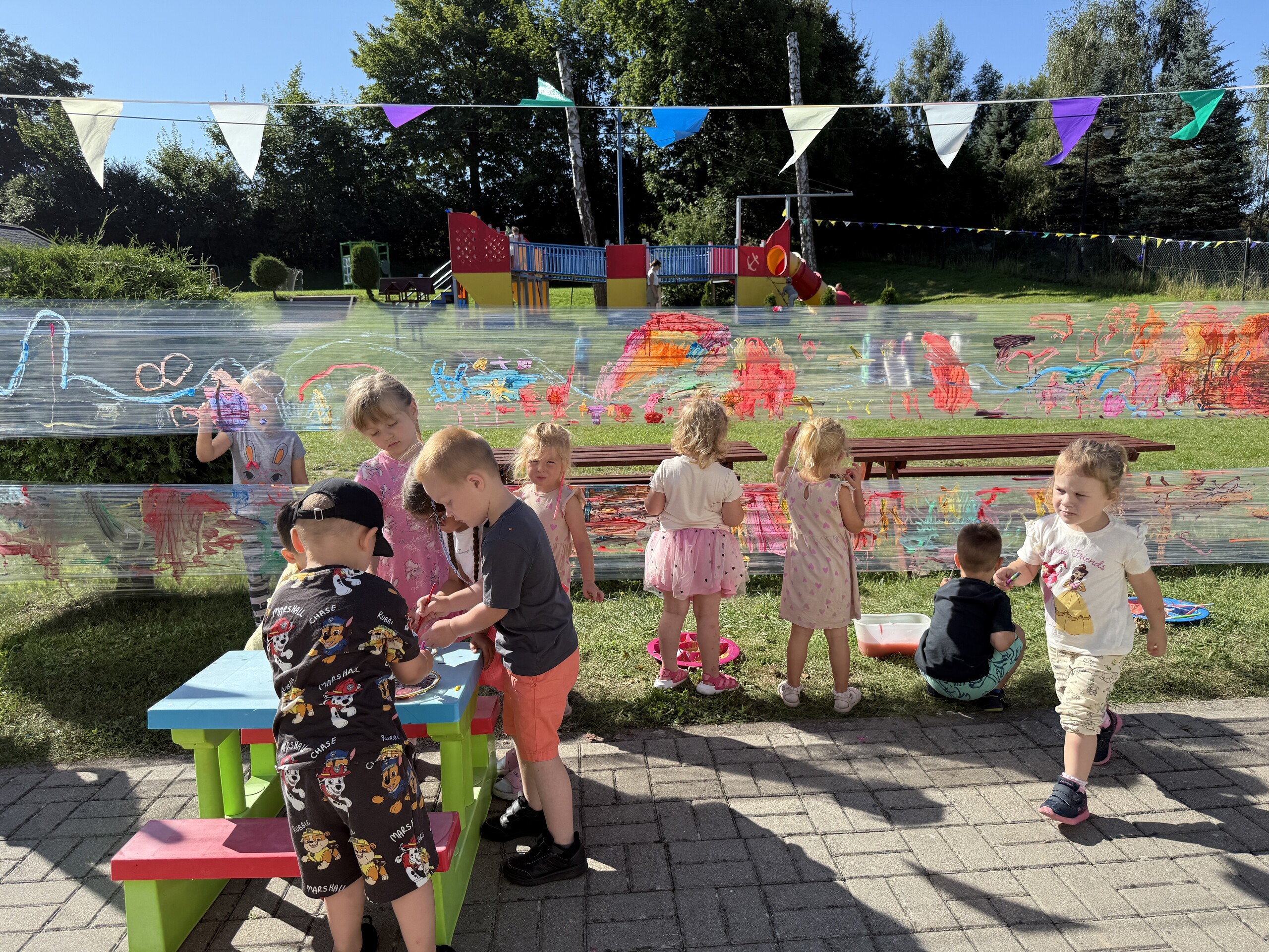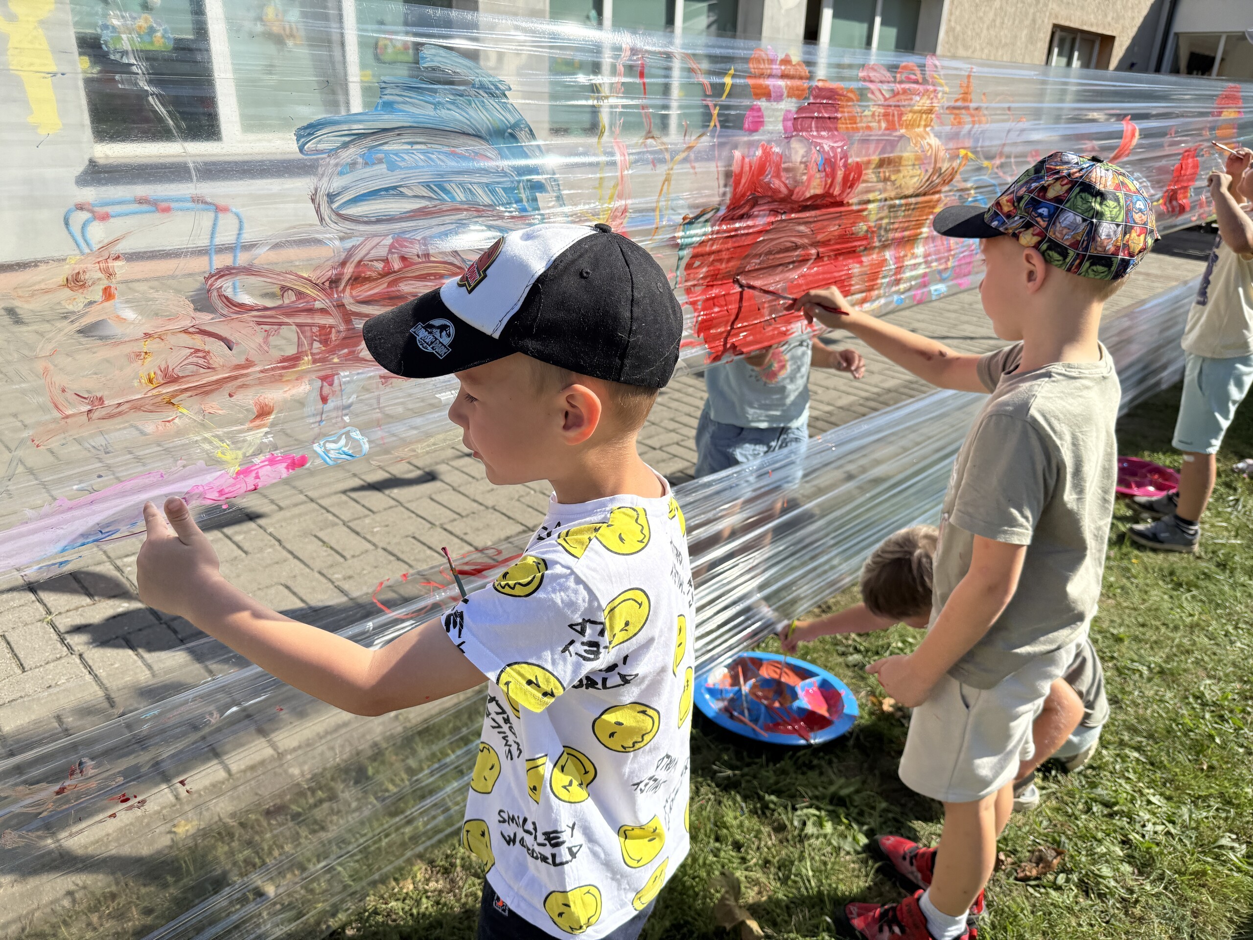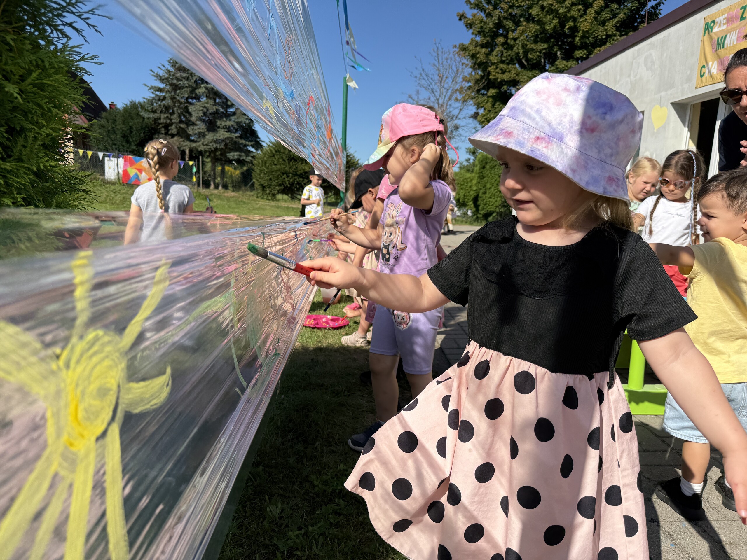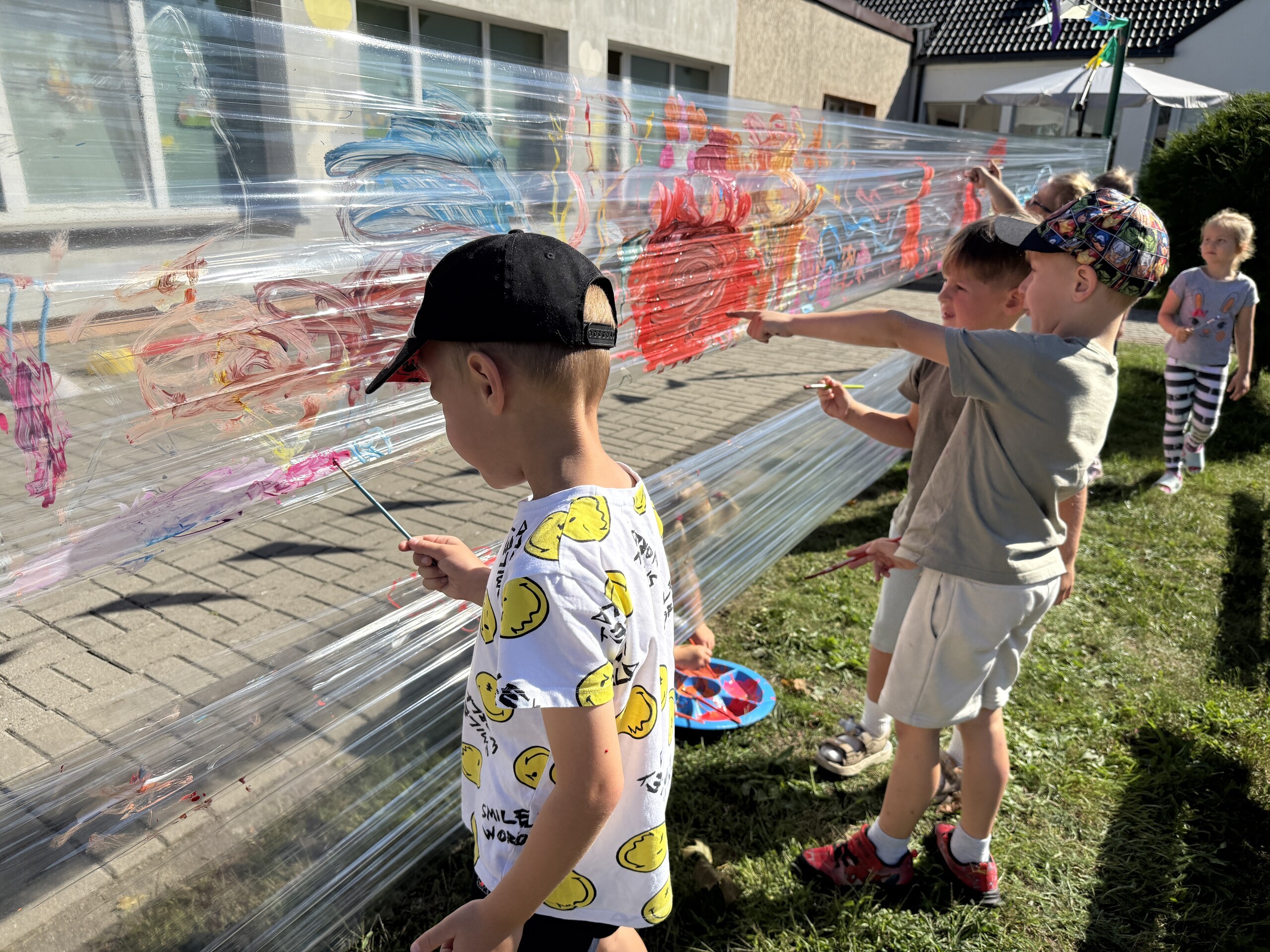 Wykorzystując piękną, słoneczną pogodę, nasze przedszkolaki wzięły udział w wyjątkowych zajęciach plastycznych na świeżym powietrzu. Dzieci malowały farbami na folii stretch, dużym kartonie oraz kartkach tworząc kolorowe letnie krajobrazy i własne artystyczne wizje.