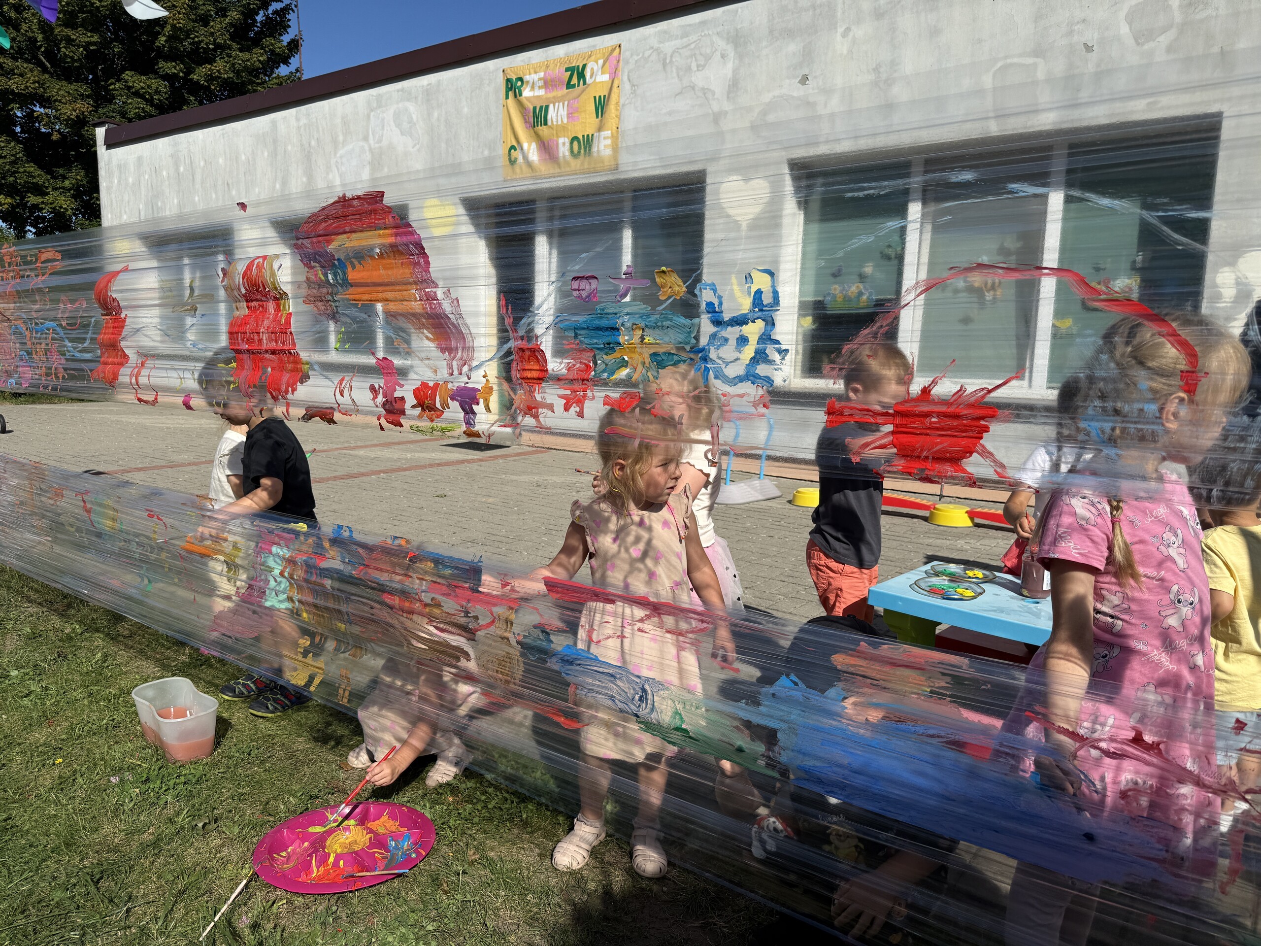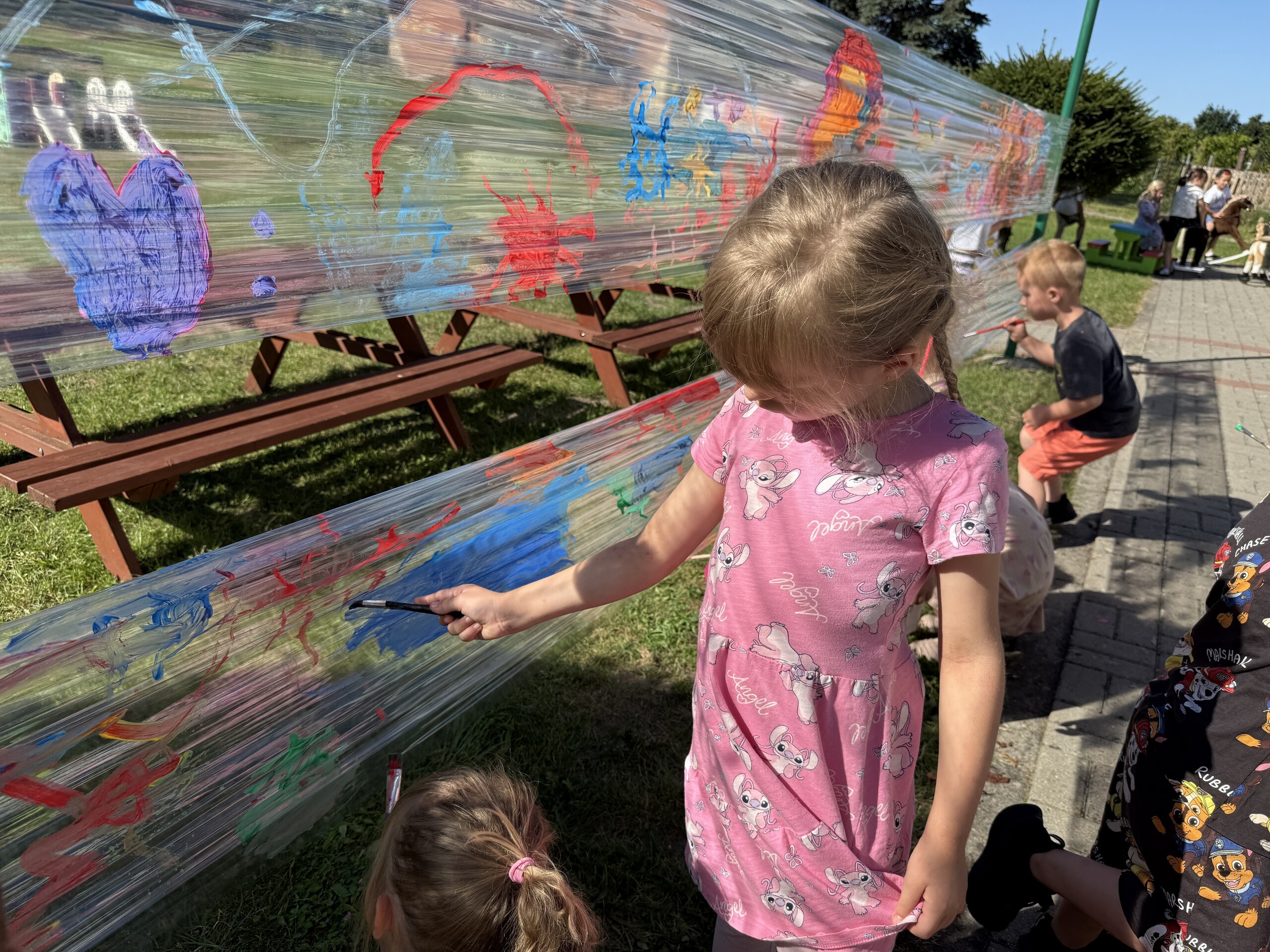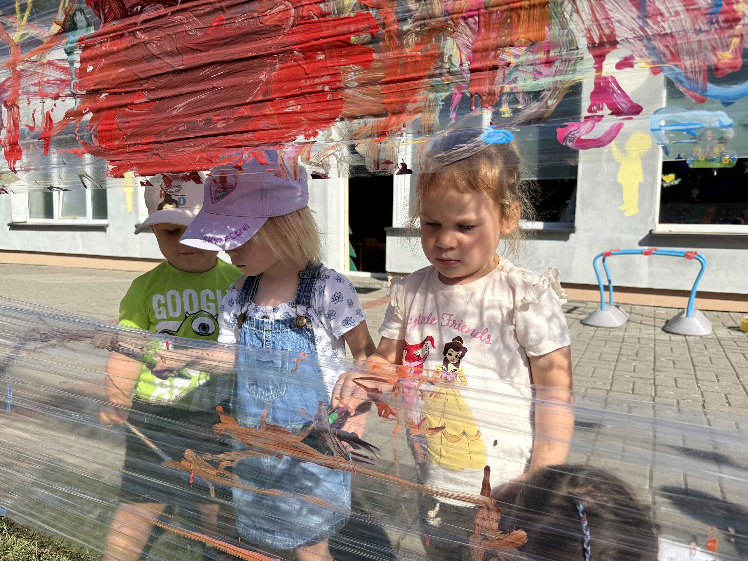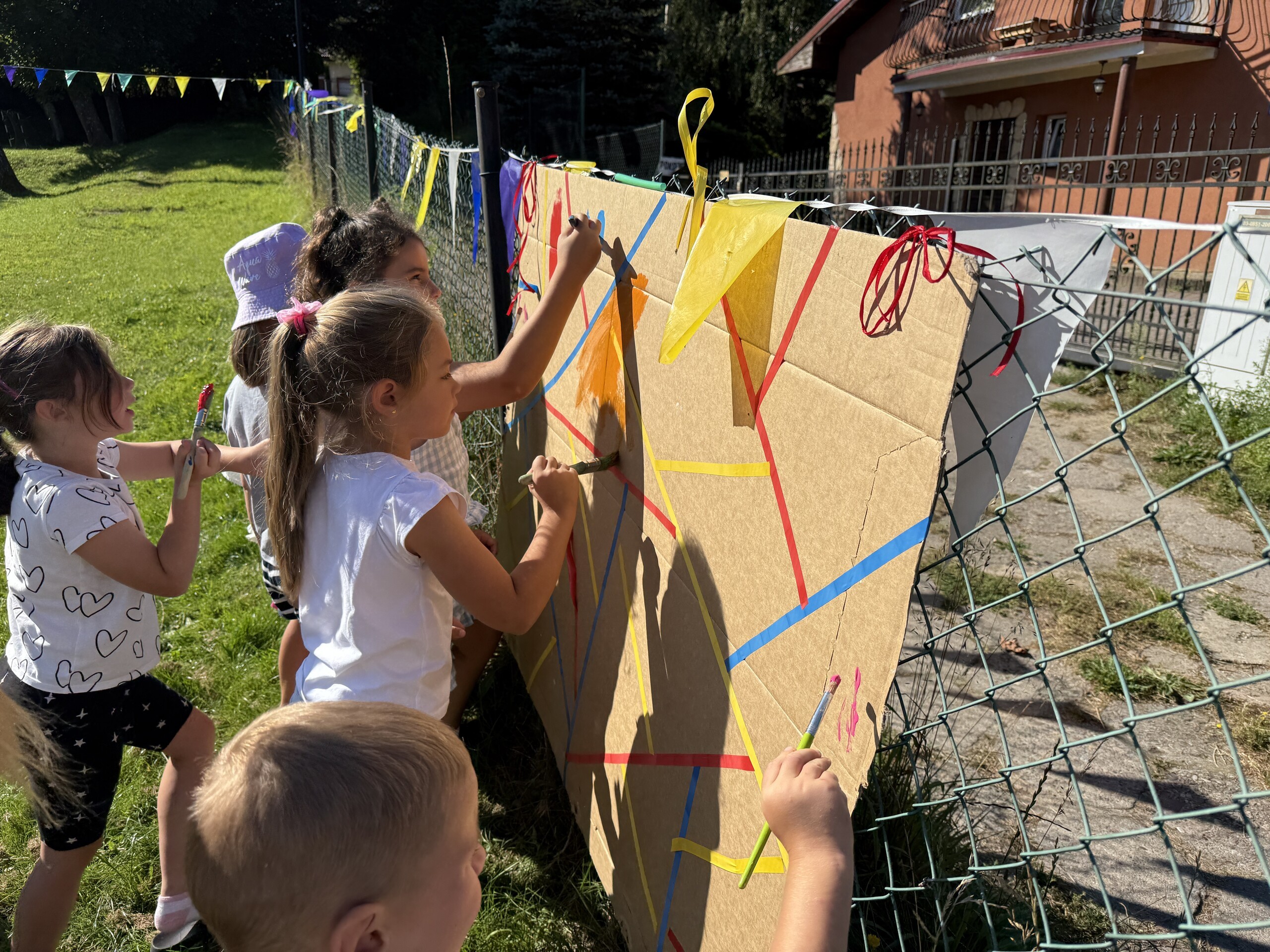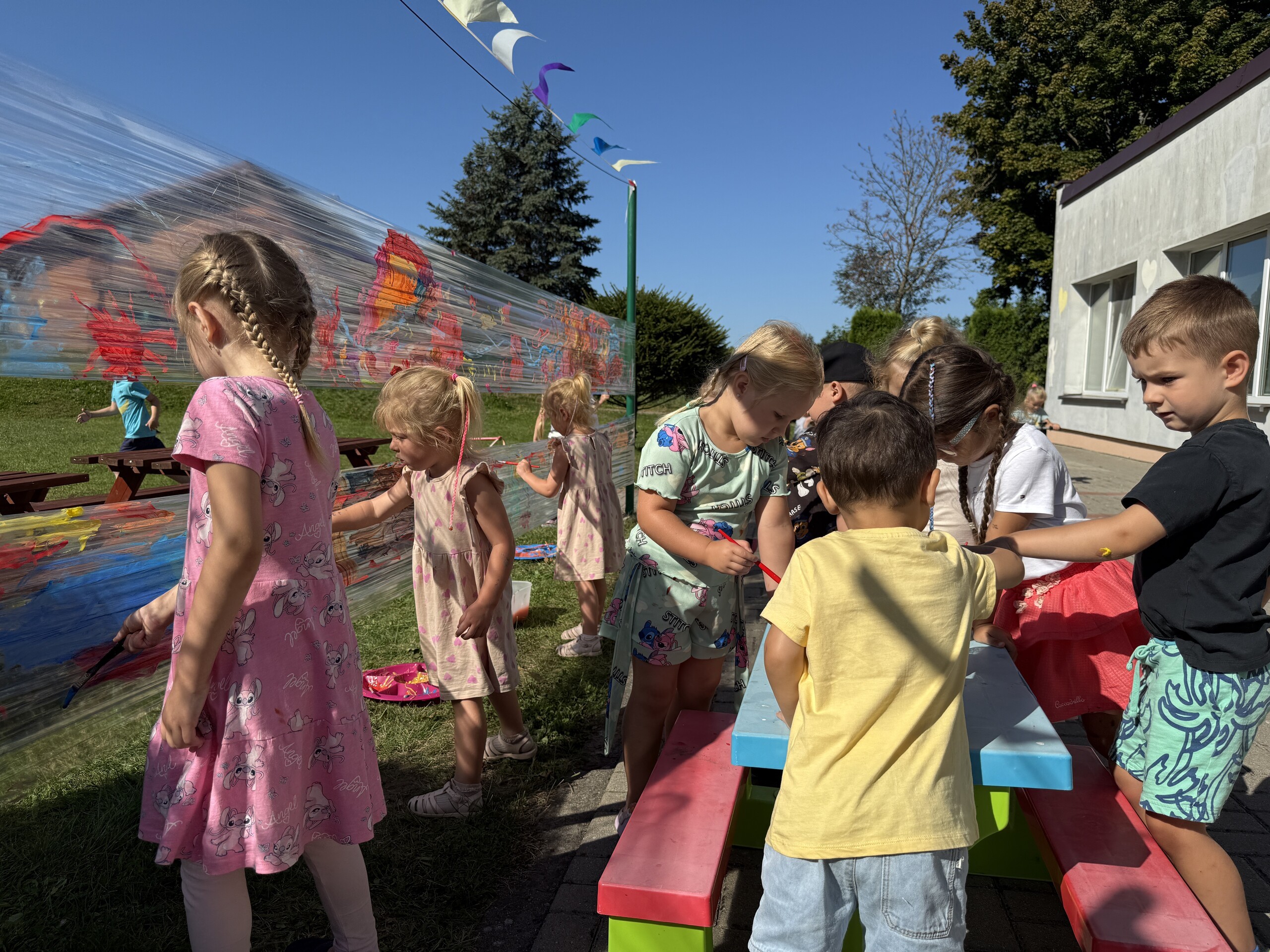 Wykorzystując piękną, słoneczną pogodę, nasze przedszkolaki wzięły udział w wyjątkowych zajęciach plastycznych na świeżym powietrzu. Dzieci malowały farbami na folii stretch, dużym kartonie oraz kartkach tworząc kolorowe letnie krajobrazy i własne artystyczne wizje.