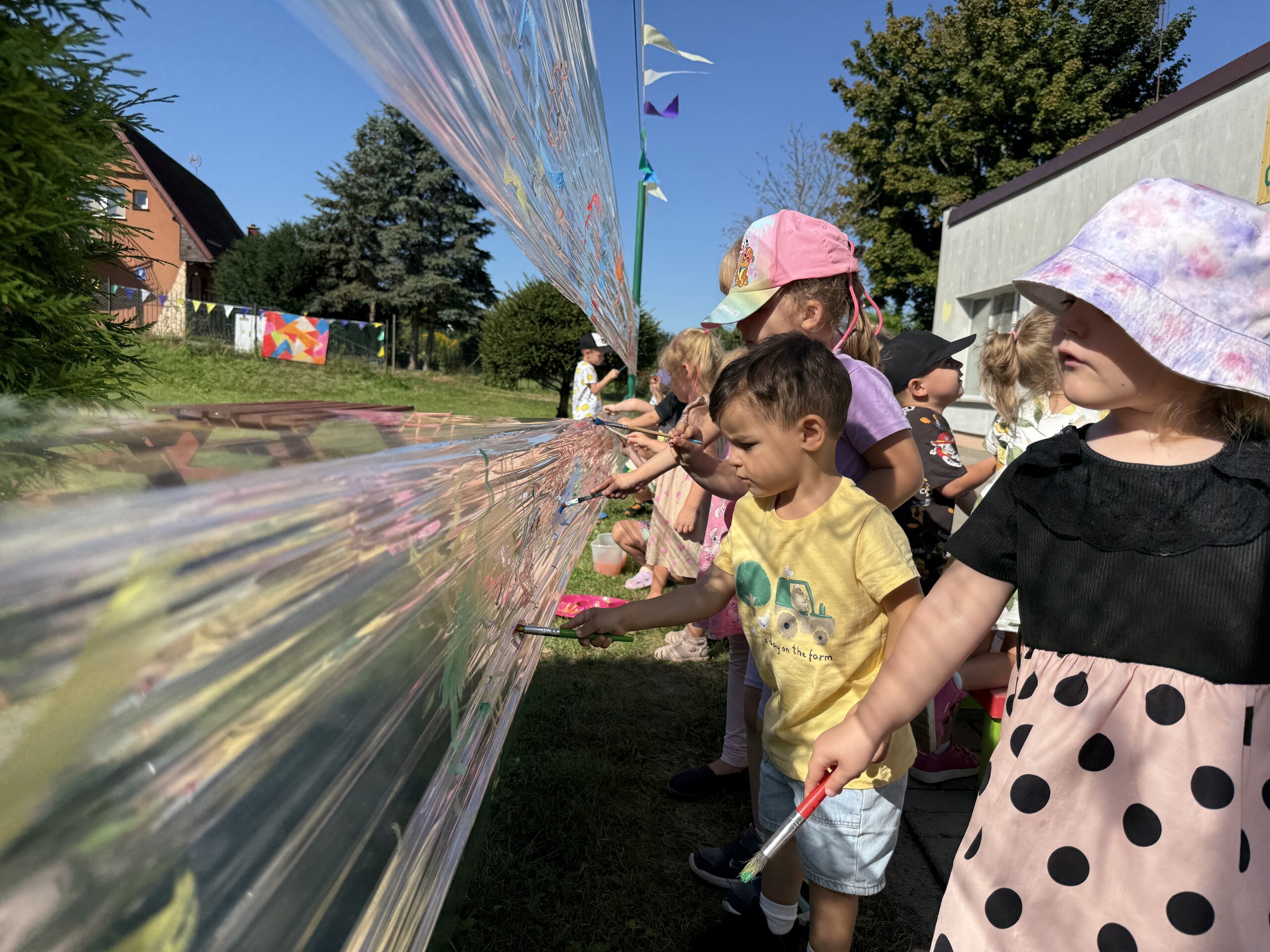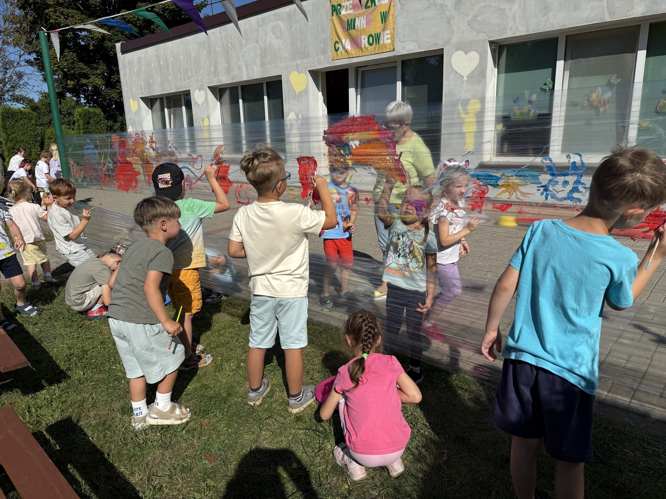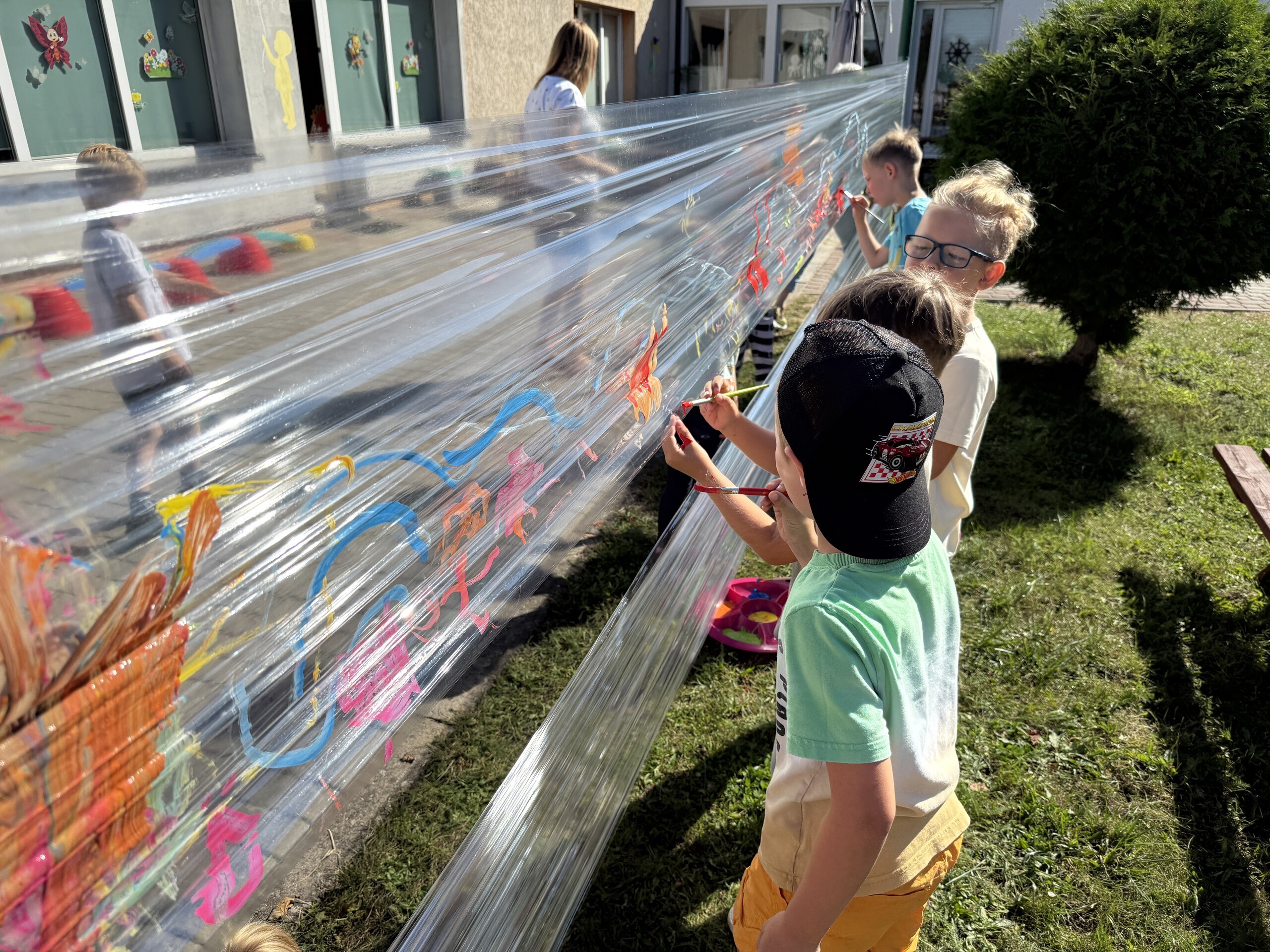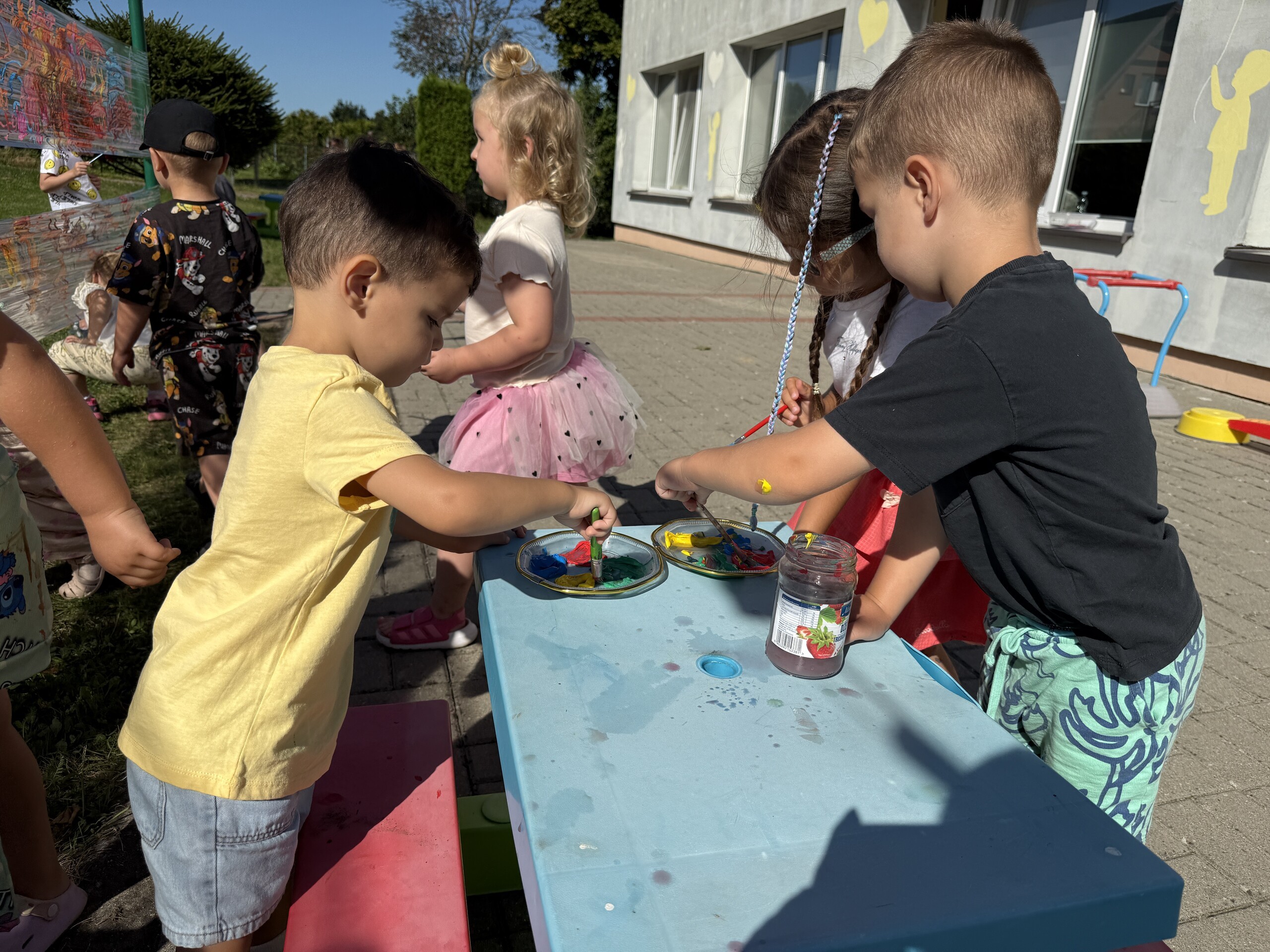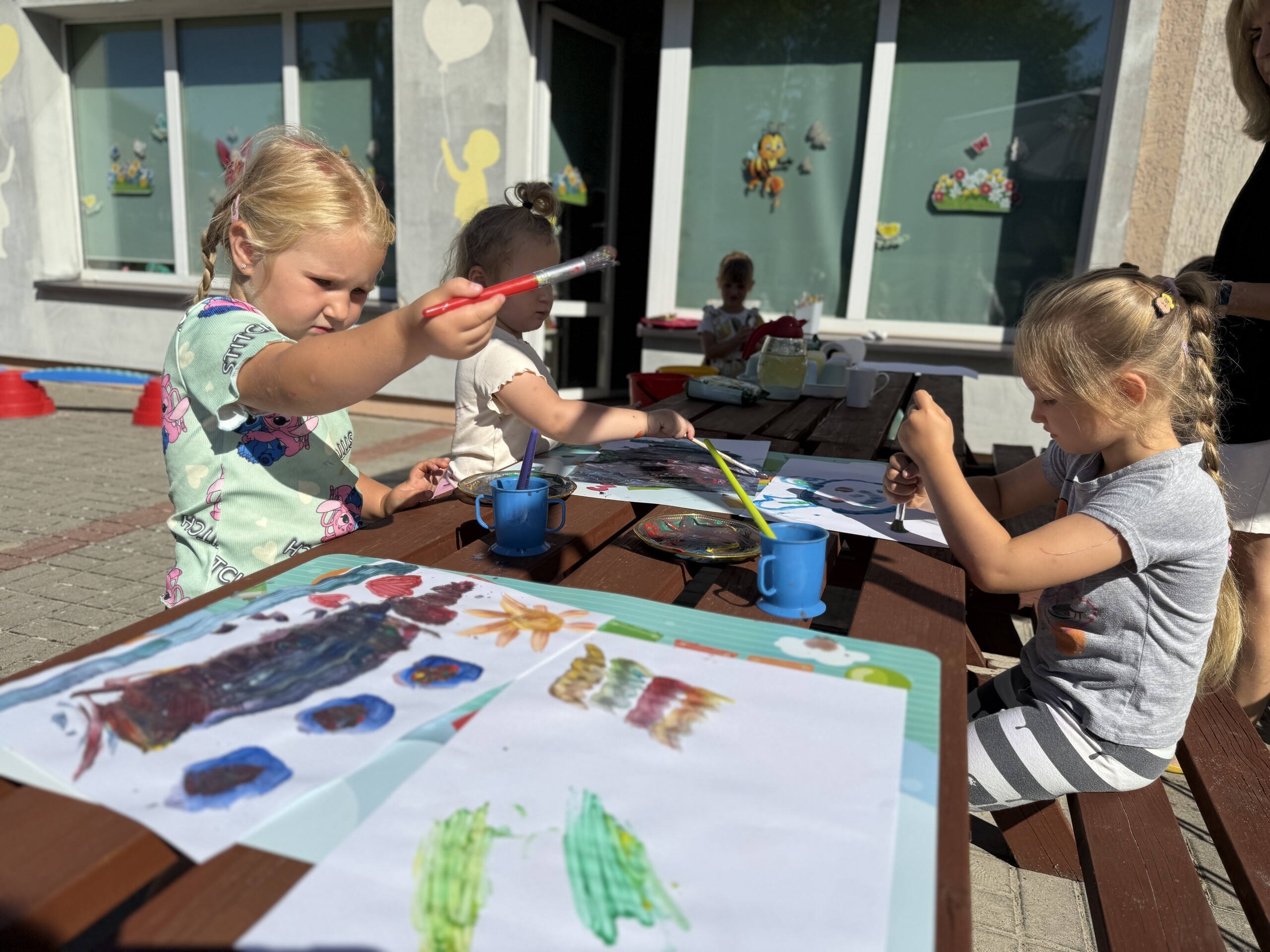Wykorzystując piękną, słoneczną pogodę, nasze przedszkolaki wzięły udział w wyjątkowych zajęciach plastycznych na świeżym powietrzu. Dzieci malowały farbami na folii stretch, dużym kartonie oraz kartkach tworząc kolorowe letnie krajobrazy i własne artystyczne wizje.
