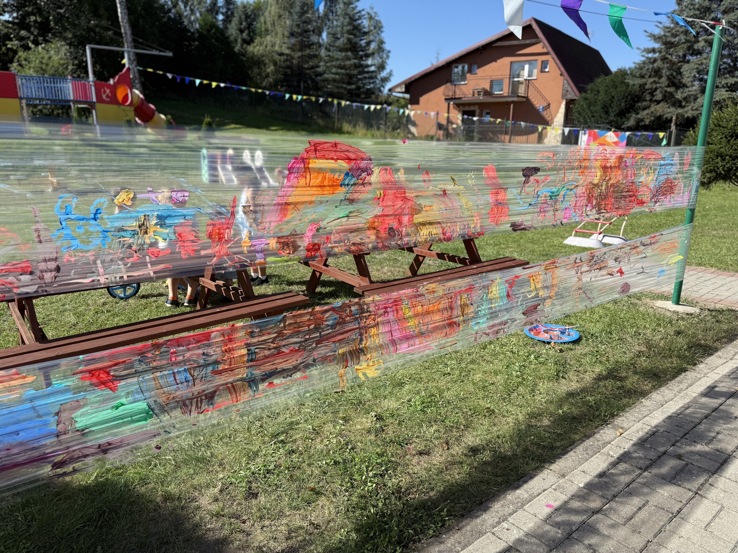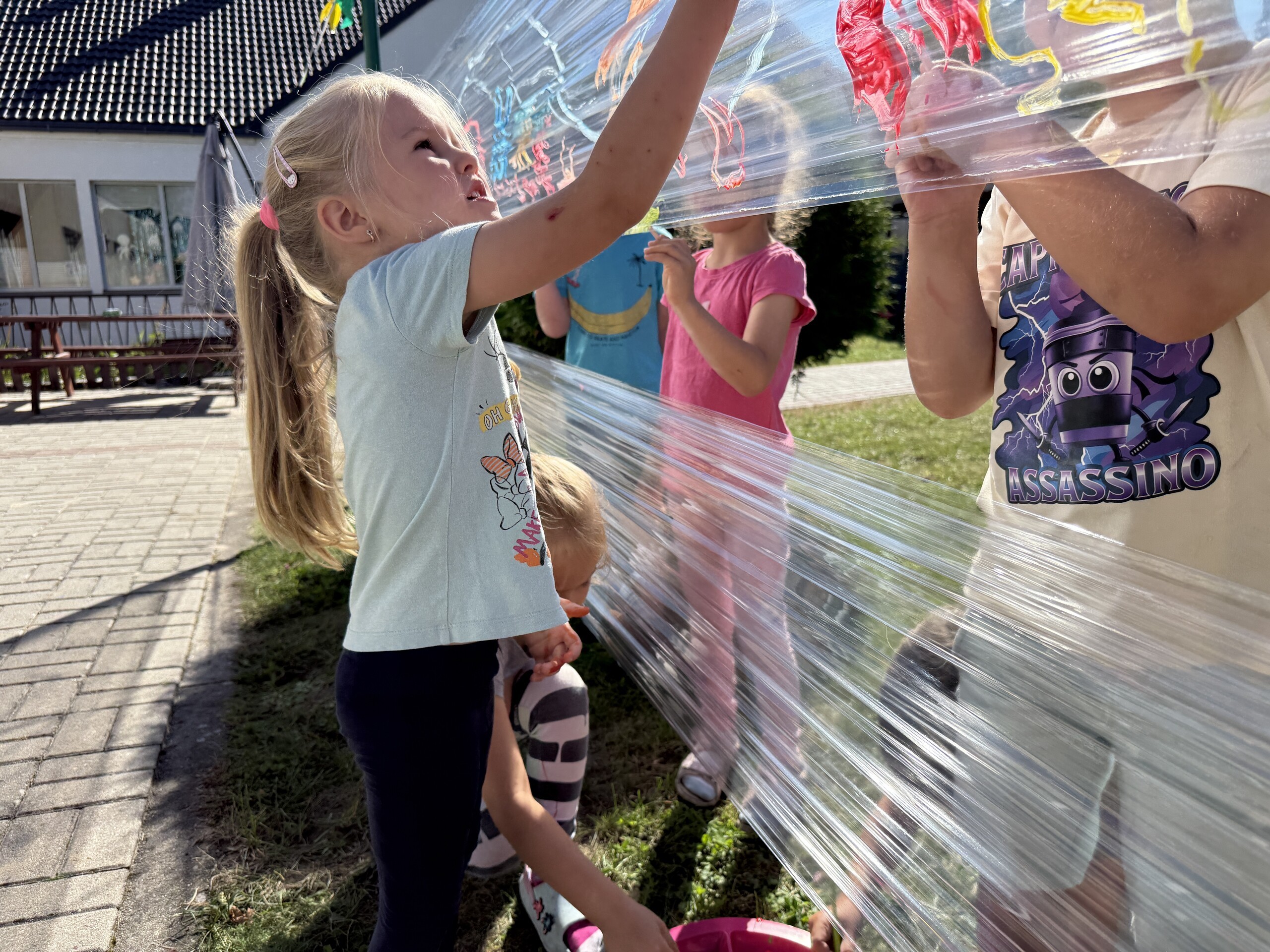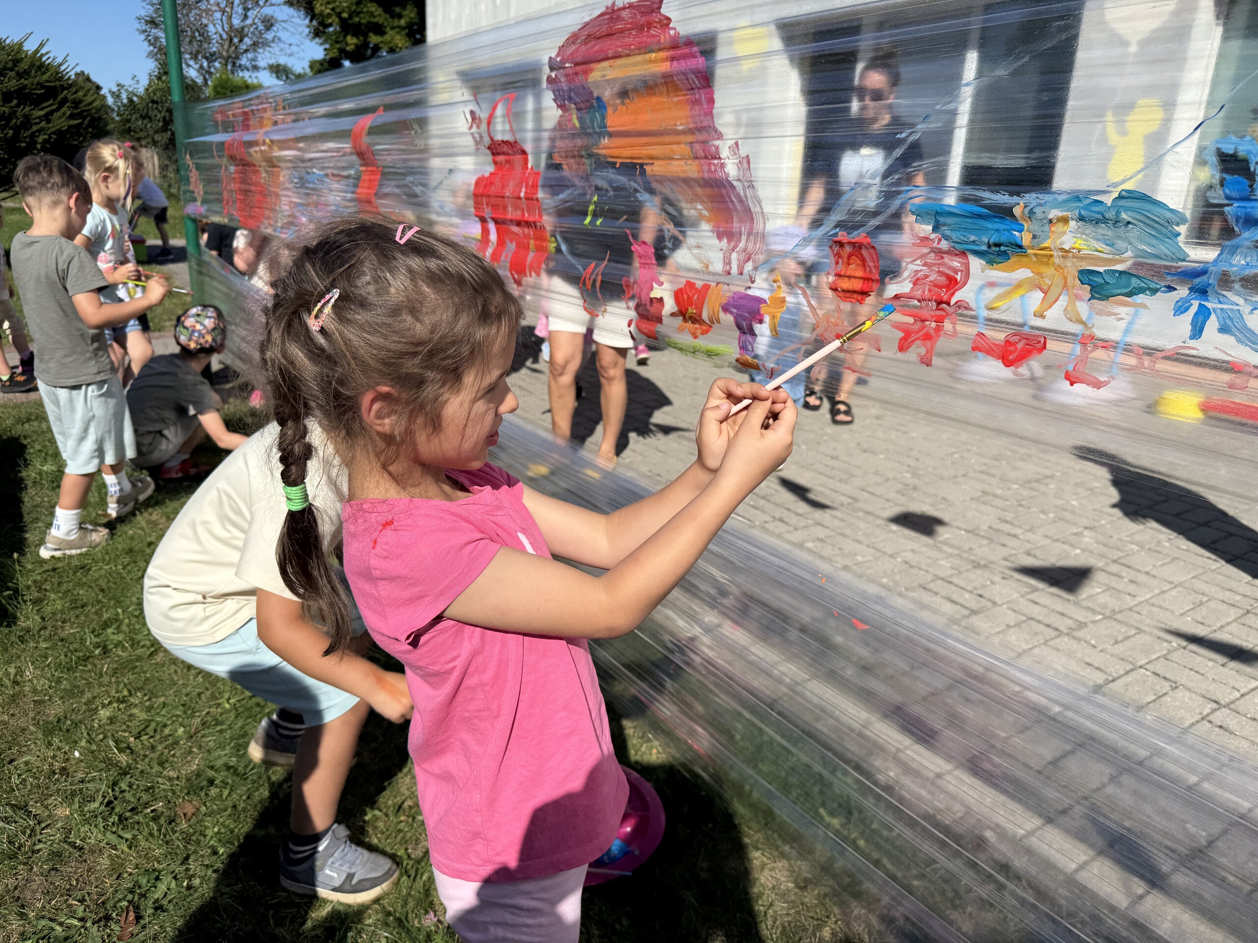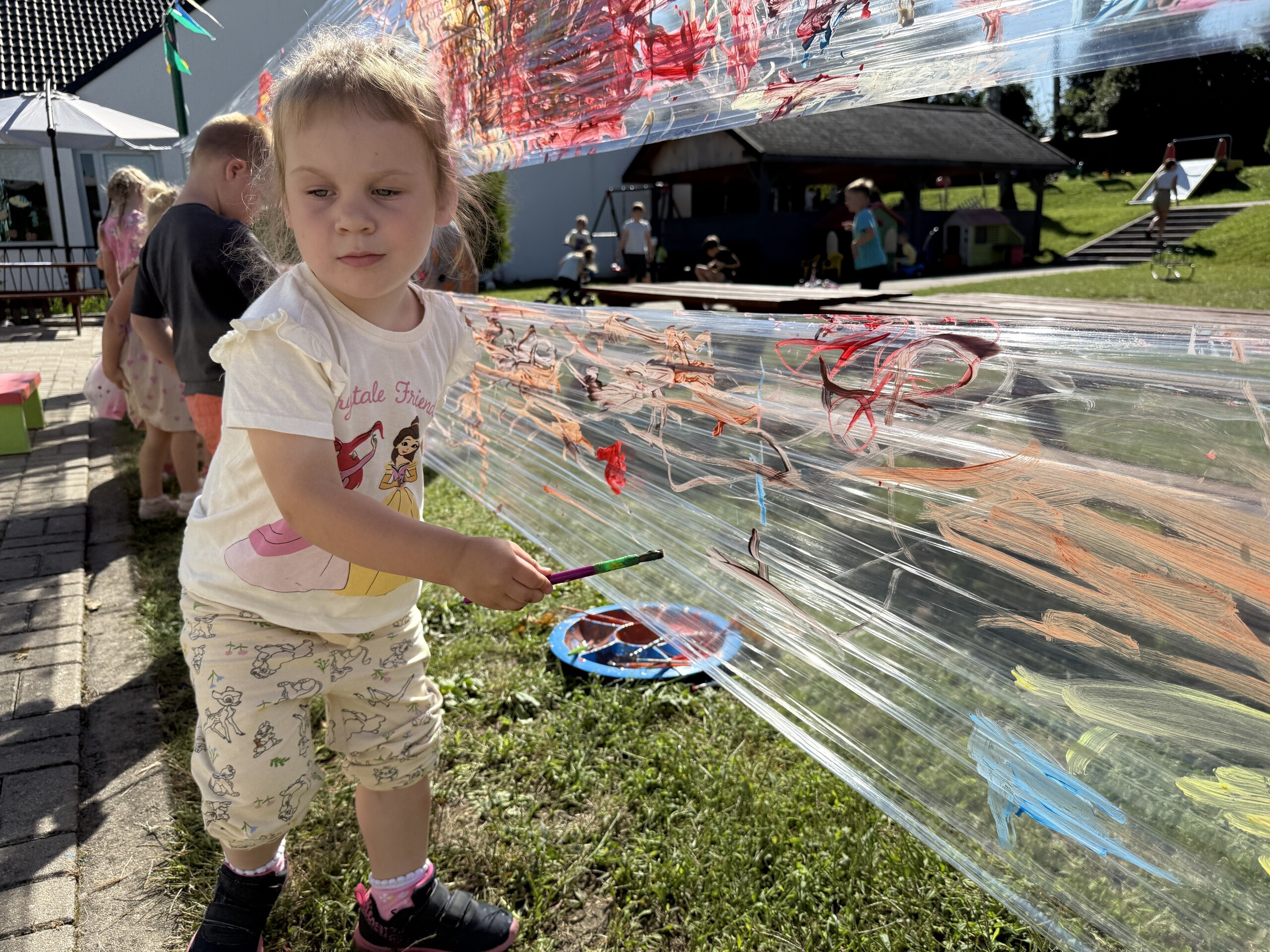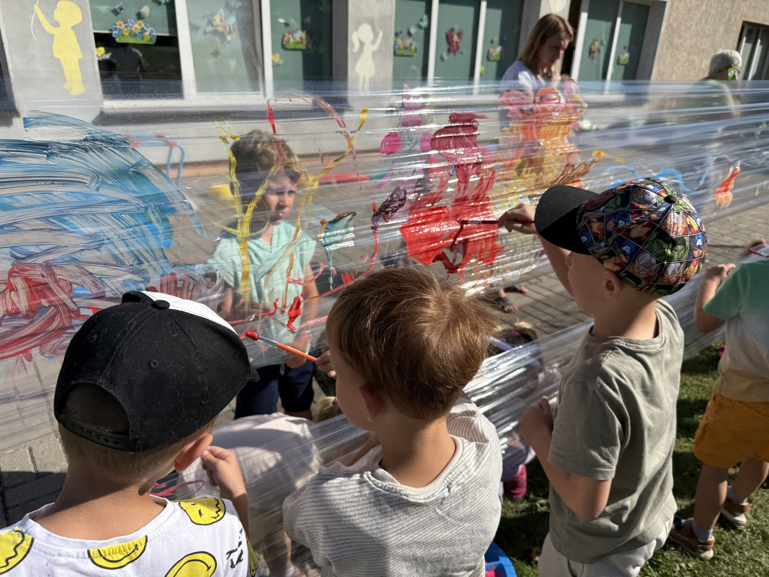 Wykorzystując piękną, słoneczną pogodę, nasze przedszkolaki wzięły udział w wyjątkowych zajęciach plastycznych na świeżym powietrzu. Dzieci malowały farbami na folii stretch, dużym kartonie oraz kartkach tworząc kolorowe letnie krajobrazy i własne artystyczne wizje.