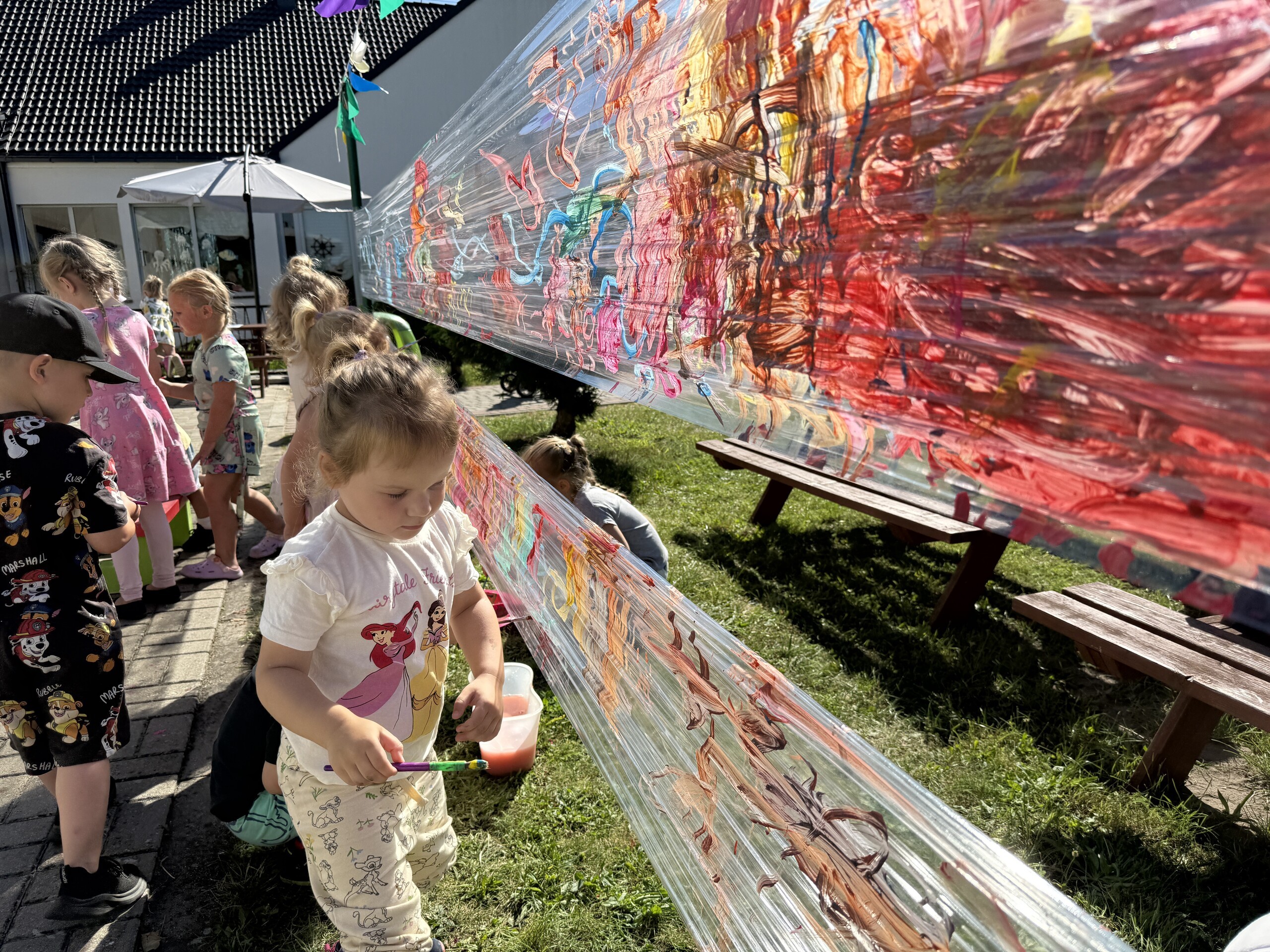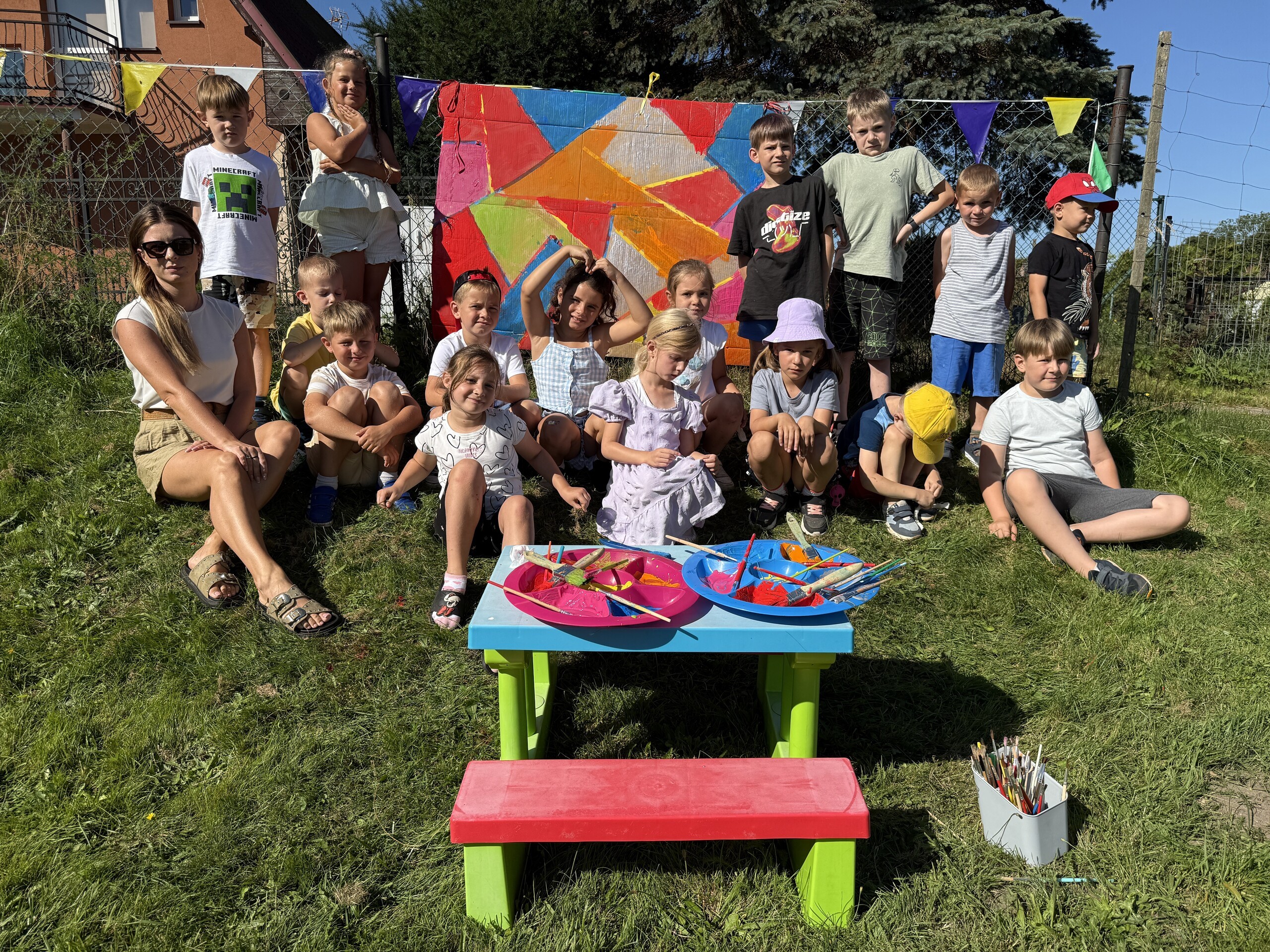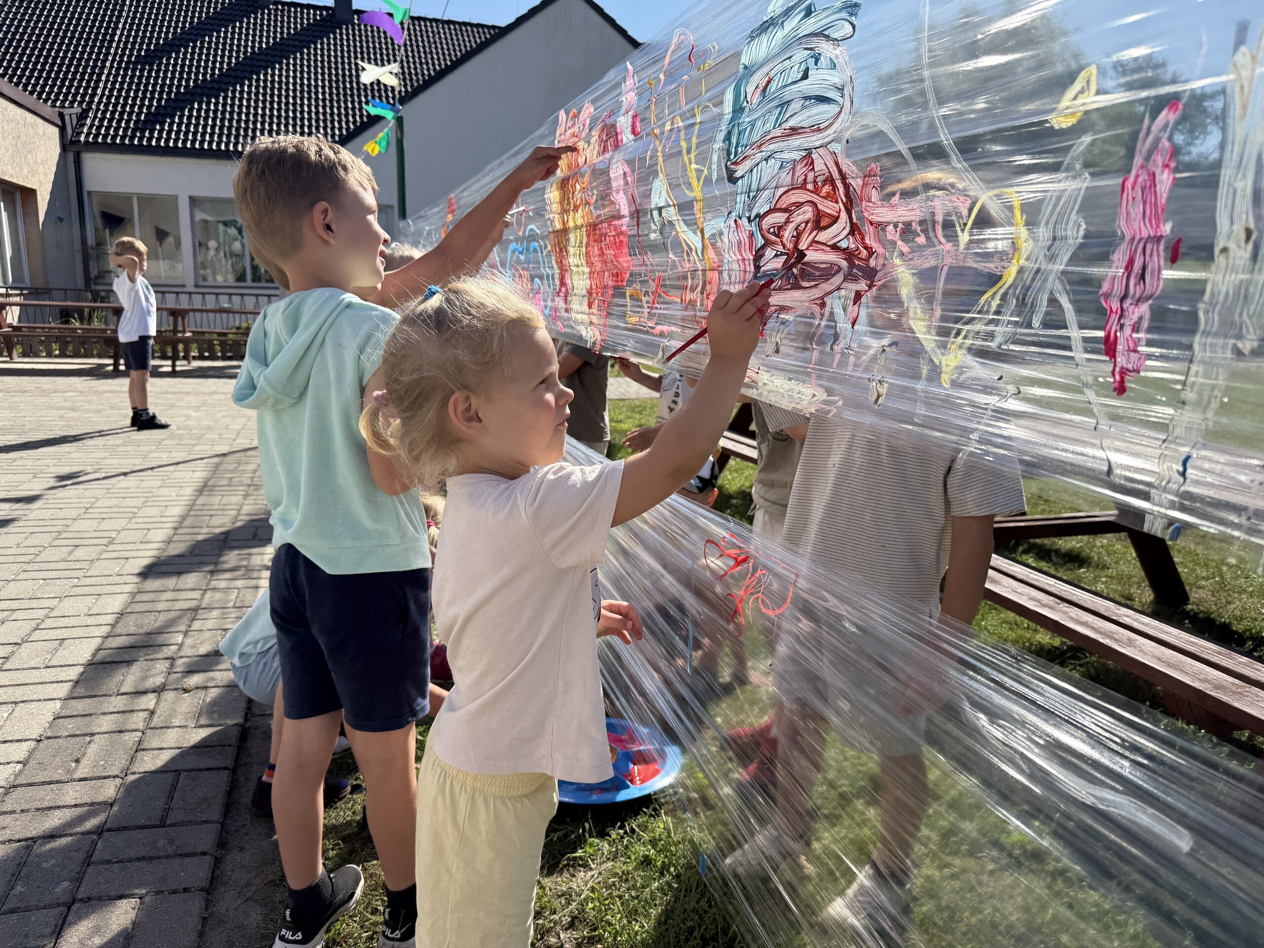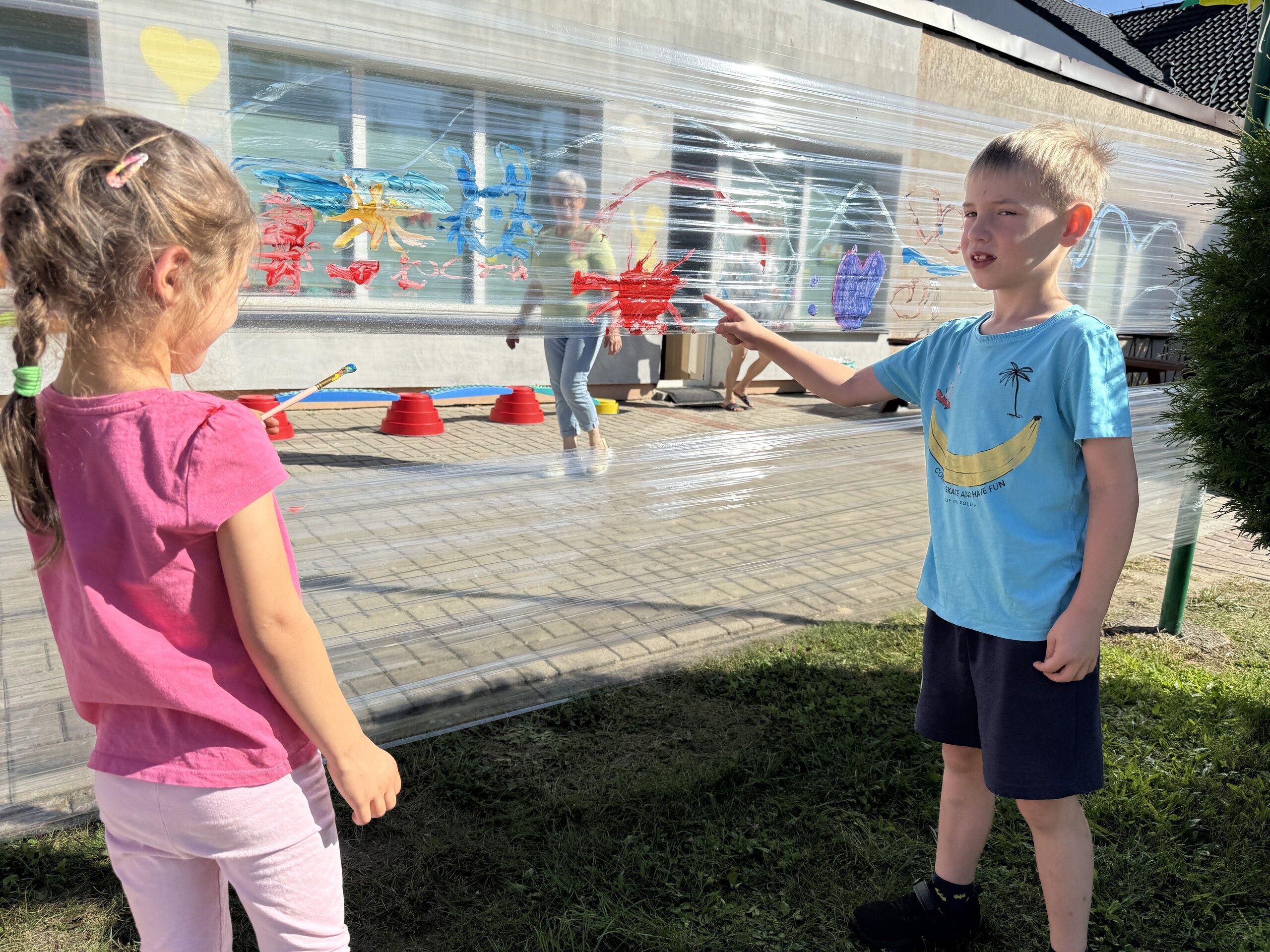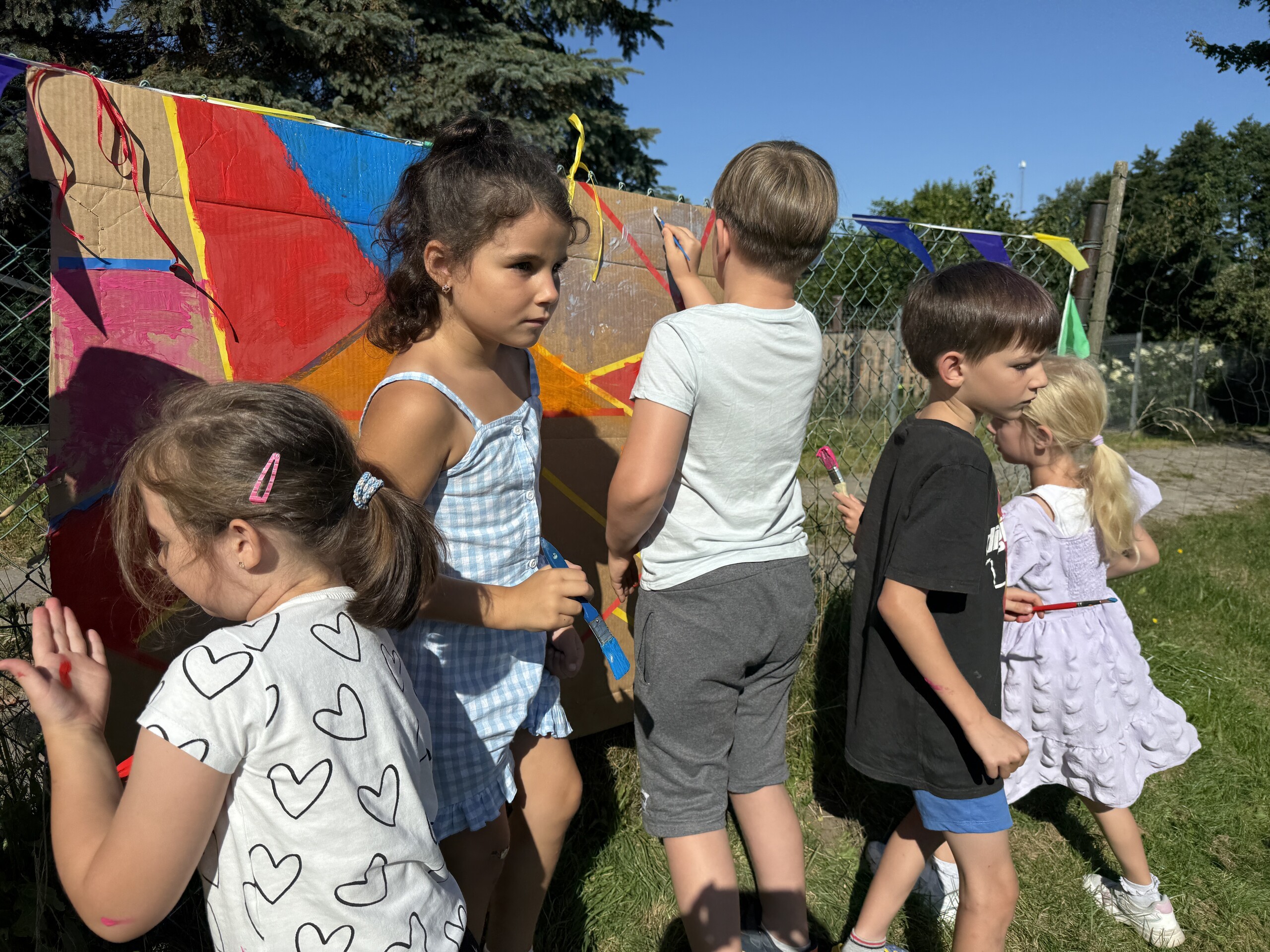 Wykorzystując piękną, słoneczną pogodę, nasze przedszkolaki wzięły udział w wyjątkowych zajęciach plastycznych na świeżym powietrzu. Dzieci malowały farbami na folii stretch, dużym kartonie oraz kartkach tworząc kolorowe letnie krajobrazy i własne artystyczne wizje.
