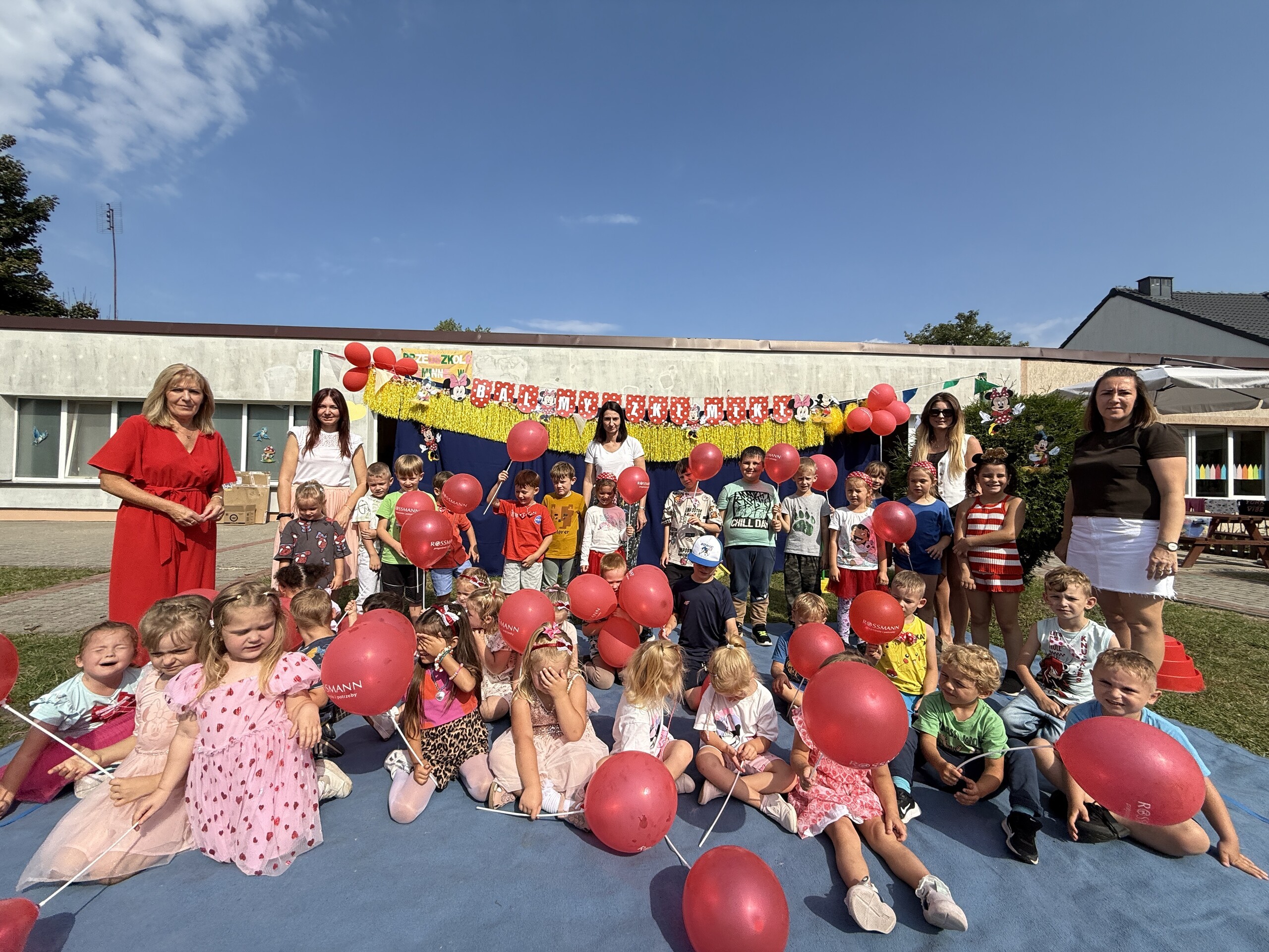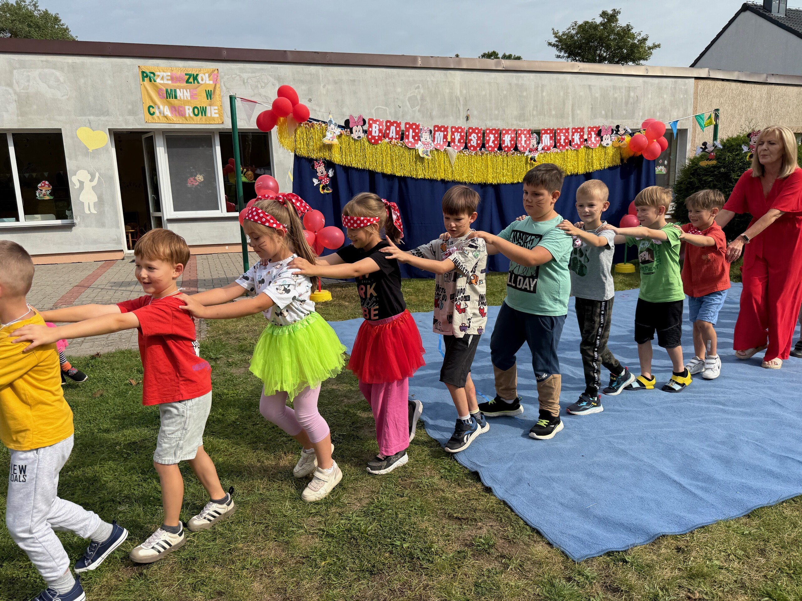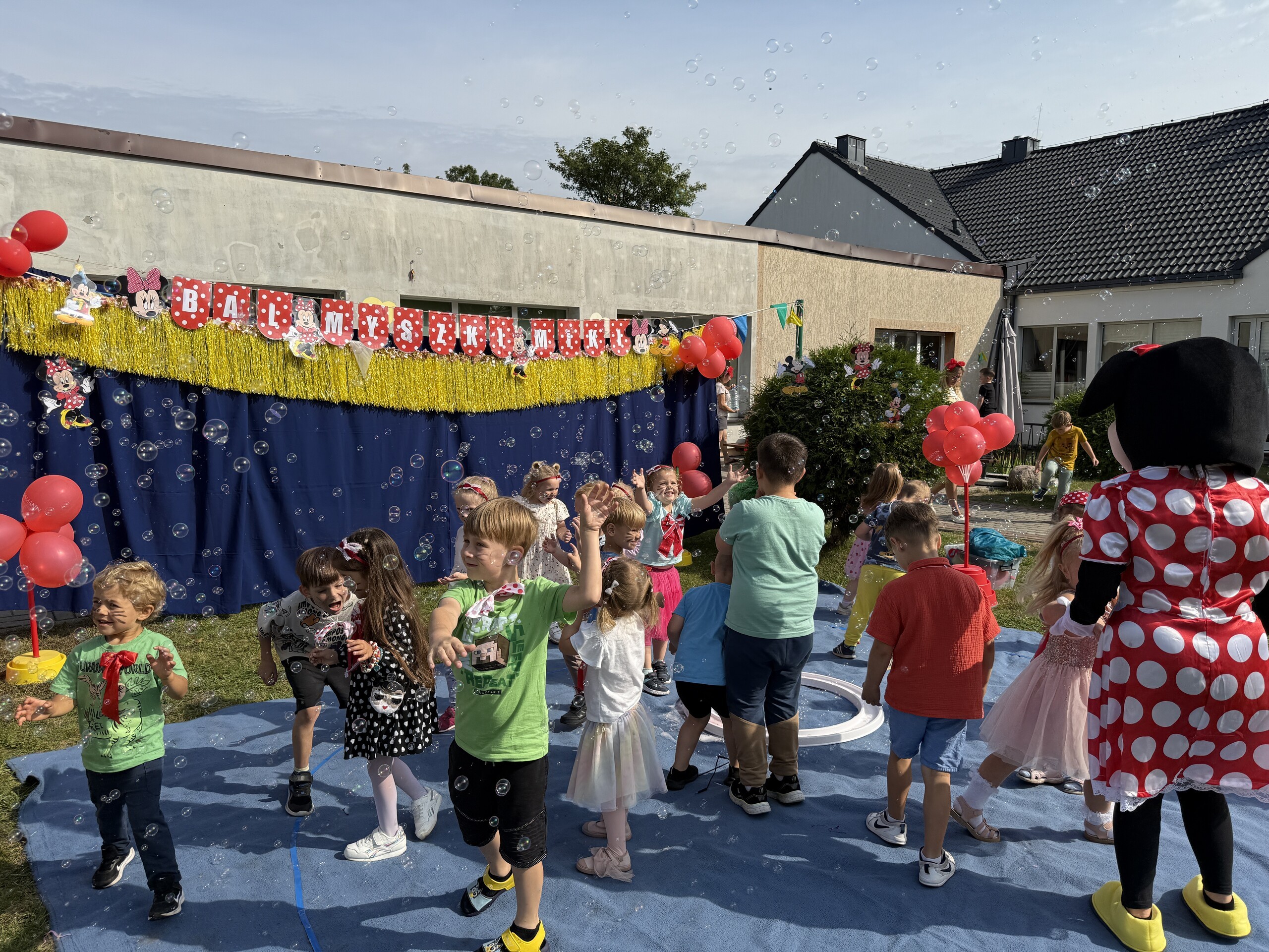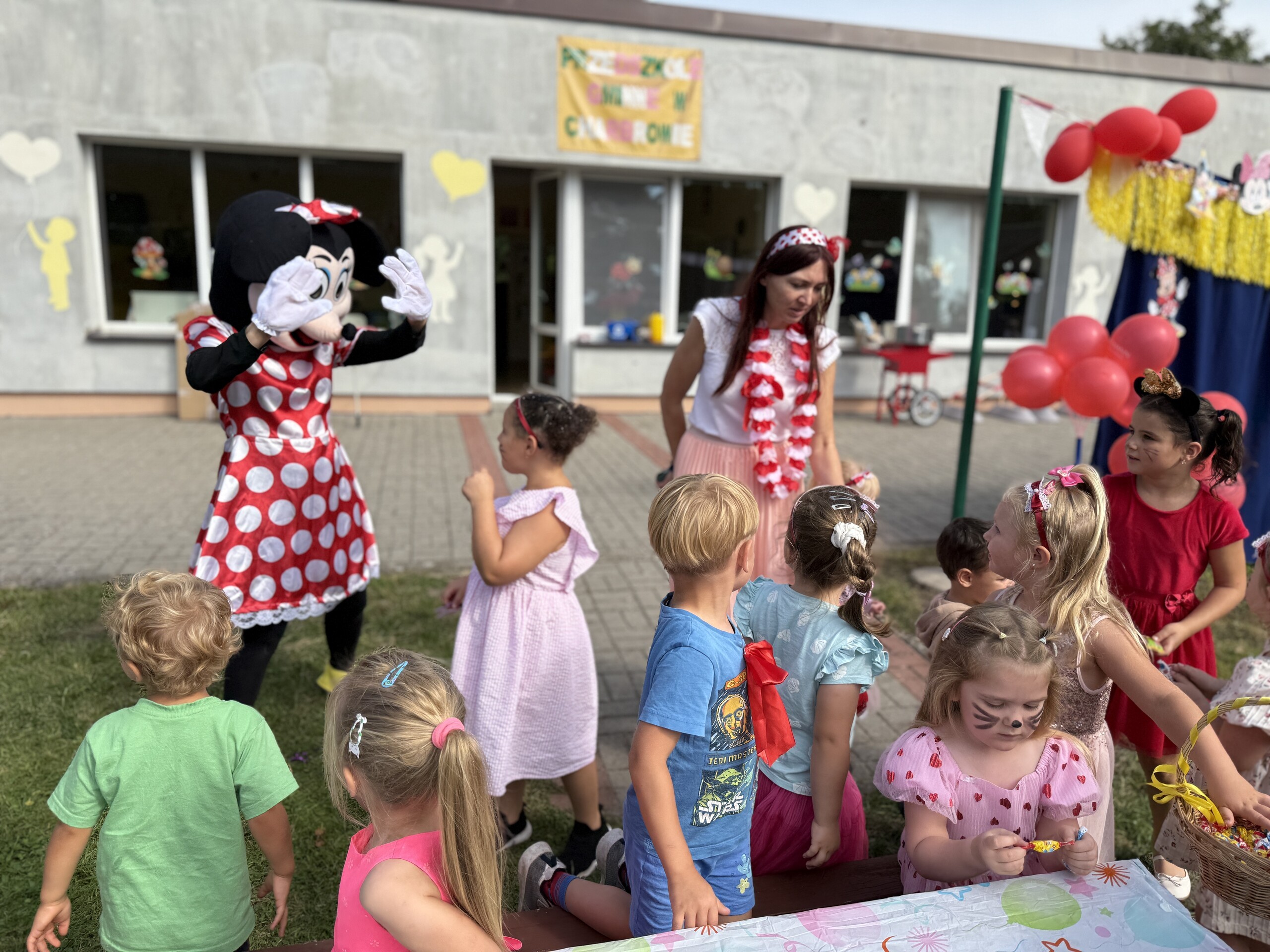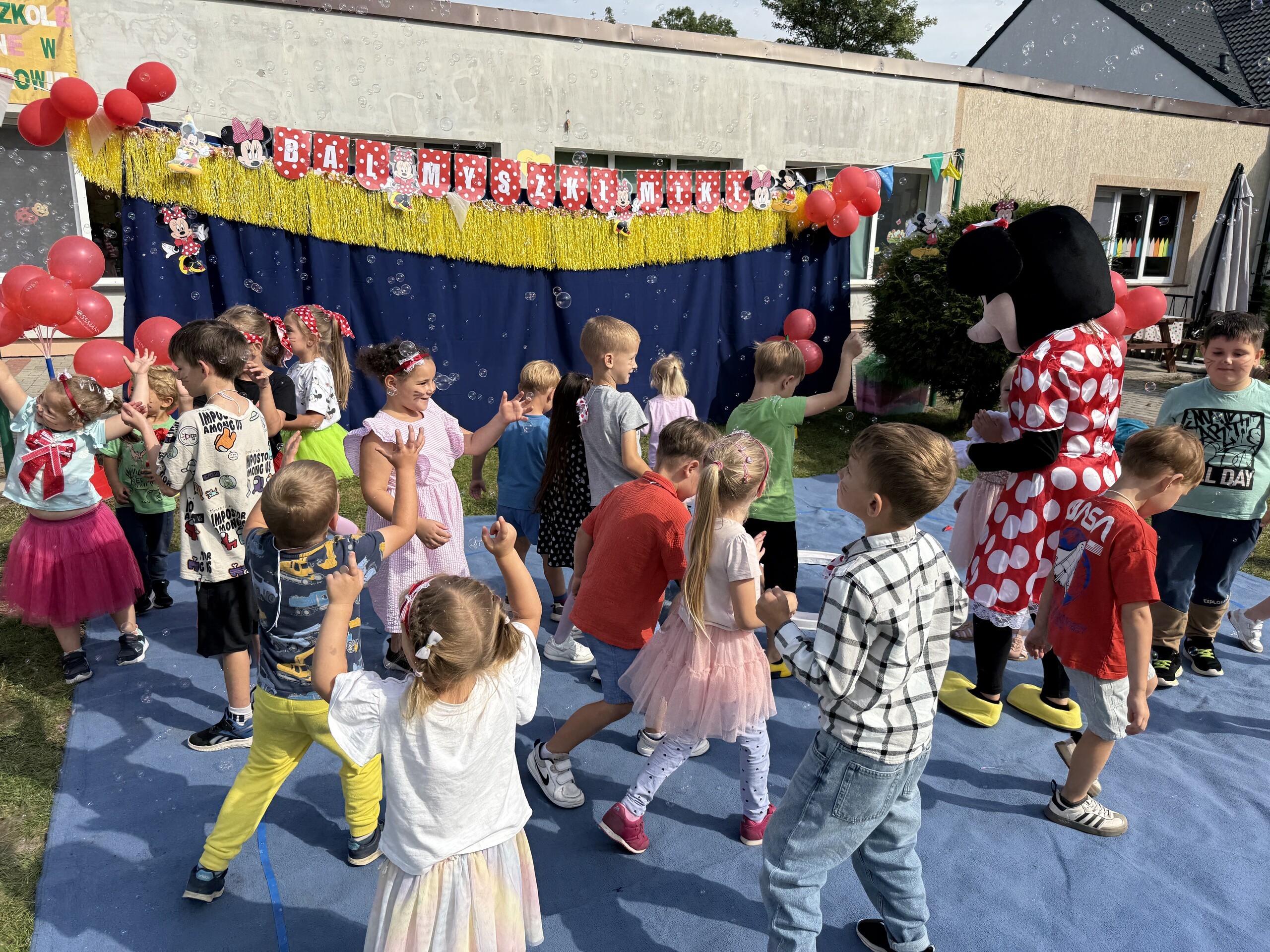 Dzisiaj w naszym przedszkolu na zakończenie wakacyjnych zajęć odbył się Balik z Myszka Miki! Wspólnie z nią tańczyliśmy, śpiewaliśmy i uczestniczyliśmy w balu. Dzieci miały okazję brać udział w różnych zabawach, takich jak układanie puzzli razem z Myszką Miki, a także wspólne rysowanie i malowanie. Otrzymały baloniki, które były kolorowe i wesołe, co dodatkowo umiliło nam czas.