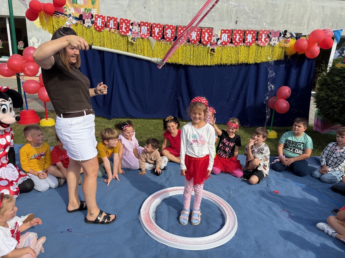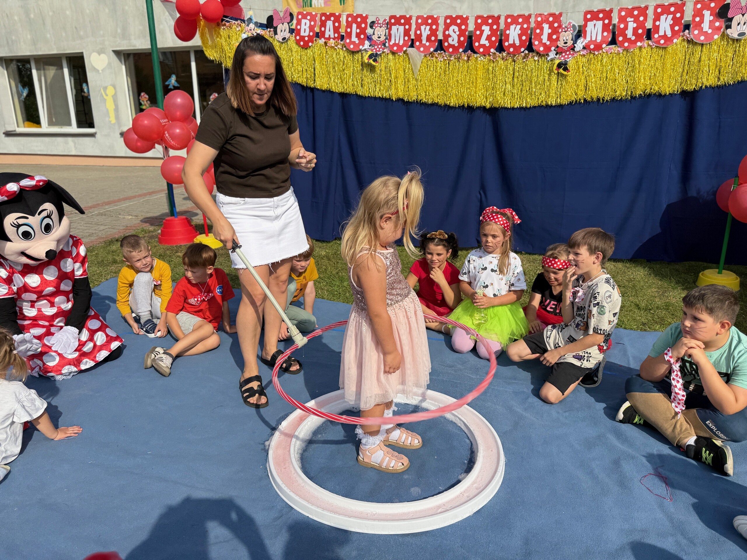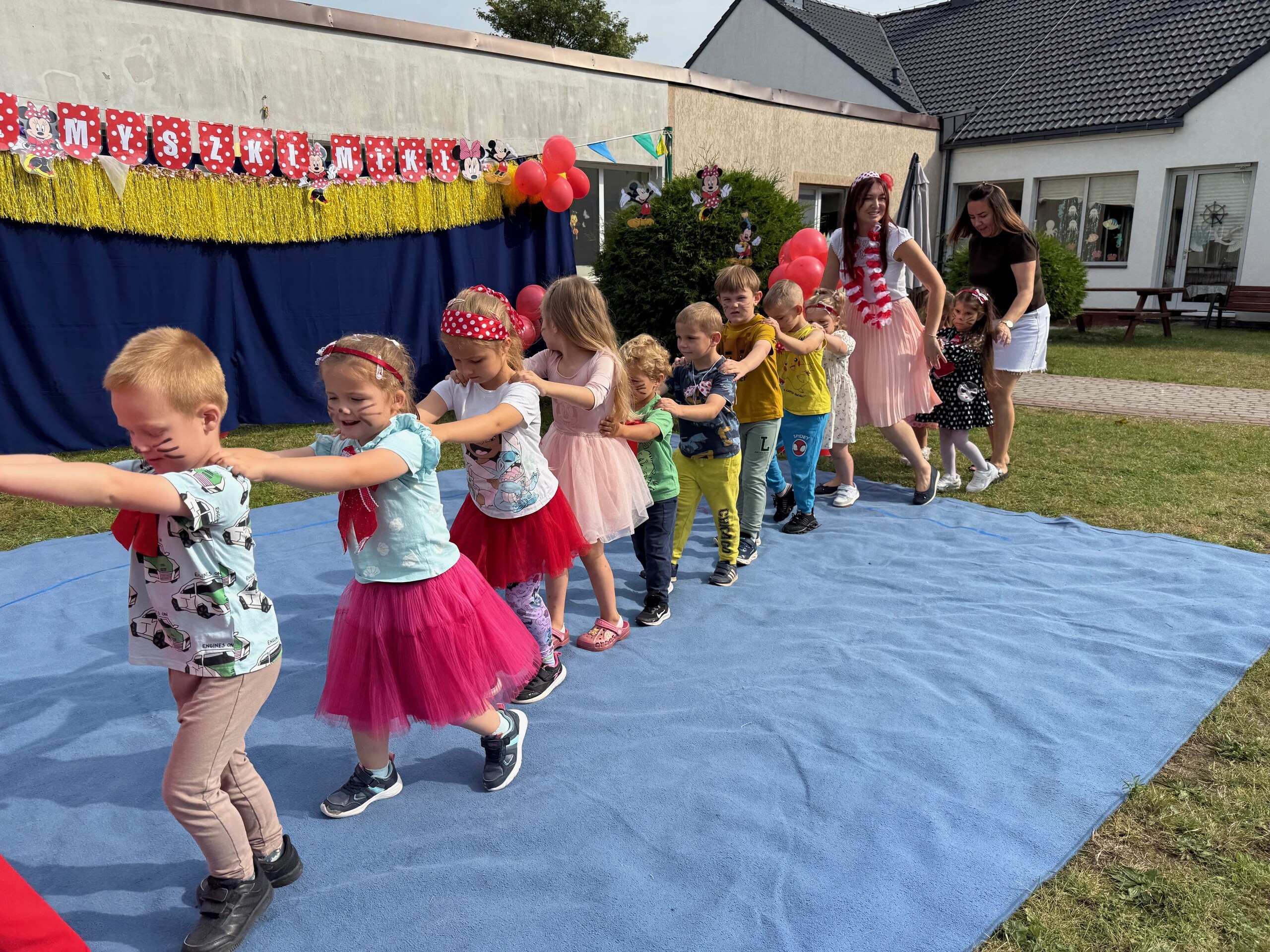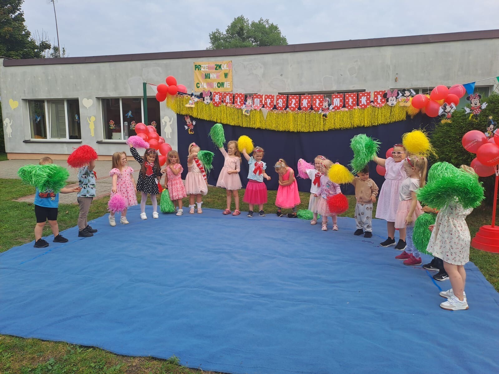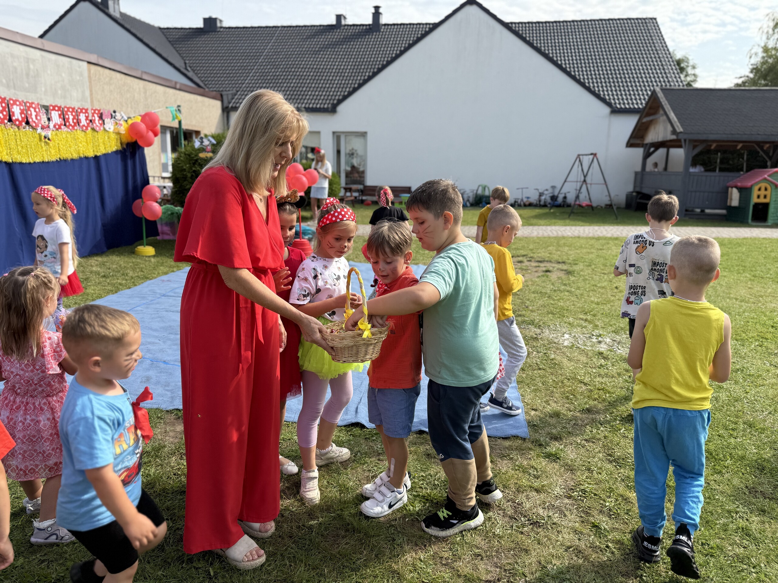 Dzisiaj w naszym przedszkolu na zakończenie wakacyjnych zajęć odbył się Balik z Myszka Miki! Wspólnie z nią tańczyliśmy, śpiewaliśmy i uczestniczyliśmy w balu. Dzieci miały okazję brać udział w różnych zabawach, takich jak układanie puzzli razem z Myszką Miki, a także wspólne rysowanie i malowanie. Otrzymały baloniki, które były kolorowe i wesołe, co dodatkowo umiliło nam czas.