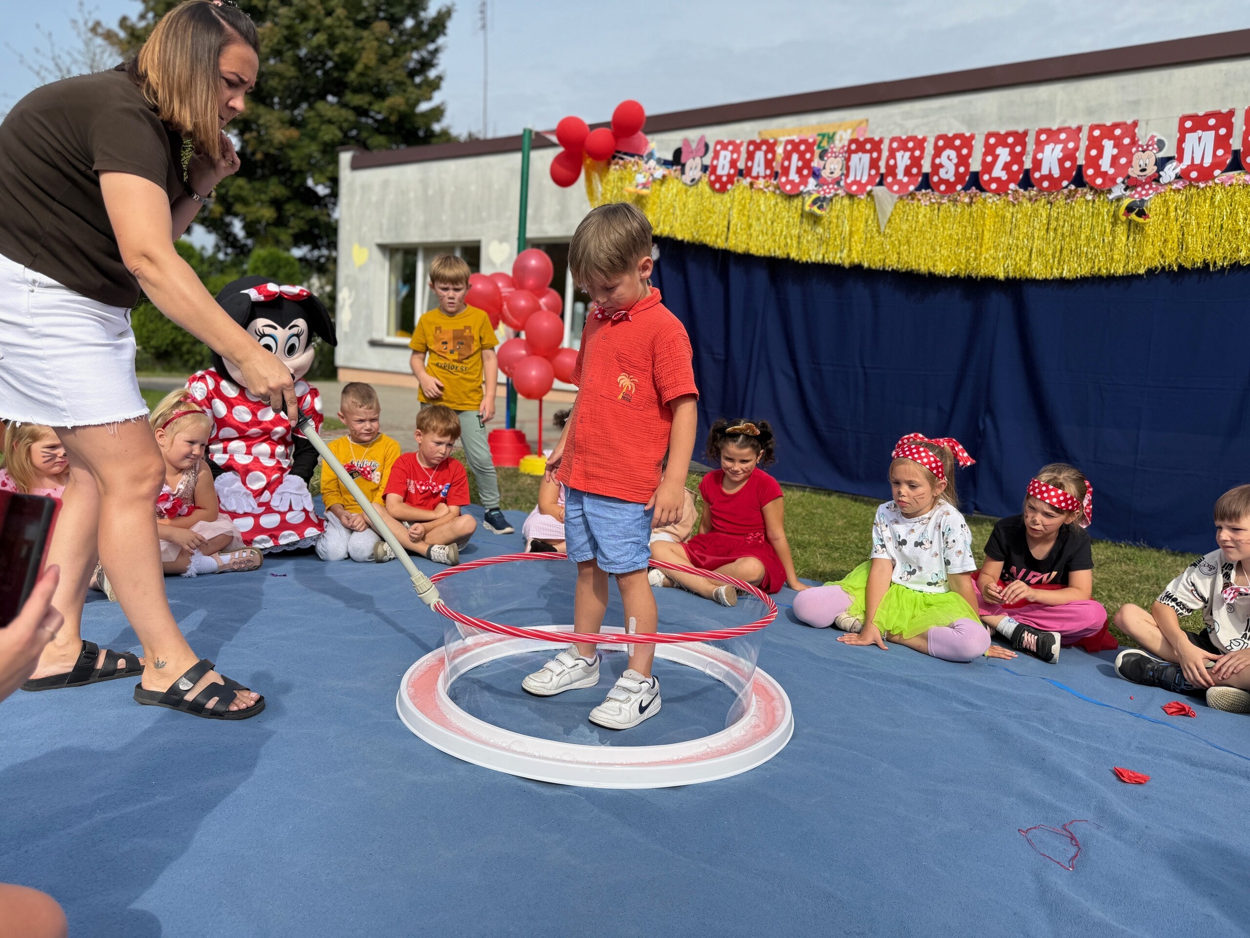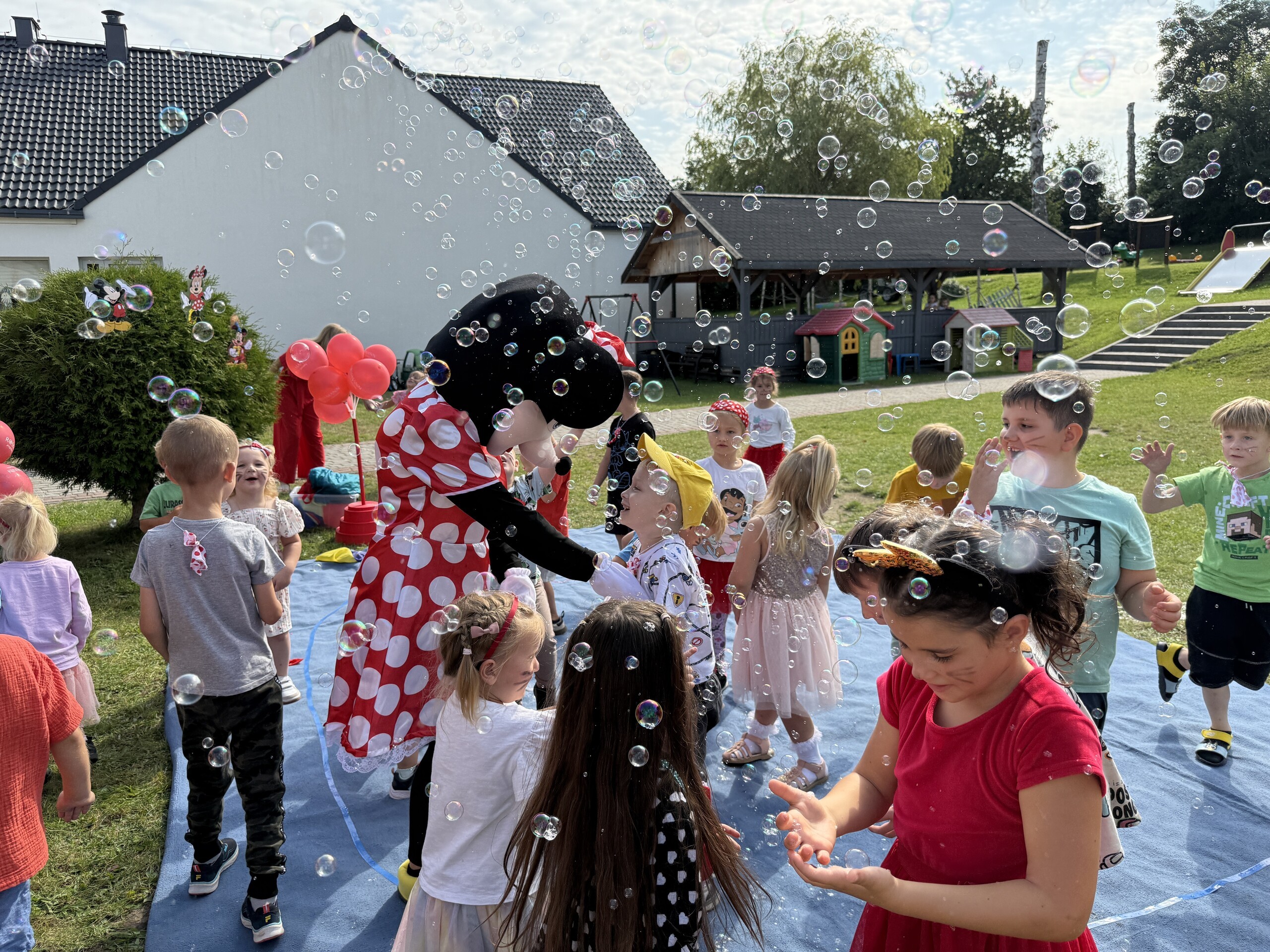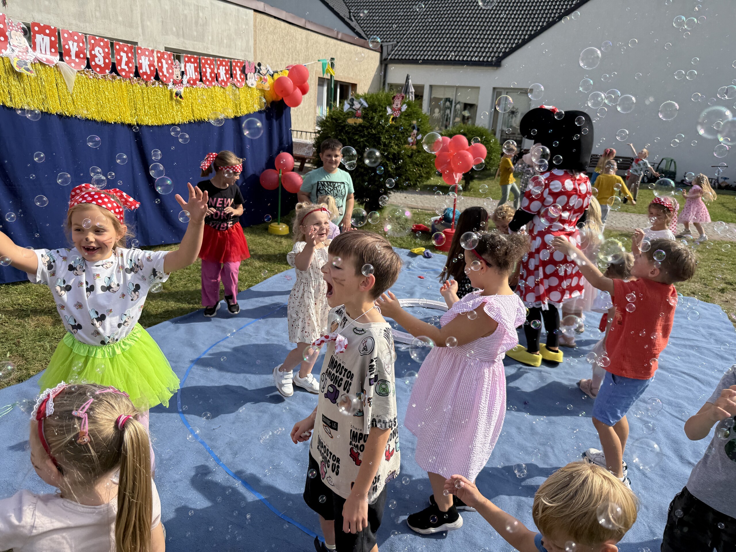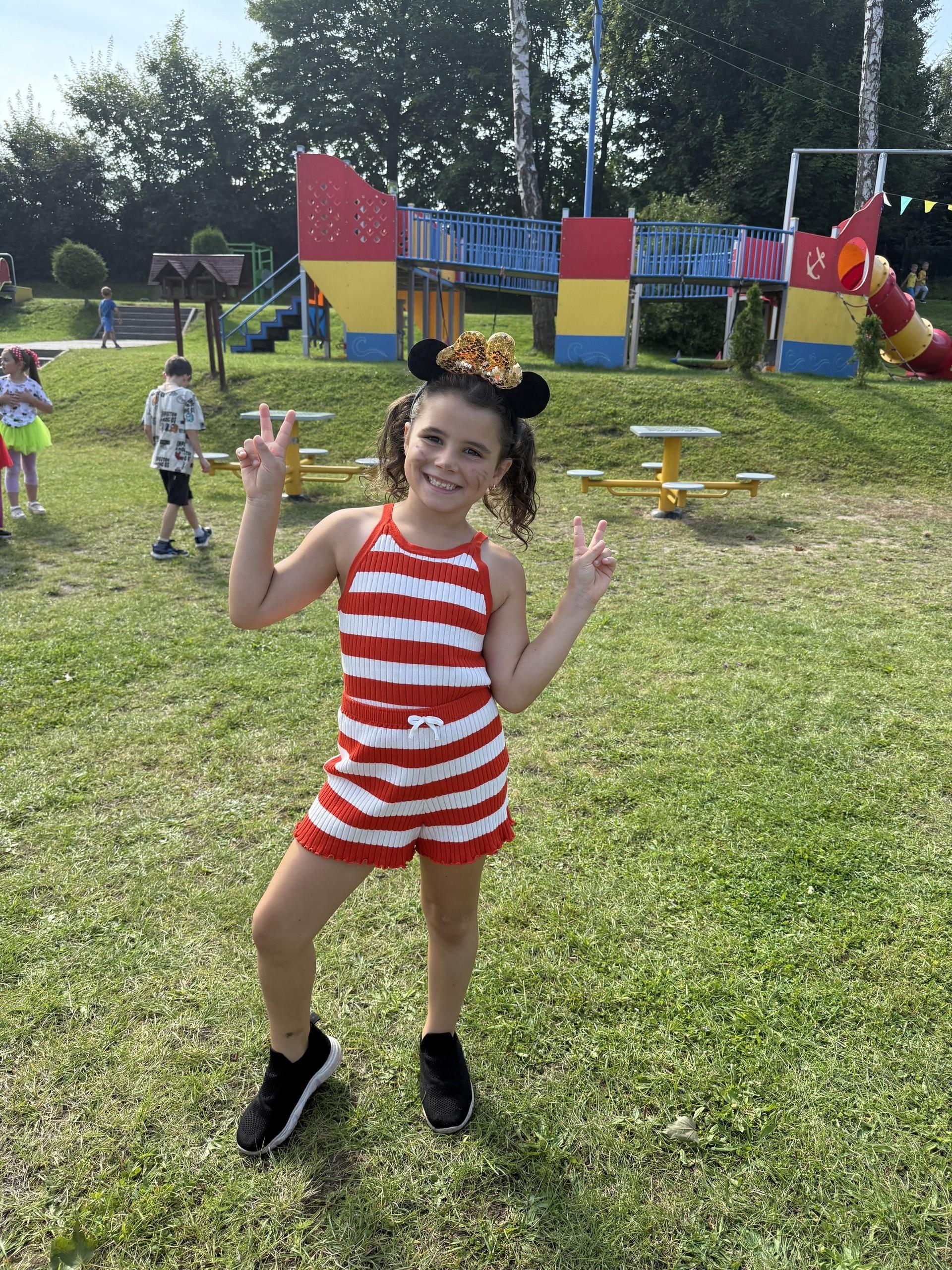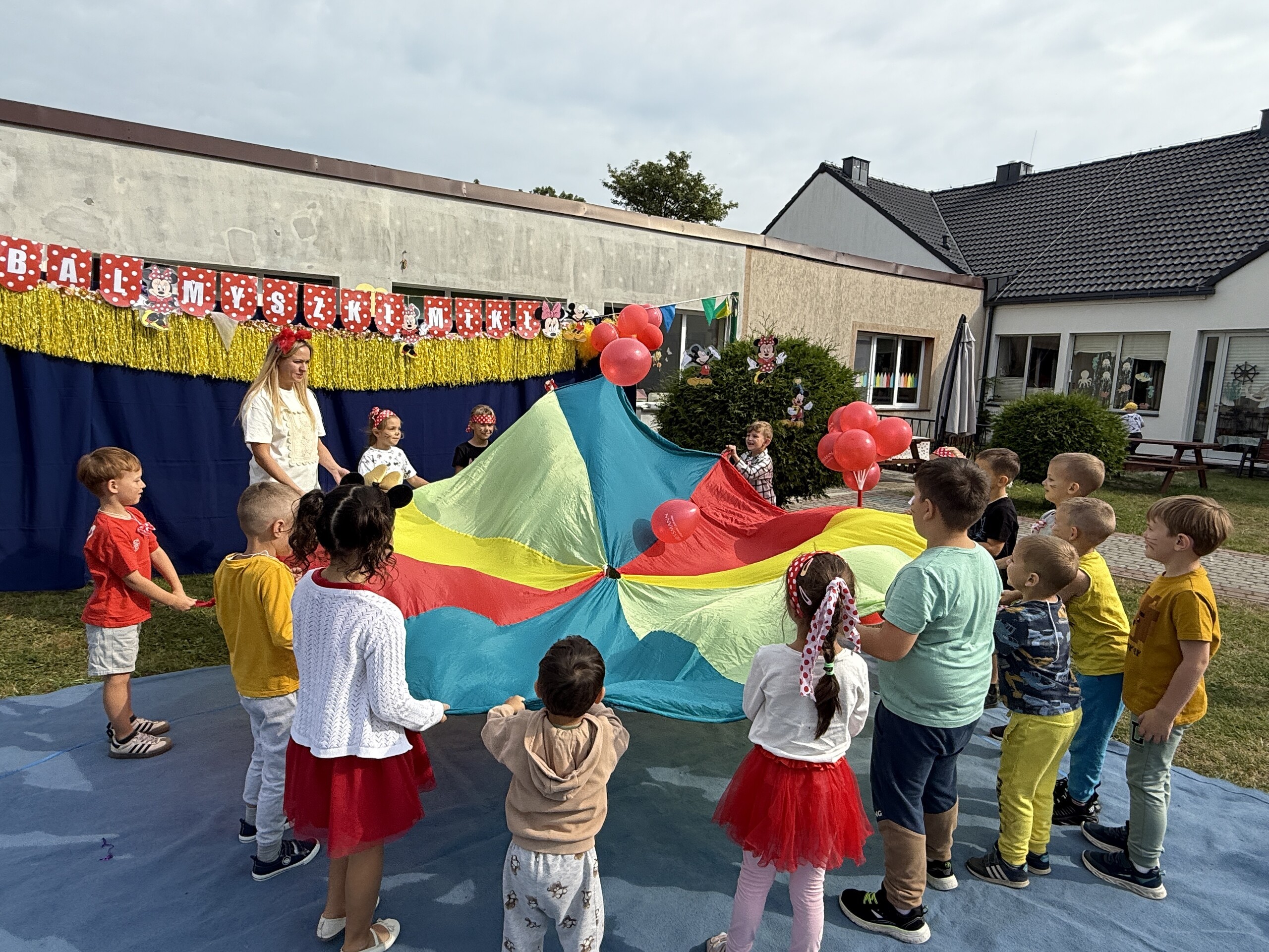 Dzisiaj w naszym przedszkolu na zakończenie wakacyjnych zajęć odbył się Balik z Myszka Miki! Wspólnie z nią tańczyliśmy, śpiewaliśmy i uczestniczyliśmy w balu. Dzieci miały okazję brać udział w różnych zabawach, takich jak układanie puzzli razem z Myszką Miki, a także wspólne rysowanie i malowanie. Otrzymały baloniki, które były kolorowe i wesołe, co dodatkowo umiliło nam czas.