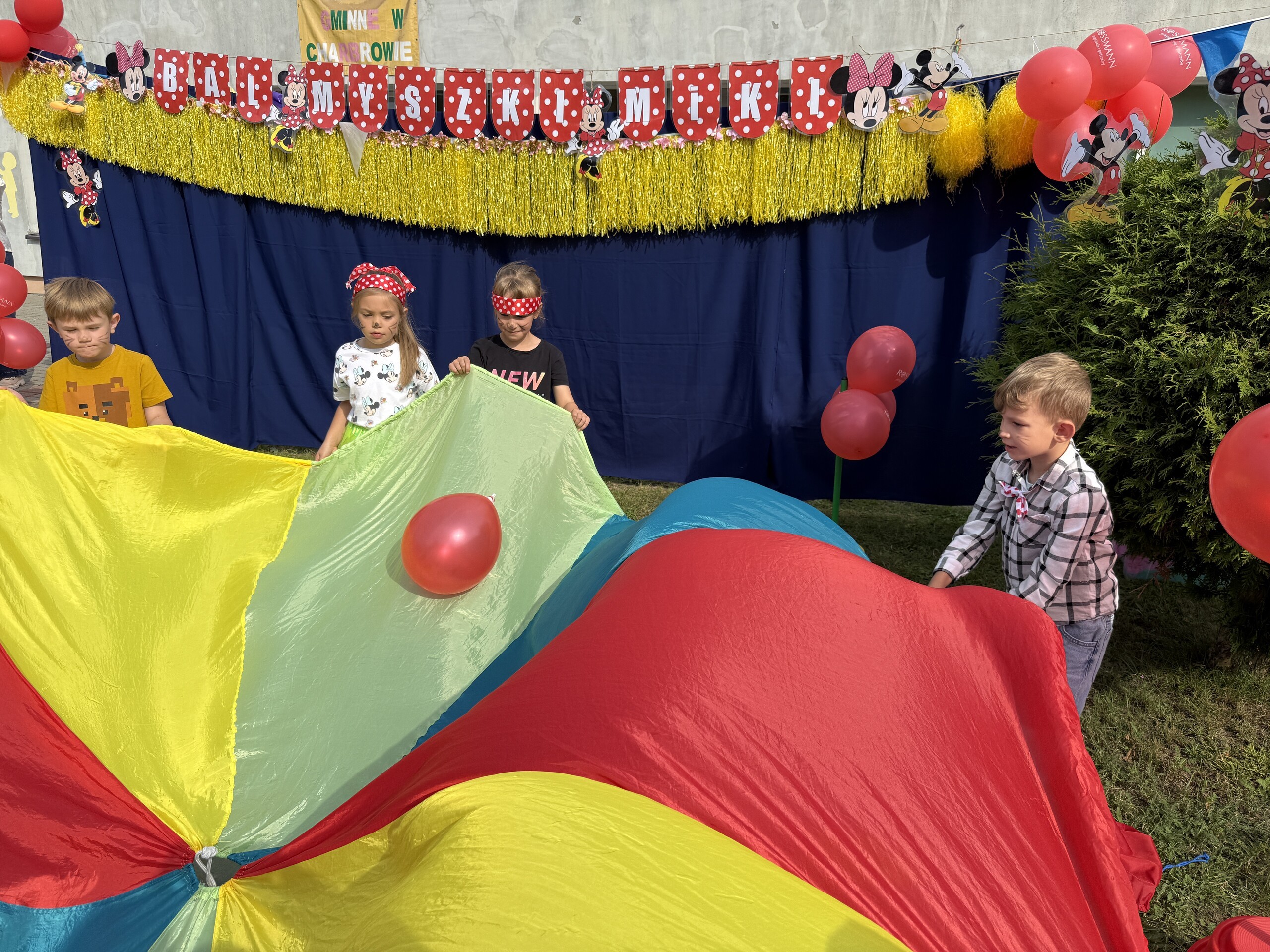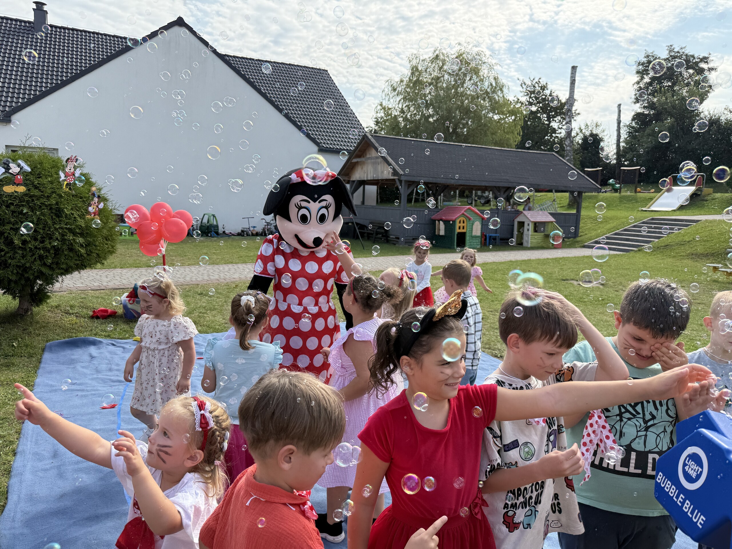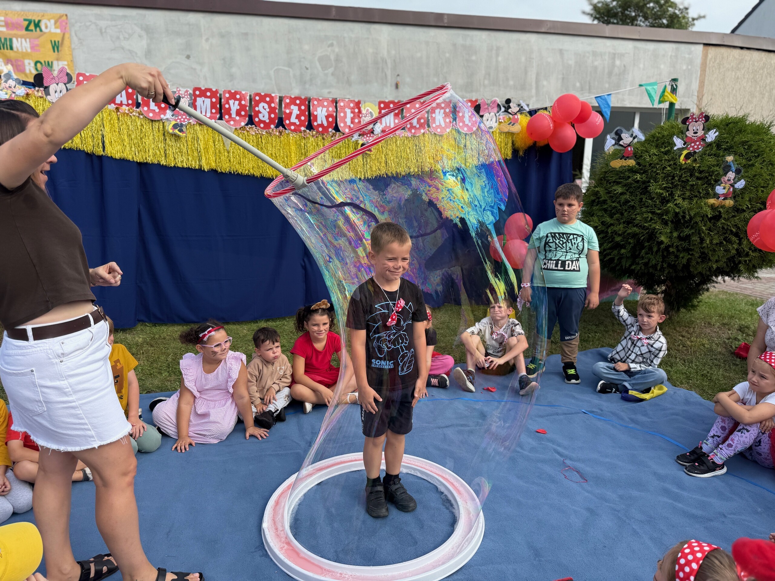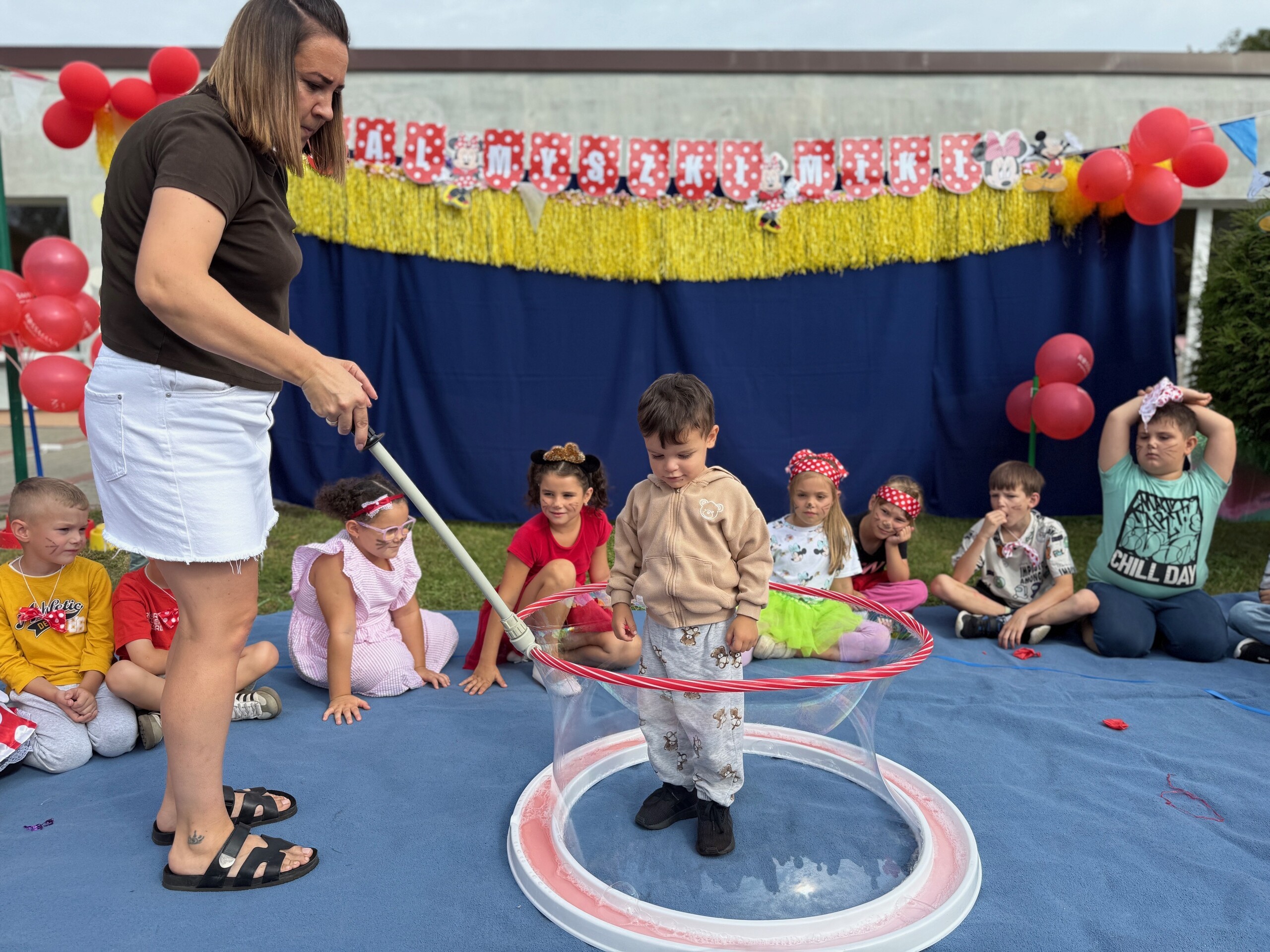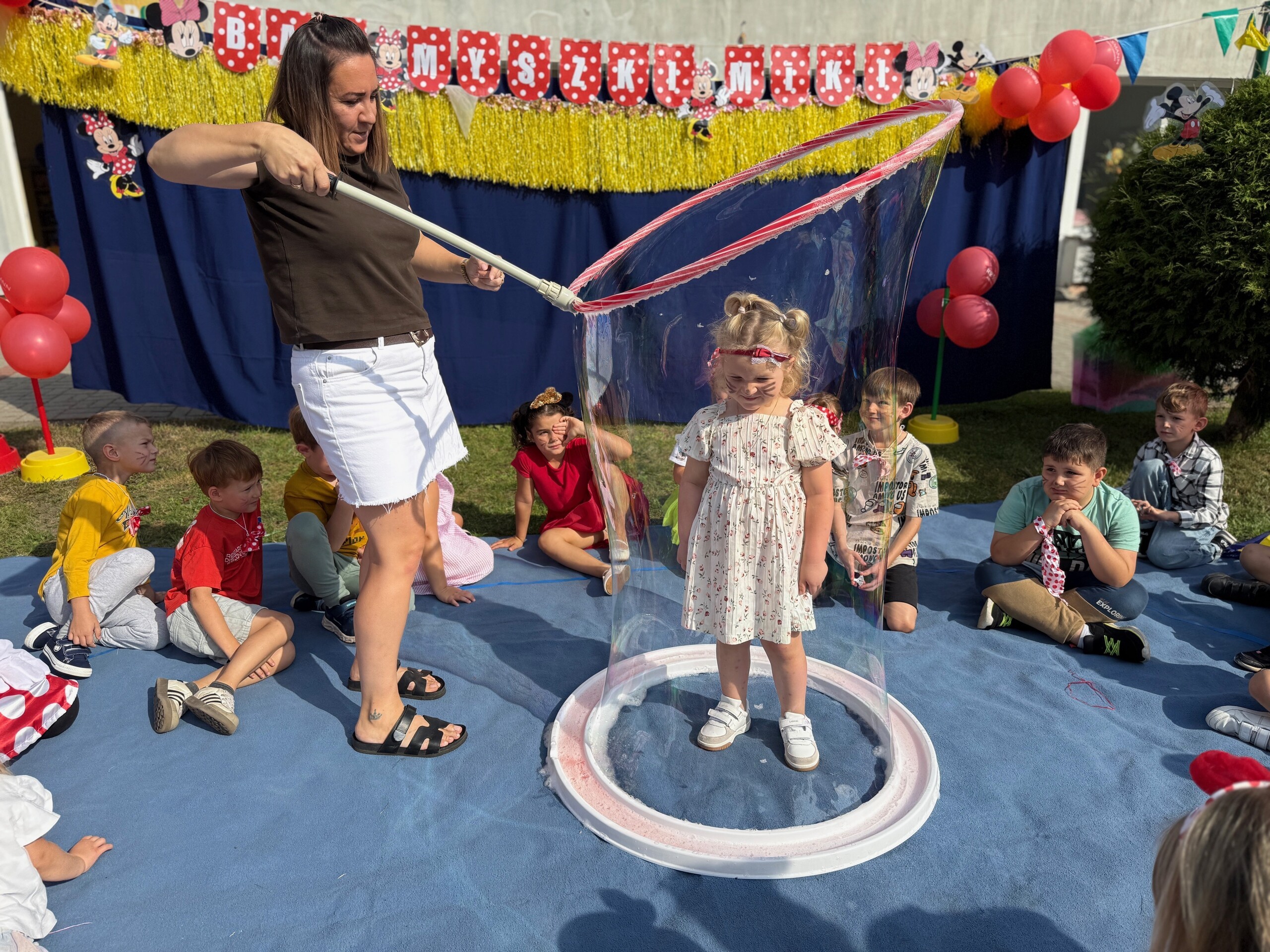 Dzisiaj w naszym przedszkolu na zakończenie wakacyjnych zajęć odbył się Balik z Myszka Miki! Wspólnie z nią tańczyliśmy, śpiewaliśmy i uczestniczyliśmy w balu. Dzieci miały okazję brać udział w różnych zabawach, takich jak układanie puzzli razem z Myszką Miki, a także wspólne rysowanie i malowanie. Otrzymały baloniki, które były kolorowe i wesołe, co dodatkowo umiliło nam czas.