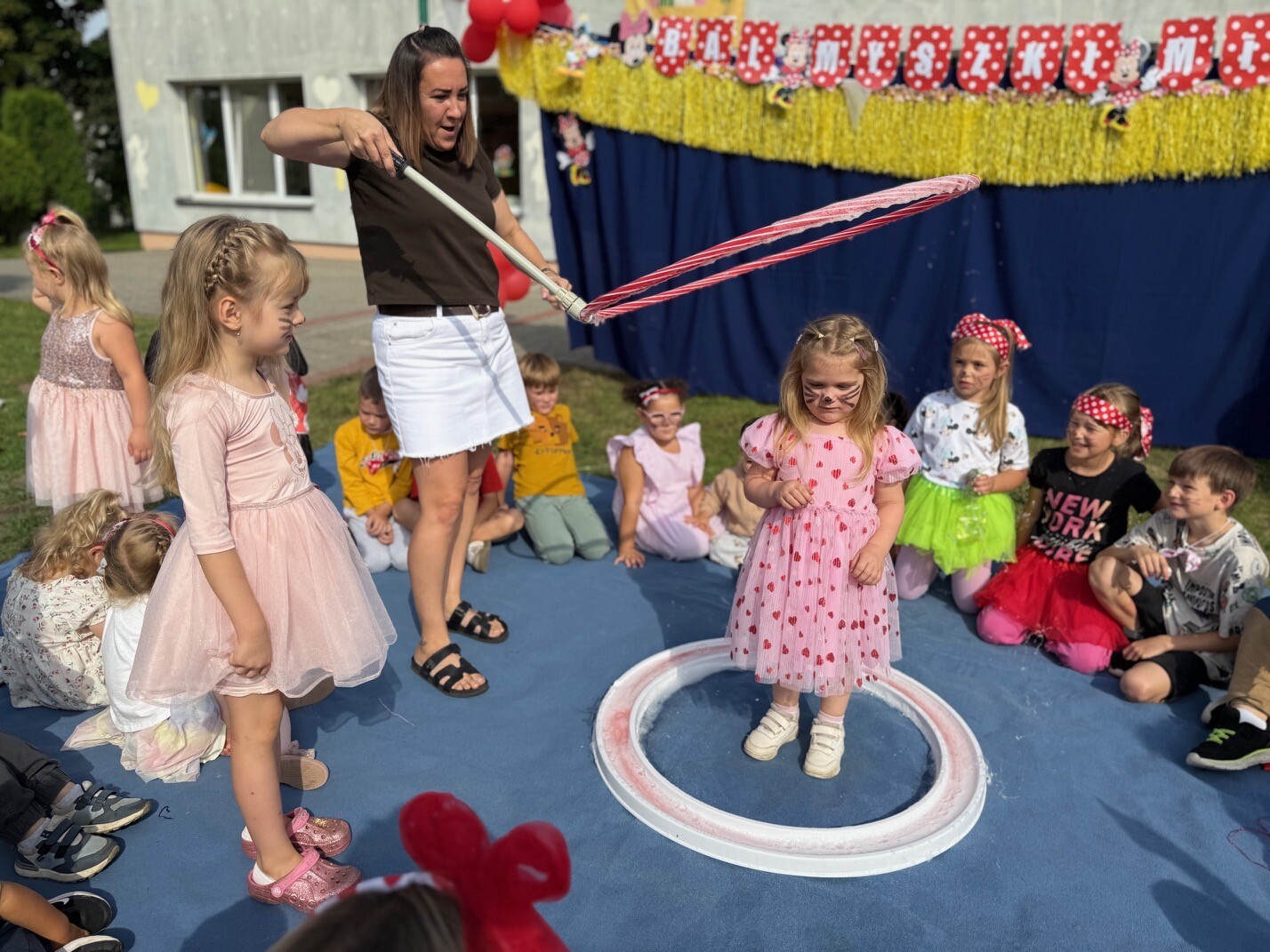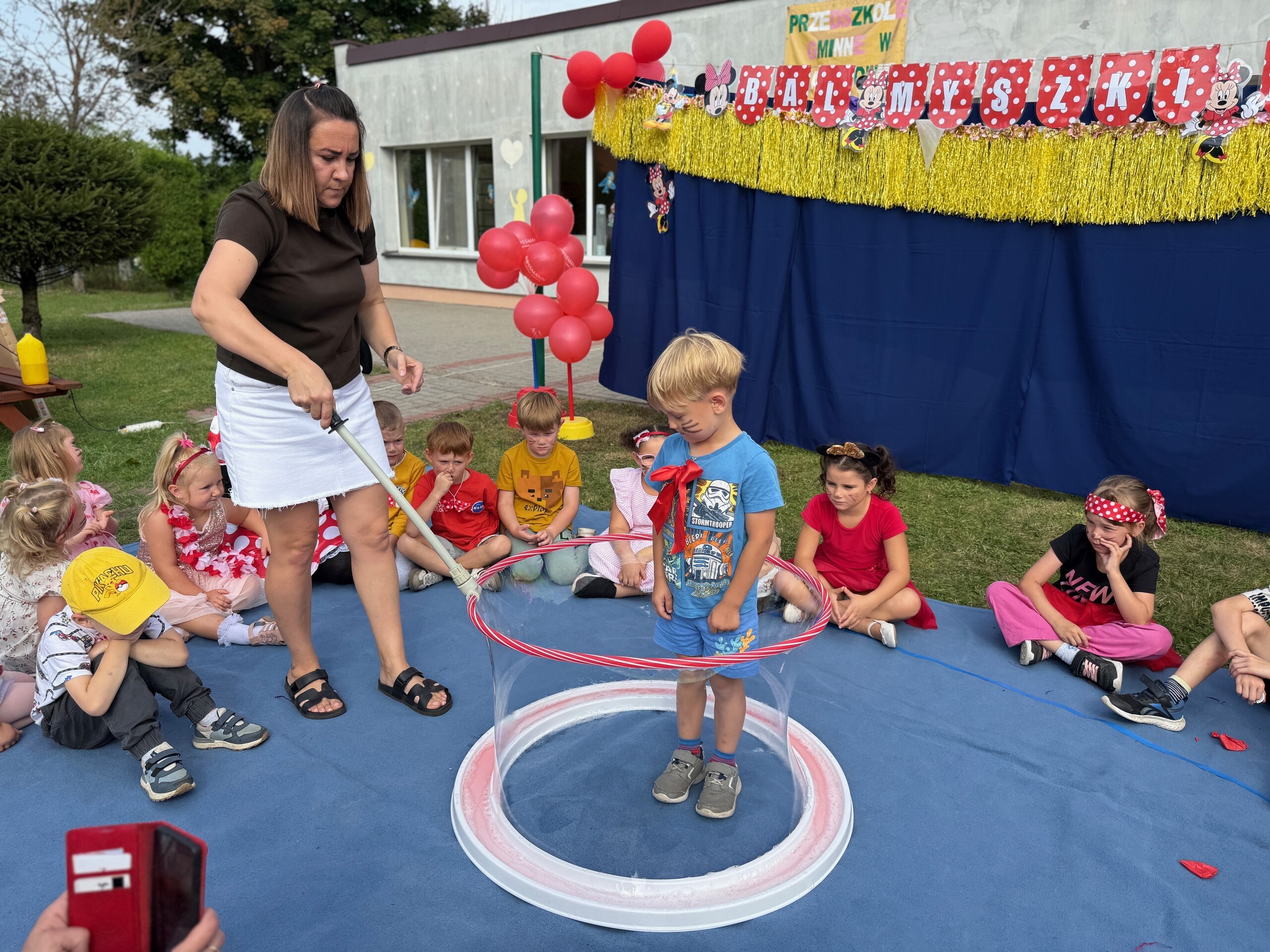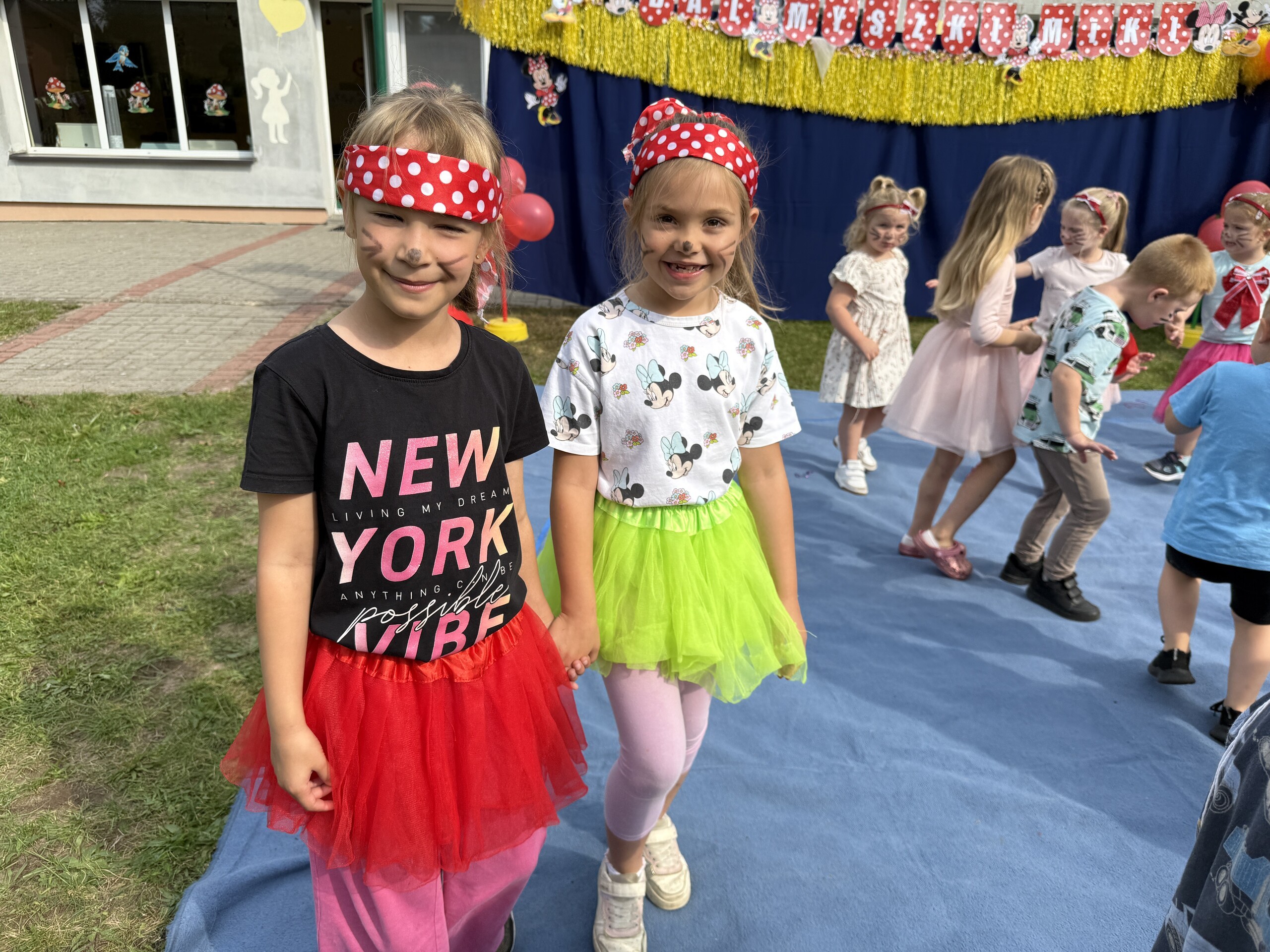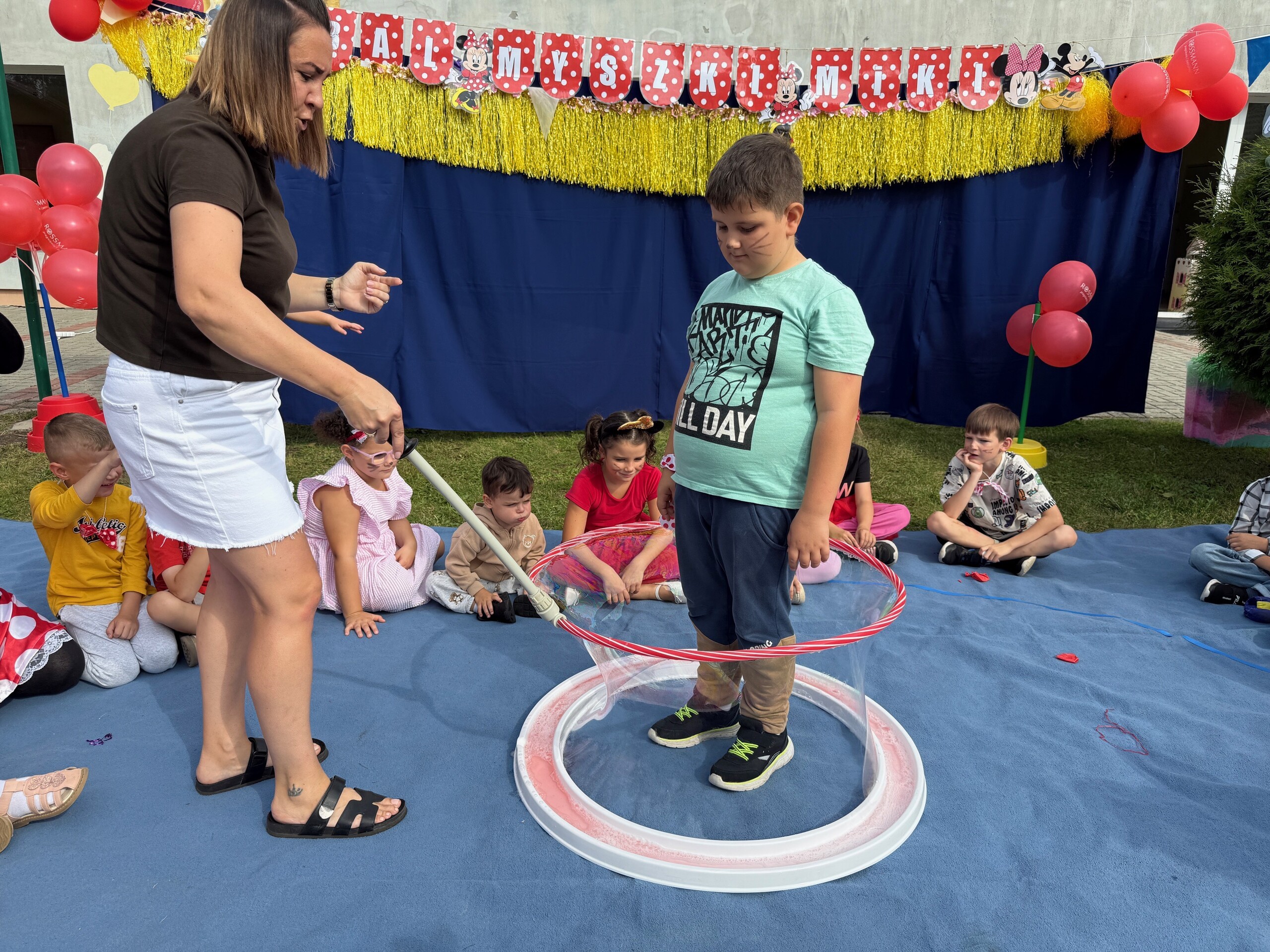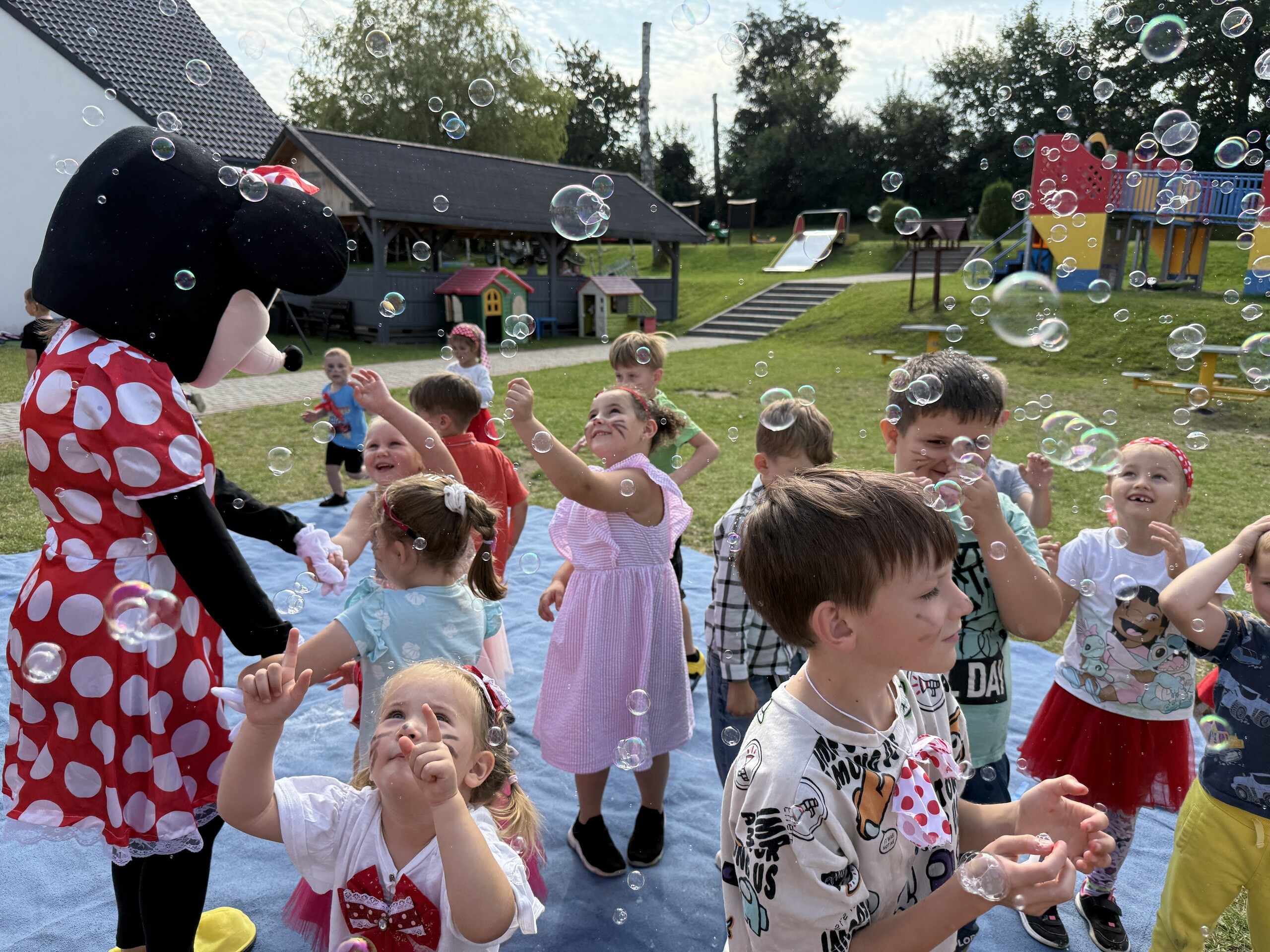 Dzisiaj w naszym przedszkolu na zakończenie wakacyjnych zajęć odbył się Balik z Myszka Miki! Wspólnie z nią tańczyliśmy, śpiewaliśmy i uczestniczyliśmy w balu. Dzieci miały okazję brać udział w różnych zabawach, takich jak układanie puzzli razem z Myszką Miki, a także wspólne rysowanie i malowanie. Otrzymały baloniki, które były kolorowe i wesołe, co dodatkowo umiliło nam czas.