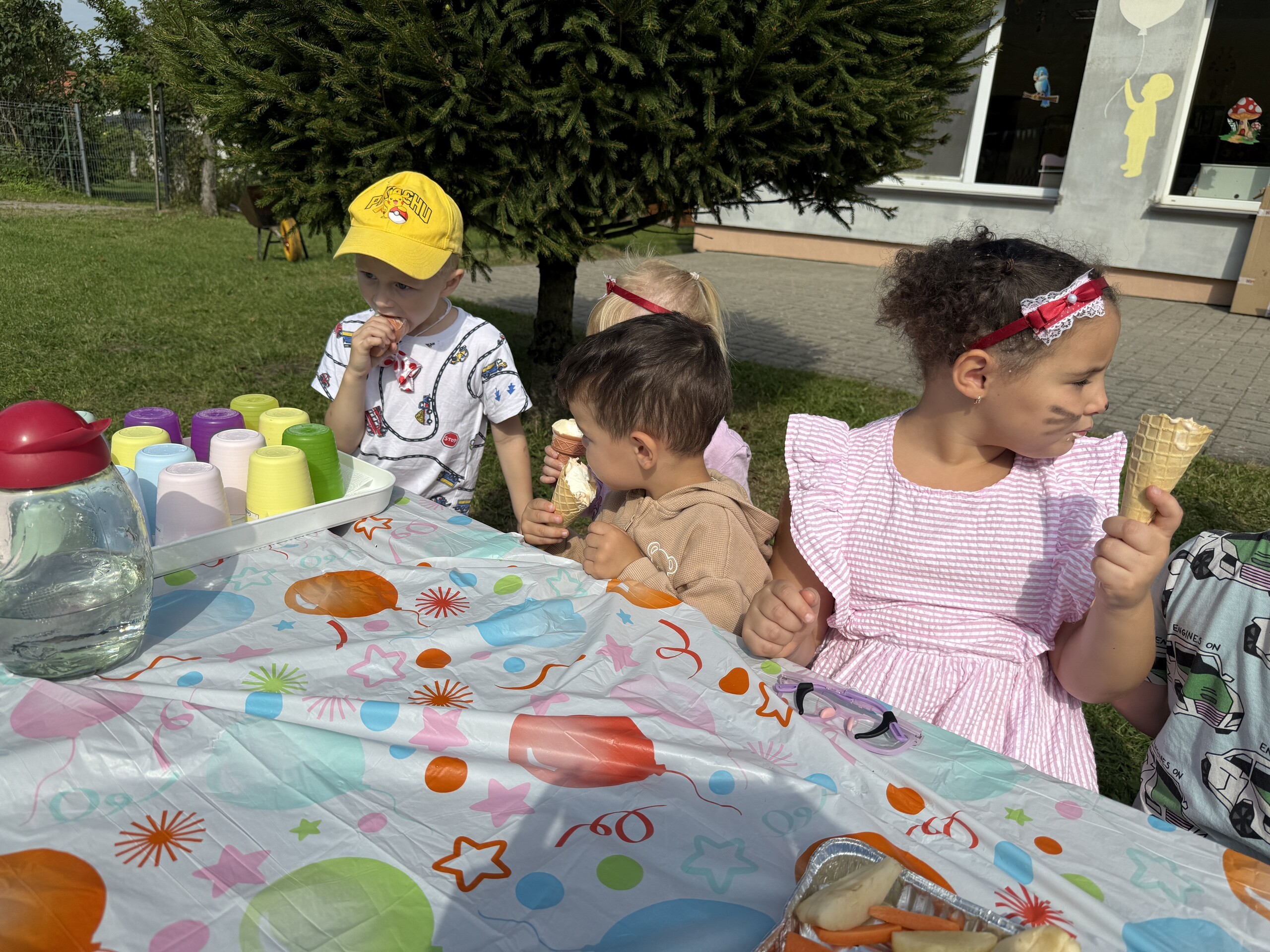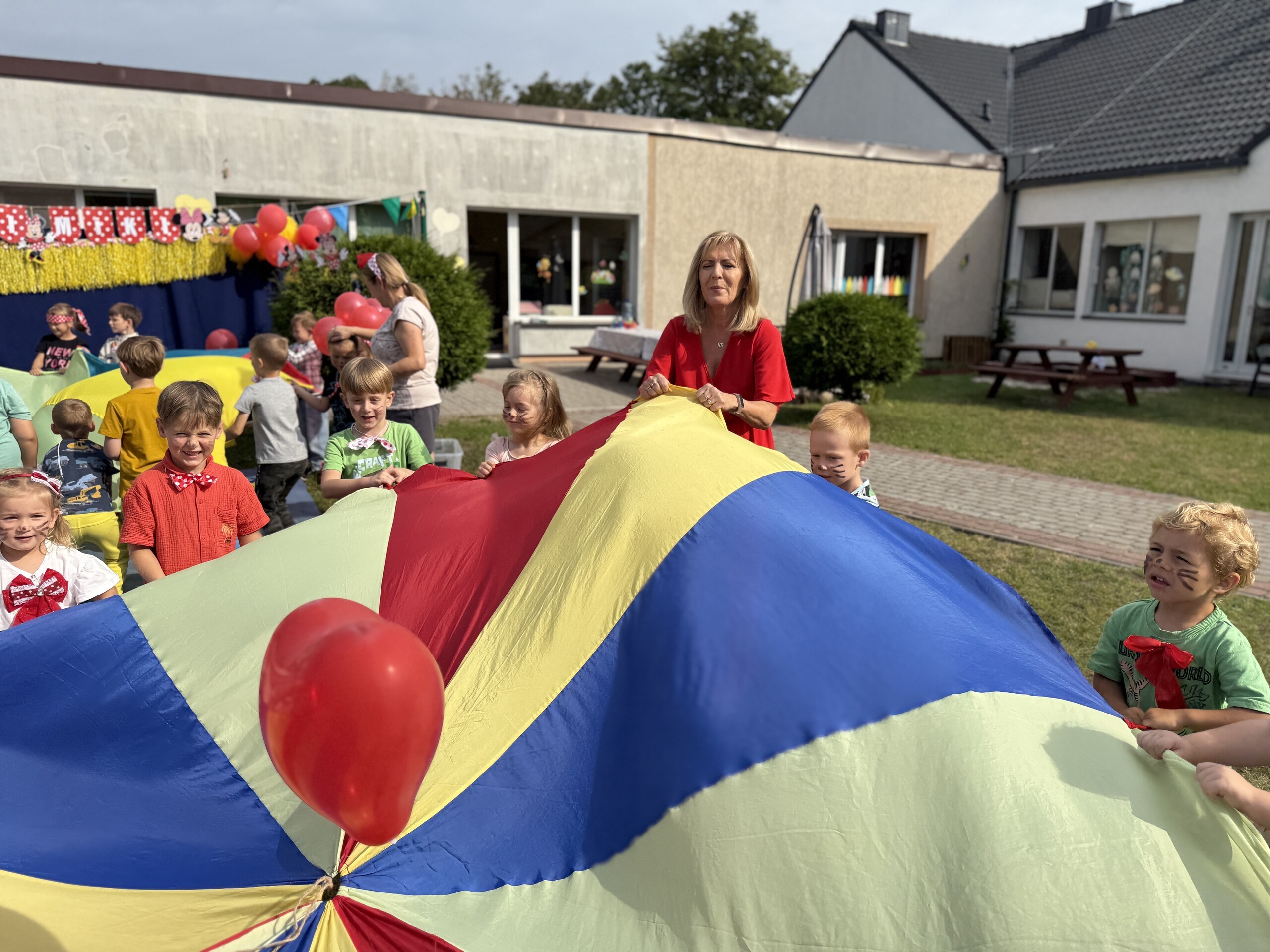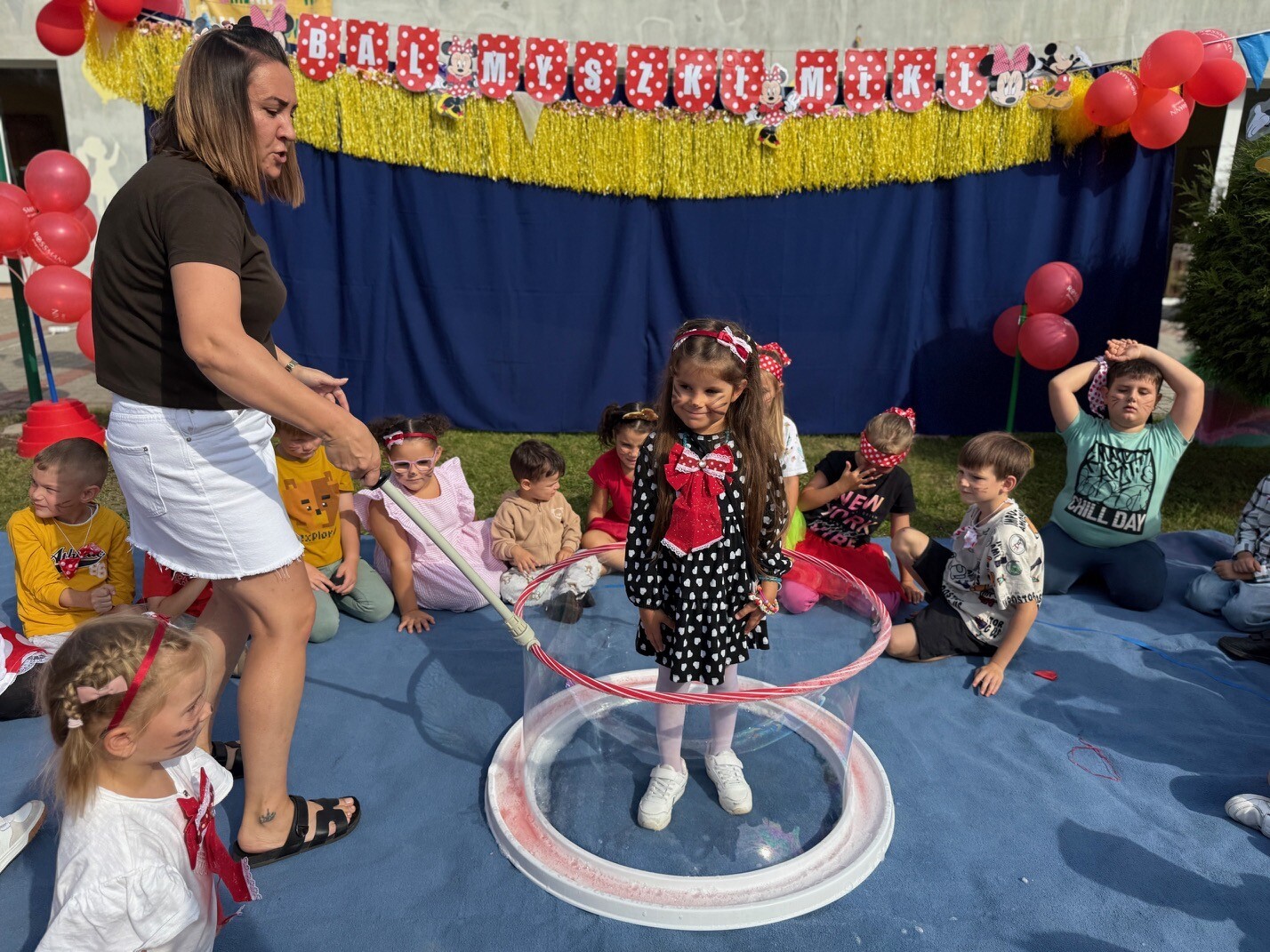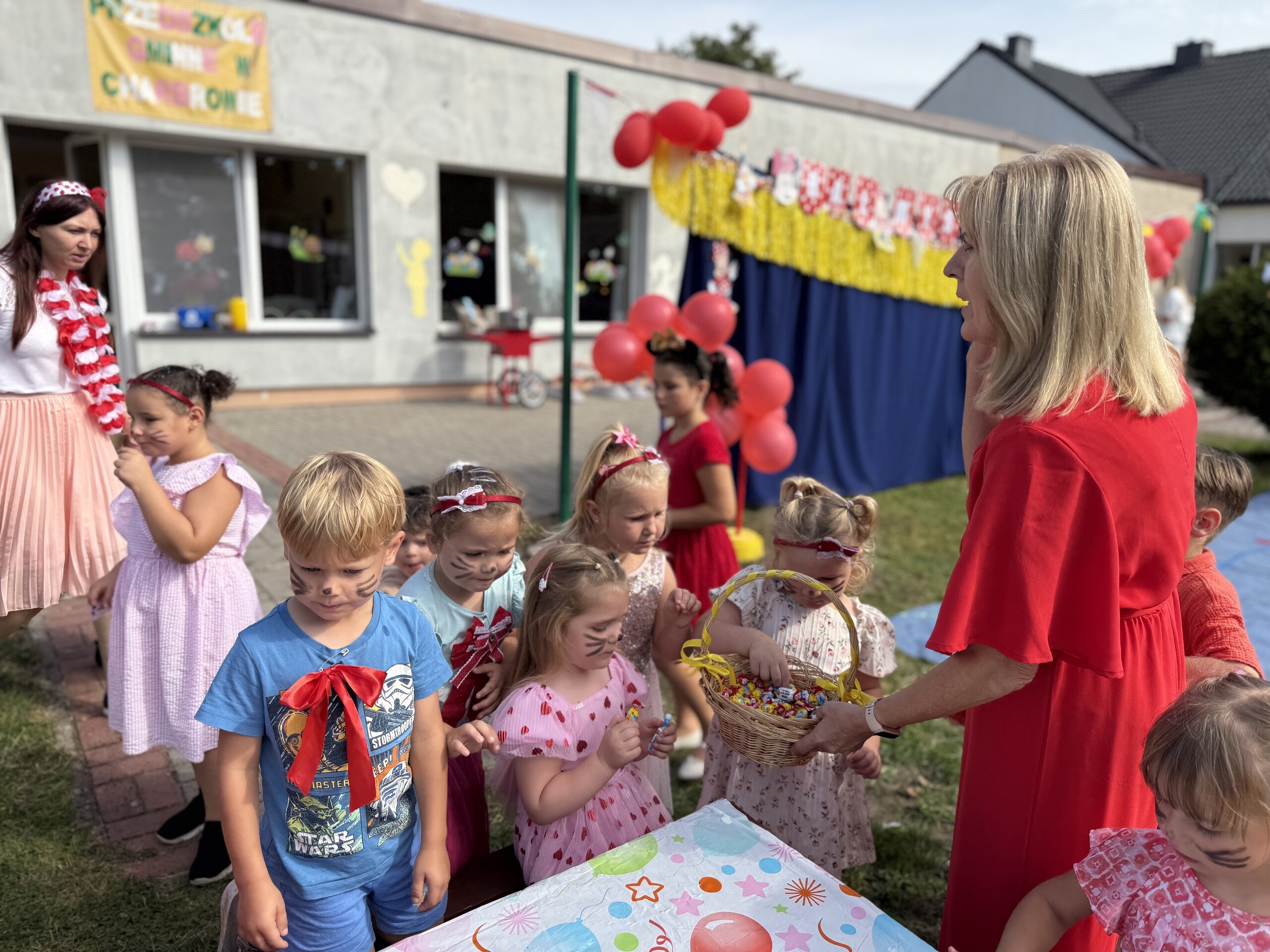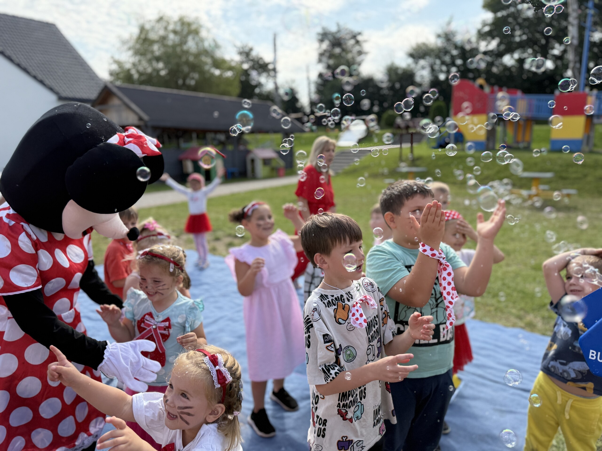 Dzisiaj w naszym przedszkolu na zakończenie wakacyjnych zajęć odbył się Balik z Myszka Miki! Wspólnie z nią tańczyliśmy, śpiewaliśmy i uczestniczyliśmy w balu. Dzieci miały okazję brać udział w różnych zabawach, takich jak układanie puzzli razem z Myszką Miki, a także wspólne rysowanie i malowanie. Otrzymały baloniki, które były kolorowe i wesołe, co dodatkowo umiliło nam czas.