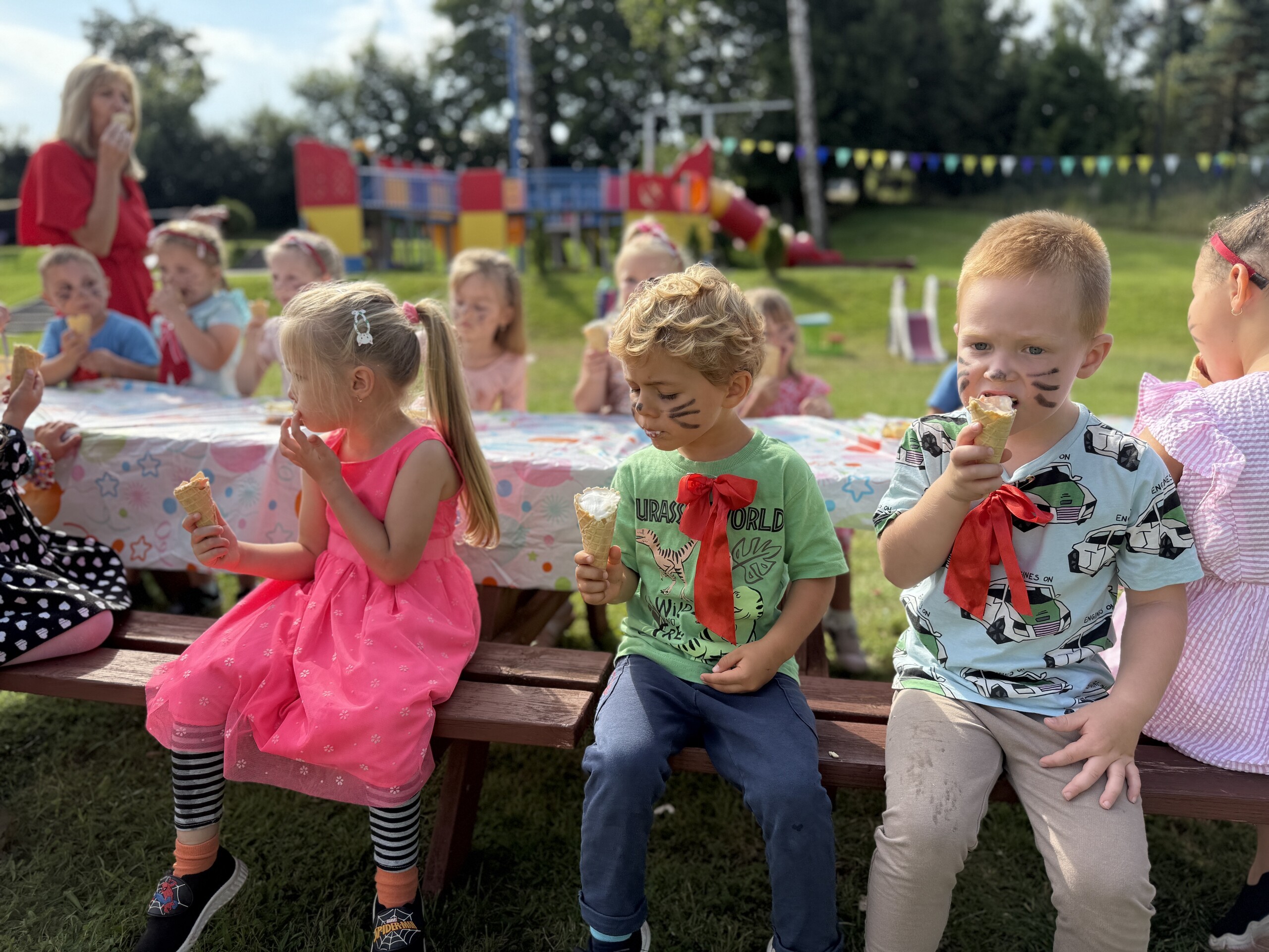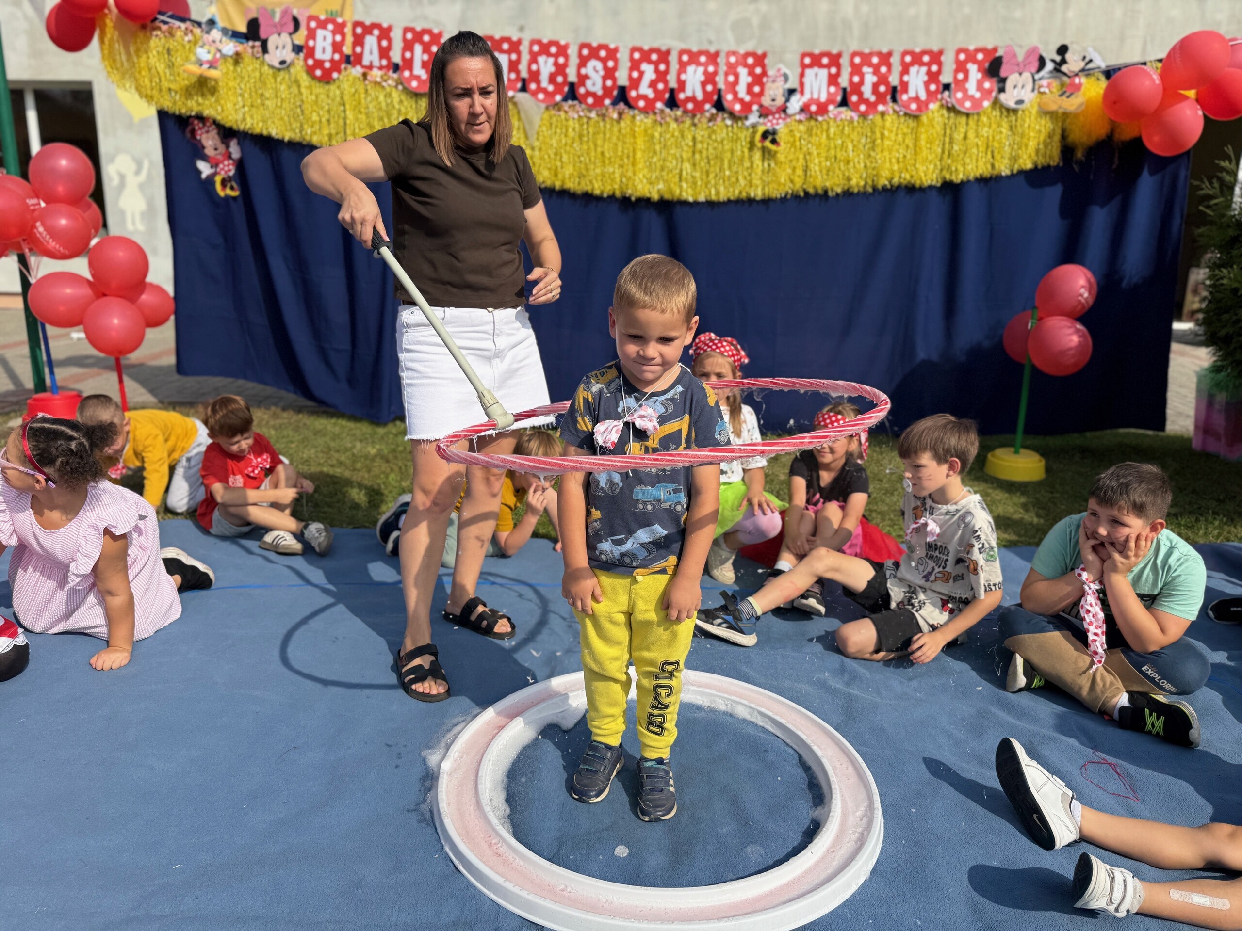 Dzieci brały również udział w pokazie baniek, w którym mogły tworzyć ogromne bańki mydlane, a na koniec mieliśmy przyjemność zjeść pyszne lody. To była wspaniała zabawa, pełna radości i śmiechu!