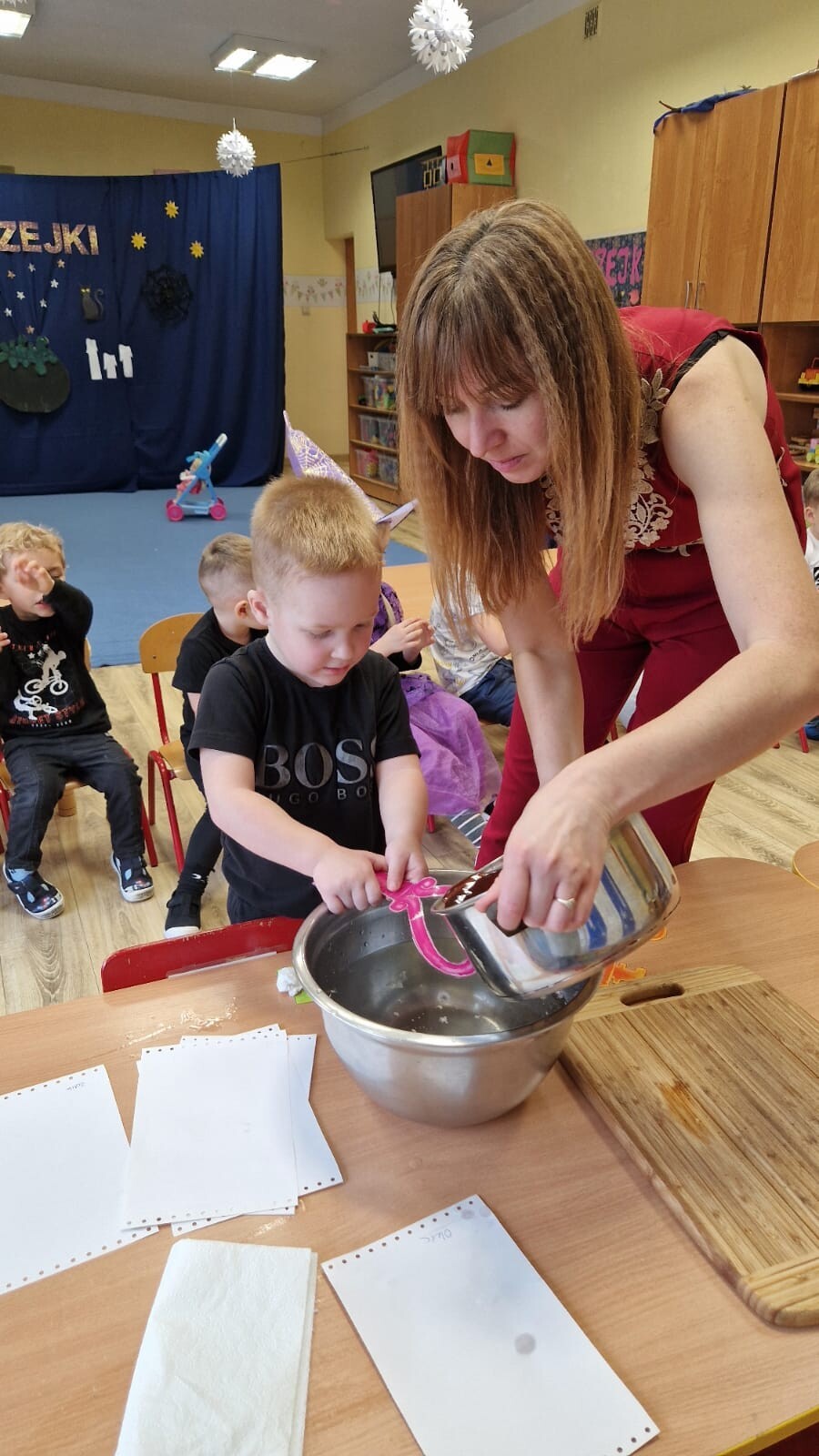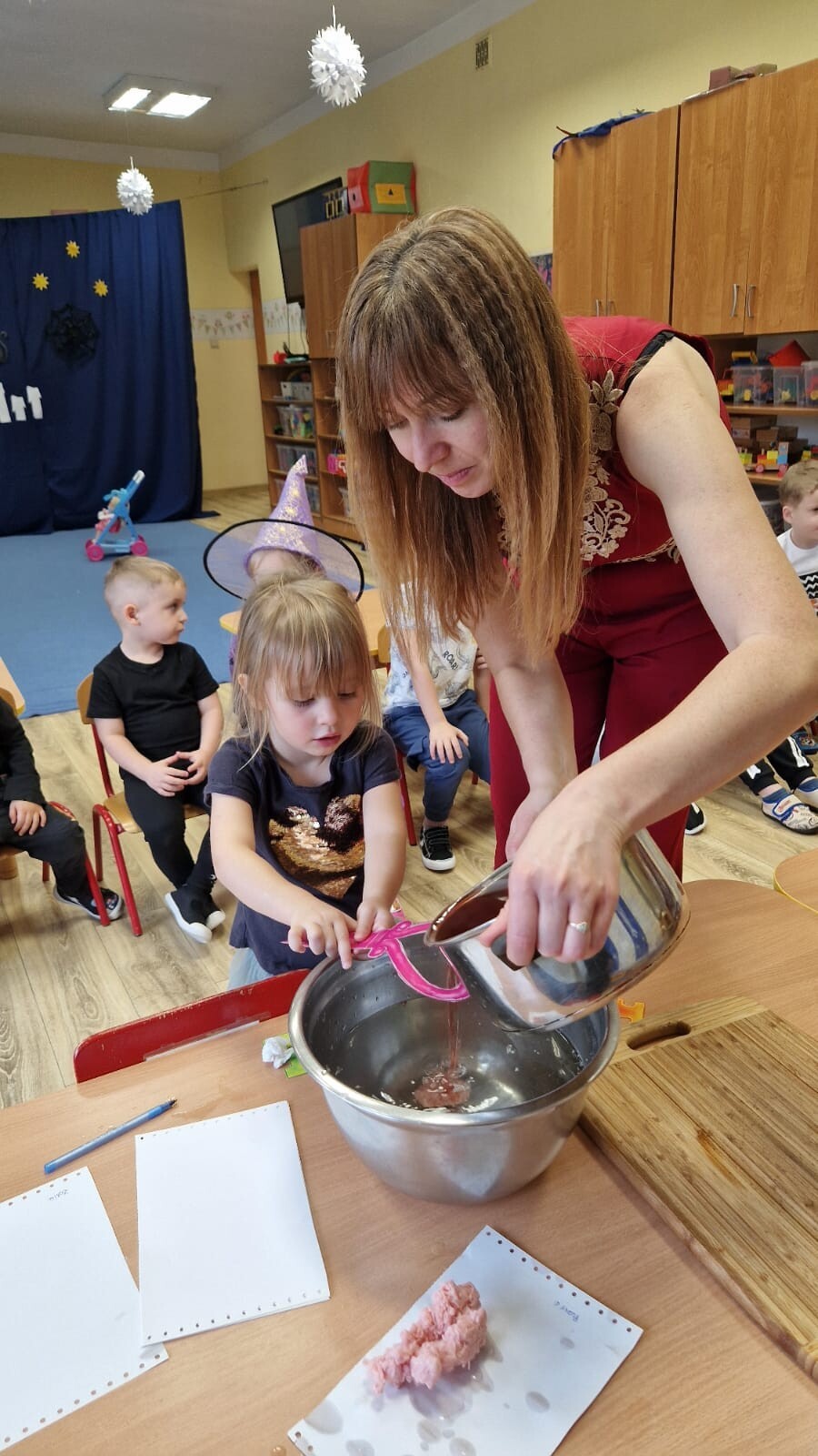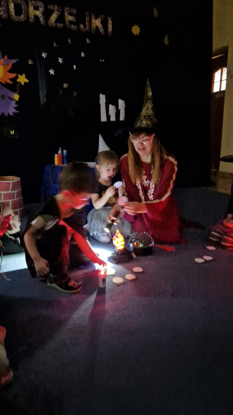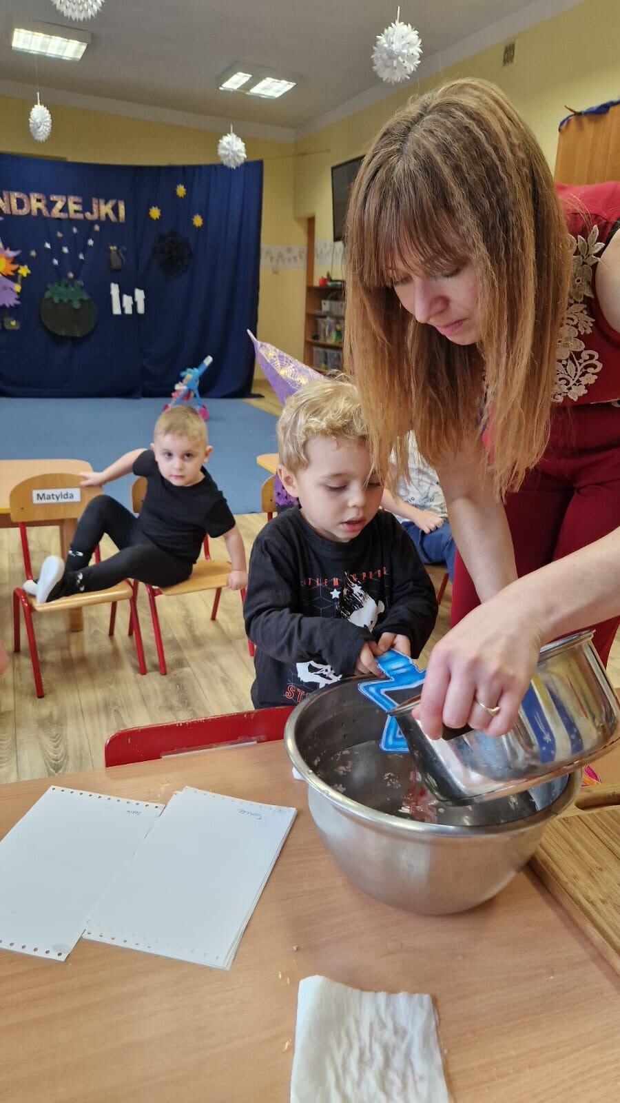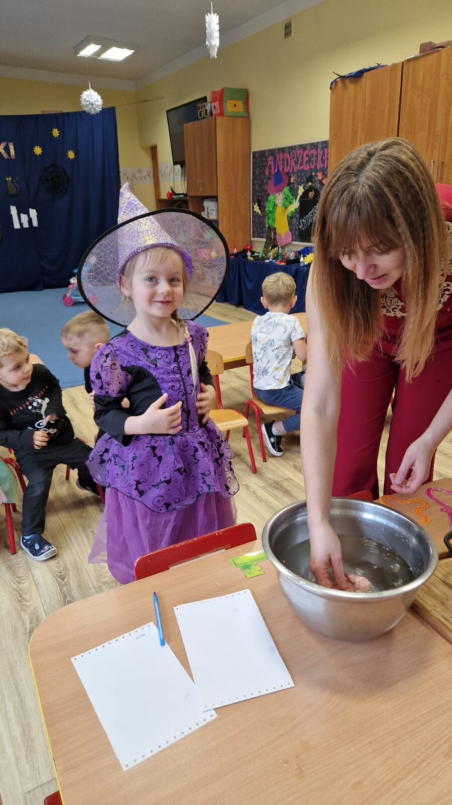 Tradycyjne lanie wosku wzbudziło wiele emocji, gdy dzieci obserwowały powstające kształty i próbowały je interpretować. Największą atrakcją było jednak przygotowanie magicznego eliksiru. Dzieci wlewały kolorowe mikstury czarodziejki do naczynia z tajemniczym płynem, następnie wypowiedziały zaklęcie, które sprawiło, że pojawiły się bąbelki, które zaczęły wirować w cieczy wyglądając niezwykle fascynująco. Dzieci z zapartym tchem śledziły ten proces.