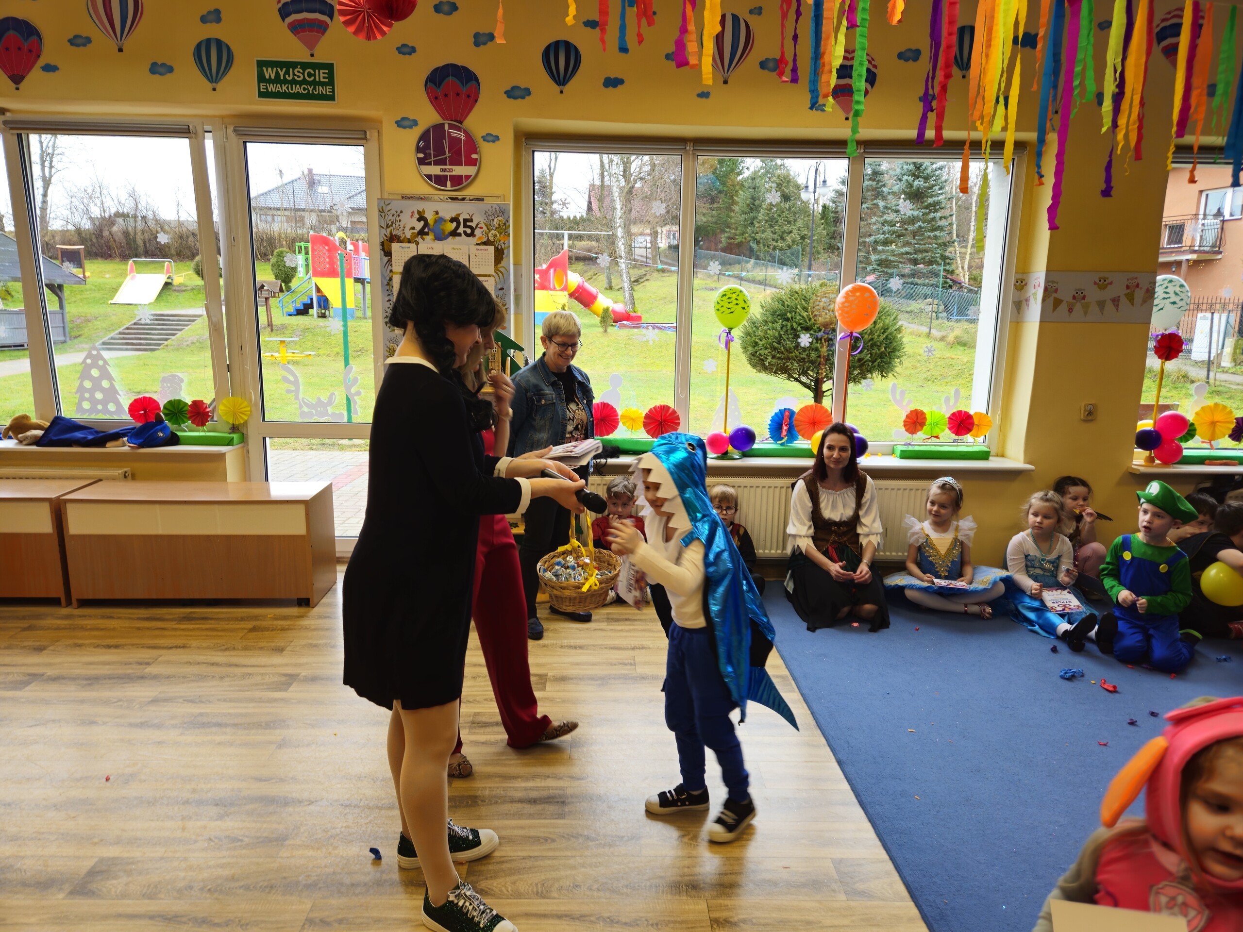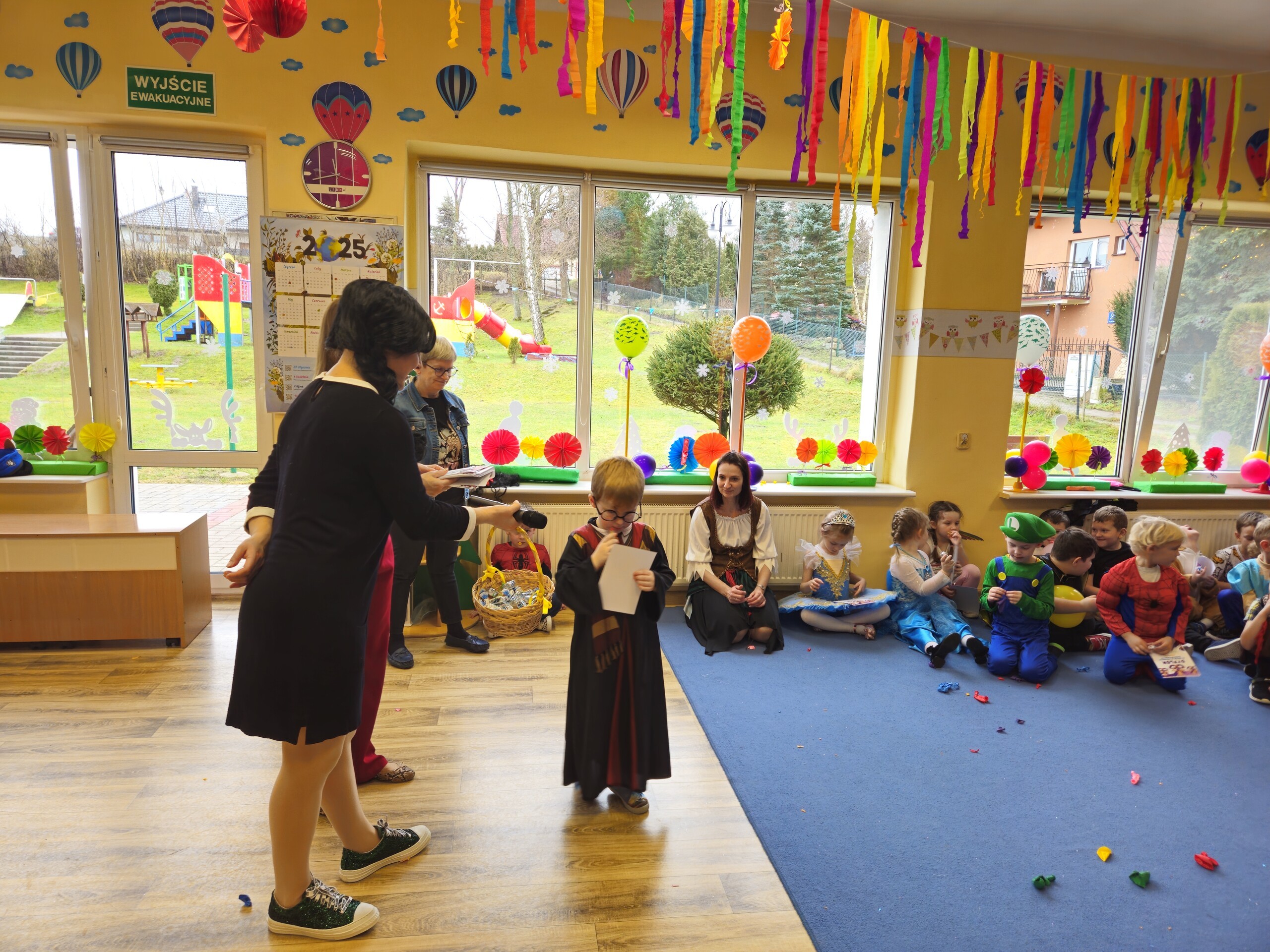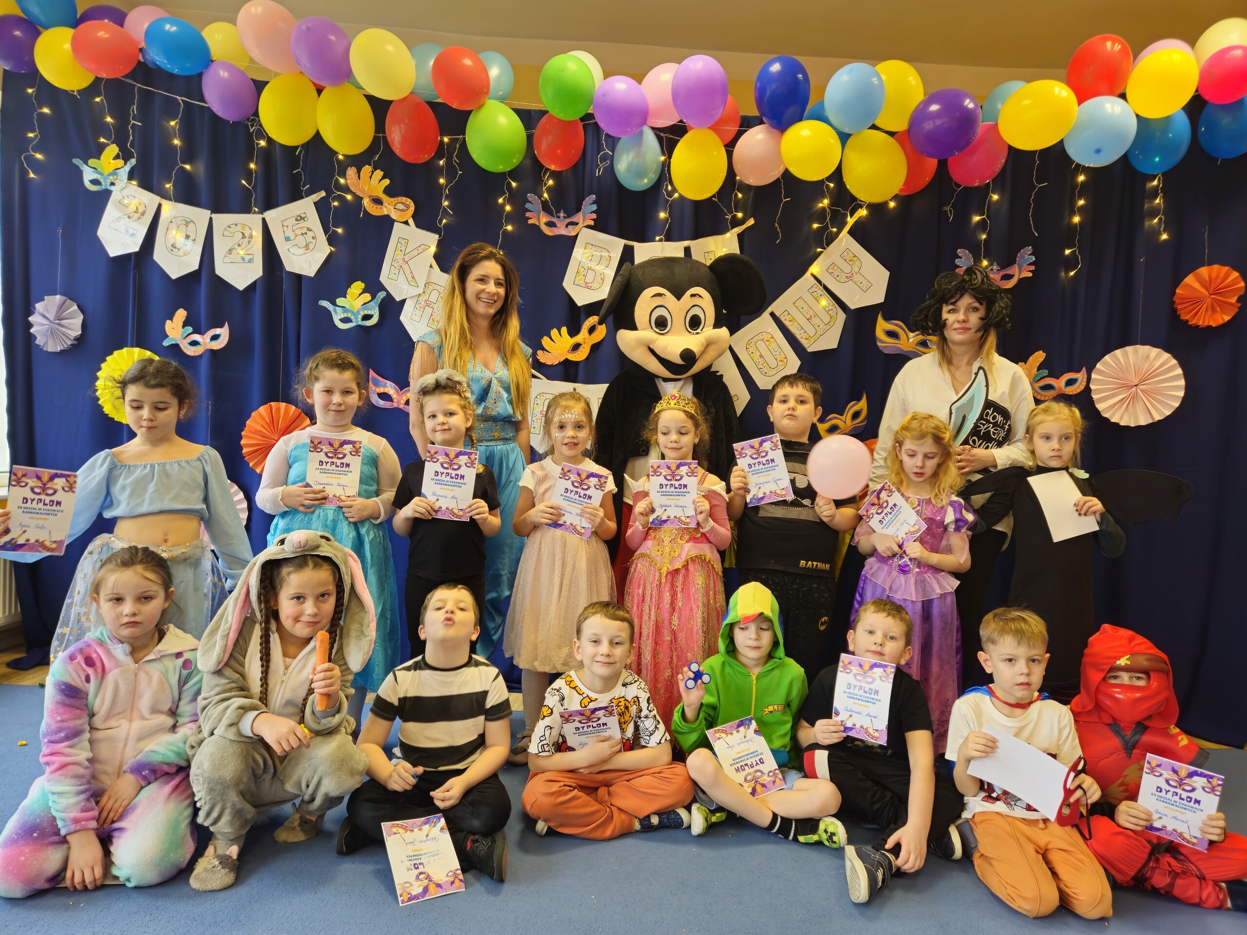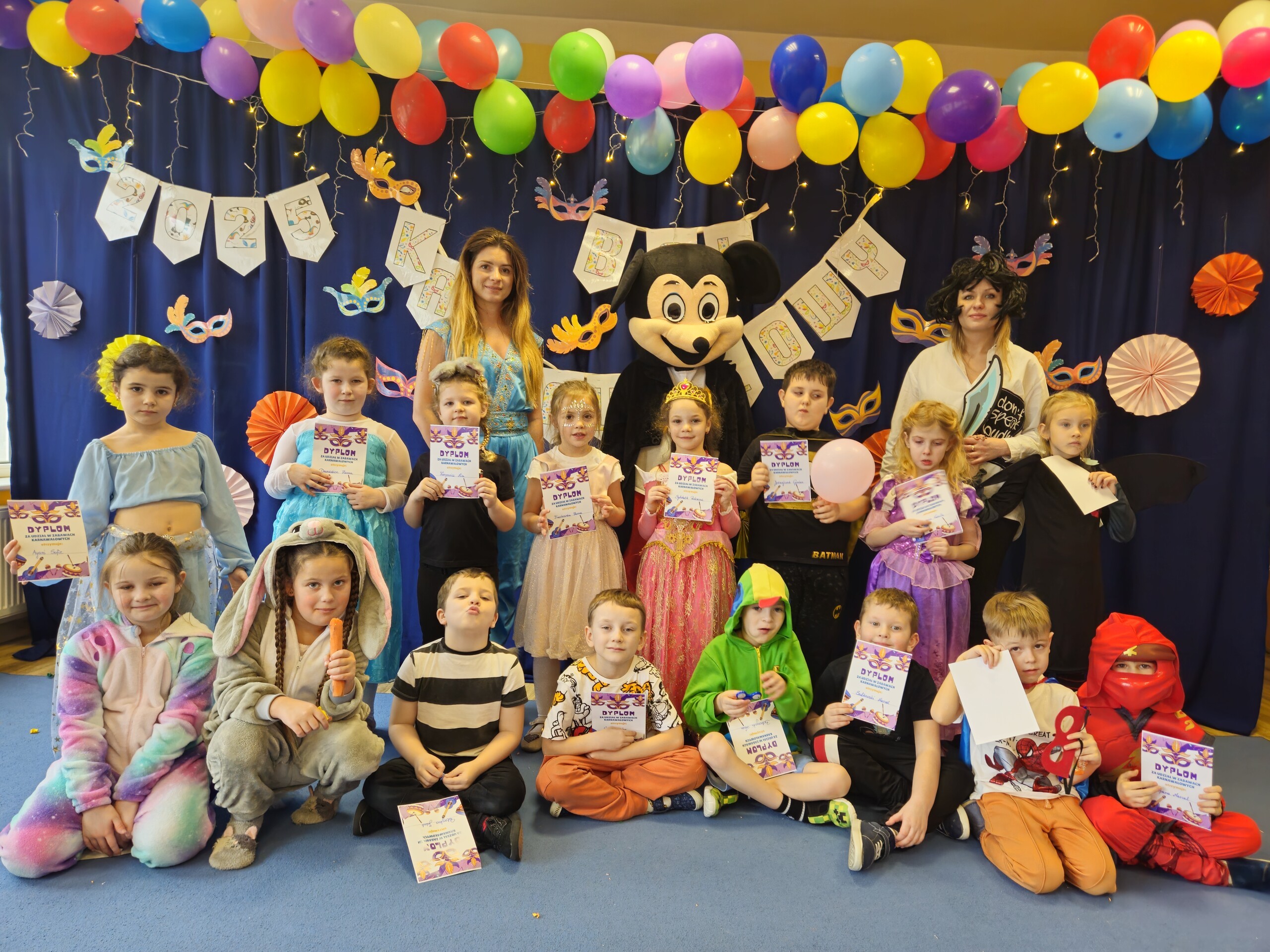 Na zakończenie balu pani Daria wręczyła każdemu uczestnikowi pamiątkowy dyplom oraz słodkiego cukierka. Dzieci z dumą odbierały swoje nagrody, a na ich twarzach malowały się szerokie uśmiechy. Bal zakończył się wspólnym śpiewem i tańcem, pozostawiając wszystkim uczestnikom mnóstwo pięknych wspomnień.