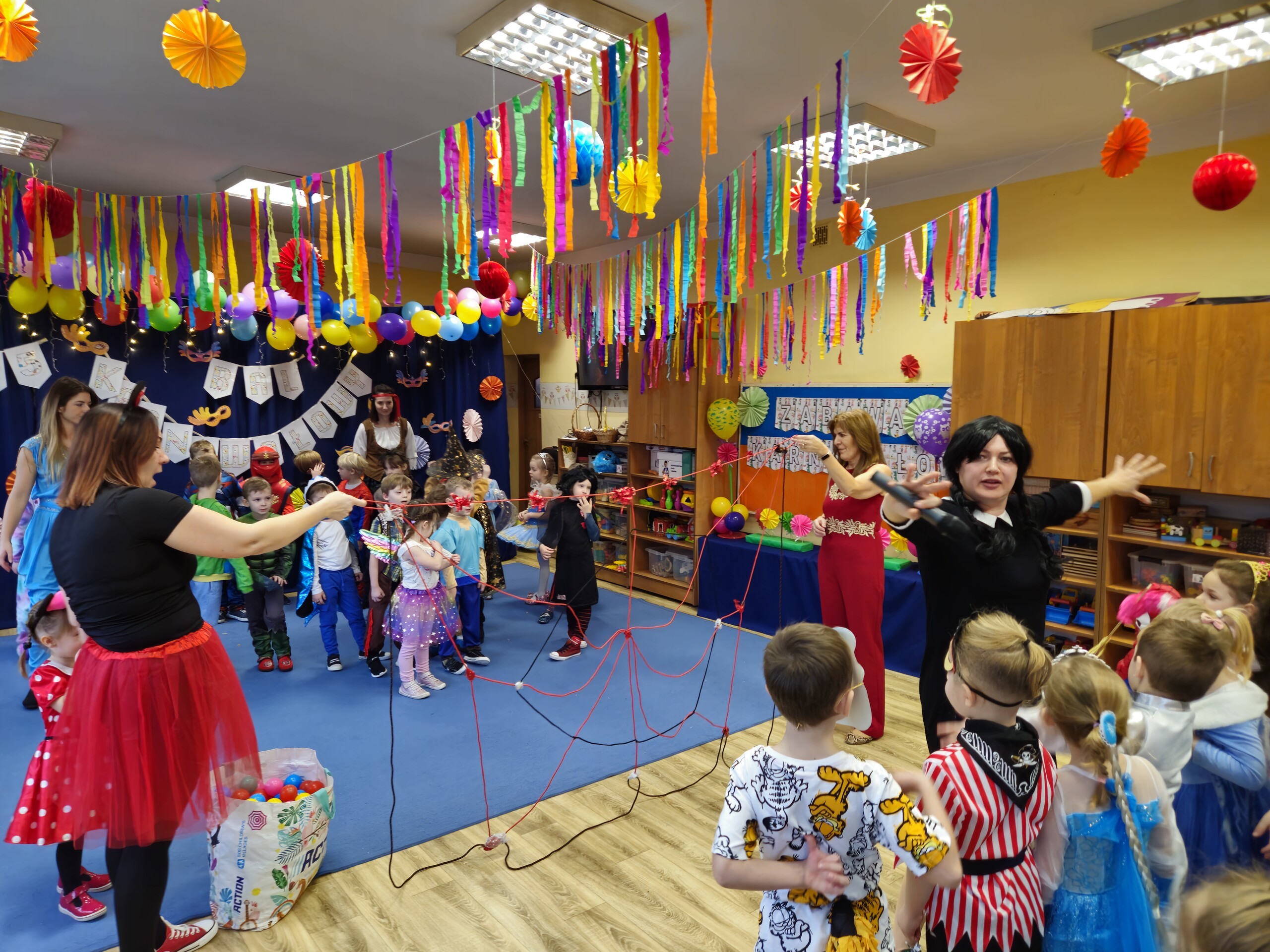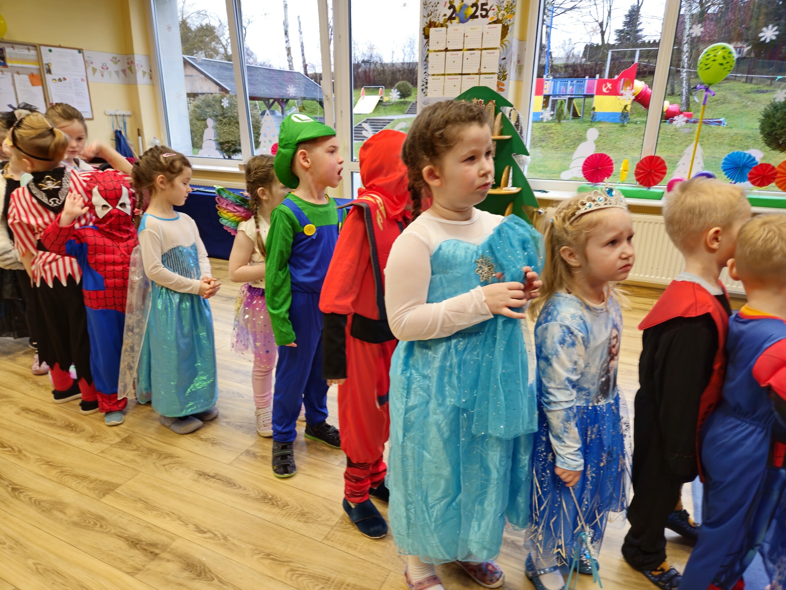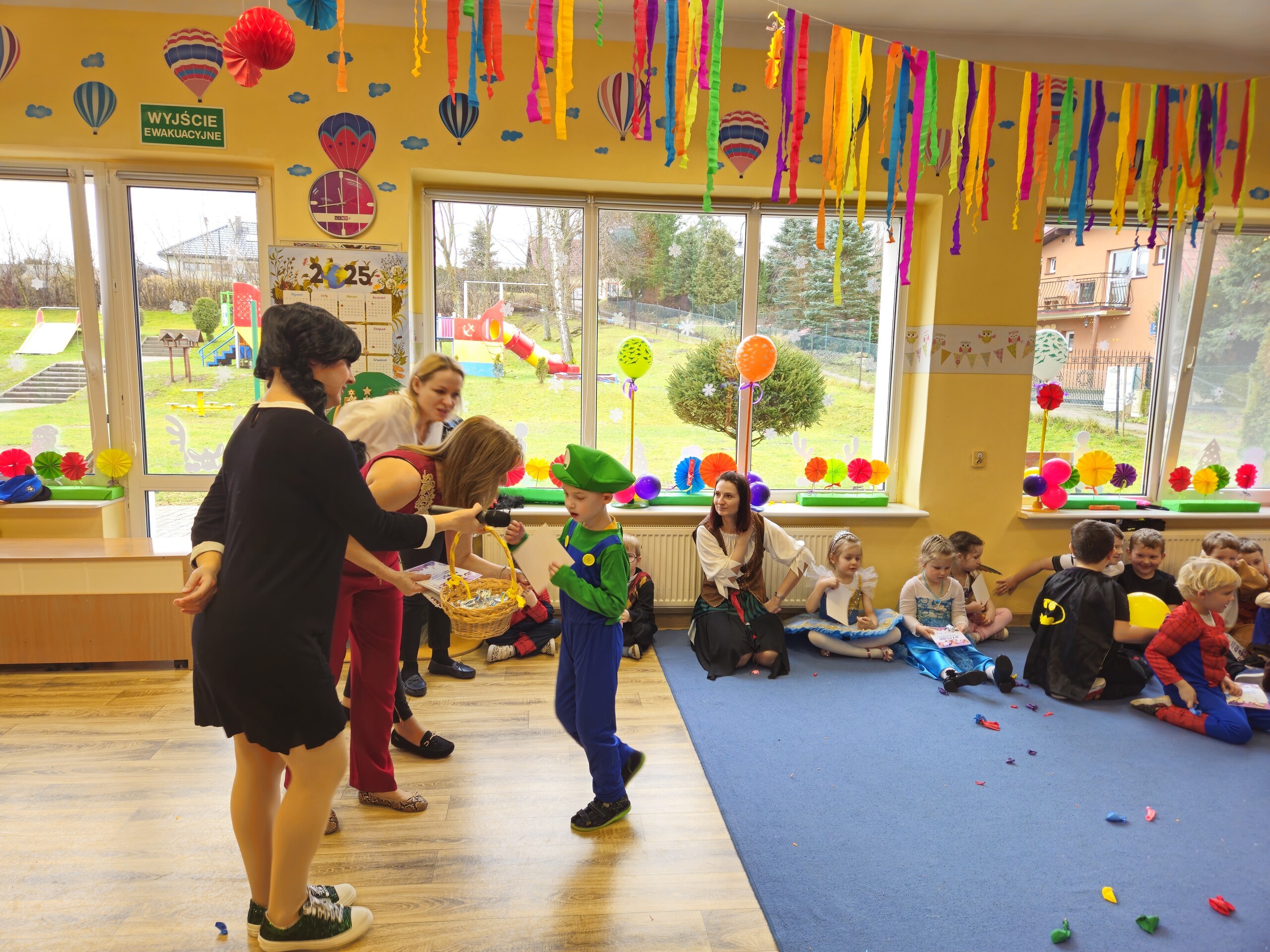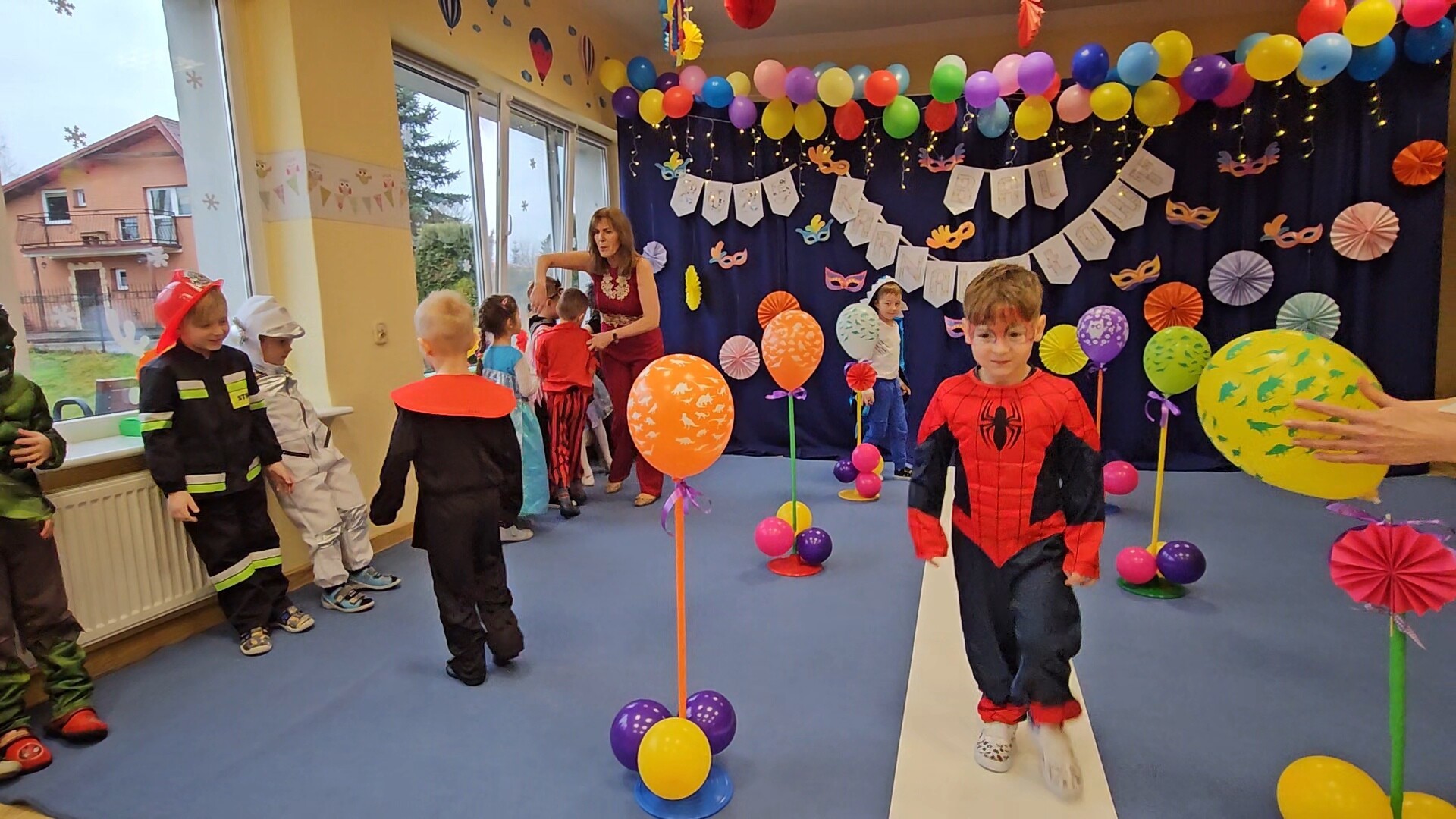Zanim rozpoczęły się zabawy, każde z dzieci miało okazję zaprezentować swoje wyjątkowe przebranie, przechodząc przez specjalnie przygotowany wybieg - biały dywan. Kolorowe kostiumy i kreatywne stroje wywołały podziw wśród zebranych i dodały wyjątkowego klimatu całemu wydarzeniu.