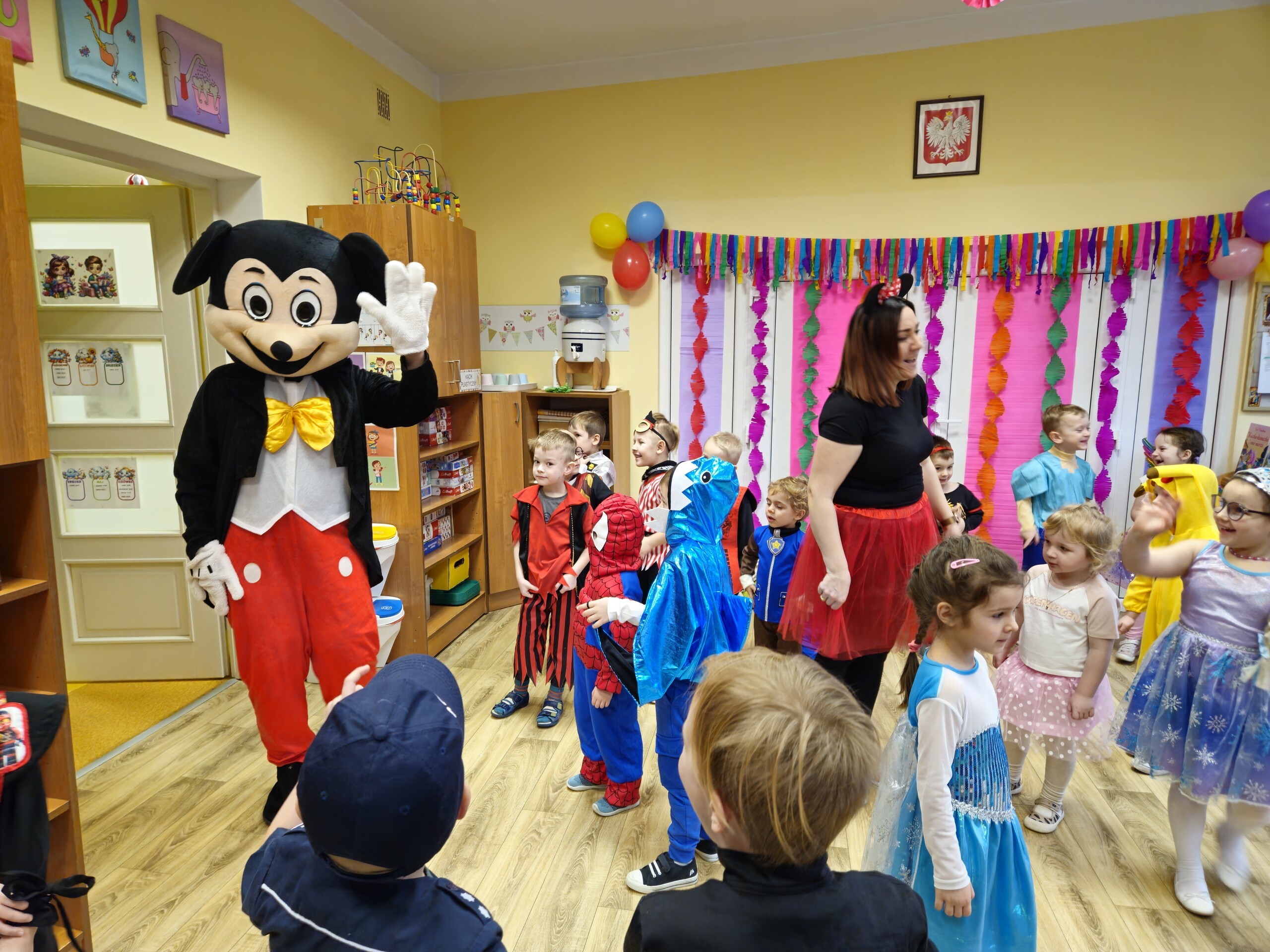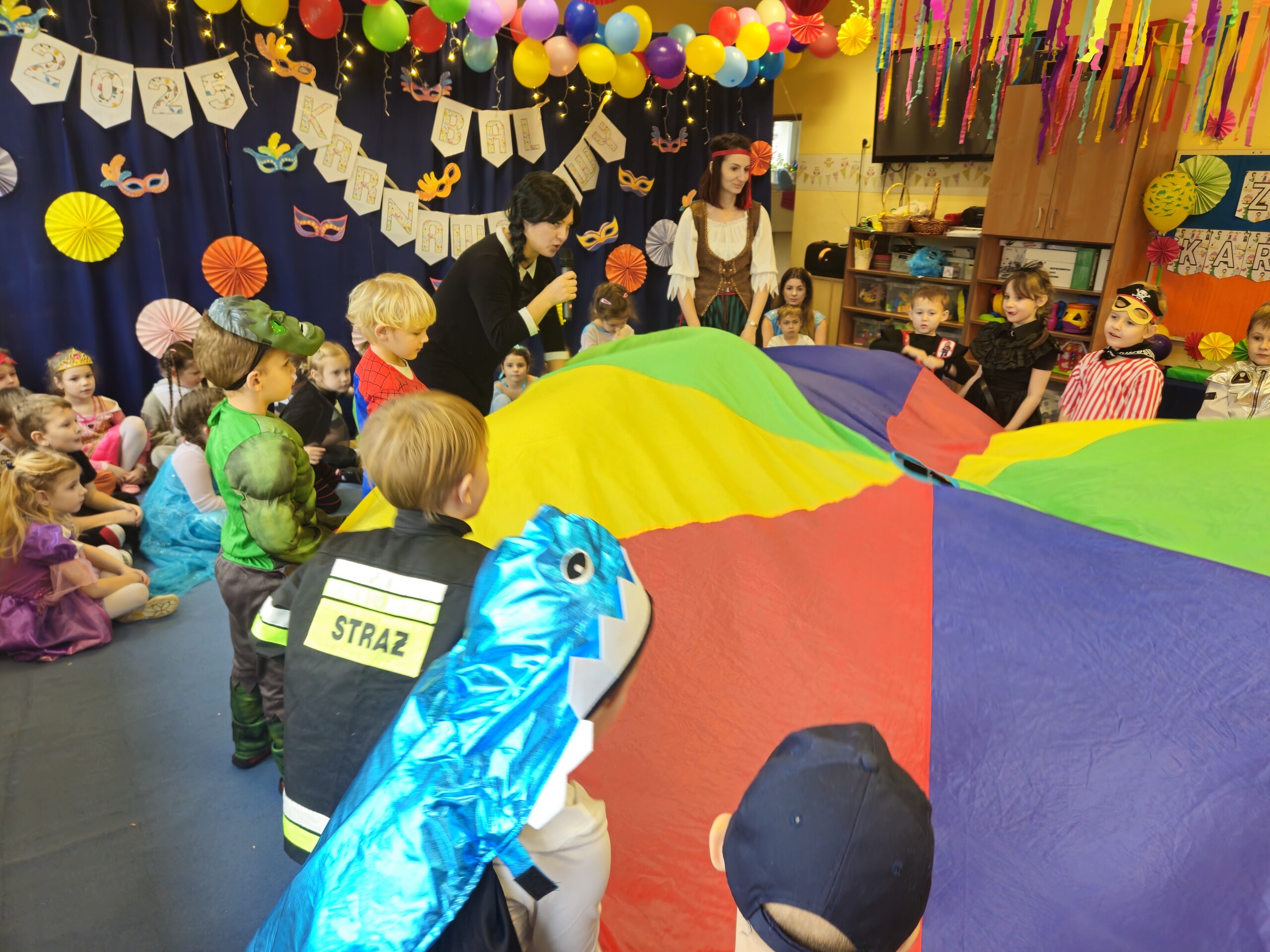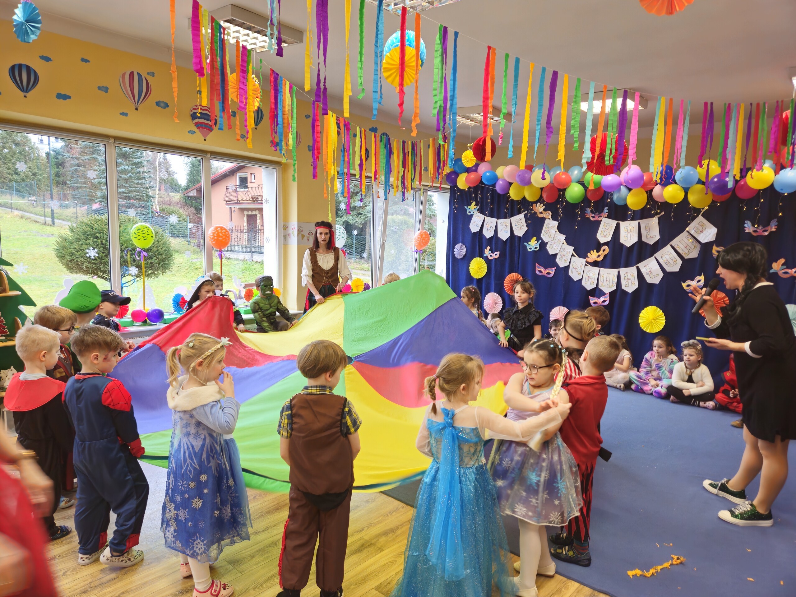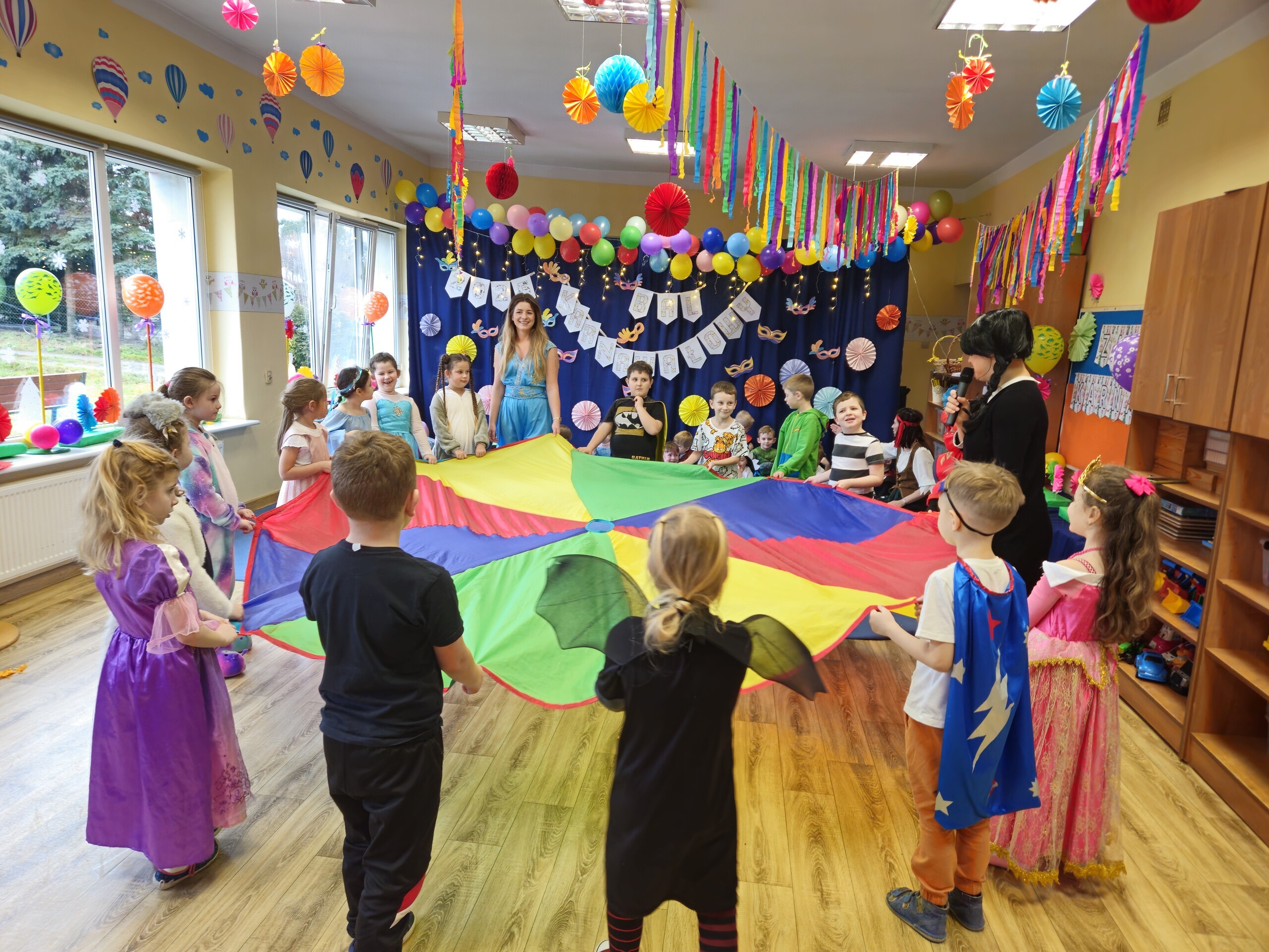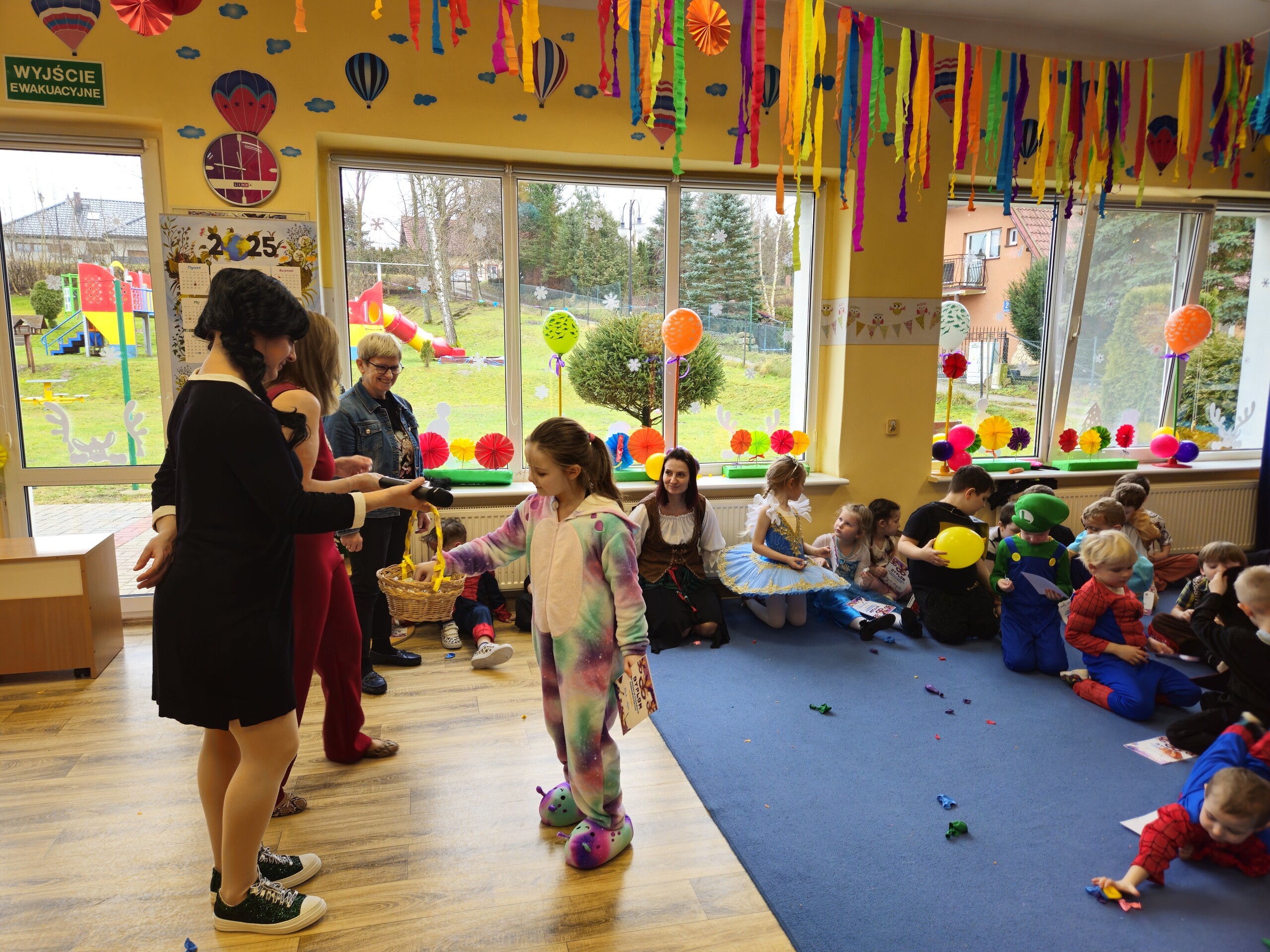 Zanim rozpoczęły się zabawy, każde z dzieci miało okazję zaprezentować swoje wyjątkowe przebranie, przechodząc przez specjalnie przygotowany wybieg - biały dywan. Kolorowe kostiumy i kreatywne stroje wywołały podziw wśród zebranych i dodały wyjątkowego klimatu całemu wydarzeniu.