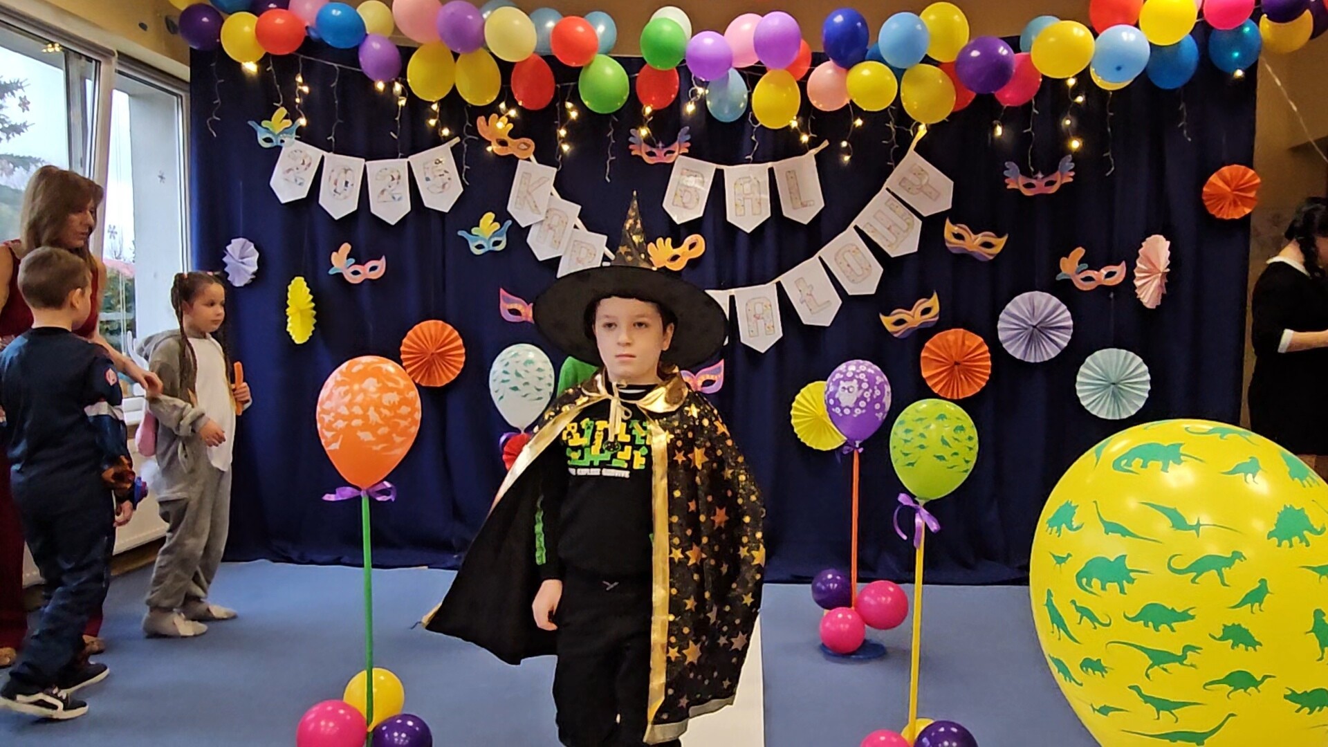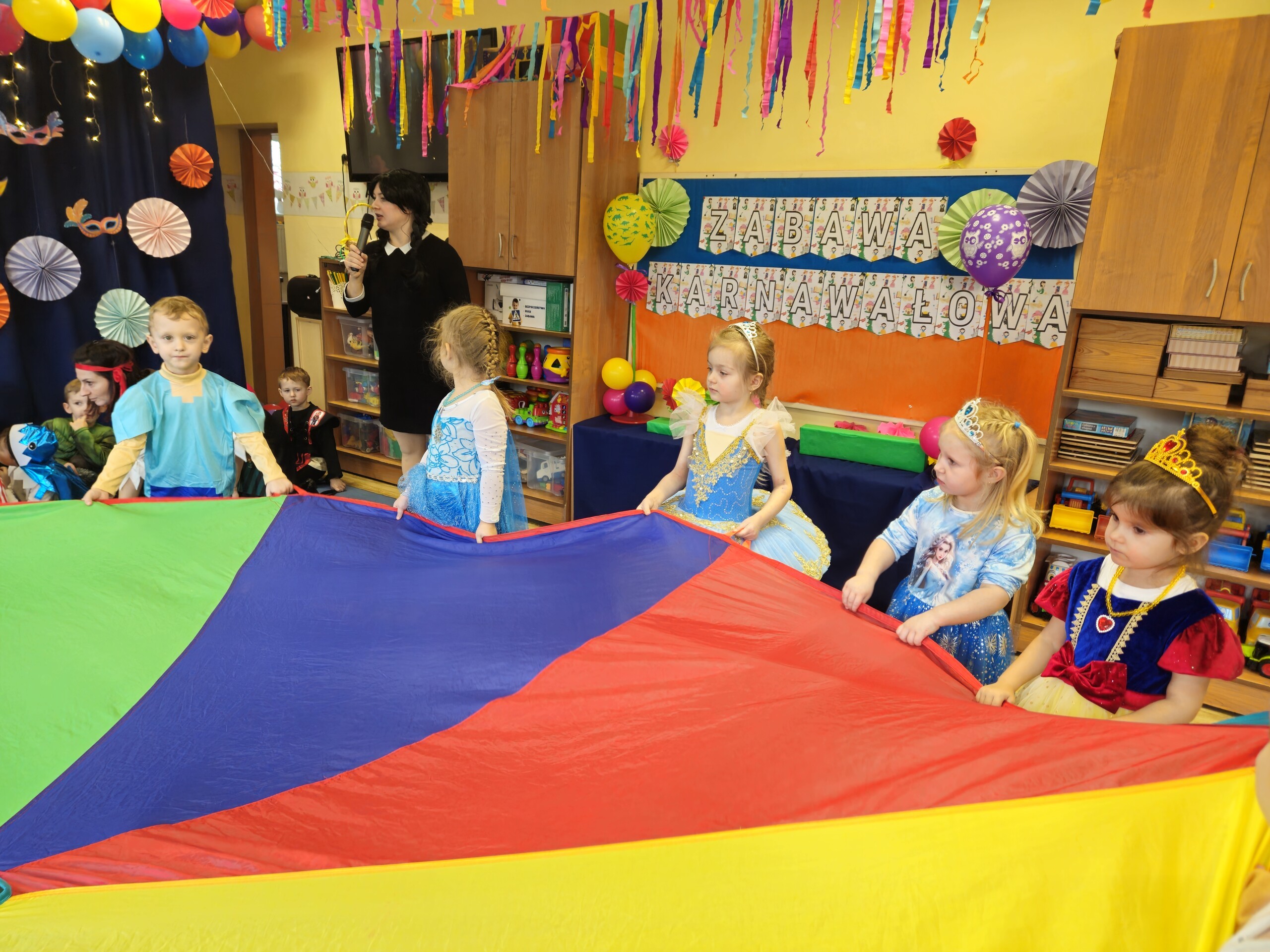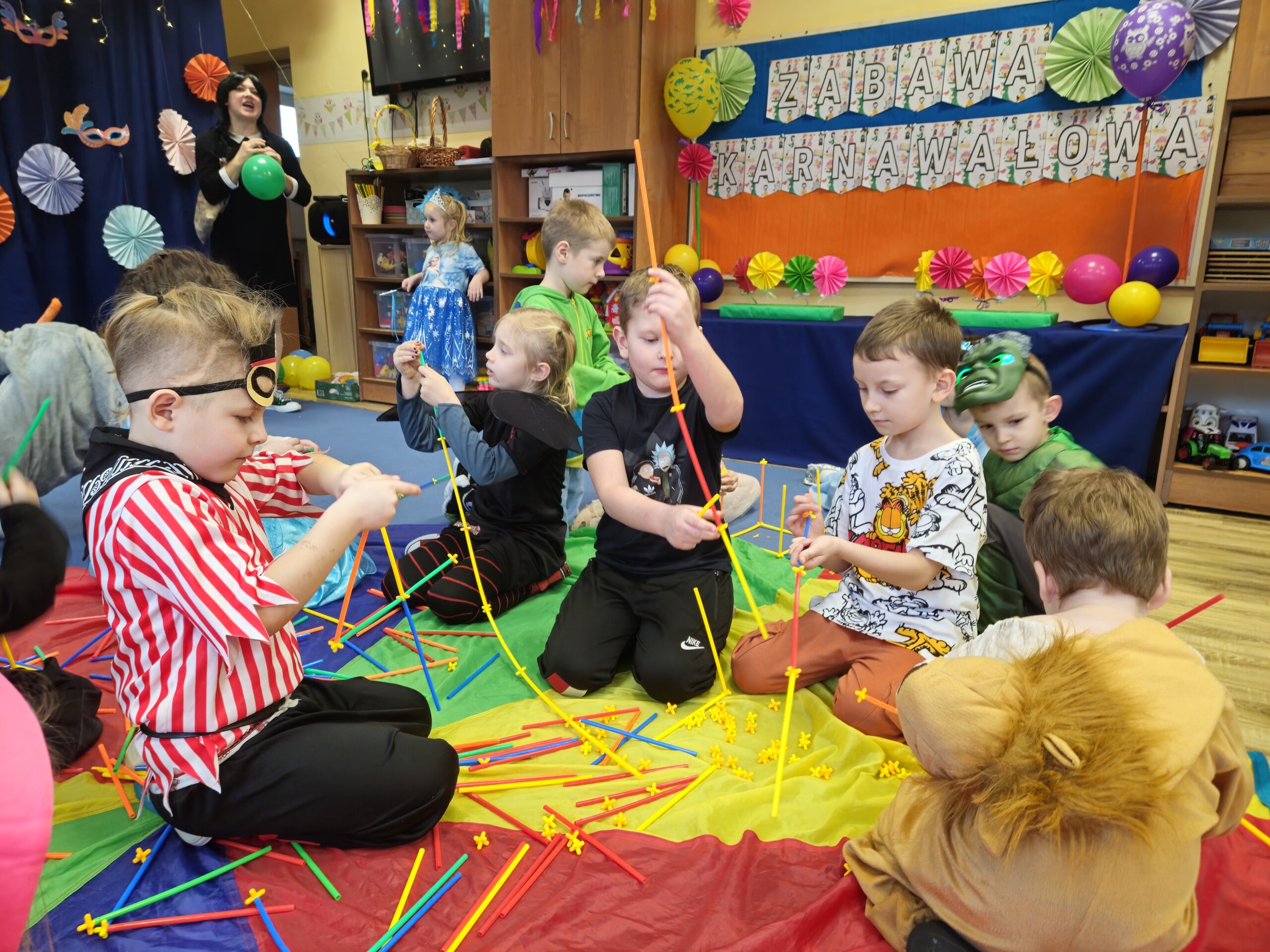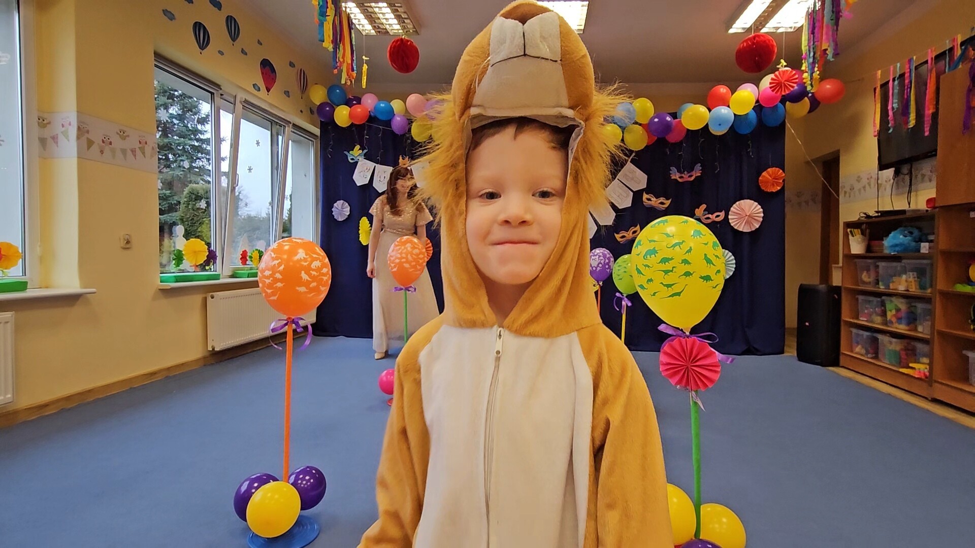 Zanim rozpoczęły się zabawy, każde z dzieci miało okazję zaprezentować swoje wyjątkowe przebranie, przechodząc przez specjalnie przygotowany wybieg - biały dywan. Kolorowe kostiumy i kreatywne stroje wywołały podziw wśród zebranych i dodały wyjątkowego klimatu całemu wydarzeniu.