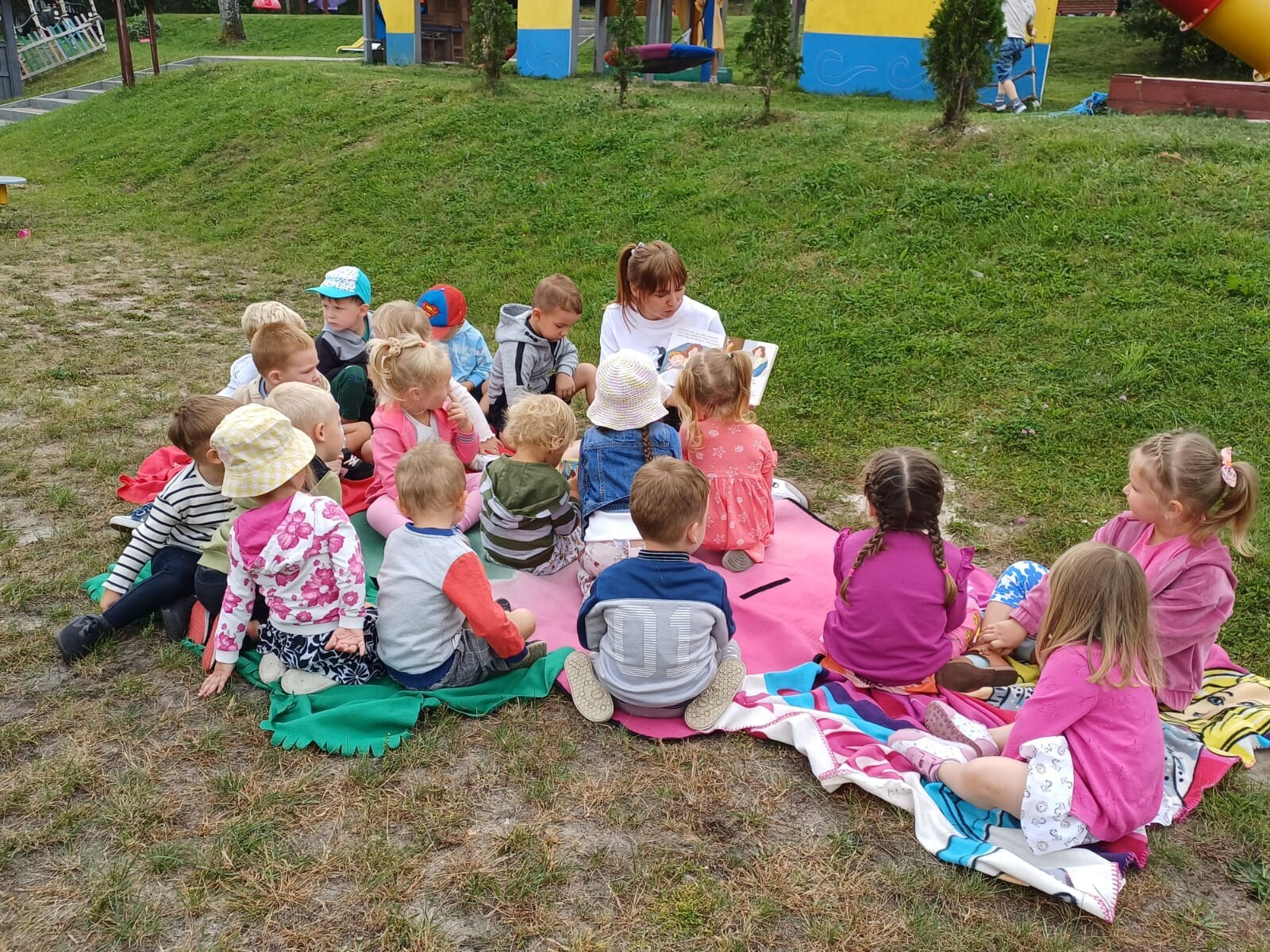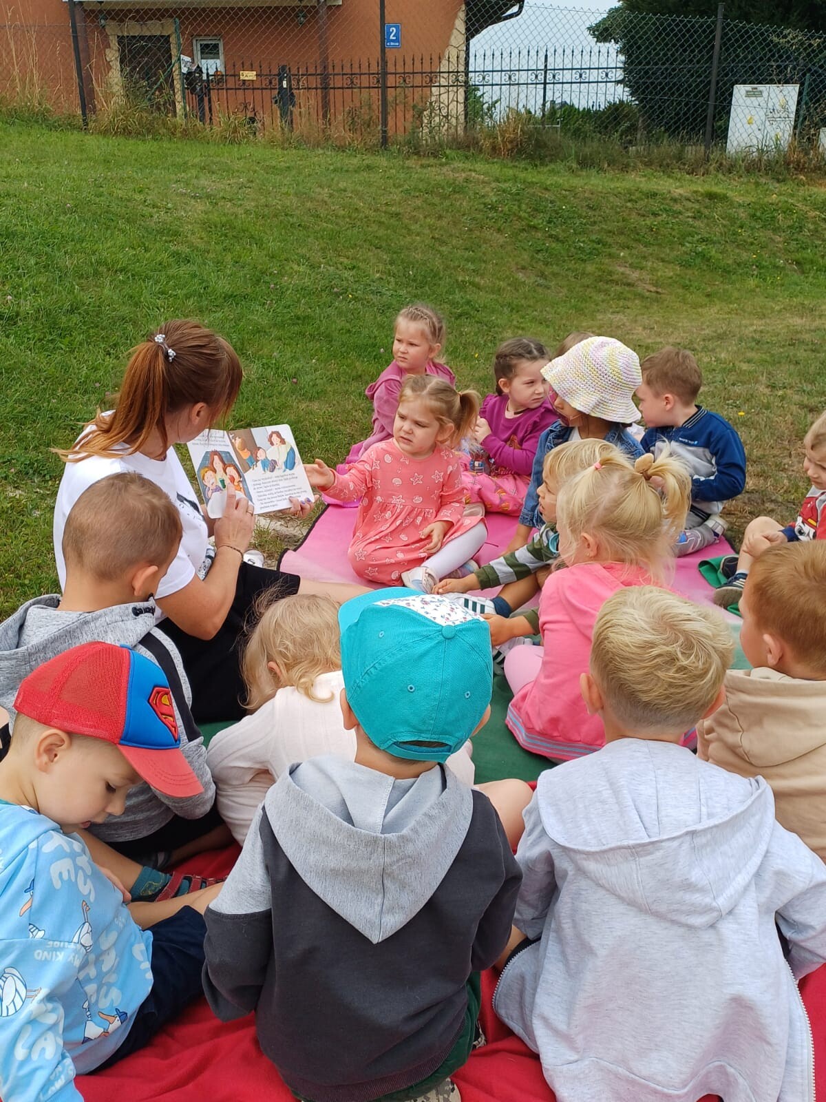 5 września dzieci z grupy III wykorzystały piękną pogodę i zajęcia edukacyjne pt. „Bajka na trawie" przeniosły do ogrodu przedszkolnego. Wszyscy z wielkim zainteresowaniem słuchali bajki „Pola i Piotruś. Ulubiona przytulanka" a następnie dzielili się opowieściami o swoich przytulankach.