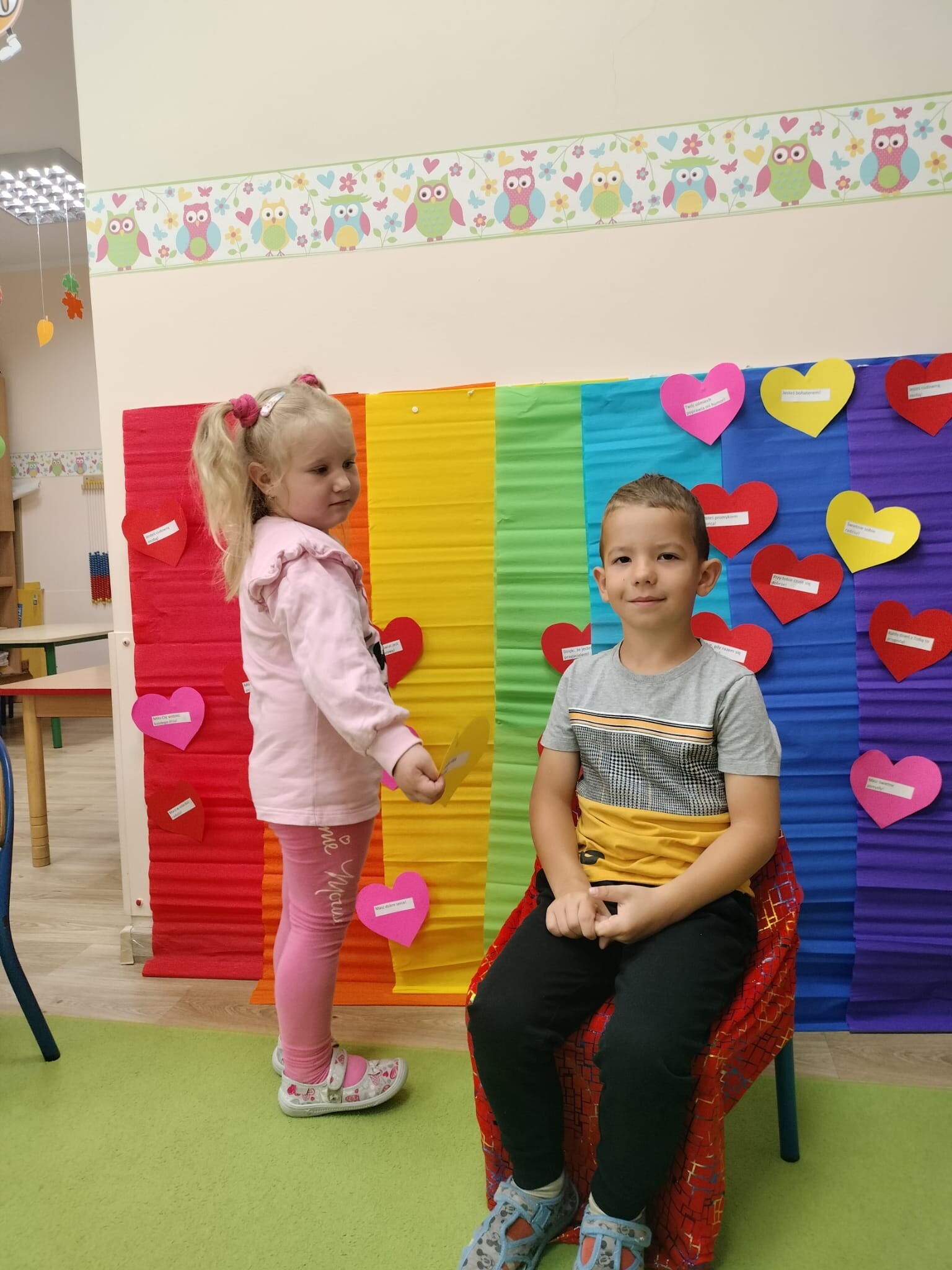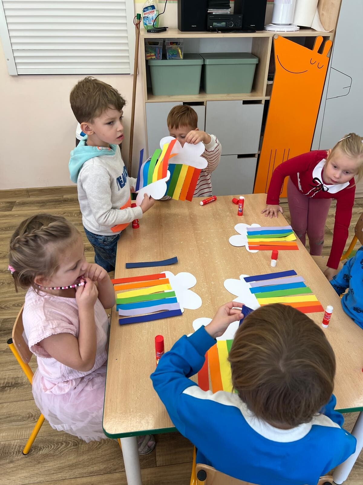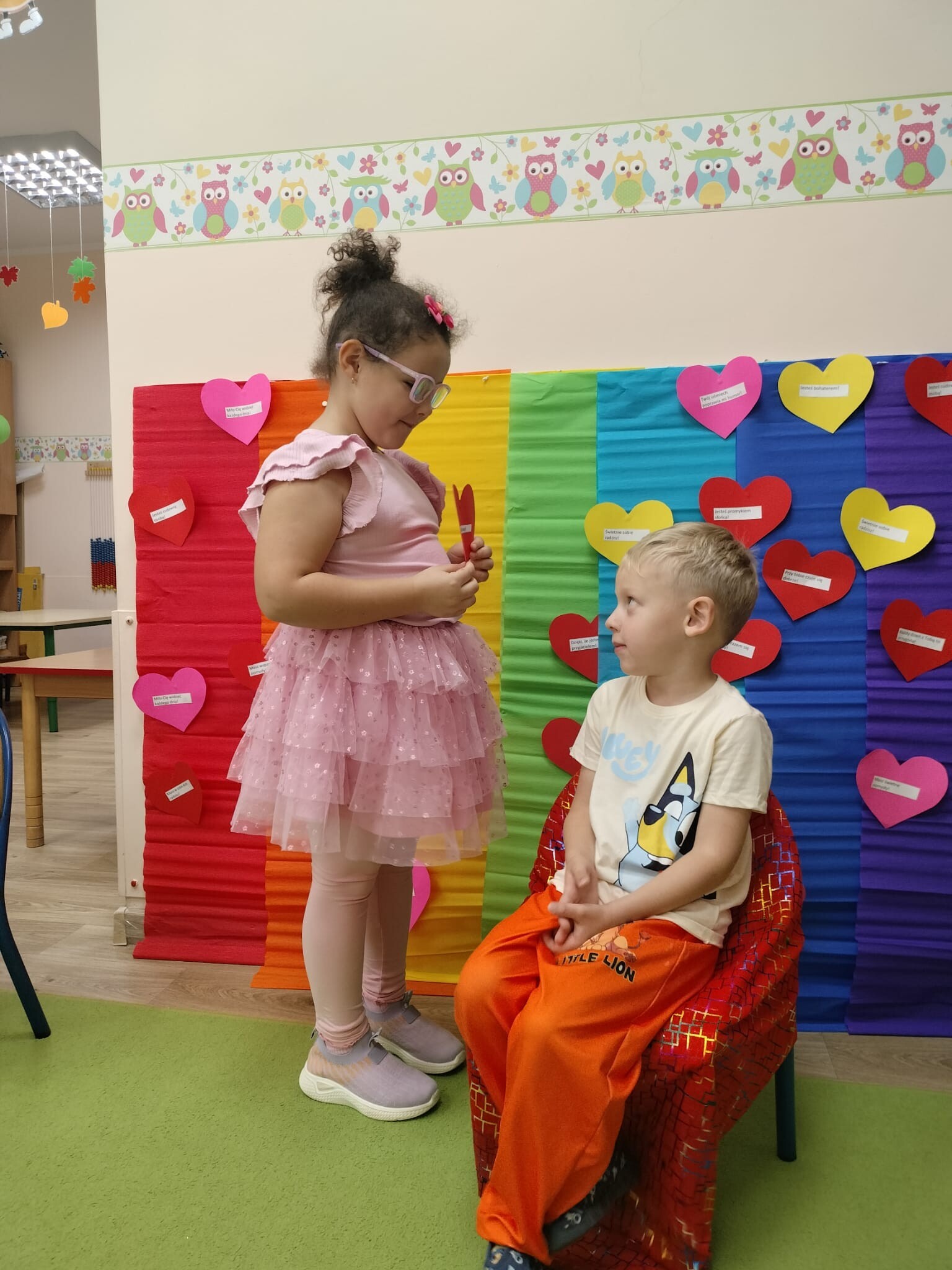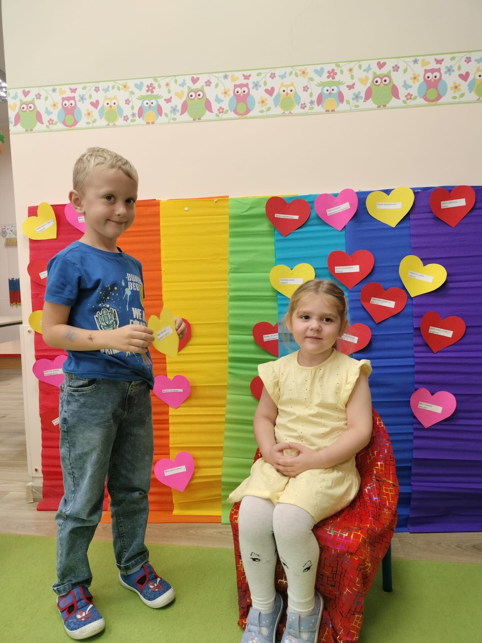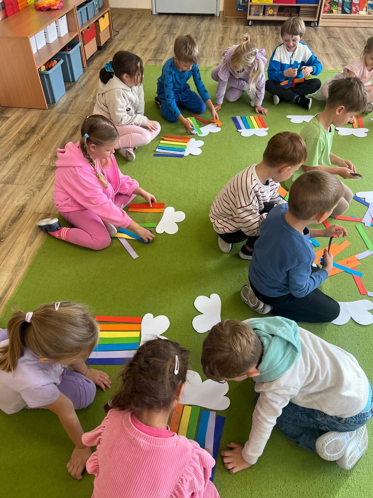 Dzisiaj w przedszkolu świętowaliśmy niezwykły „Dzień Kolorów Szczęścia”. Tego dnia sala rozbłysła wszystkimi barwami tęczy, gdyż dzieci przyszły ubrane w wybrane przez siebie kolory. Wspólnie odkrywaliśmy tajemnice powstawania tęczy, a następnie układaliśmy jej barwy zgodnie z podanym wzorem. Przedszkolaki z wielkim zaangażowaniem rozwiązywały także kolorowe zadania matematyczne, ćwicząc dodawanie i odejmowanie na swoich tęczach. Nie zabrakło twórczej ekspresji – dzieci wykonały piękne prace plastyczno-techniczne przedstawiające tęczę. Na zakończenie wszyscy świetnie bawili się z chustą animacyjną, uczestnicząc w zabawach muzyczno-ruchowych i kolorowych tańcach przy piosence „Tęcza”. To był dzień pełen radości, kreatywności i kolorów!