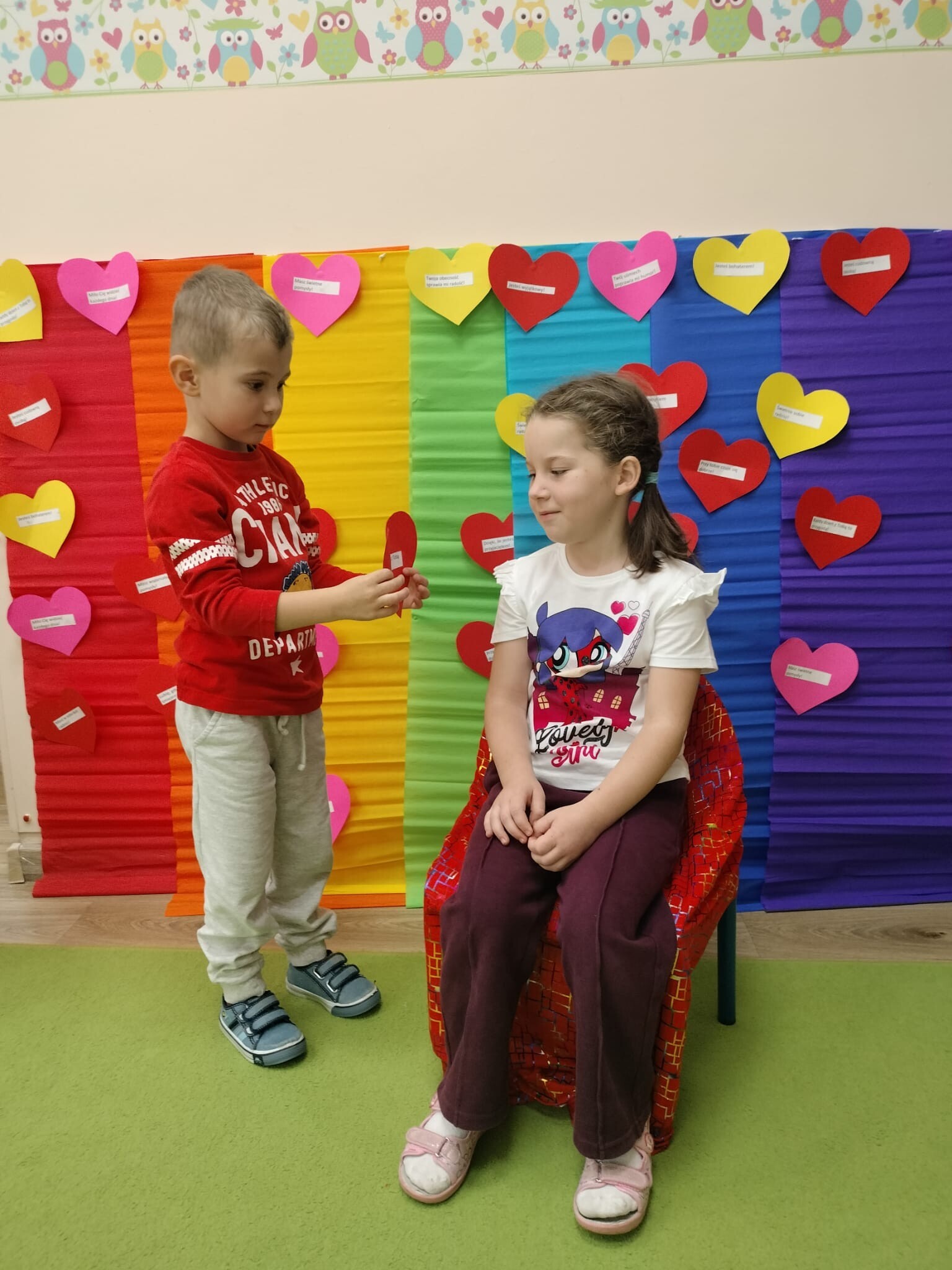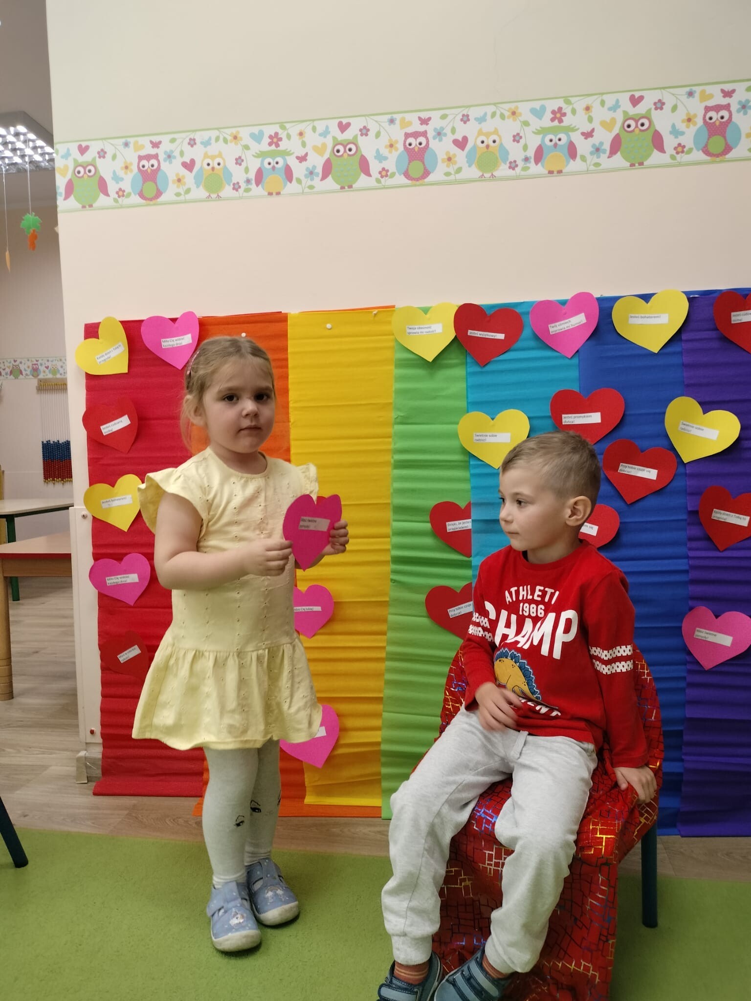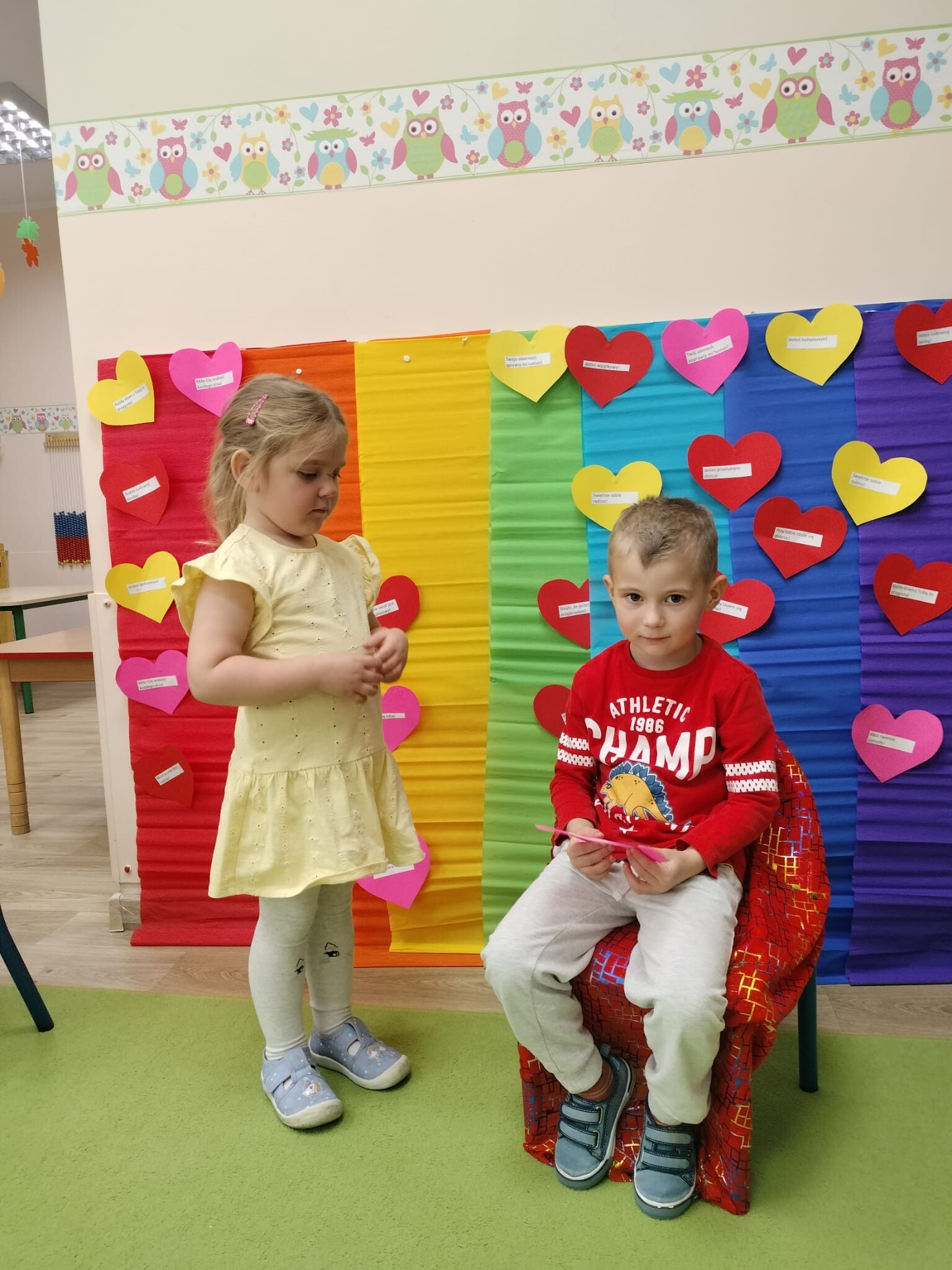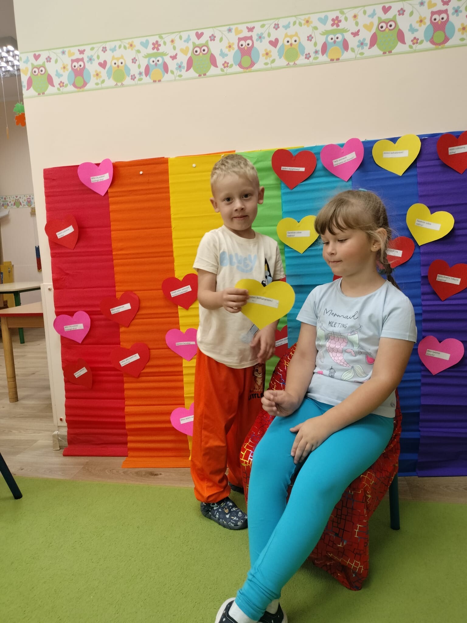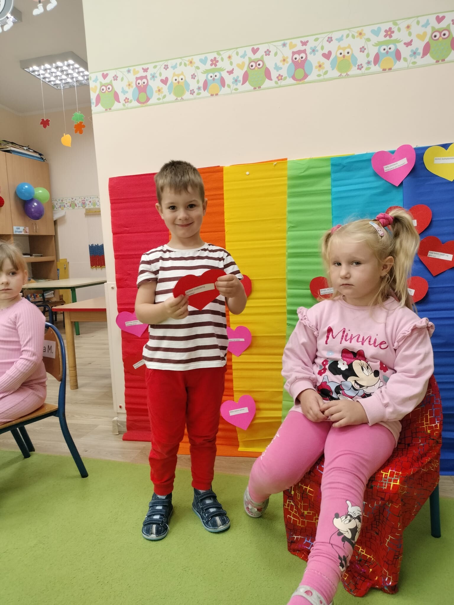 Dzisiaj w przedszkolu świętowaliśmy niezwykły „Dzień Kolorów Szczęścia”. Tego dnia sala rozbłysła wszystkimi barwami tęczy, gdyż dzieci przyszły ubrane w wybrane przez siebie kolory. Wspólnie odkrywaliśmy tajemnice powstawania tęczy, a następnie układaliśmy jej barwy zgodnie z podanym wzorem. Przedszkolaki z wielkim zaangażowaniem rozwiązywały także kolorowe zadania matematyczne, ćwicząc dodawanie i odejmowanie na swoich tęczach. Nie zabrakło twórczej ekspresji – dzieci wykonały piękne prace plastyczno-techniczne przedstawiające tęczę. Na zakończenie wszyscy świetnie bawili się z chustą animacyjną, uczestnicząc w zabawach muzyczno-ruchowych i kolorowych tańcach przy piosence „Tęcza”. To był dzień pełen radości, kreatywności i kolorów!