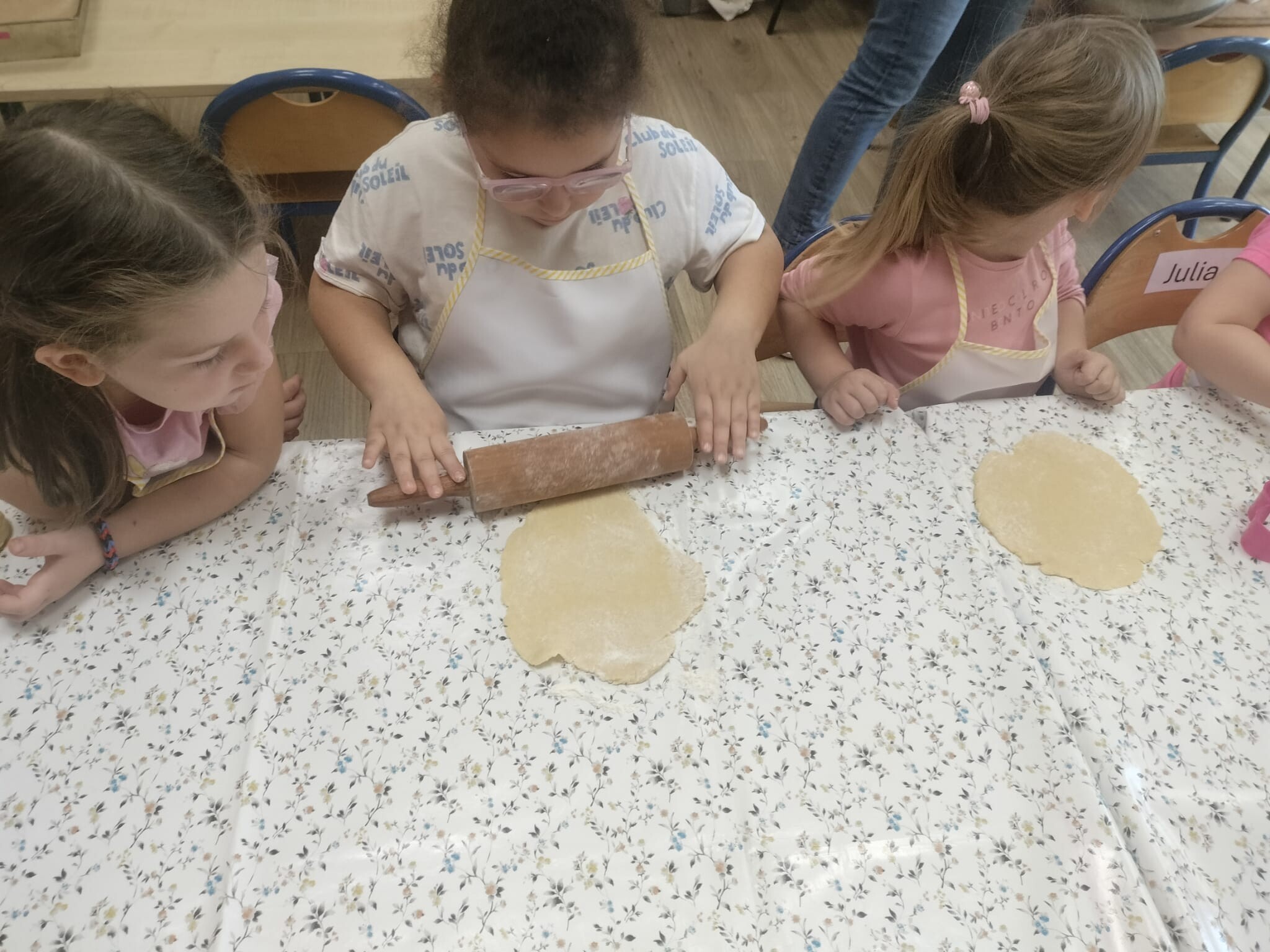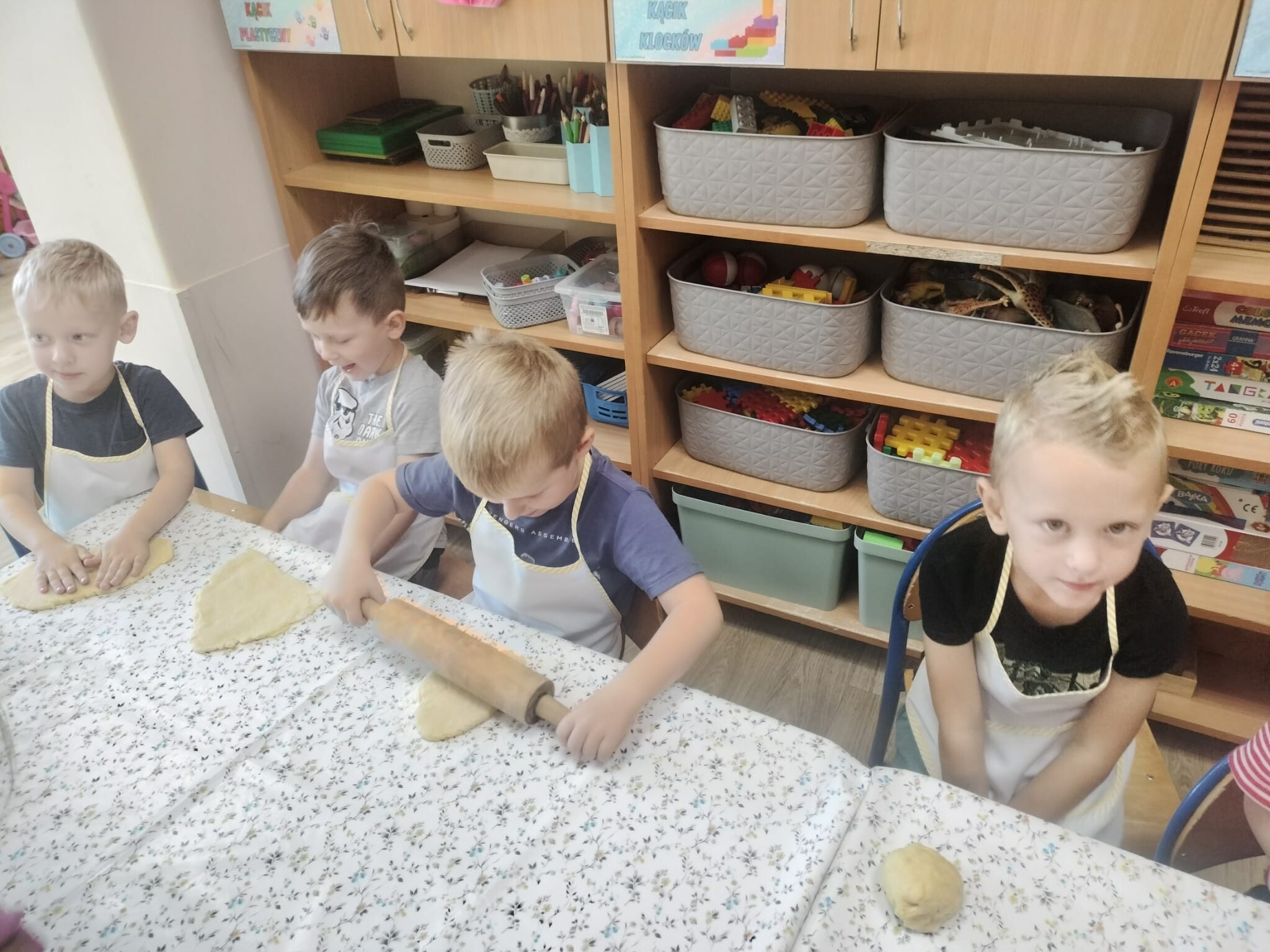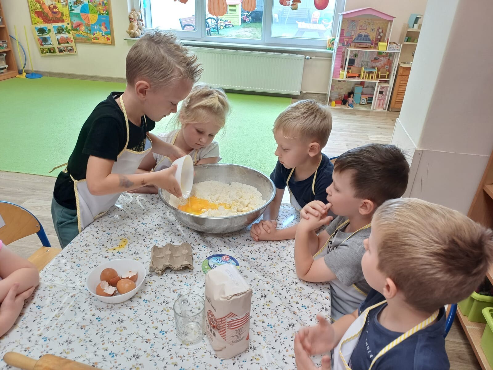 Dzieci wspólnie przygotowały ciasteczka wdzięczności w kształcie serca – z radością mieszały składniki, wałkowały ciasto i wykrawały serduszka.