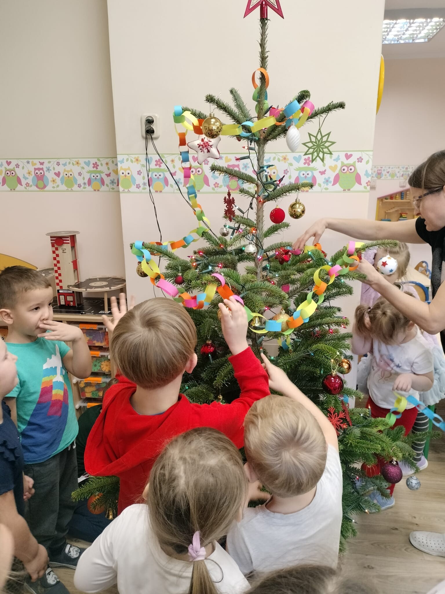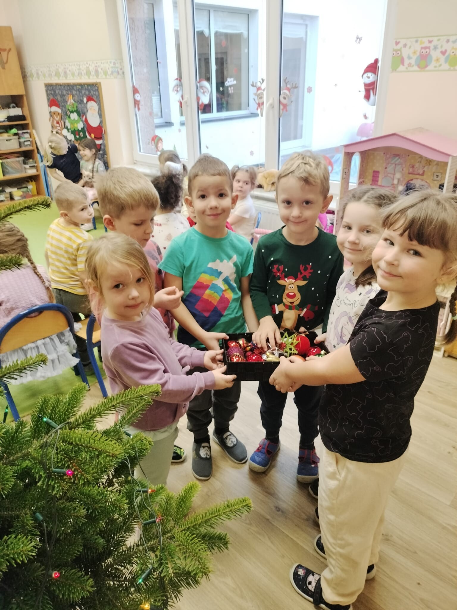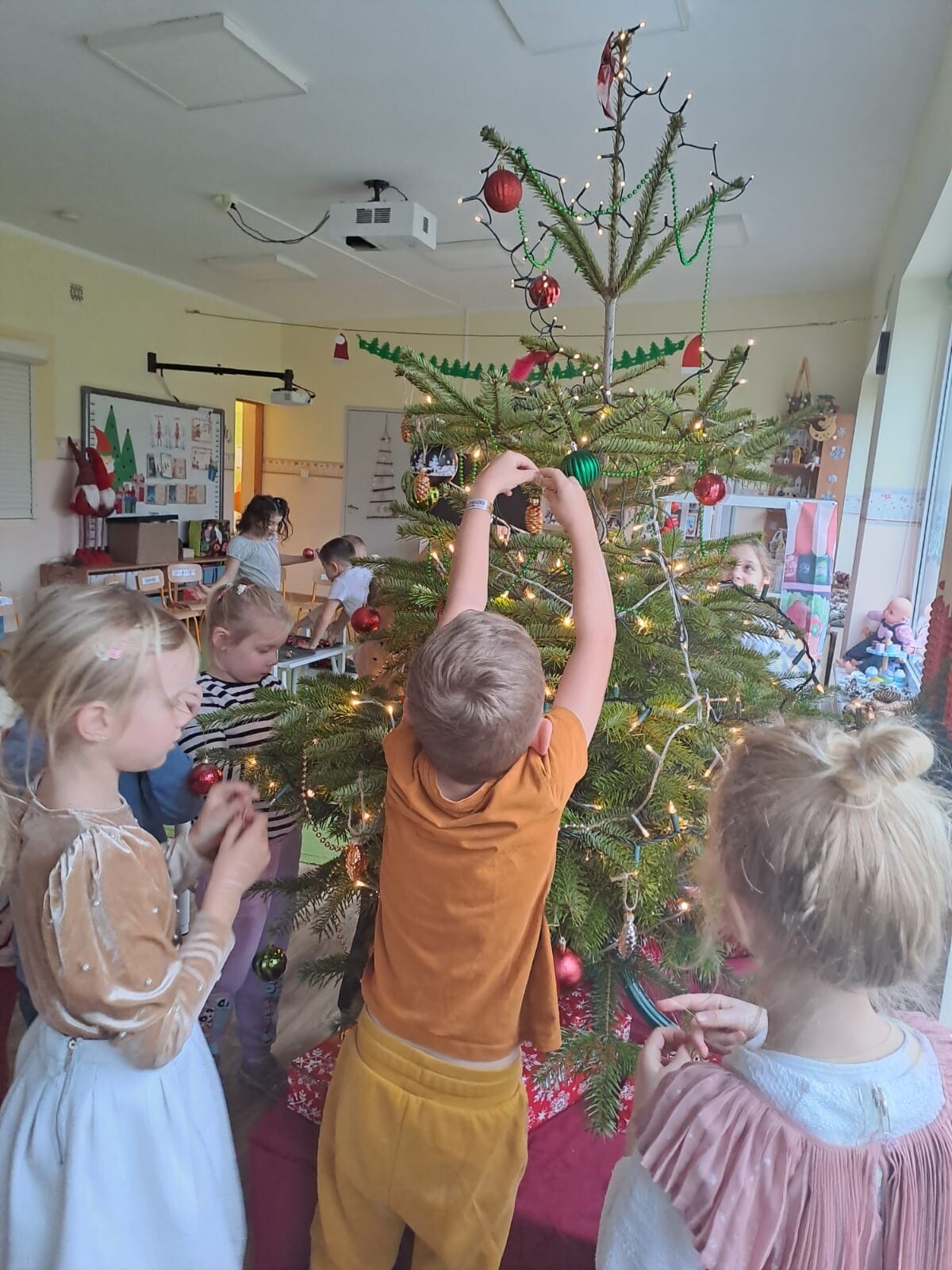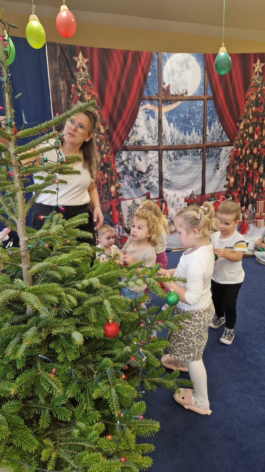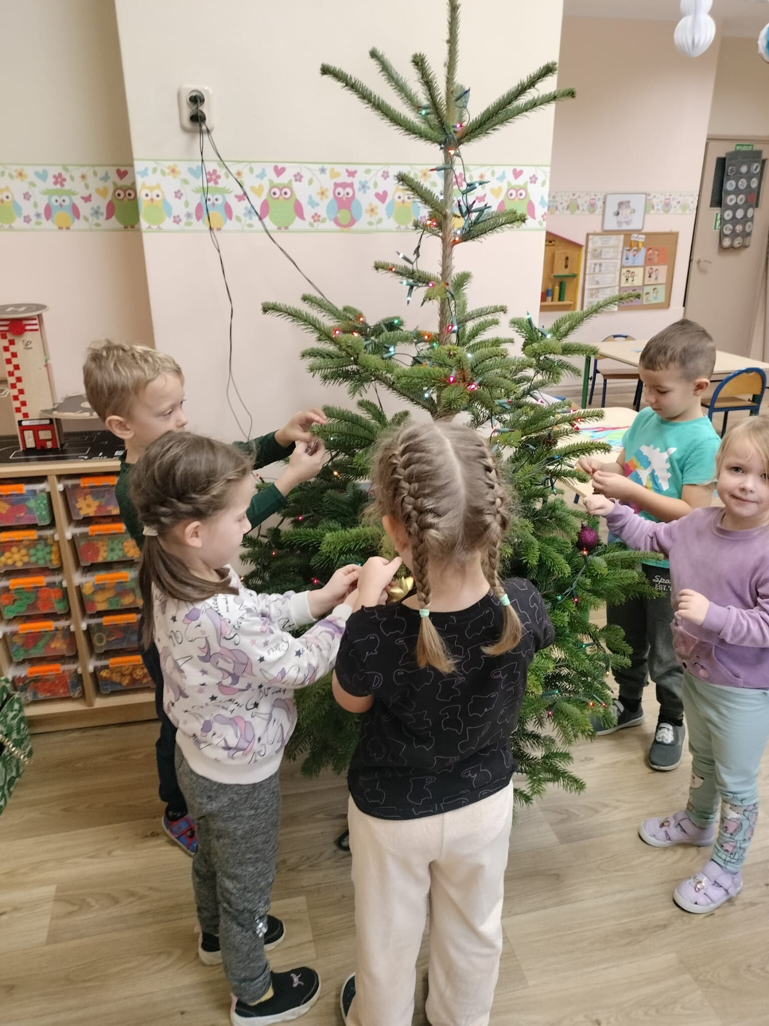 Wspólne dekorowanie było nie tylko świetną zabawą, ale także okazją do rozwijania kreatywności, współpracy i budowania świątecznej atmosfery. Teraz choinki pięknie zdobią nasze przedszkolne sale, a dzieci z dumą podziwiają efekty swojej pracy.