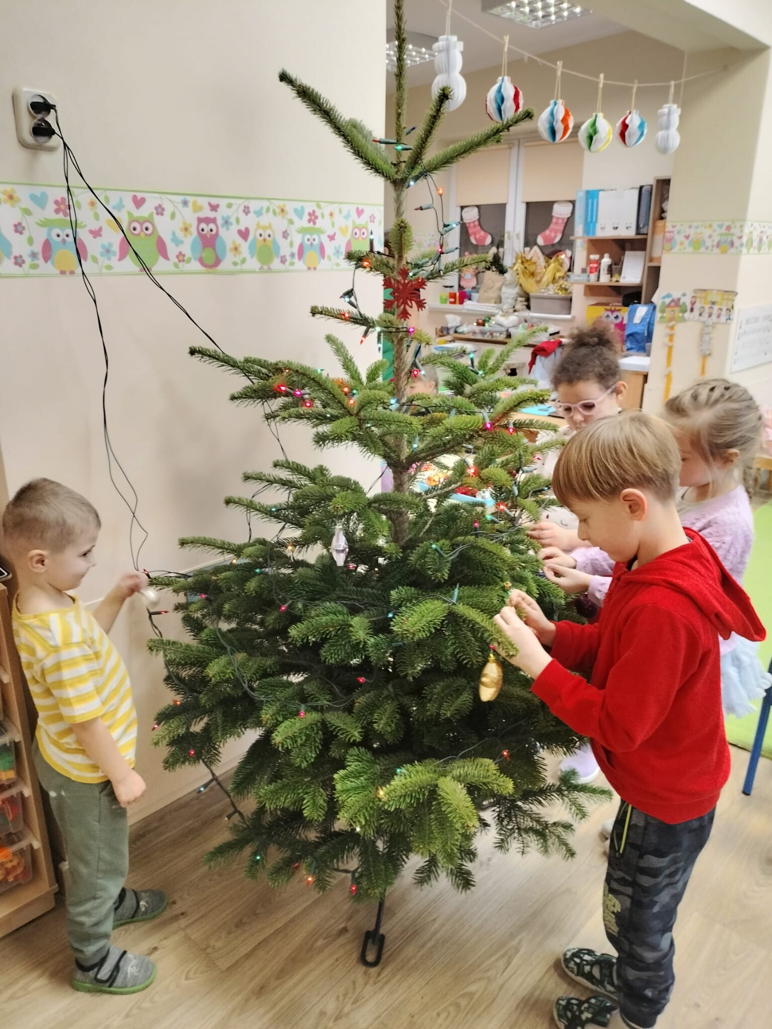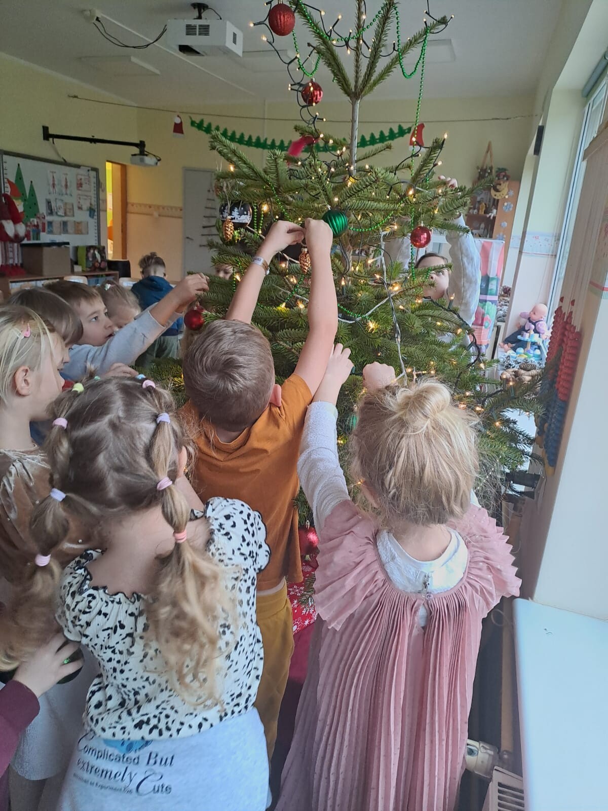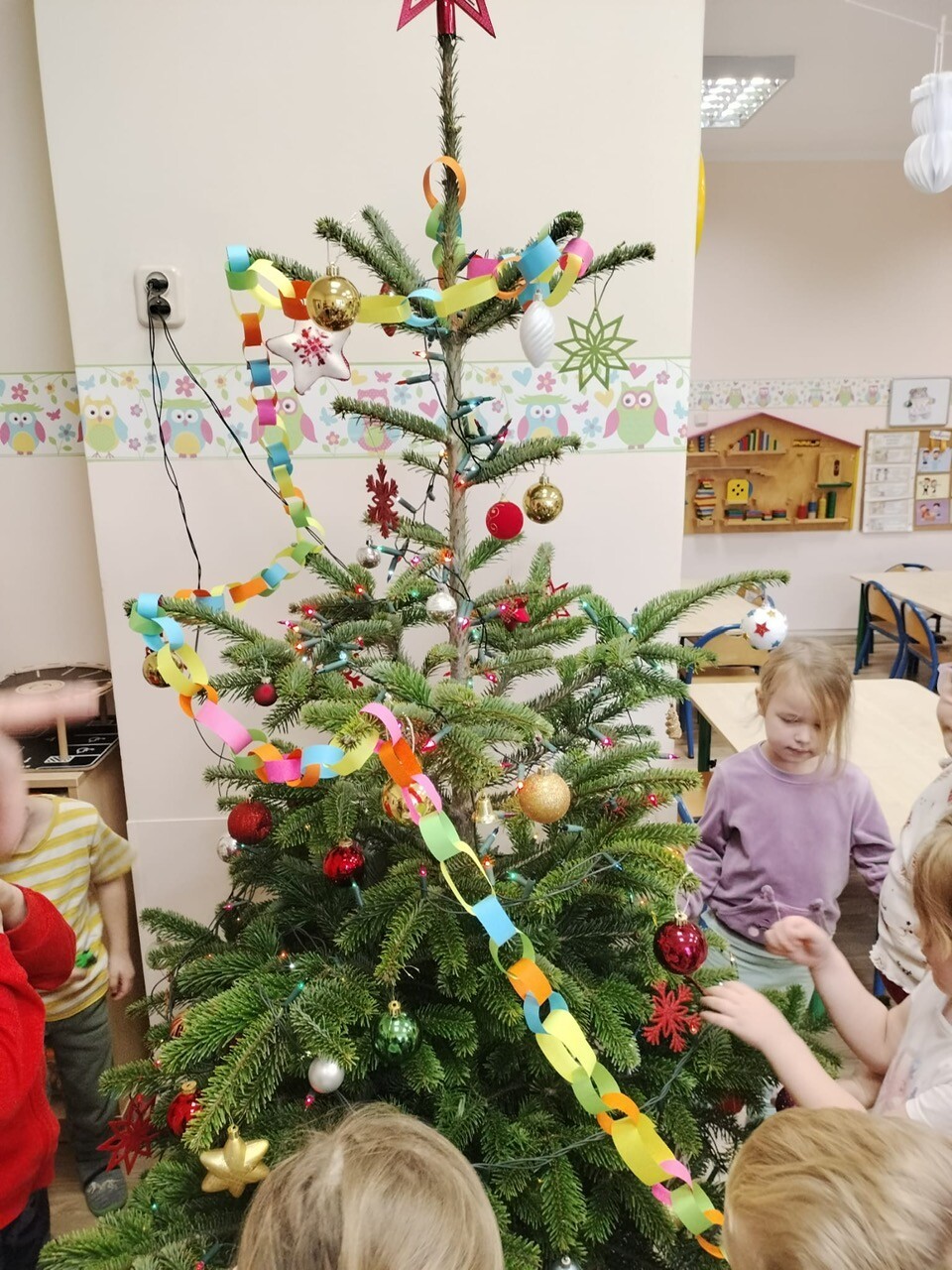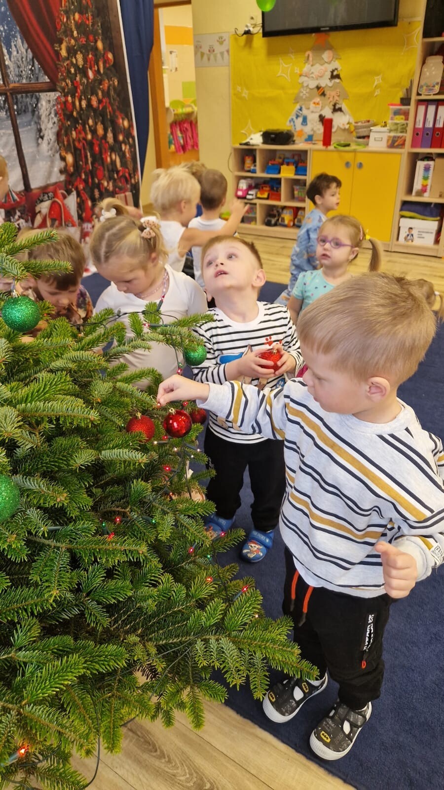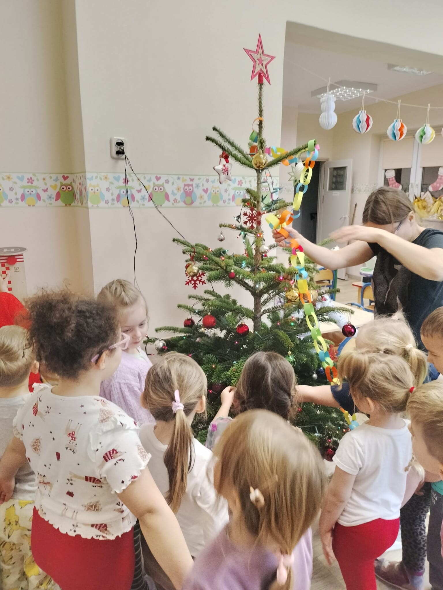 Wspólne dekorowanie było nie tylko świetną zabawą, ale także okazją do rozwijania kreatywności, współpracy i budowania świątecznej atmosfery. Teraz choinki pięknie zdobią nasze przedszkolne sale, a dzieci z dumą podziwiają efekty swojej pracy.